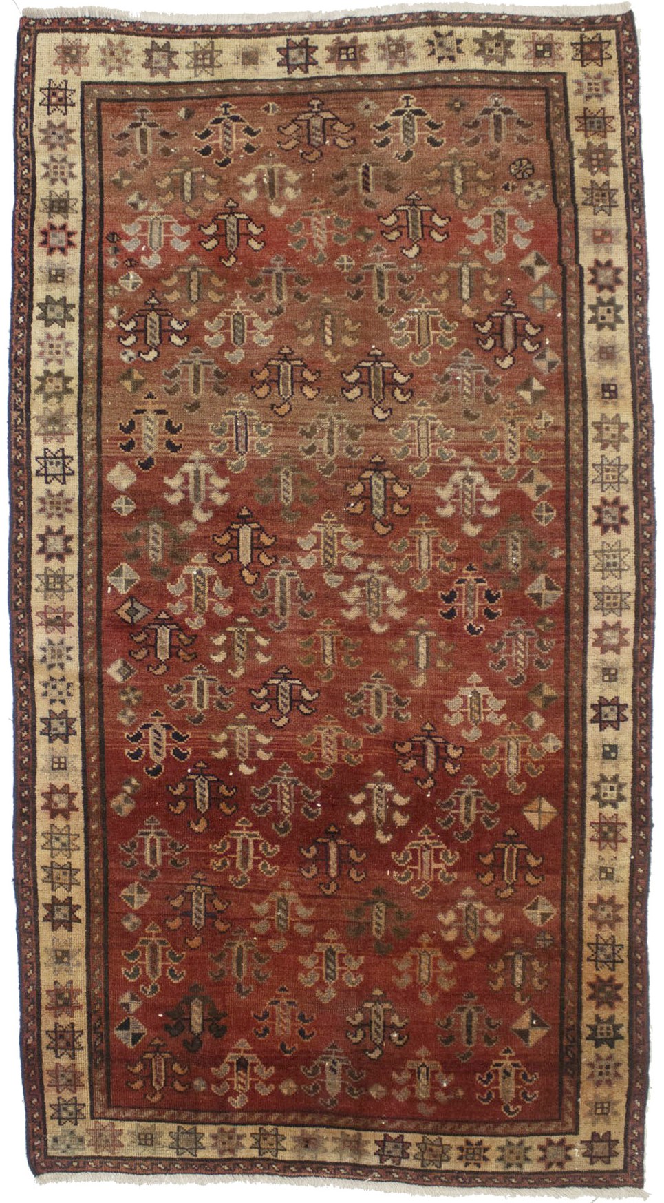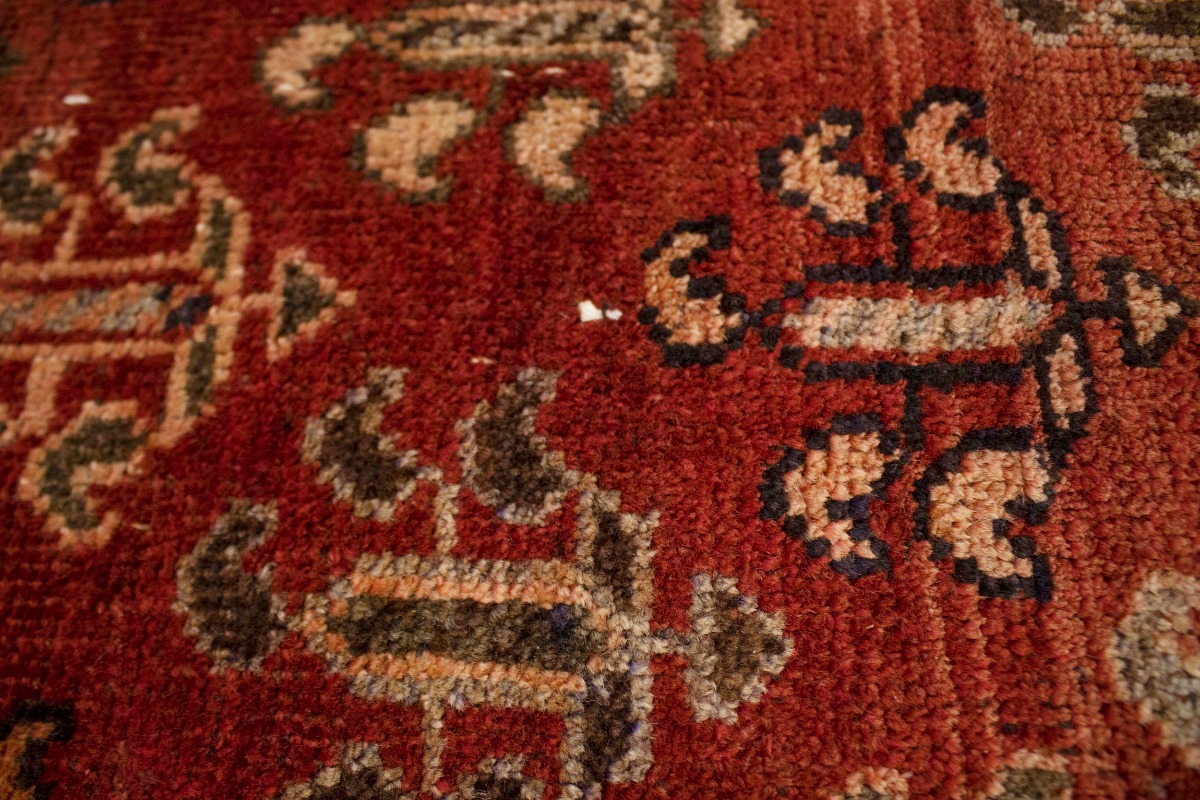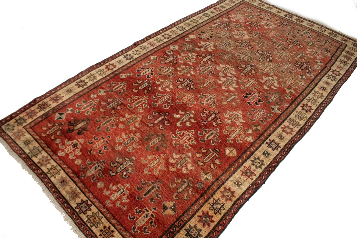 This genuine 5X9 red vintage Persian rug was made by the hands of talented weavers influenced by a variety of gorgeous symmetrical artistic designs, to recreate the aged look of the unique piece with a richness of color and very balanced background field. What set this tribal Oriental area rug from the others are the material and dye used (wool pile and cotton foundation), knot count, antique designs, fantastic grades, and its regional historical connection: it has deep roots, from the story of the people who produced it to the meaning of the symbols and colors displayed across its canvas that have been praised for centuries. This home décor carpet will be completely cozy and inviting that never will go out of style!