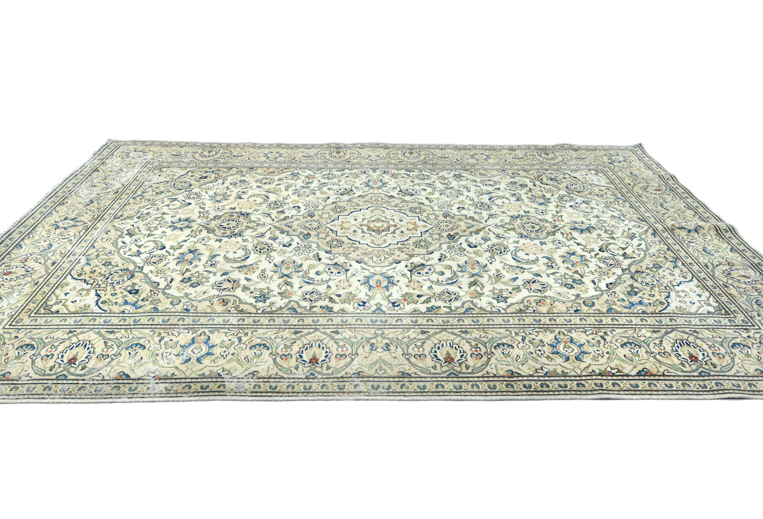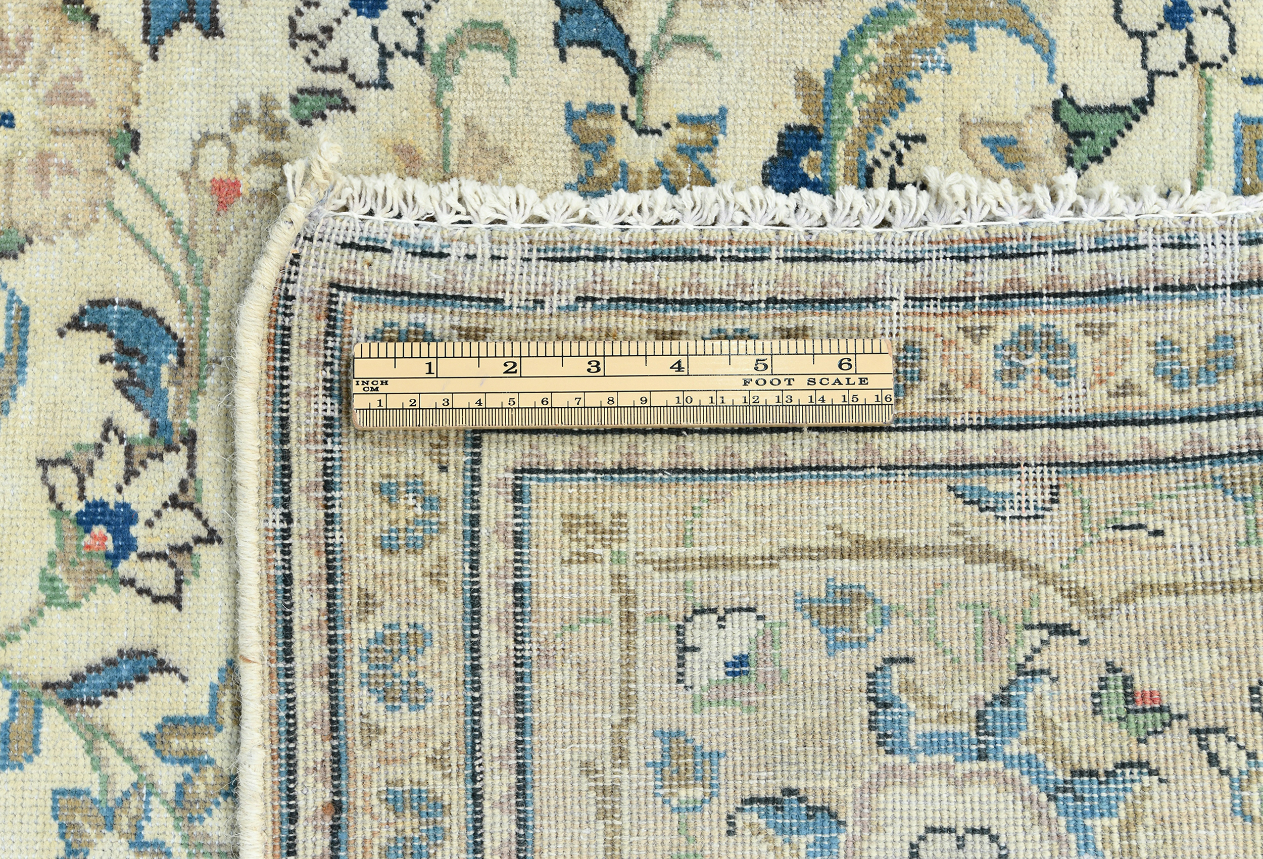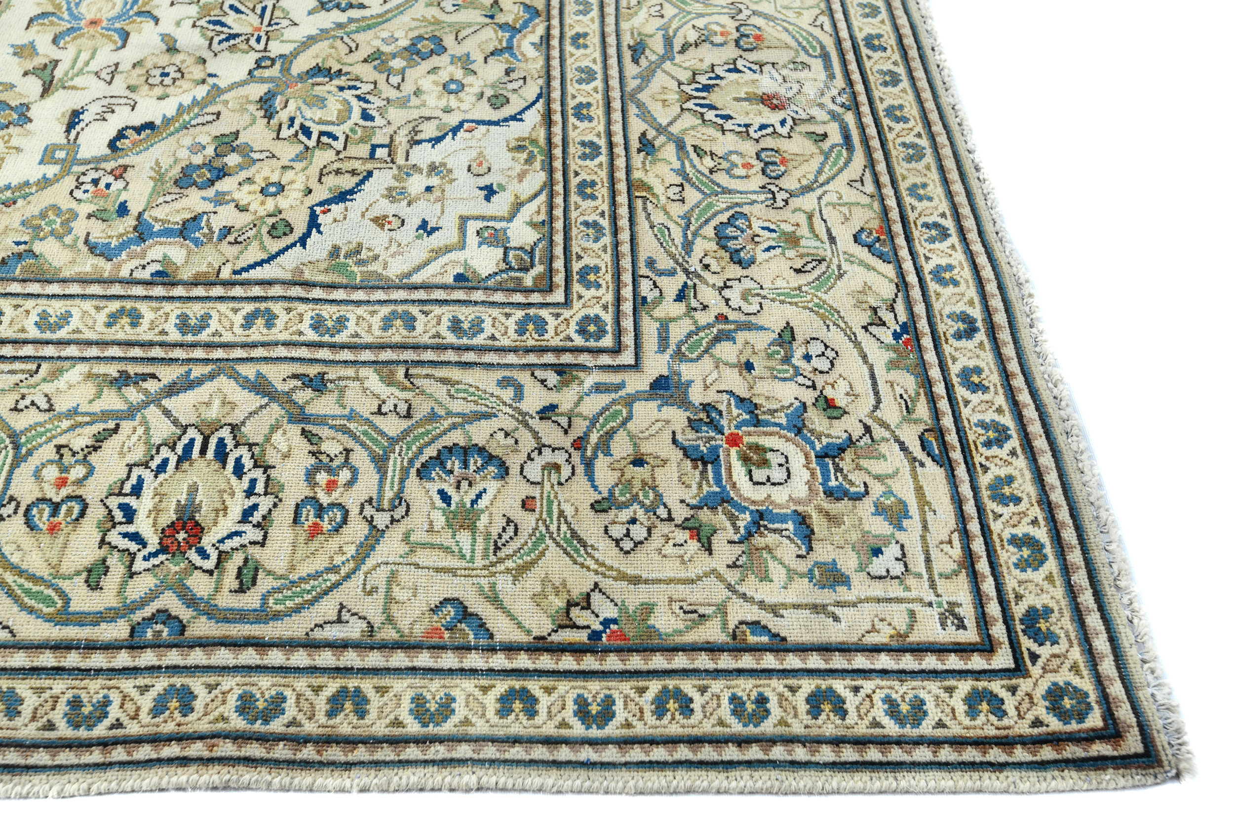 This authentic 6'5X9'7 cream new Oriental rug was crafted by the hands of skilled weavers enthused by a variety of lovely artistic designs, to recreate the aged look of the unique piece with a richness of color and beautifully elaborated background field. What set this vintage style Oriental area rug from the others are the material and dye used (wool pile and cotton foundation), knot count, ancient designs, fantastic grades, and its regional historical connection: it has deep roots, from the story of the people who produced it to the meaning of the symbols and colors displayed across its canvas that have been praised for centuries. This Indian home décor carpet will be completely cozy and inviting that never will go out of style!