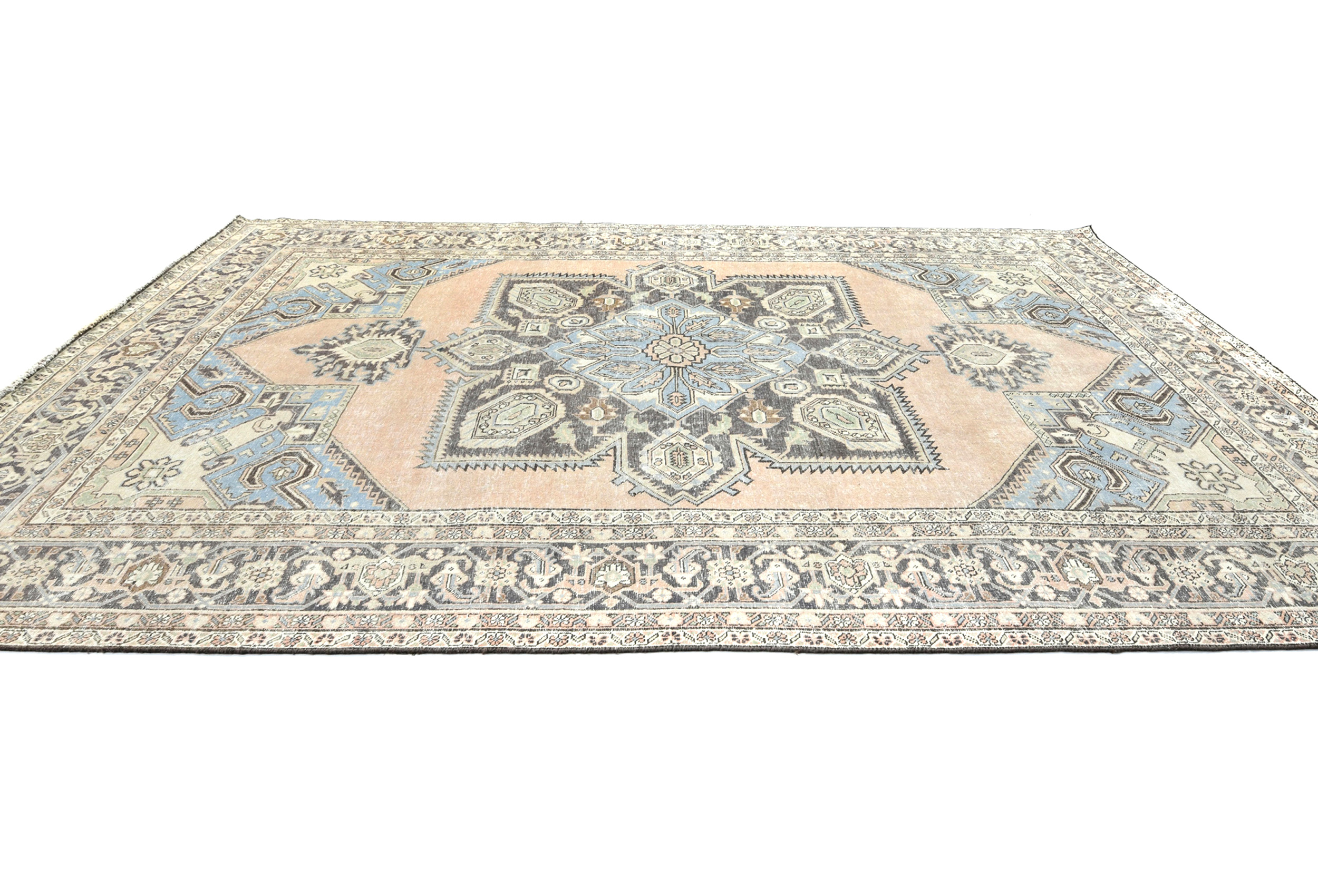 This authentic 10X13 khaki vintage Oriental rug was finely knotted by the hands of weavers influenced by a variety of amazing artistic designs, to recreate the aged look of the exceptional piece with a richness of color and embellished floral background field. What set this traditional Oriental area rug from the others are the material and dye used (wool pile and cotton foundation), knot count, antique designs, fantastic grades, and its regional historical connection: it has deep roots, from the story of the people who produced it to the meaning of the symbols and colors displayed across its canvas that have been praised for centuries. This classic home décor carpet will be completely cozy and inviting that never will go out of style! Also, this Oriental rug would be among your most valuable treasures, it is a great investment that increase in value over time, and it will last a lifetime because was woven with high-quality, all-natural wool; it won’t rip, tear, or shed. Eco-friendly, opulent yet affordable; this Persian rug will give you an extra pop of character to help define your home environment with luxury and warmth that will capture the eyes and attention of your audience (homeowners, designers, decorators, family and friends).