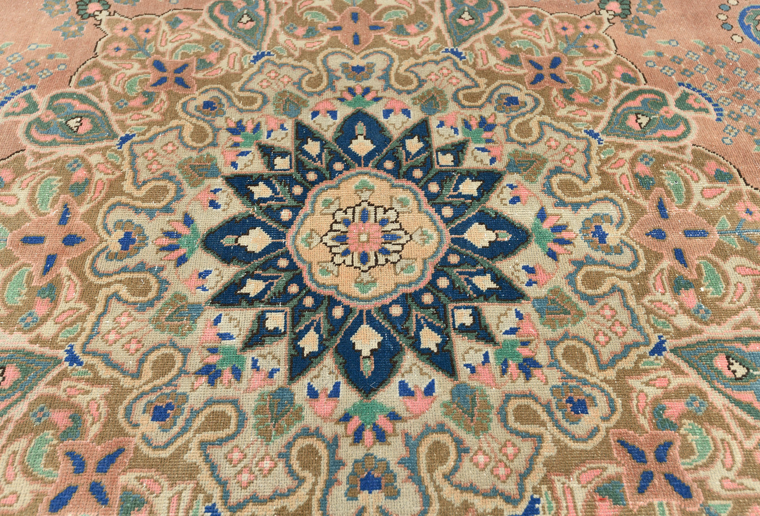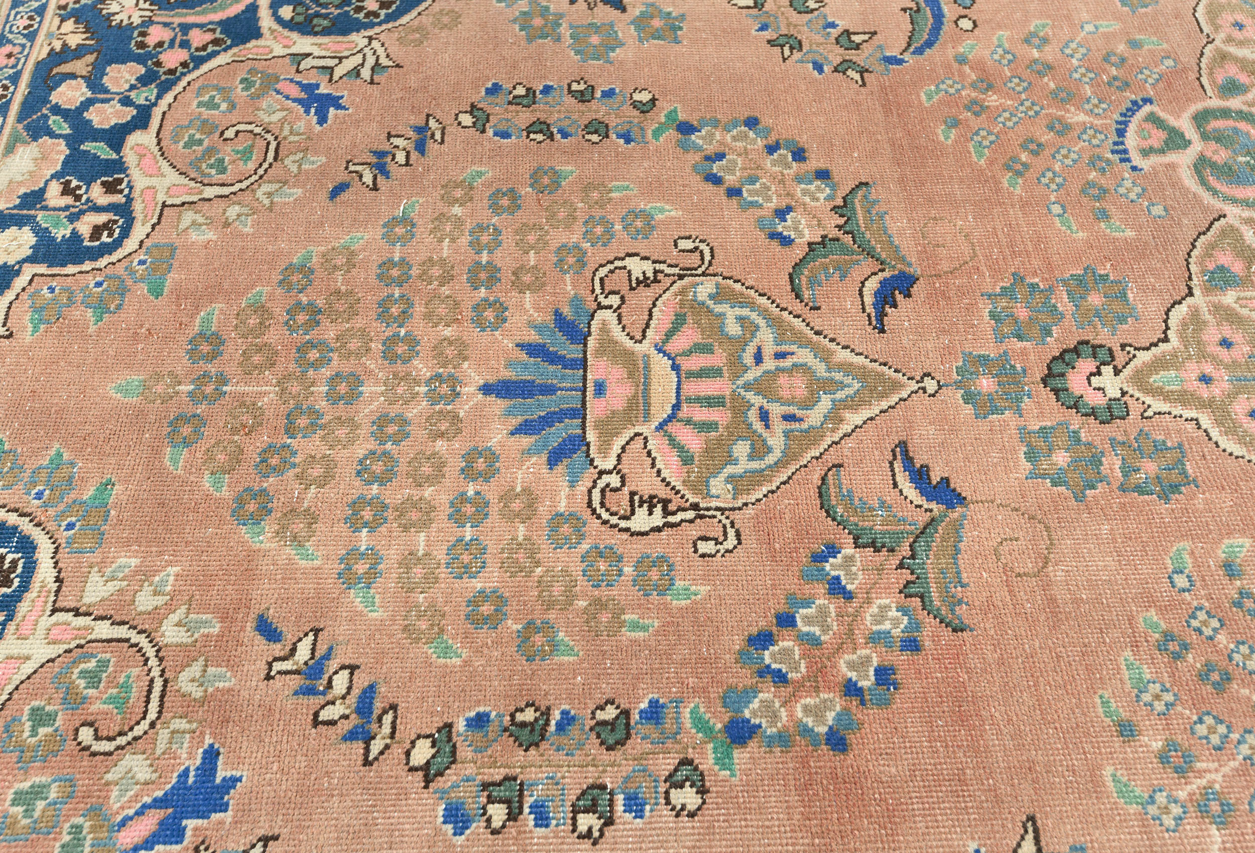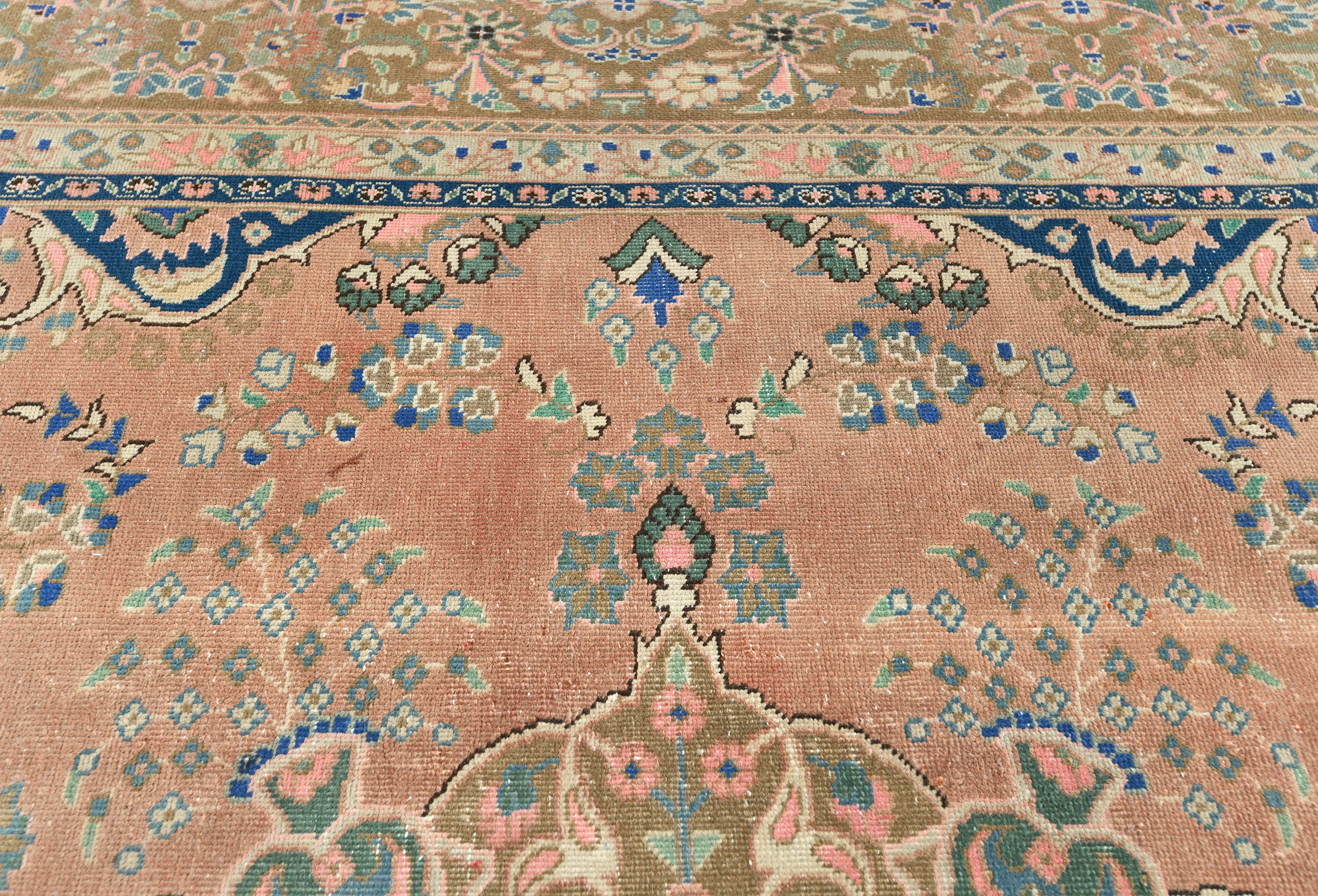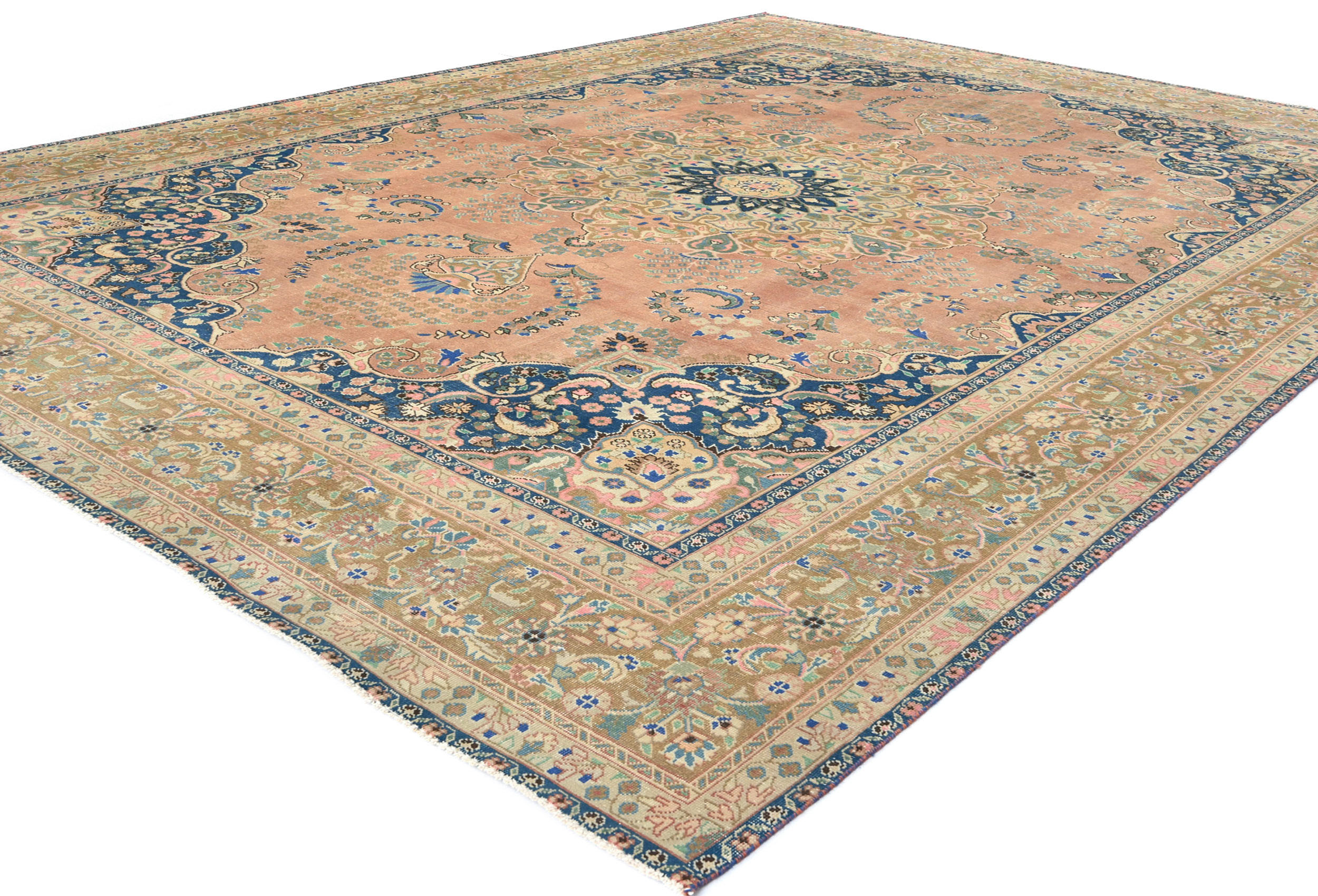 This authentic 9'5X12'6 orange vintage Persian rug was finely knotted by the hands of weavers influenced by a variety of amazing artistic designs, to recreate the aged look of the exceptional piece with a richness of color and embellished floral background field. What set this traditional Oriental area rug from the others are the material and dye used (wool pile and cotton foundation), knot count, antique designs, fantastic grades, and its regional historical connection: it has deep roots, from the story of the people who produced it to the meaning of the symbols and colors displayed across its canvas that have been praised for centuries. This classic home décor carpet will be completely cozy and inviting that never will go out of style! Also, this Oriental rug would be among your most valuable treasures, it is a great investment that increase in value over time, and it will last a lifetime because was woven with high-quality, all-natural wool; it won’t rip, tear, or shed. Eco-friendly, opulent yet affordable; this Persian rug will give you an extra pop of character to help define your home environment with luxury and warmth that will capture the eyes and attention of your audience (homeowners, designers, decorators, family and friends). RT-6127