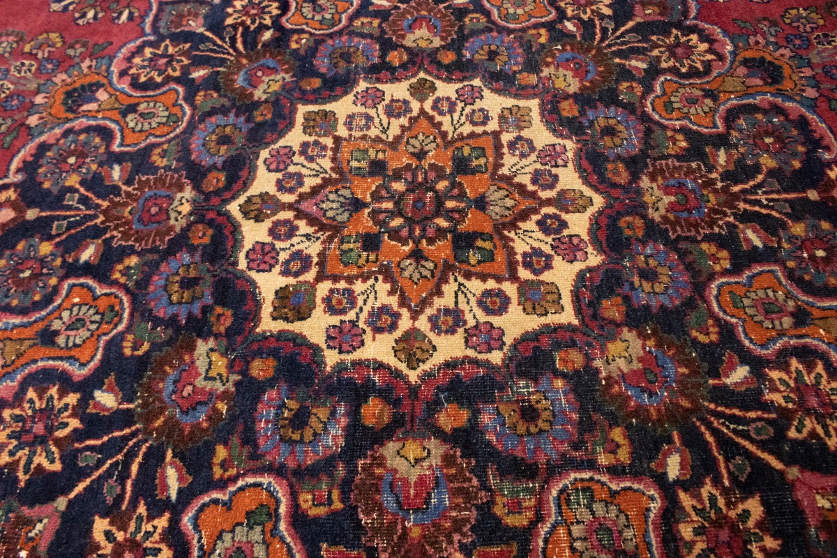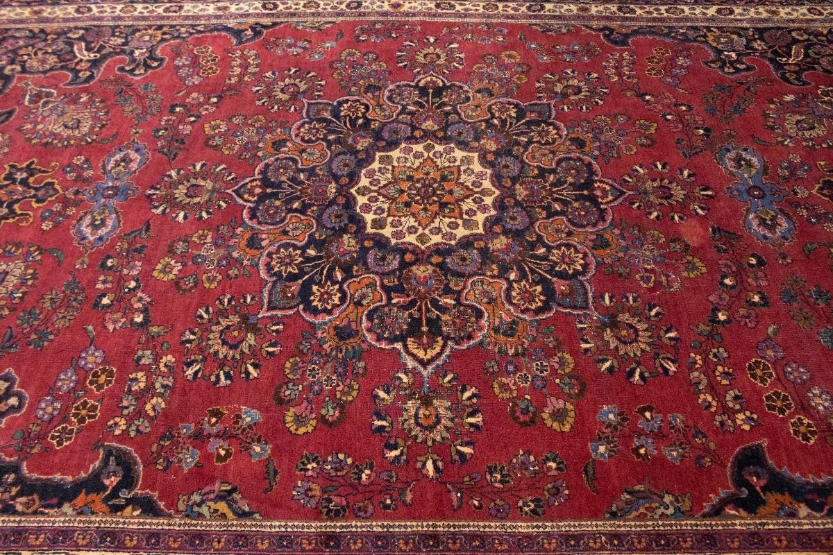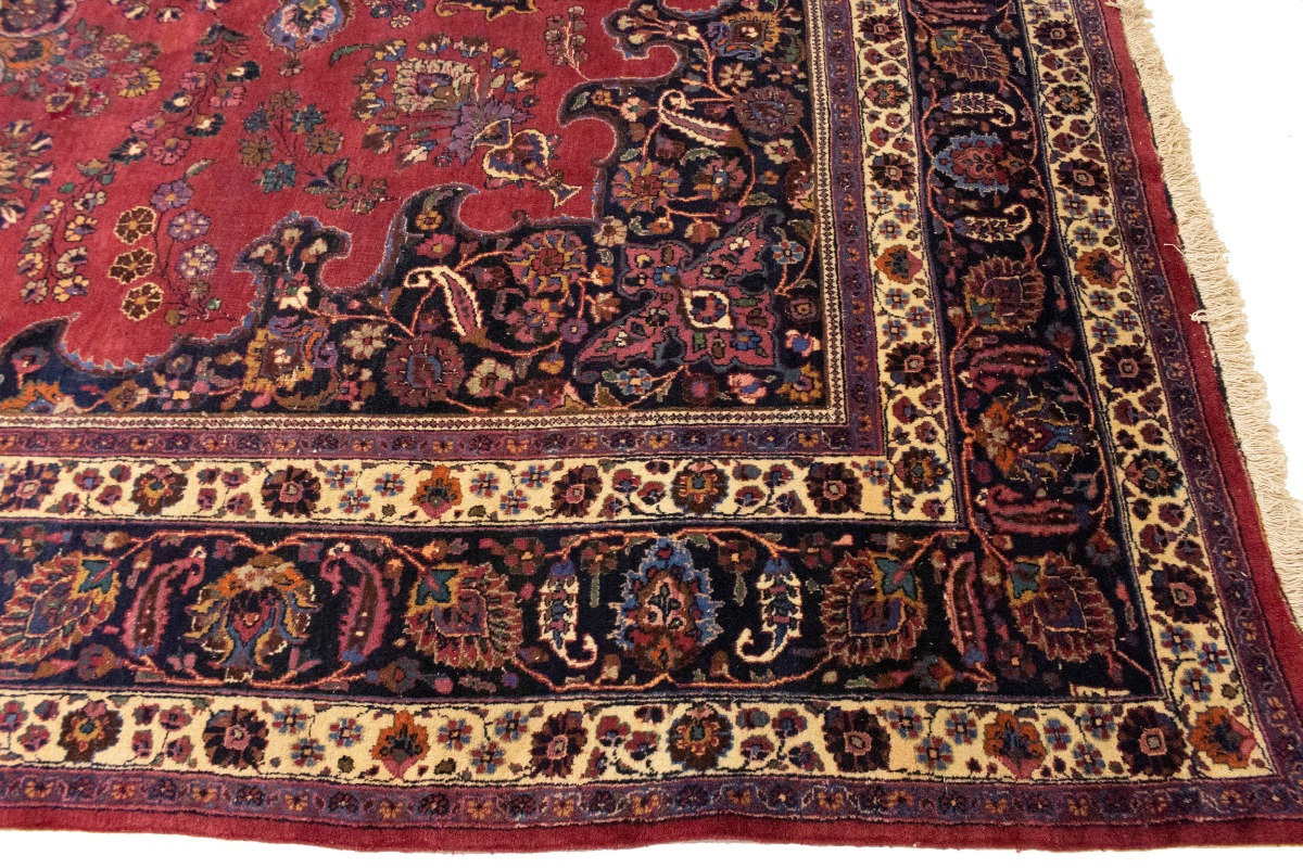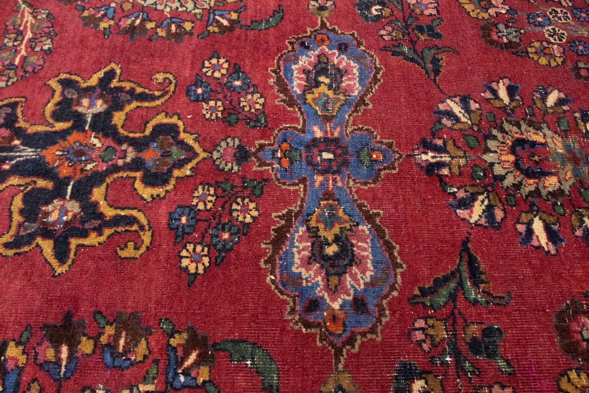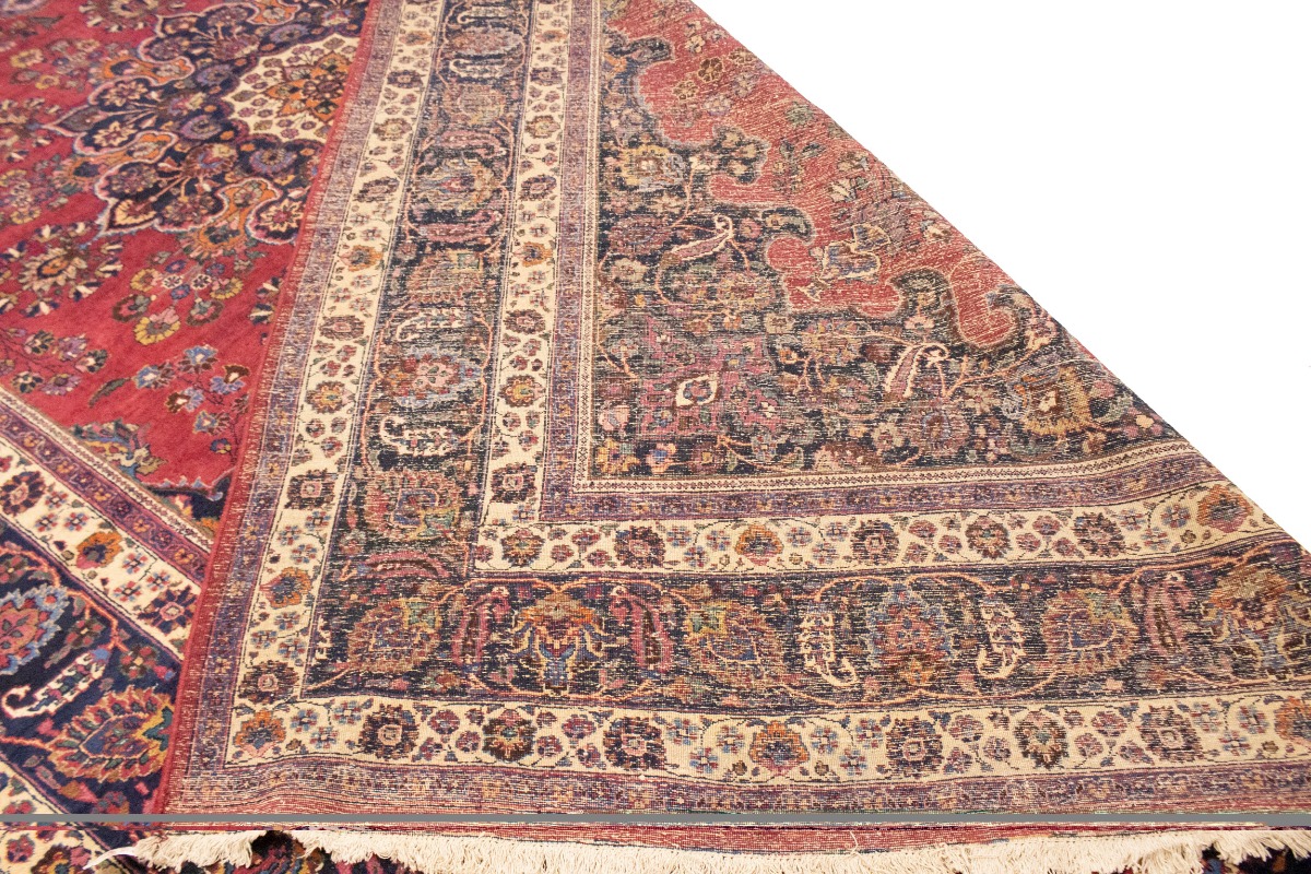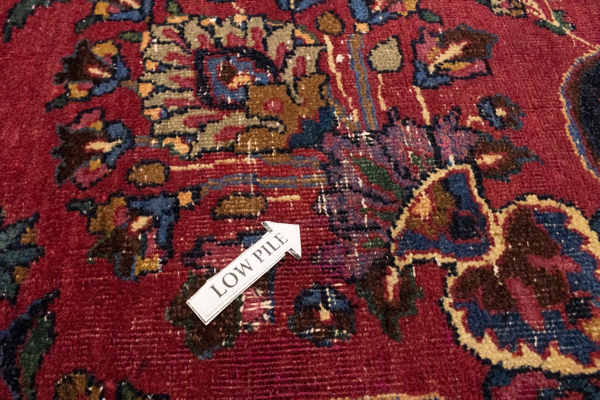 This original 10'5X16'7 red vintage Persian rug was crafted by the hands of skilled weavers enthused by a variety of lovely artistic designs, to recreate the aged look of the unique piece with a richness of color and beautifully elaborated floral background field. What set this traditional Oriental area rug from the others are the material and dye used (wool pile and cotton foundation), knot count, ancient designs, fantastic grades, and its regional historical connection: it has deep roots, from the story of the people who produced it to the meaning of the symbols and colors displayed across its canvas that have been praised for centuries. This classic home décor carpet will be completely cozy and inviting that never will go out of style!
