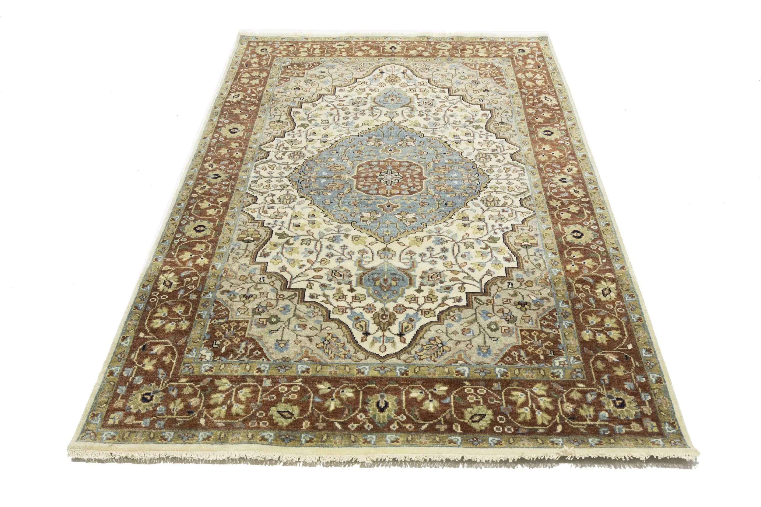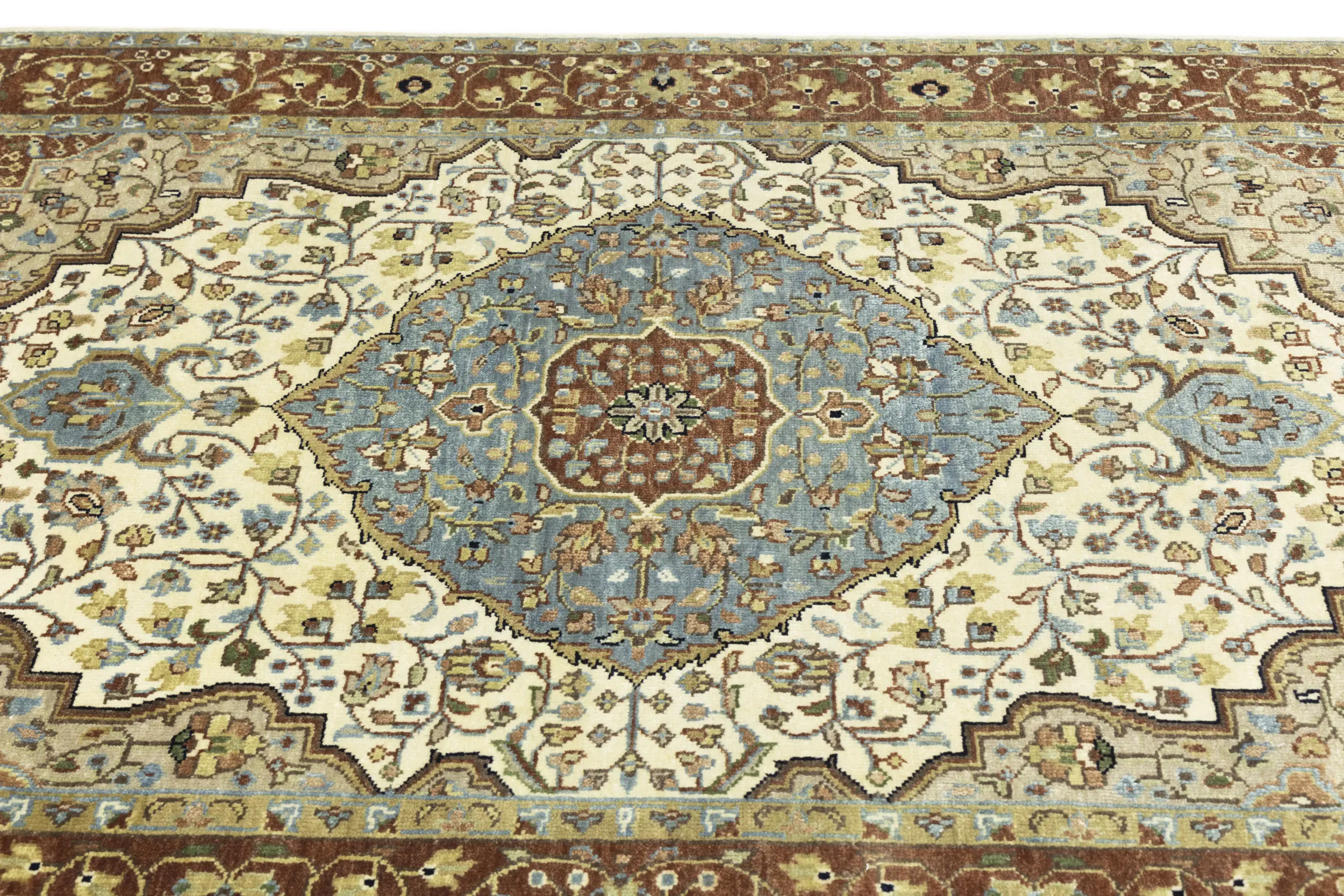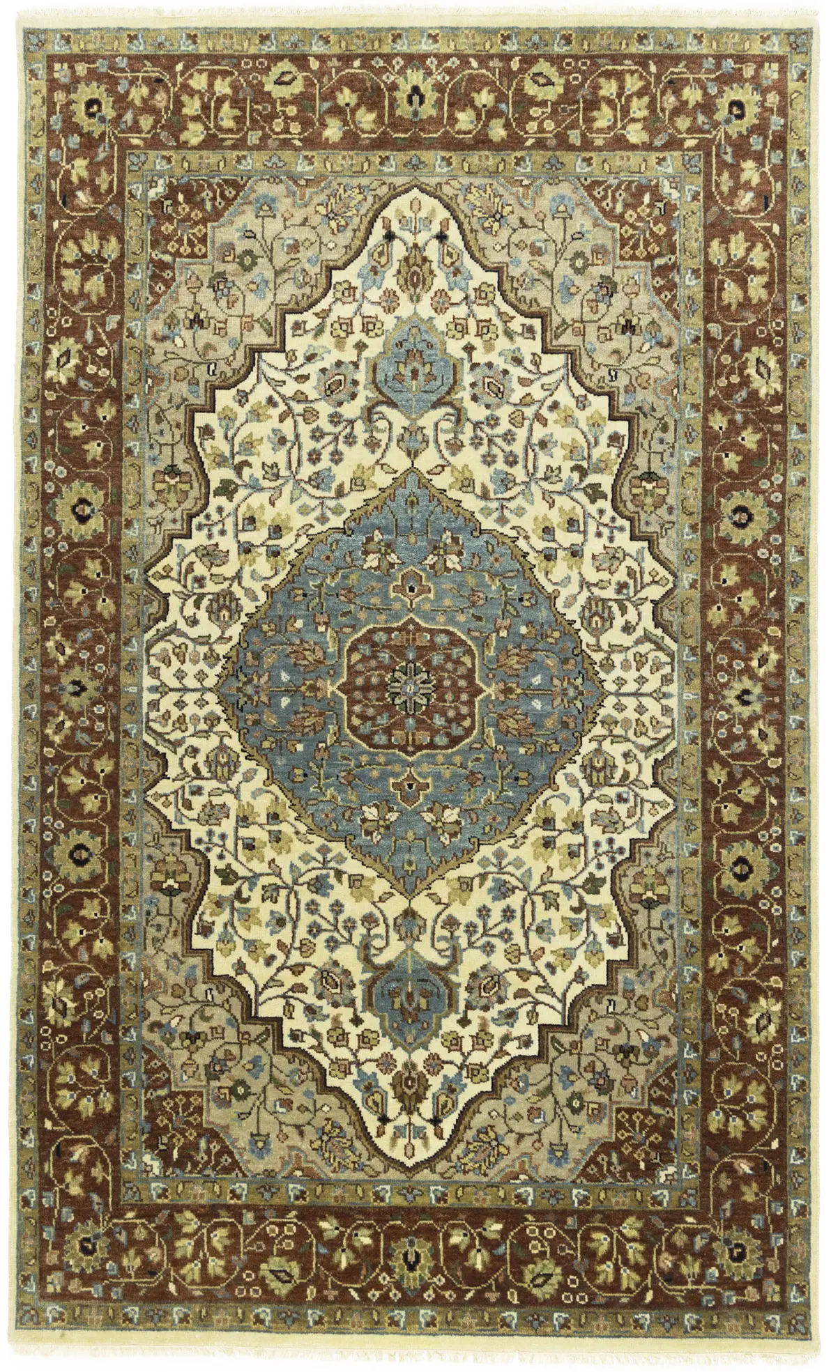 This genuine 5X8 beige new Oriental rug was made by the hands of gifted weavers inspired by a variety of spectacular artistic designs, to recreate the aged look of the original piece with a richness of color and ornately patterned background field. What set this vintage style Oriental area rug from the others are the material and dye used (wool pile and cotton foundation), knot count, ancient designs, fantastic grades, and its regional historical connection: it has deep roots, from the story of the people who produced it to the meaning of the symbols and colors displayed across its canvas that have been praised for centuries. This Indian home décor carpet will be completely cozy and inviting that never will go out of style! Also, this Oriental rug would be among your most valuable treasures, it is a great investment that accrues value over time, and it will last for generations because was woven with high-quality, all-natural wool. Environmentally friendly, opulent yet affordable; this rug will give you a thorough amount of character to help define your living space with elegance and warmth that will capture the eyes and attention of your audience (homeowners, designers, decorators, family and friends).