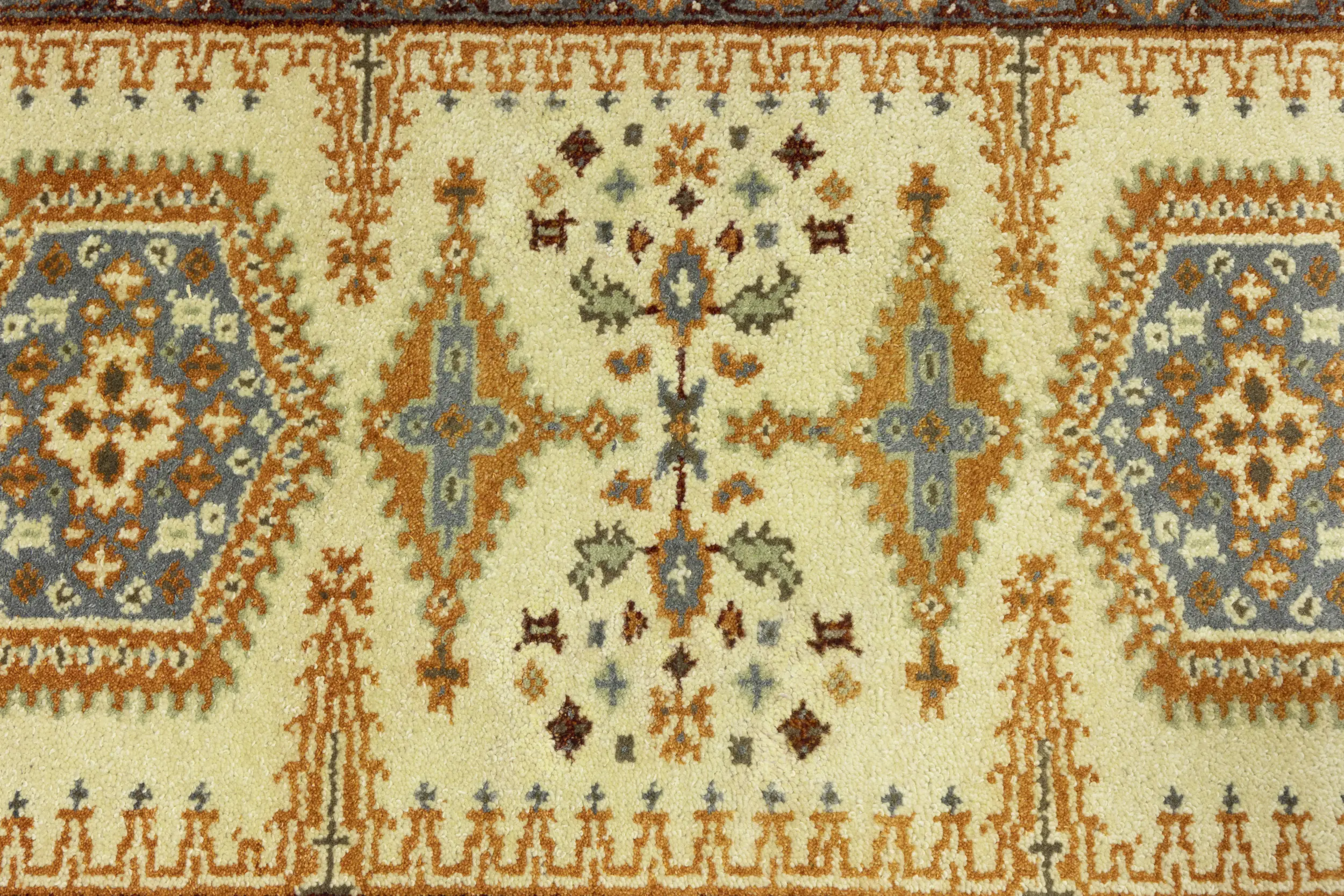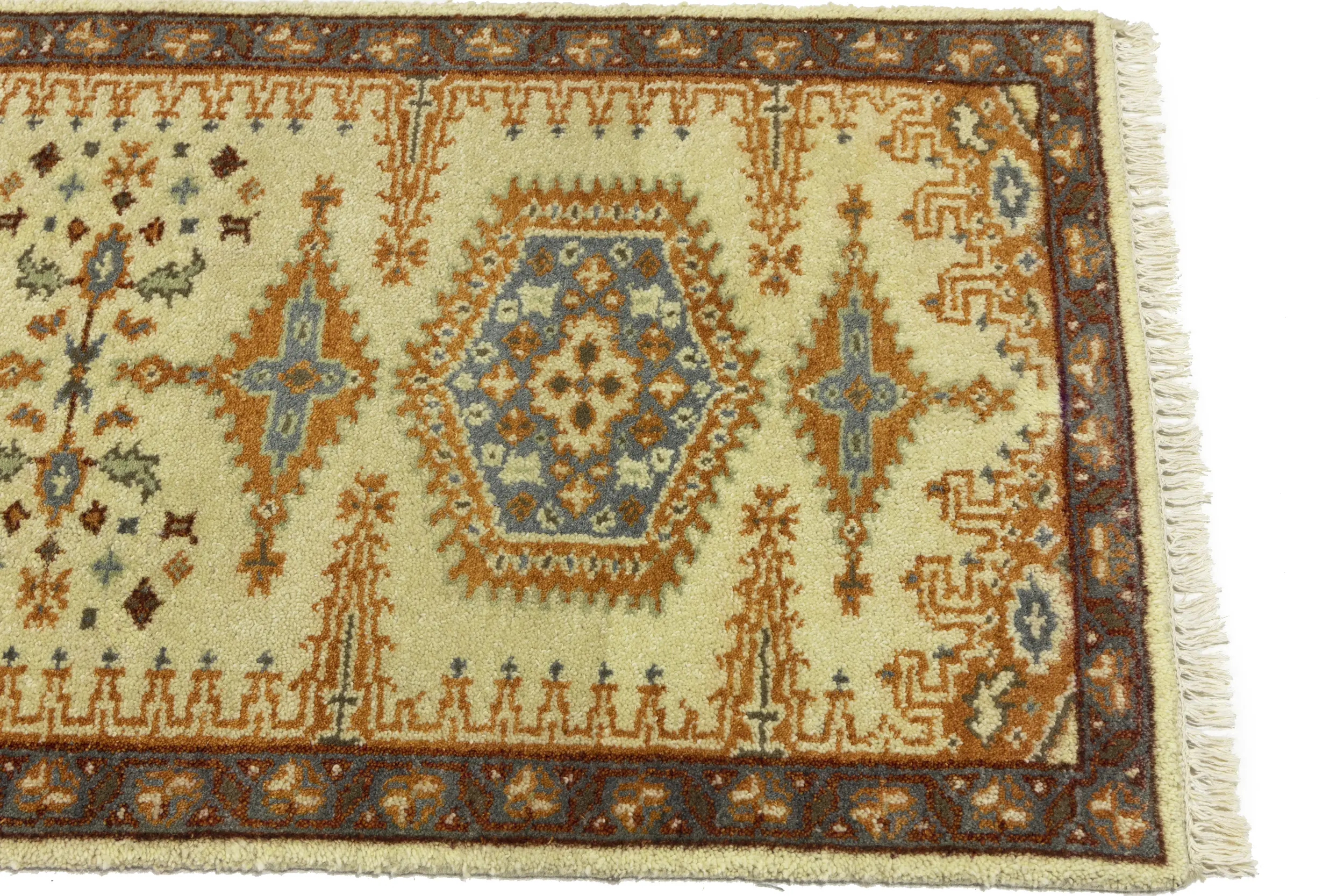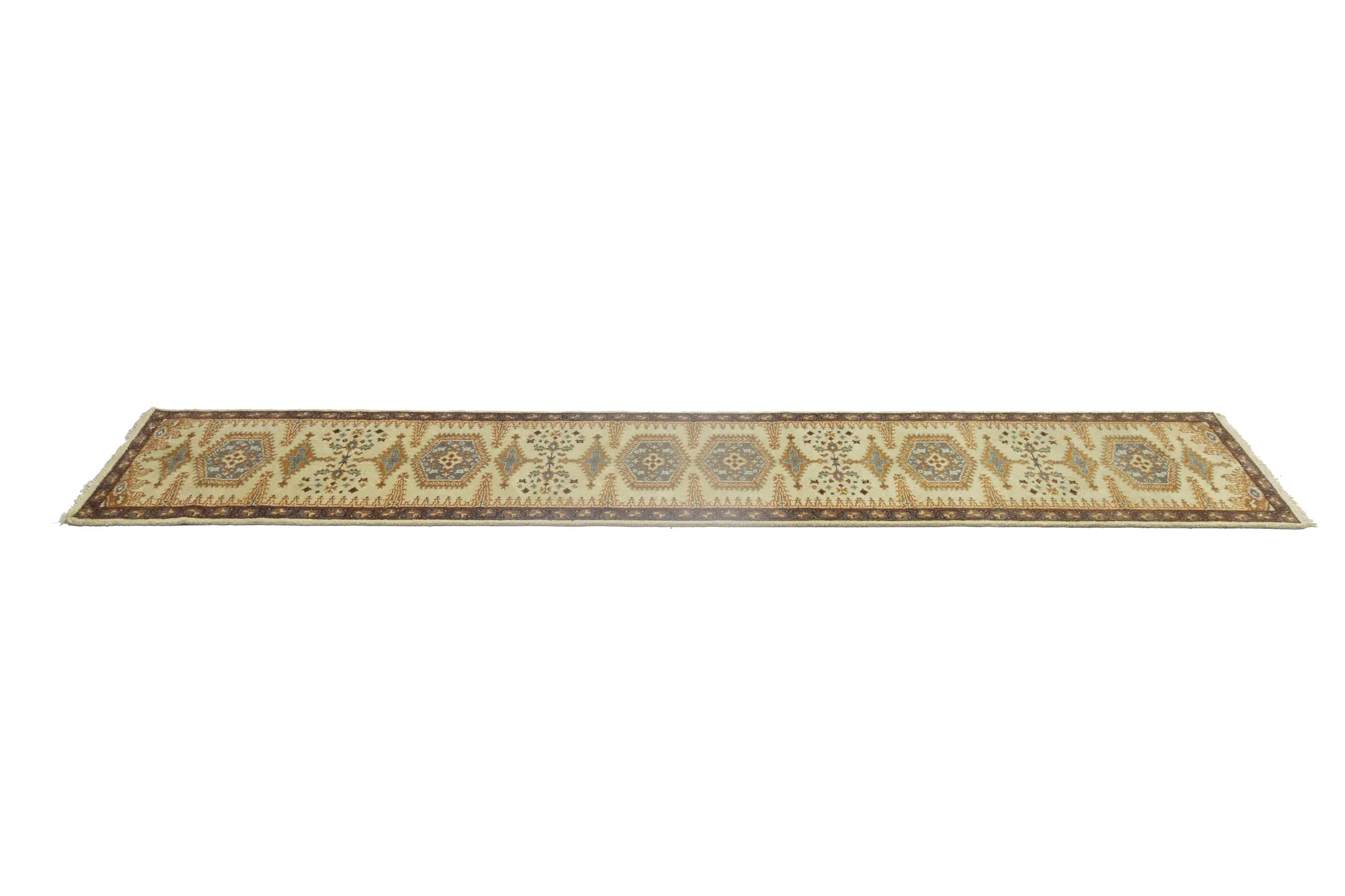 This original 3X14 beige new Oriental runner was finely knotted by the hands of weavers influenced by a variety of amazing artistic designs, to recreate the aged look of the exceptional piece with a richness of color and embellished background field. What set this vintage style Oriental area runner from the others are the material and dye used (wool pile and cotton foundation), knot count, antique designs, fantastic grades, and its regional historical connection: it has deep roots, from the story of the people who produced it to the meaning of the symbols and colors displayed across its canvas that have been praised for centuries. This Indian home décor carpet will be completely cozy and inviting that never will go out of style!