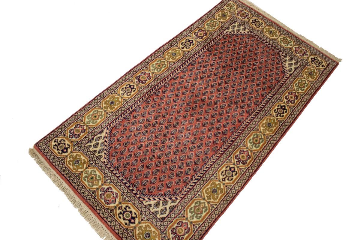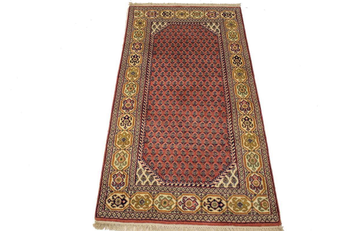 Hand Knotted 2'5X4'5 red oriental rug made with vegetable dyes (fine wool pile and cotton foundation), superior knot count, and alluring ancient designs. This Oriental rug never will go out of style and would be among your most valuable treasures.