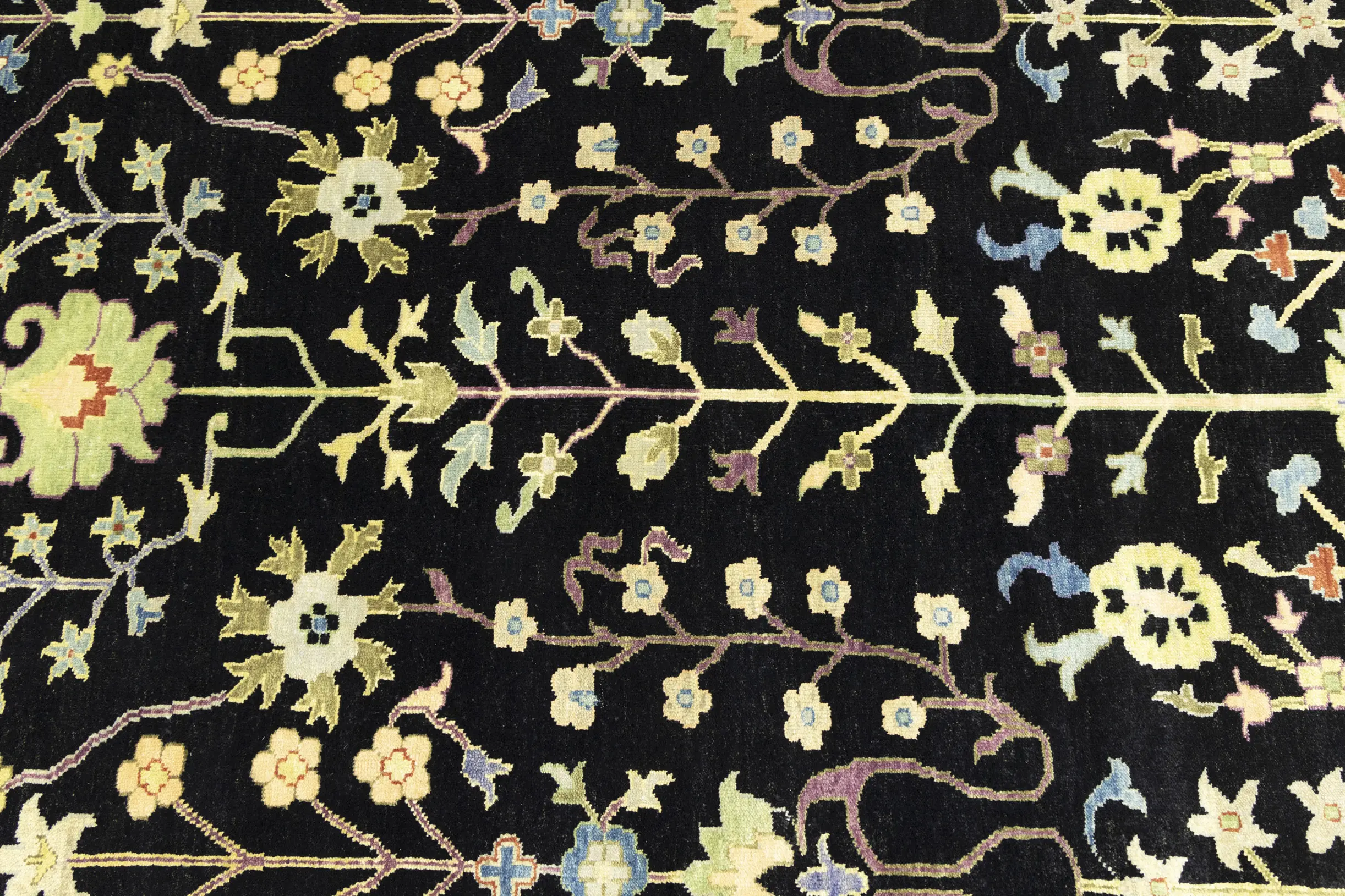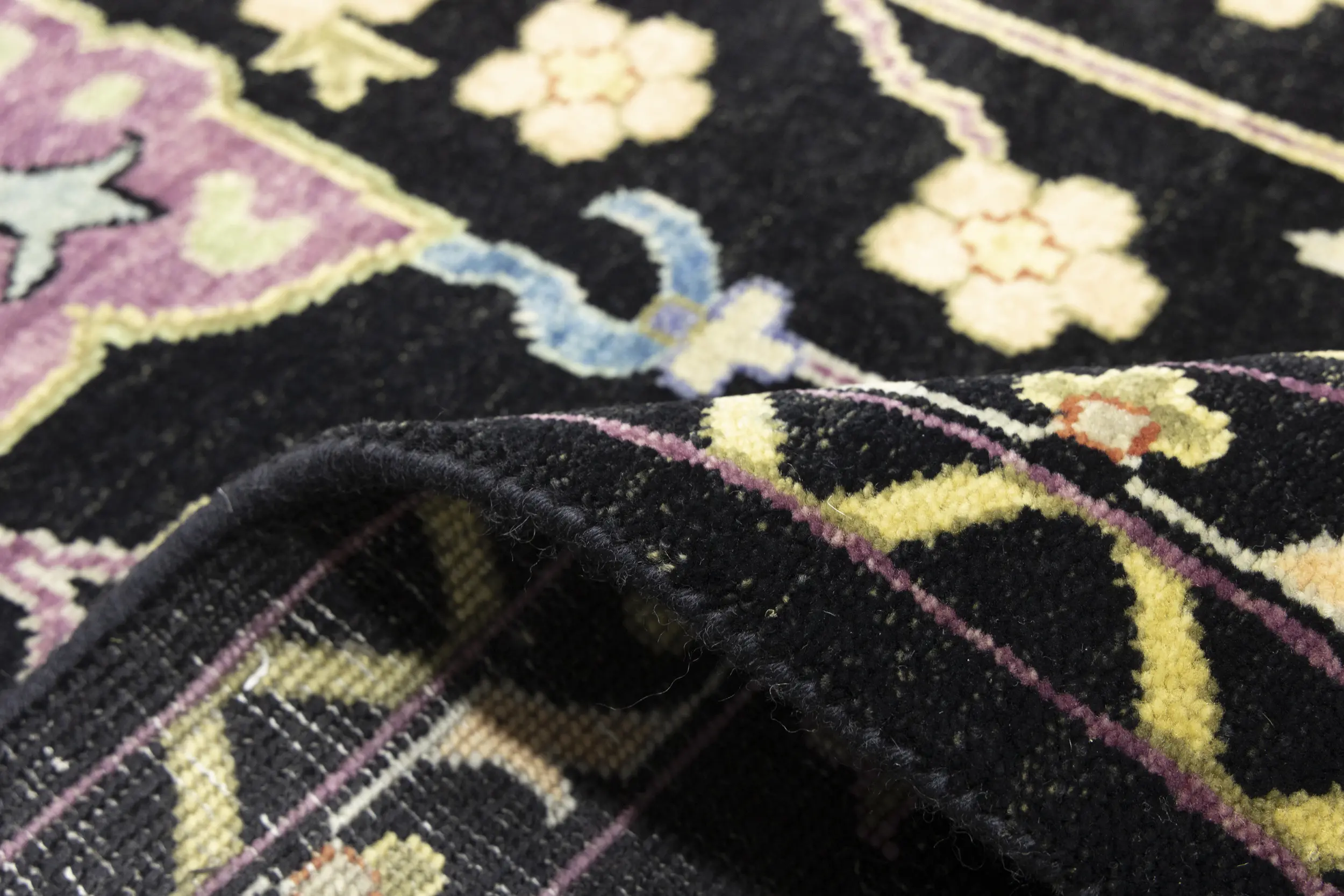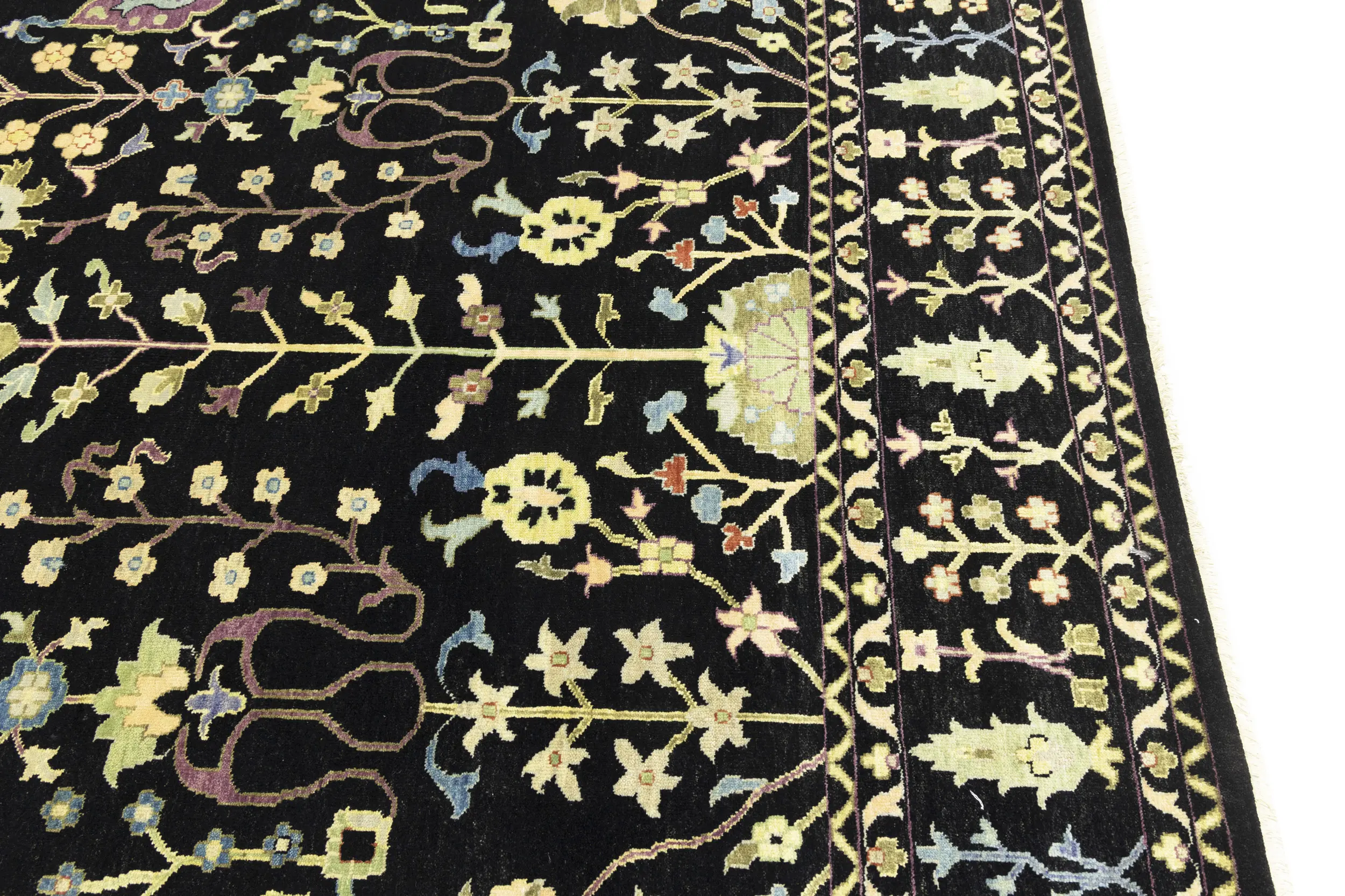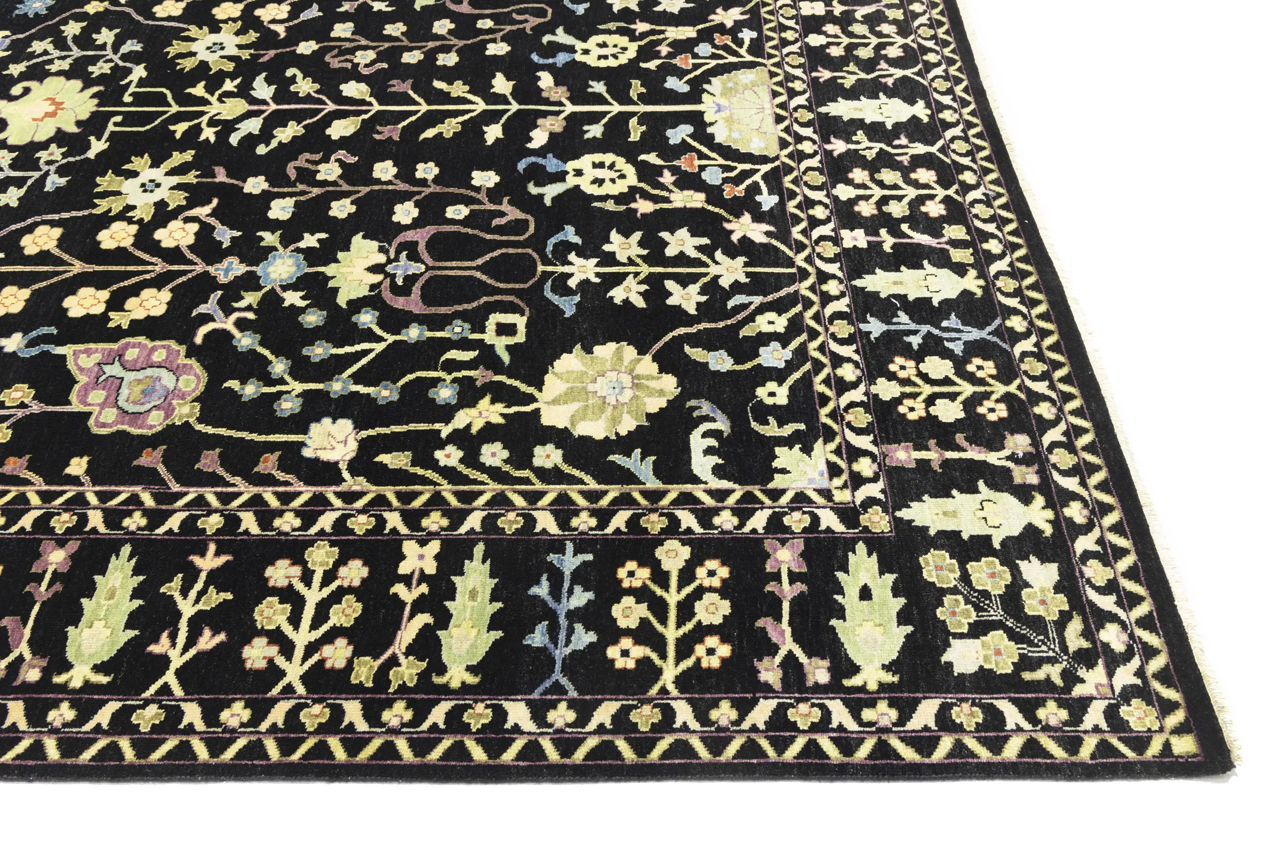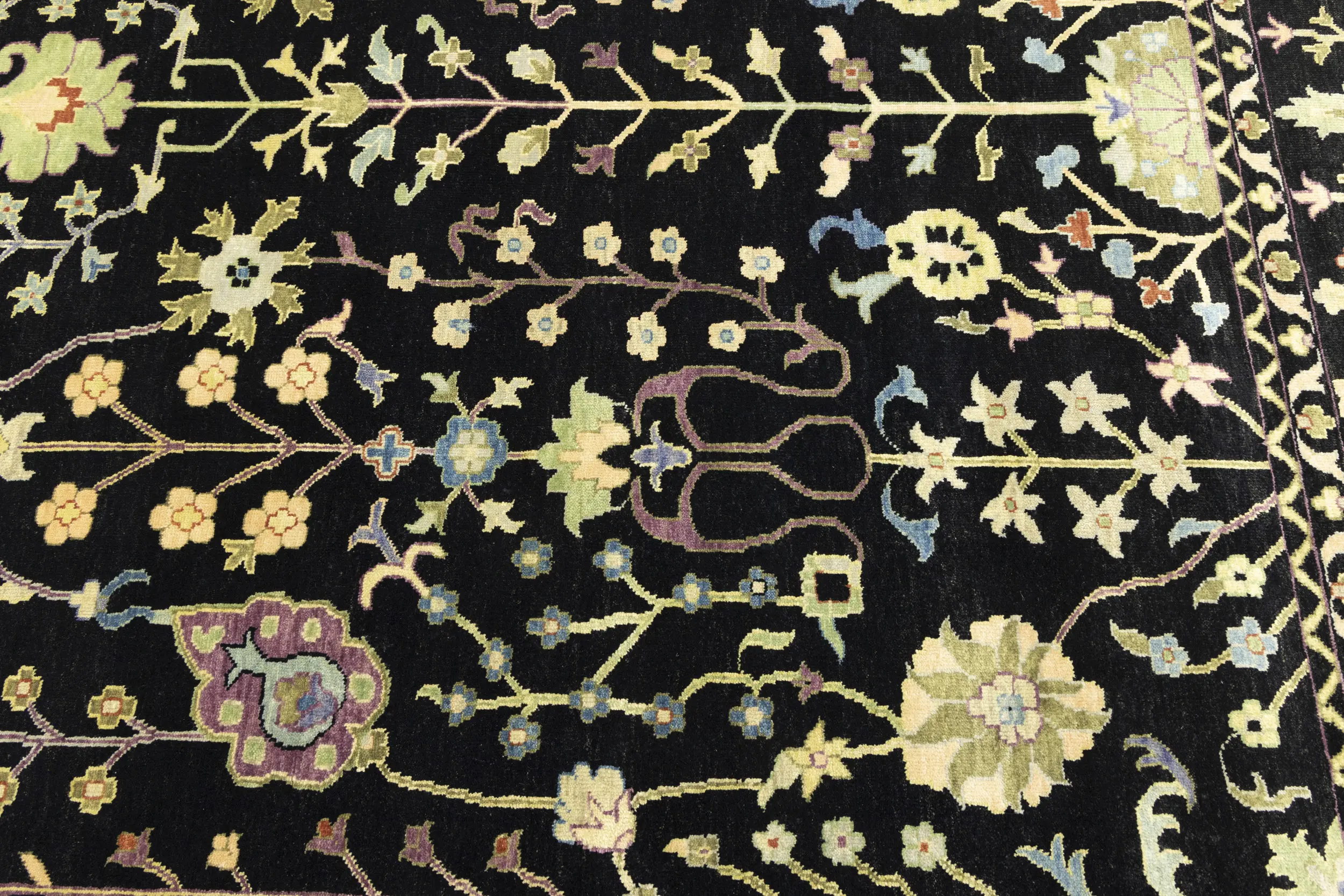 This original 10X14 black new Oriental rug was finely knotted by the hands of weavers influenced by a variety of amazing artistic designs, to recreate the aged look of the exceptional piece with a richness of color and embellished background field. What set this vintage style Oriental area rug from the others are the material and dye used (wool pile and cotton foundation), knot count, antique designs, fantastic grades, and its regional historical connection: it has deep roots, from the story of the people who produced it to the meaning of the symbols and colors displayed across its canvas that have been praised for centuries. This Indian home décor carpet will be completely cozy and inviting that never will go out of style! Also, this Oriental rug would be among your most valuable treasures, it is a great investment that increase in value over time, and it will last a lifetime because was woven with high-quality, all-natural wool. Eco-friendly, opulent yet affordable; this rug will give you an extra pop of character to help define your home environment with luxury and warmth that will capture the eyes and attention of your audience (homeowners, designers, decorators, family and friends).