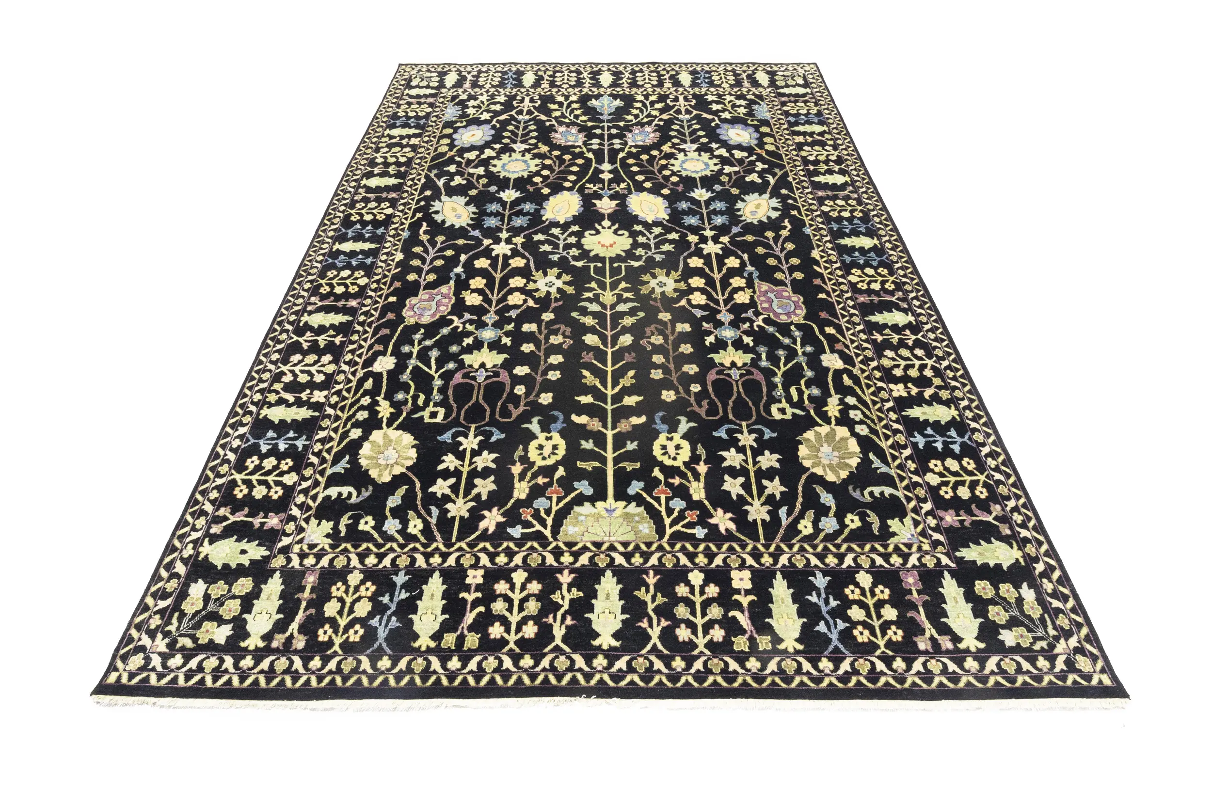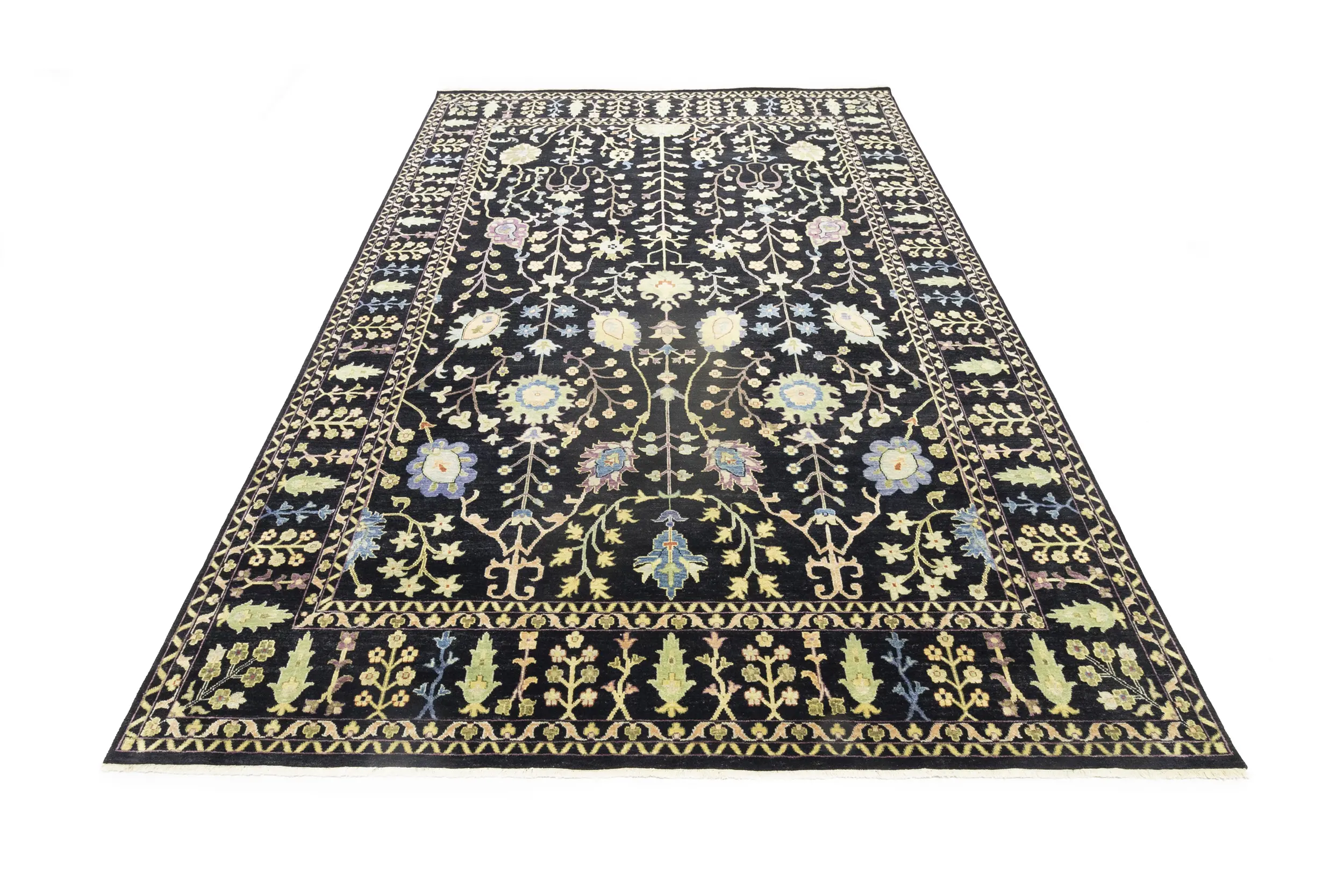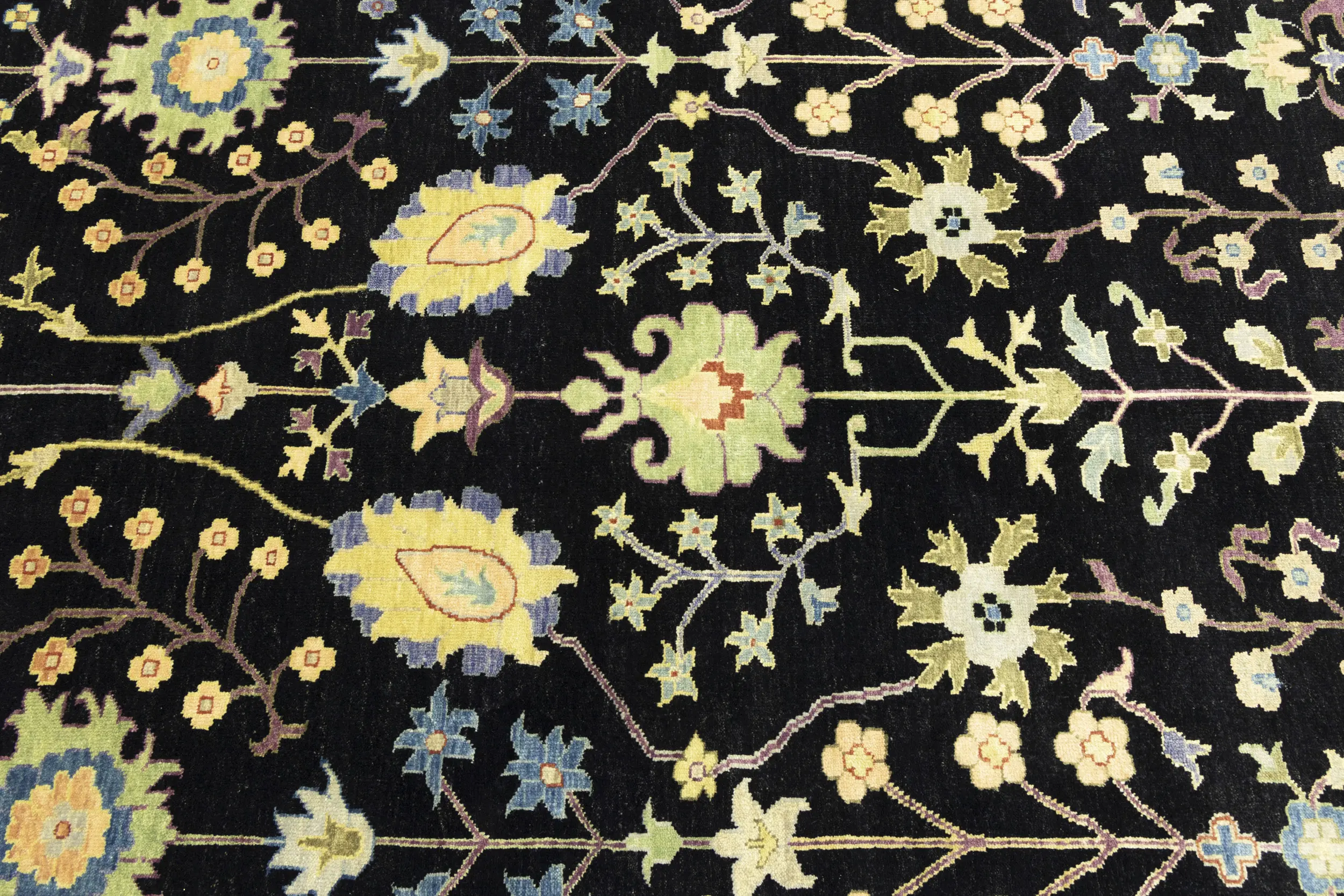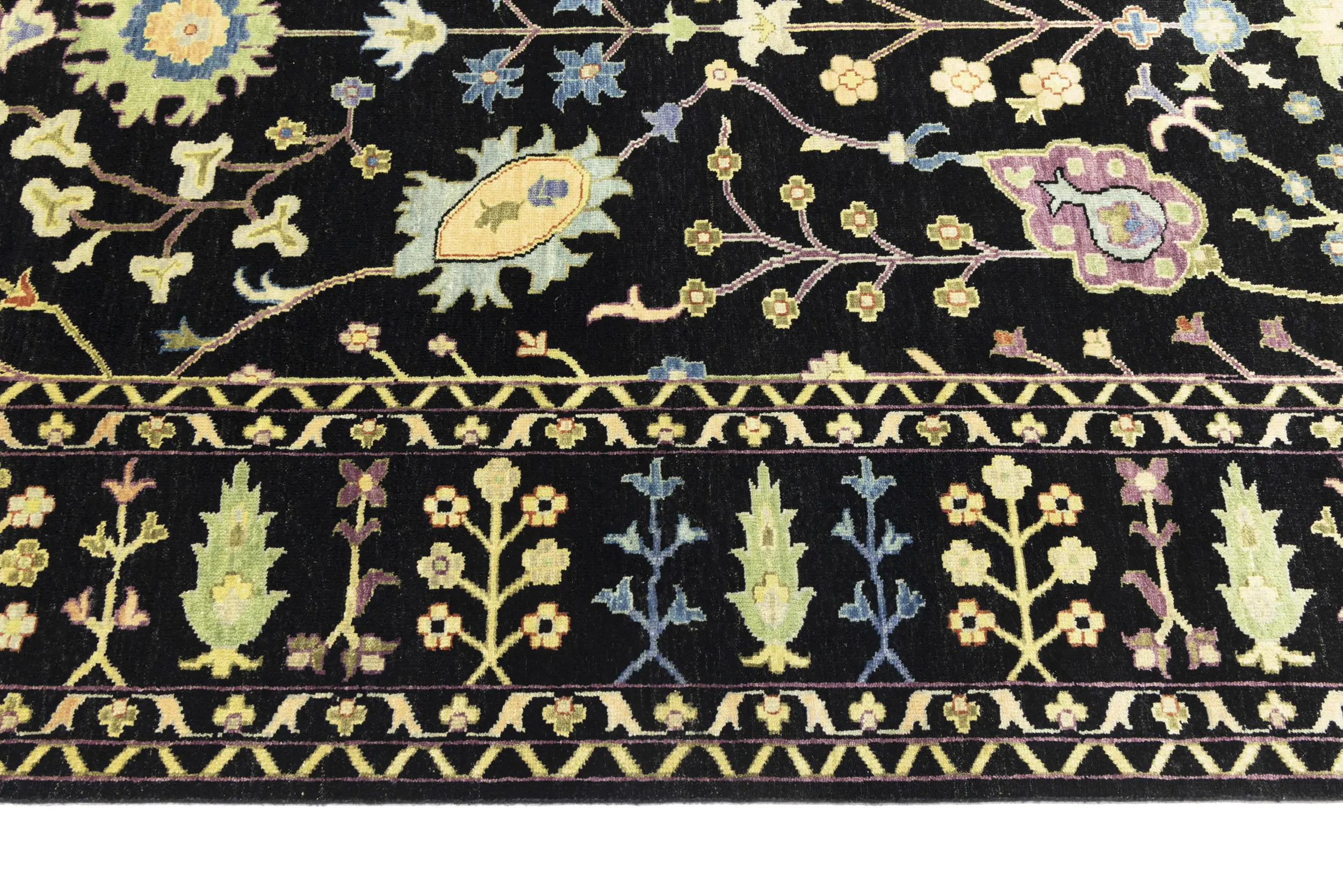 This original 10X14 black new Oriental rug was finely knotted by the hands of weavers influenced by a variety of amazing artistic designs, to recreate the aged look of the exceptional piece with a richness of color and embellished background field. What set this vintage style Oriental area rug from the others are the material and dye used (wool pile and cotton foundation), knot count, antique designs, fantastic grades, and its regional historical connection: it has deep roots, from the story of the people who produced it to the meaning of the symbols and colors displayed across its canvas that have been praised for centuries. This Indian home décor carpet will be completely cozy and inviting that never will go out of style! Also, this Oriental rug would be among your most valuable treasures, it is a great investment that increase in value over time, and it will last a lifetime because was woven with high-quality, all-natural wool. Eco-friendly, opulent yet affordable; this rug will give you an extra pop of character to help define your home environment with luxury and warmth that will capture the eyes and attention of your audience (homeowners, designers, decorators, family and friends).