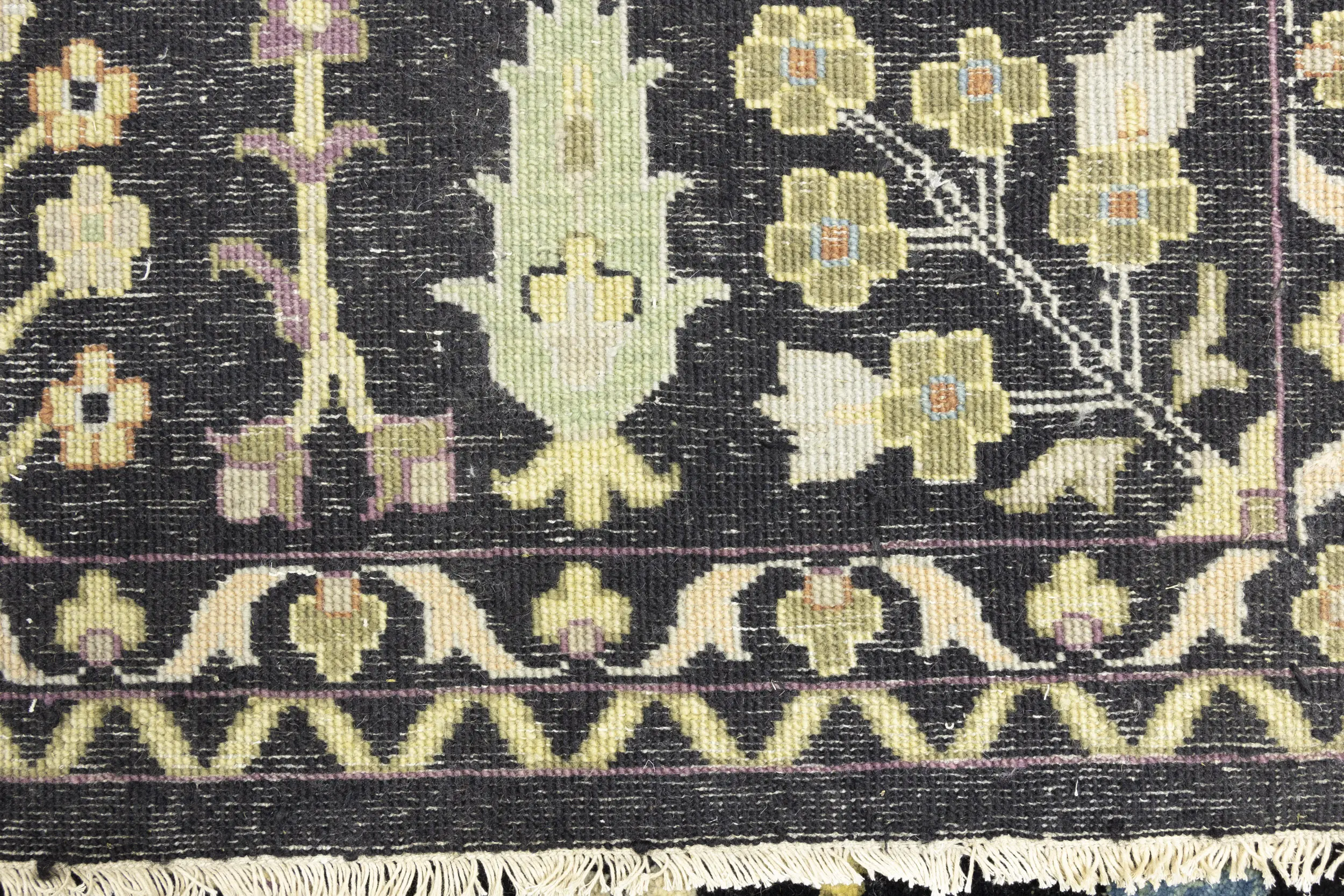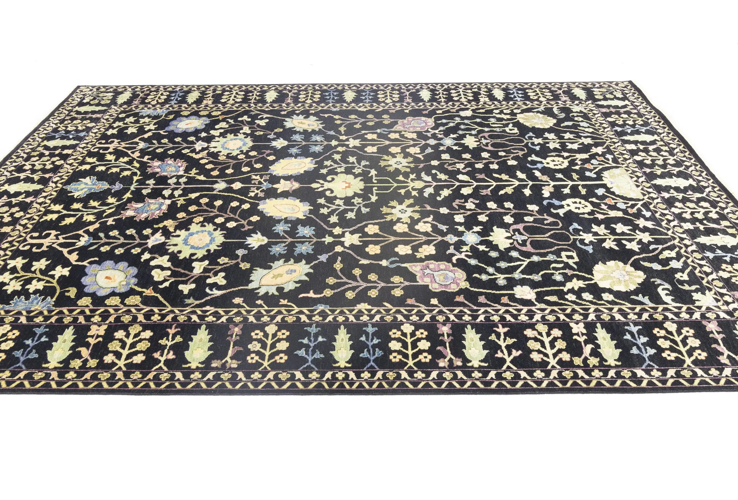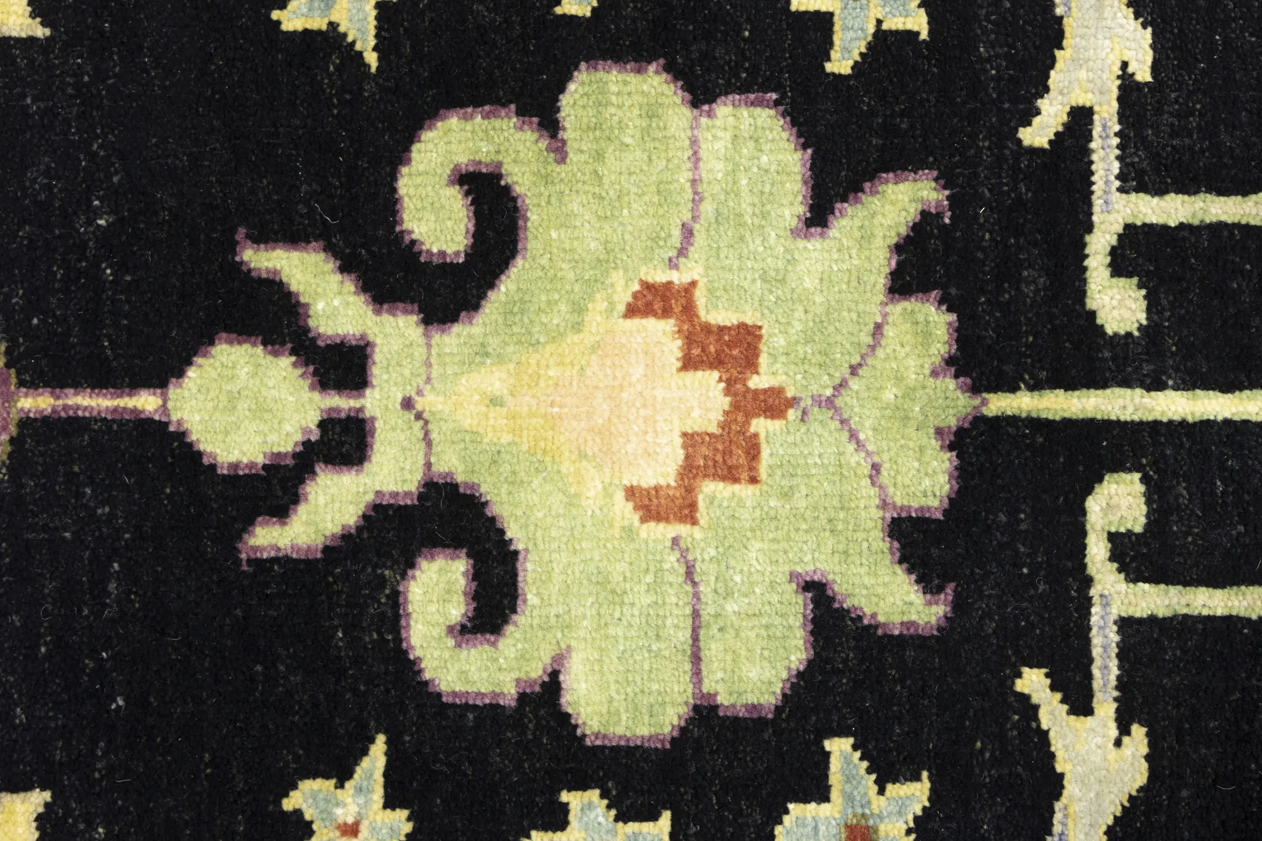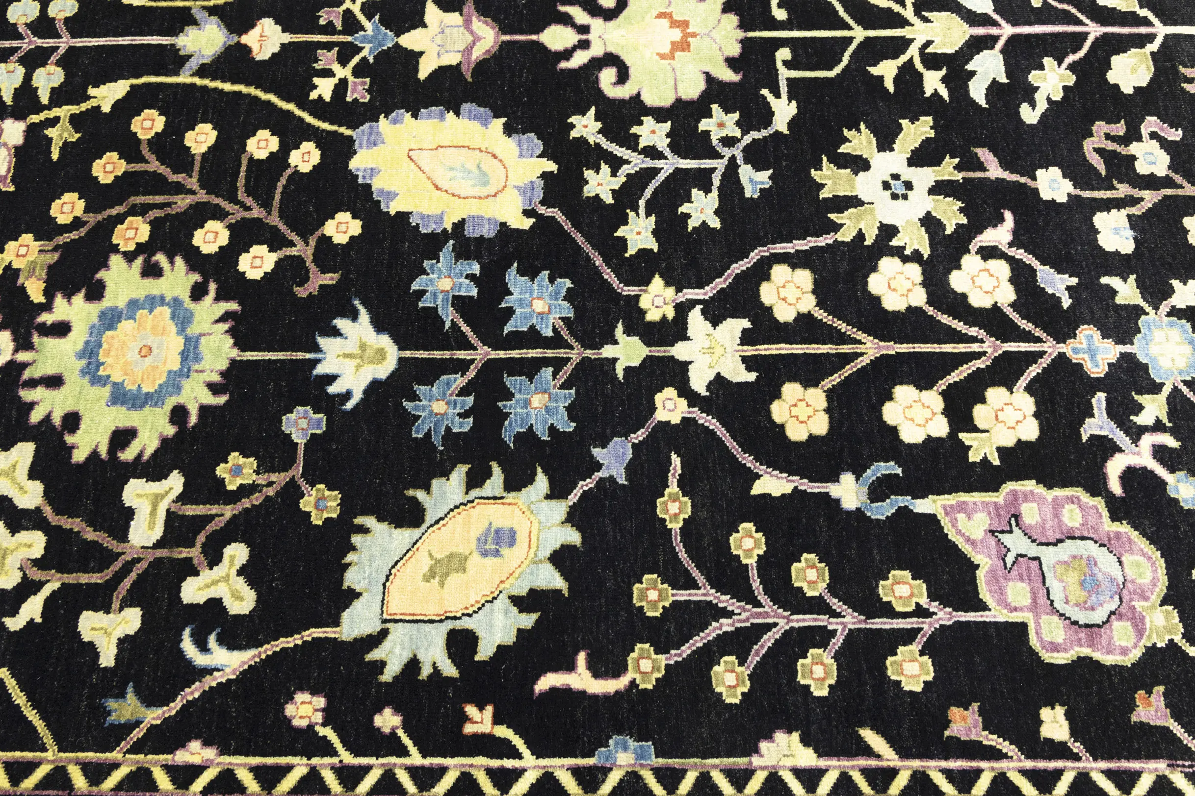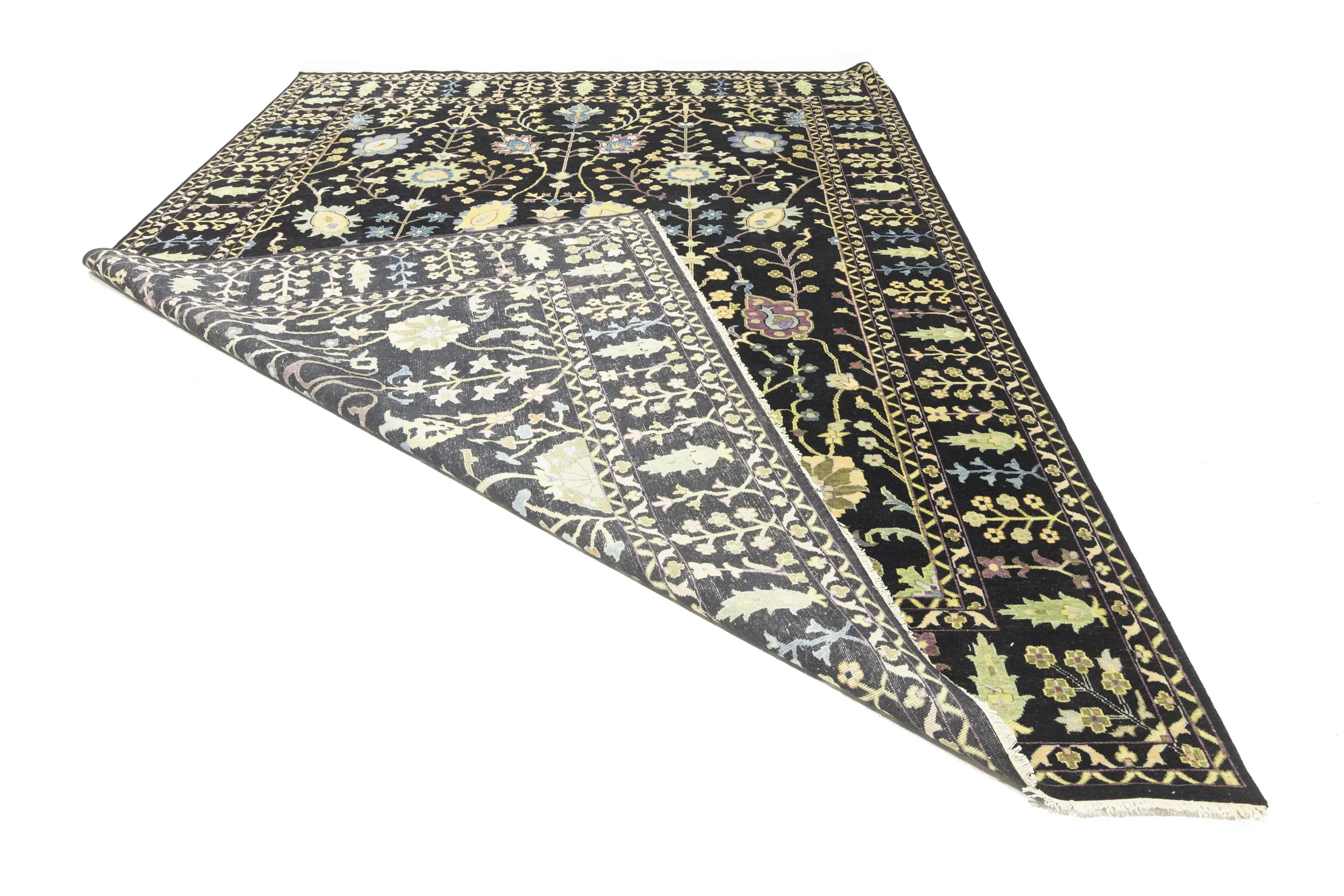 This original 10X14 black new Oriental rug was finely knotted by the hands of weavers influenced by a variety of amazing artistic designs, to recreate the aged look of the exceptional piece with a richness of color and embellished background field. What set this vintage style Oriental area rug from the others are the material and dye used (wool pile and cotton foundation), knot count, antique designs, fantastic grades, and its regional historical connection: it has deep roots, from the story of the people who produced it to the meaning of the symbols and colors displayed across its canvas that have been praised for centuries. This Indian home décor carpet will be completely cozy and inviting that never will go out of style! Also, this Oriental rug would be among your most valuable treasures, it is a great investment that increase in value over time, and it will last a lifetime because was woven with high-quality, all-natural wool. Eco-friendly, opulent yet affordable; this rug will give you an extra pop of character to help define your home environment with luxury and warmth that will capture the eyes and attention of your audience (homeowners, designers, decorators, family and friends).