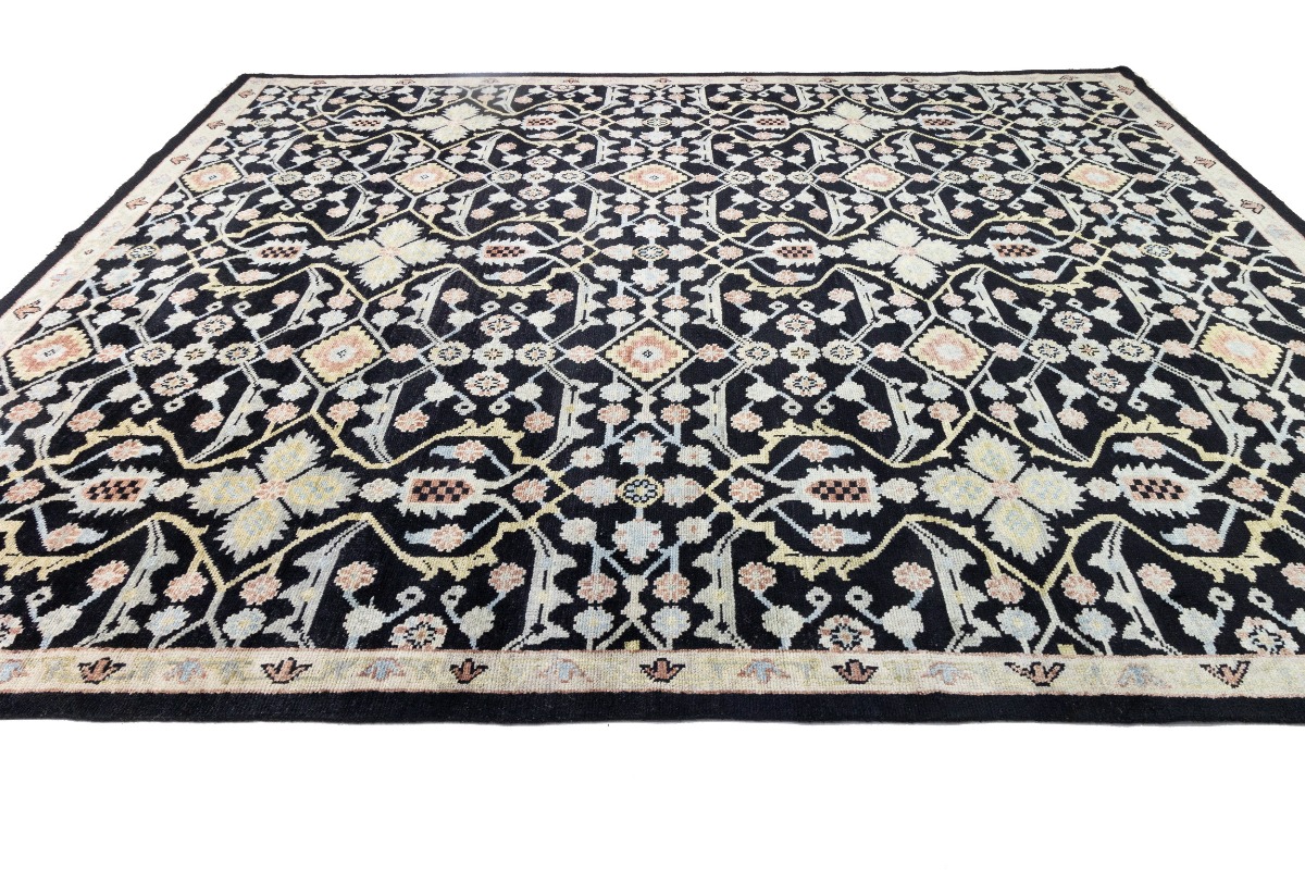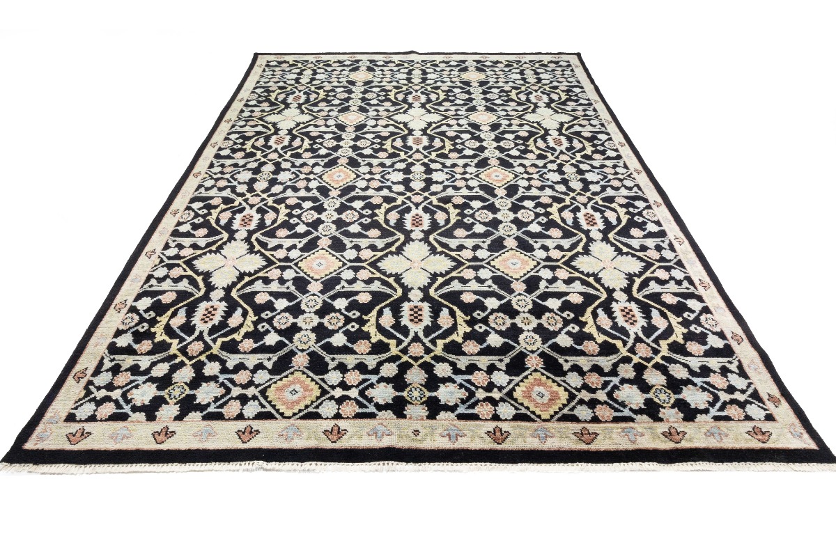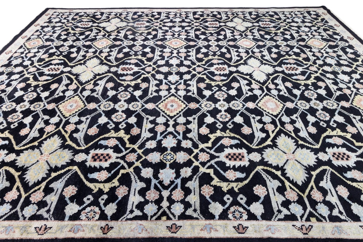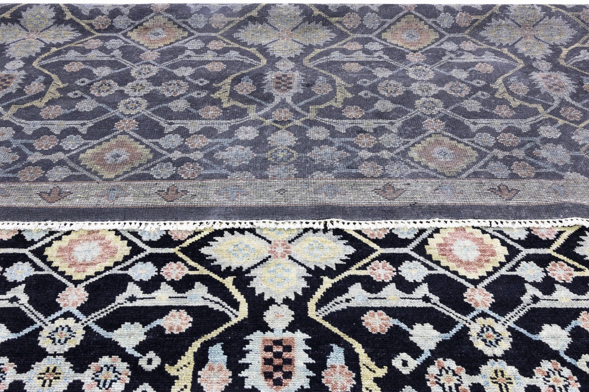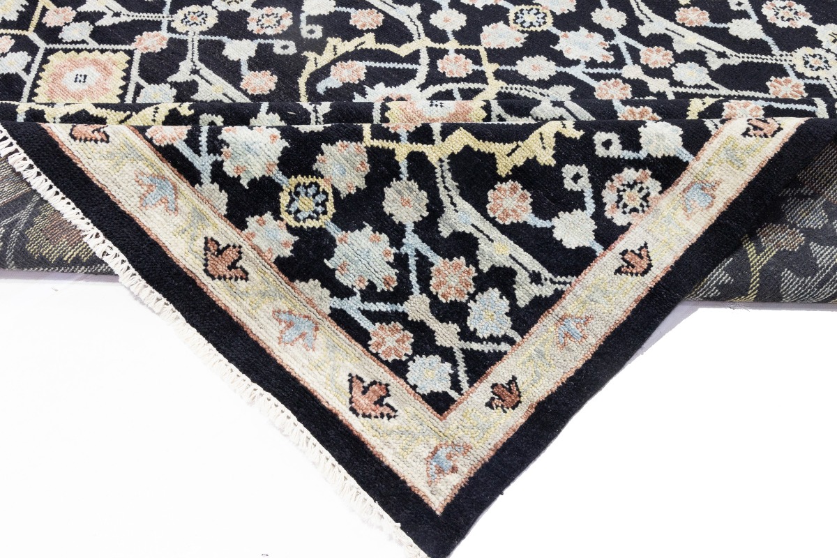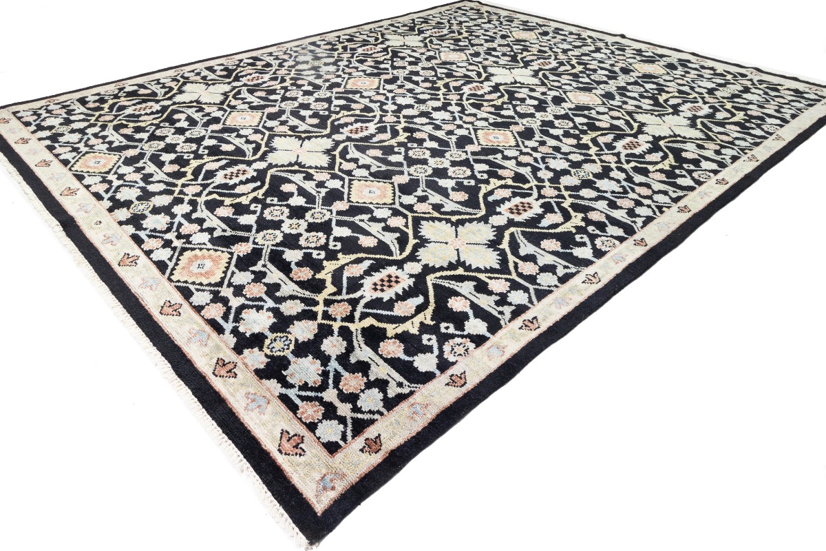 This genuine 12X15 black new Oriental rug was made by the hands of gifted weavers inspired by a variety of spectacular artistic designs, to recreate the aged look of the original piece with a richness of color and ornately patterned background field. What set this vintage style Oriental area rug from the others are the material and dye used (wool pile and cotton foundation), knot count, ancient designs, fantastic grades, and its regional historical connection: it has deep roots, from the story of the people who produced it to the meaning of the symbols and colors displayed across its canvas that have been praised for centuries. This Indian home décor carpet will be completely cozy and inviting that never will go out of style! Also, this Oriental rug would be among your most valuable treasures, it is a great investment that accrues value over time, and it will last for generations because was woven with high-quality, all-natural wool. Environmentally friendly, opulent yet affordable; this rug will give you a thorough amount of character to help define your living space with elegance and warmth that will capture the eyes and attention of your audience (homeowners, designers, decorators, family and friends). OT-7564