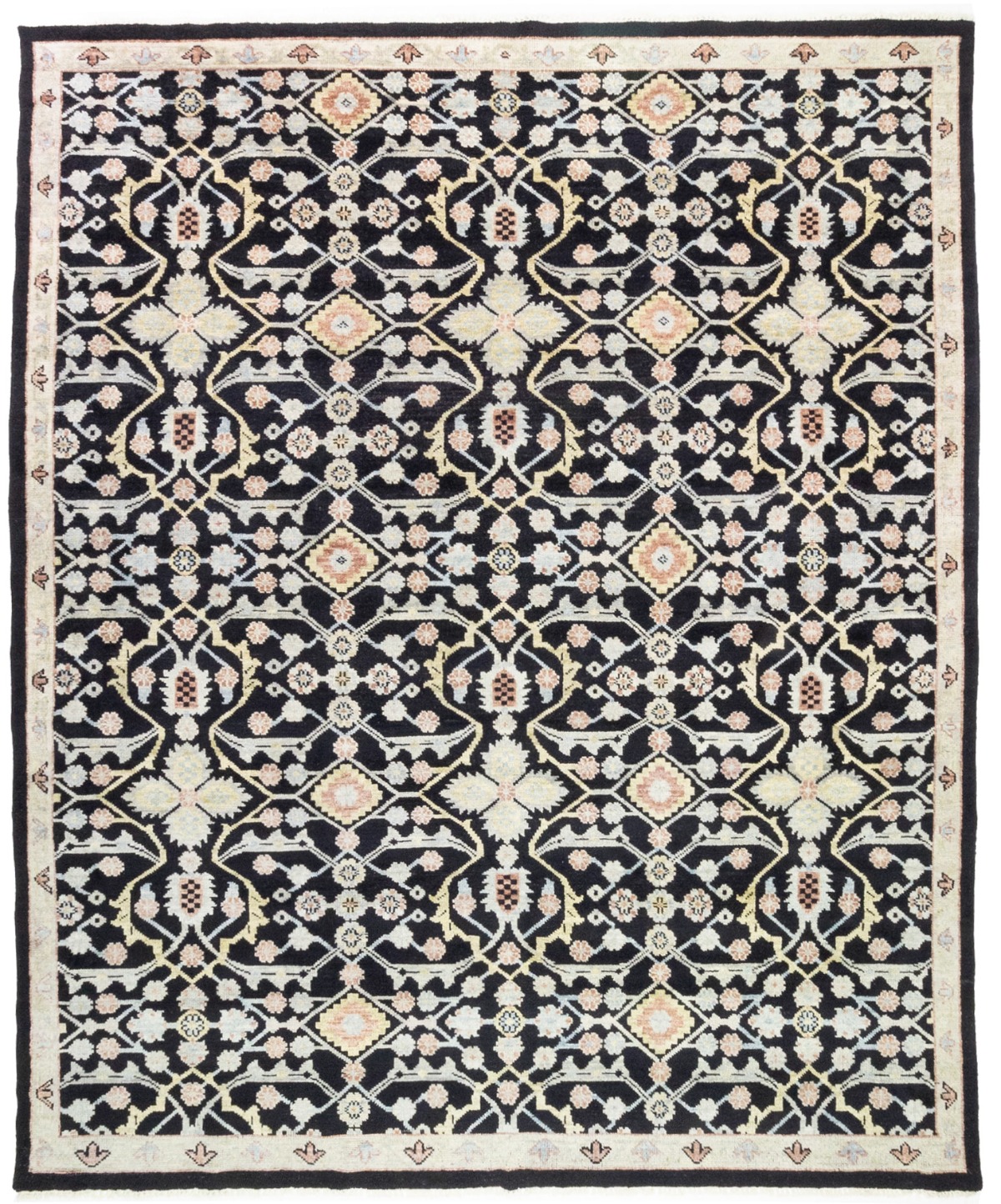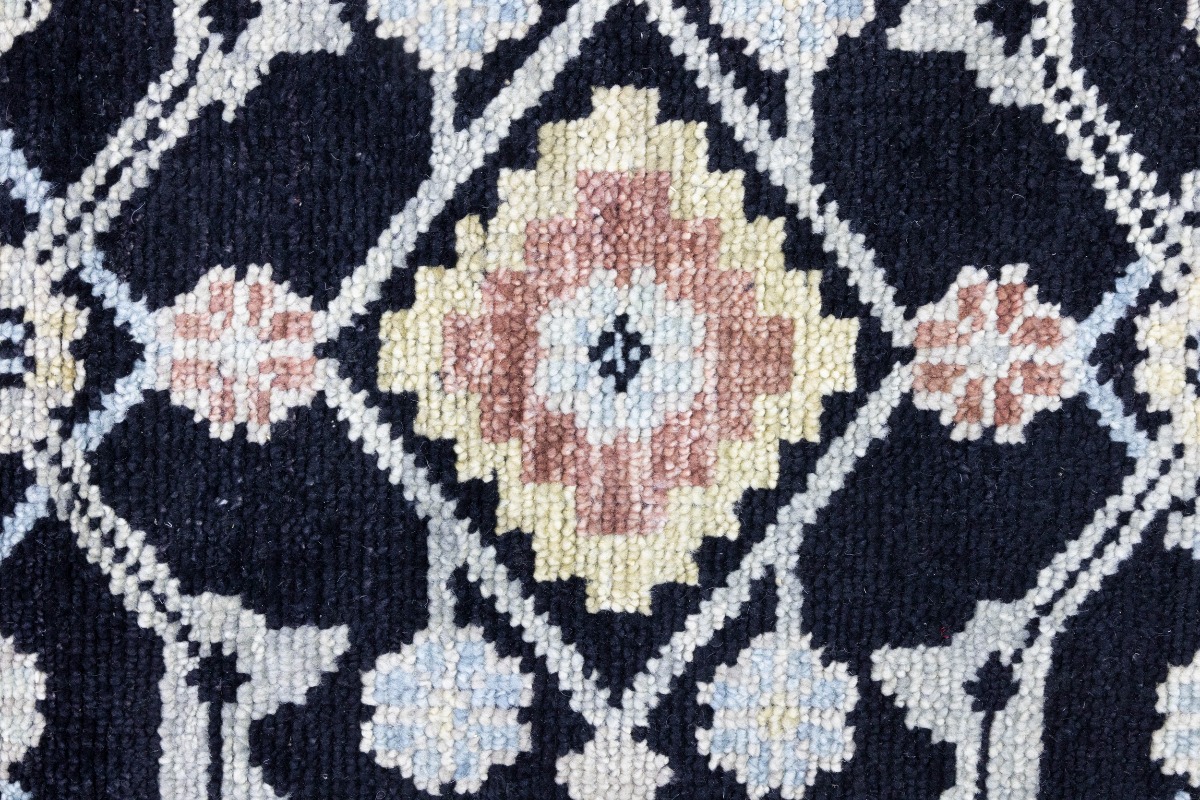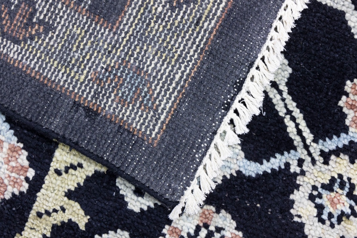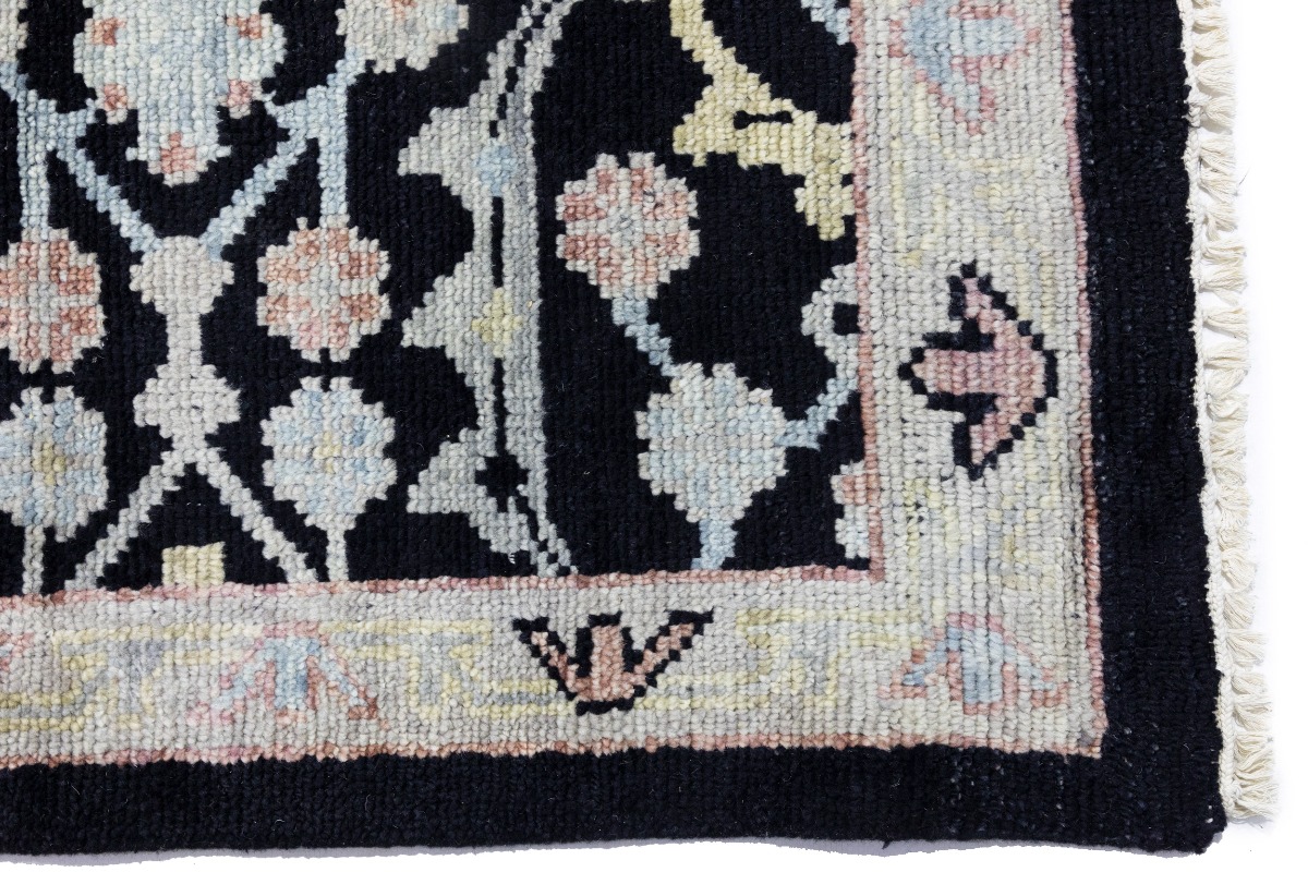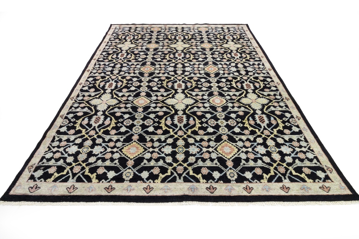This genuine 12X15 black new Oriental rug was made by the hands of gifted weavers inspired by a variety of spectacular artistic designs, to recreate the aged look of the original piece with a richness of color and ornately patterned background field. What set this vintage style Oriental area rug from the others are the material and dye used (wool pile and cotton foundation), knot count, ancient designs, fantastic grades, and its regional historical connection: it has deep roots, from the story of the people who produced it to the meaning of the symbols and colors displayed across its canvas that have been praised for centuries. This Indian home décor carpet will be completely cozy and inviting that never will go out of style! Also, this Oriental rug would be among your most valuable treasures, it is a great investment that accrues value over time, and it will last for generations because was woven with high-quality, all-natural wool. Environmentally friendly, opulent yet affordable; this rug will give you a thorough amount of character to help define your living space with elegance and warmth that will capture the eyes and attention of your audience (homeowners, designers, decorators, family and friends). OT-7564