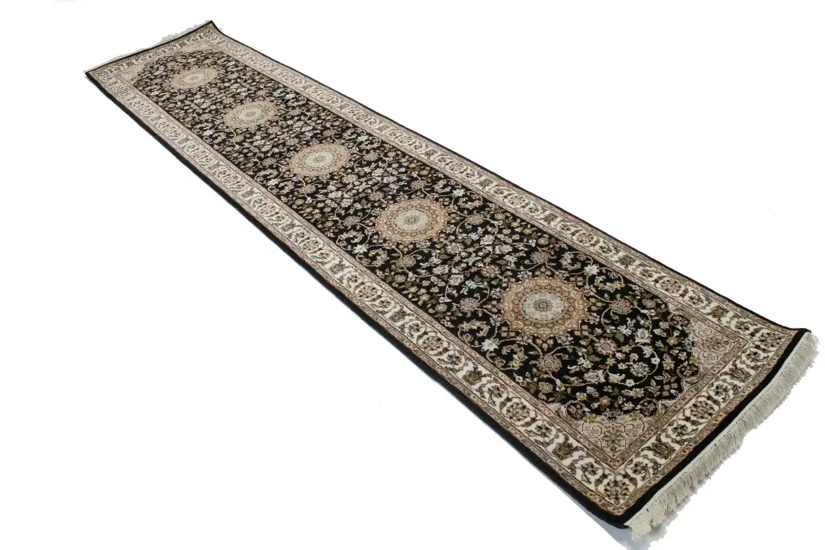 Handmade 3X12 black Oriental runner made with vegetable dyes (fine wool pile and cotton foundation), exceptional knot count, and appealing ancient designs. This Oriental runner never will go out of style and would be among your most valuable treasures.