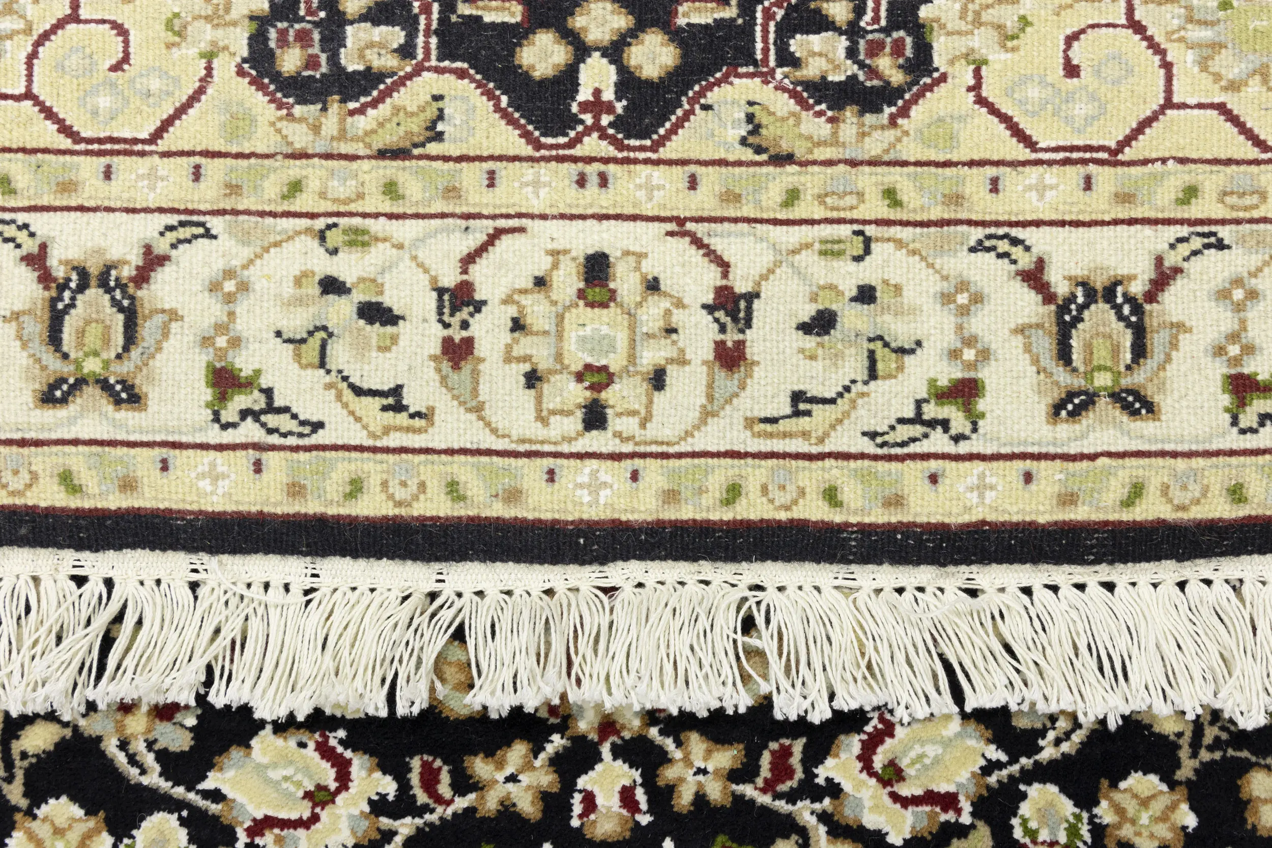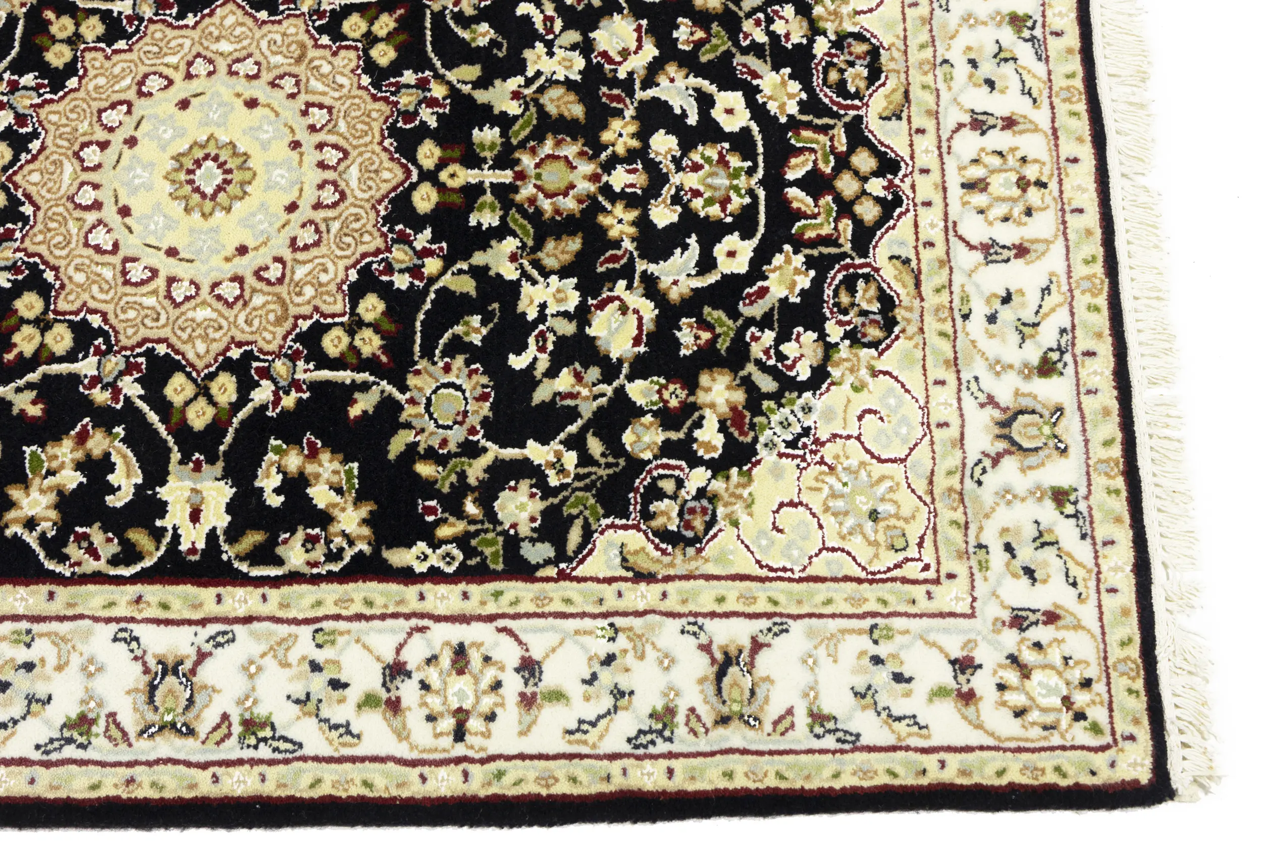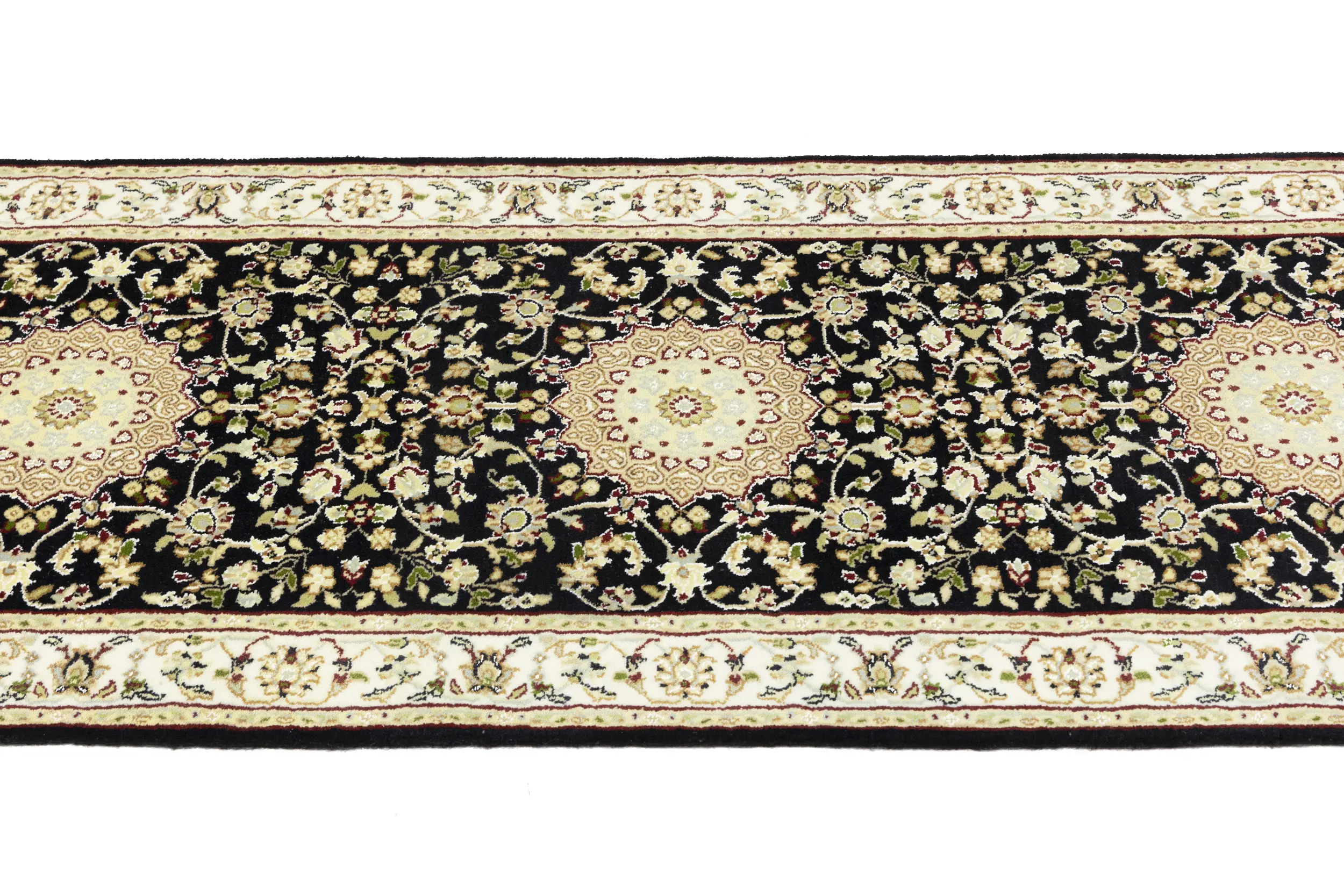 This original 3X12 black new Oriental runner was finely knotted by the hands of weavers influenced by a variety of amazing artistic designs, to recreate the aged look of the exceptional piece with a richness of color and embellished background field. What set this vintage style Oriental area runner from the others are the material and dye used (wool pile and cotton foundation), knot count, antique designs, fantastic grades, and its regional historical connection: it has deep roots, from the story of the people who produced it to the meaning of the symbols and colors displayed across its canvas that have been praised for centuries. This Indian home décor carpet will be completely cozy and inviting that never will go out of style!