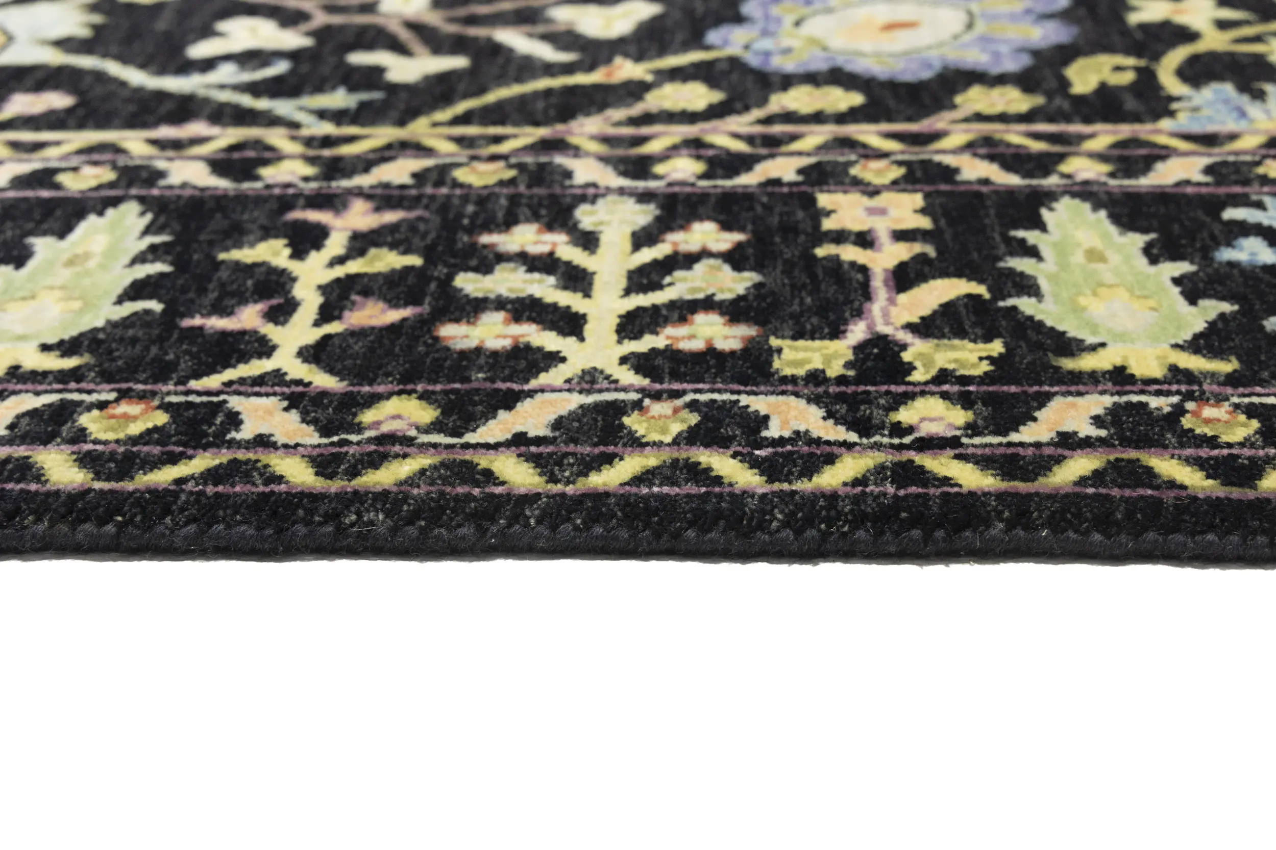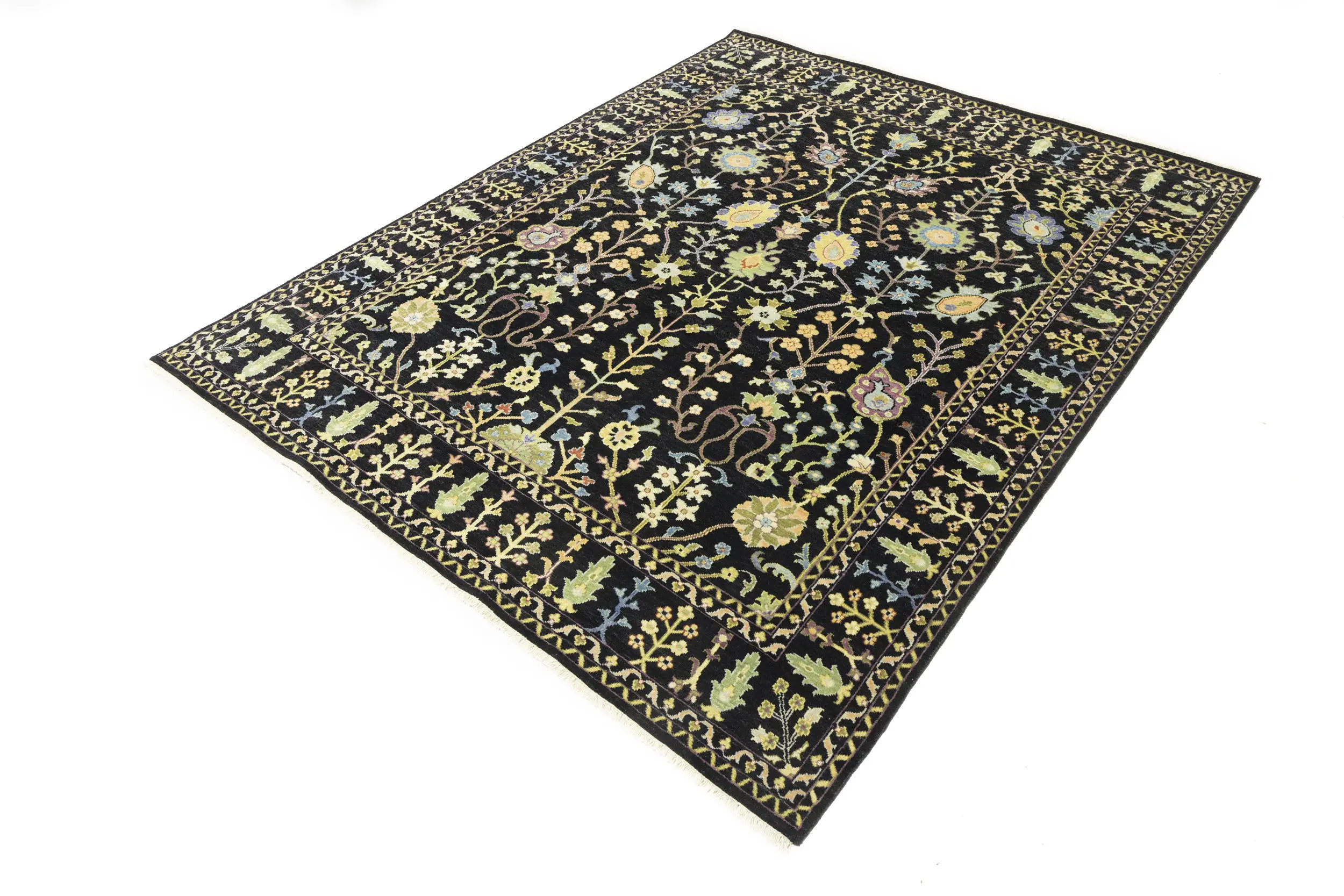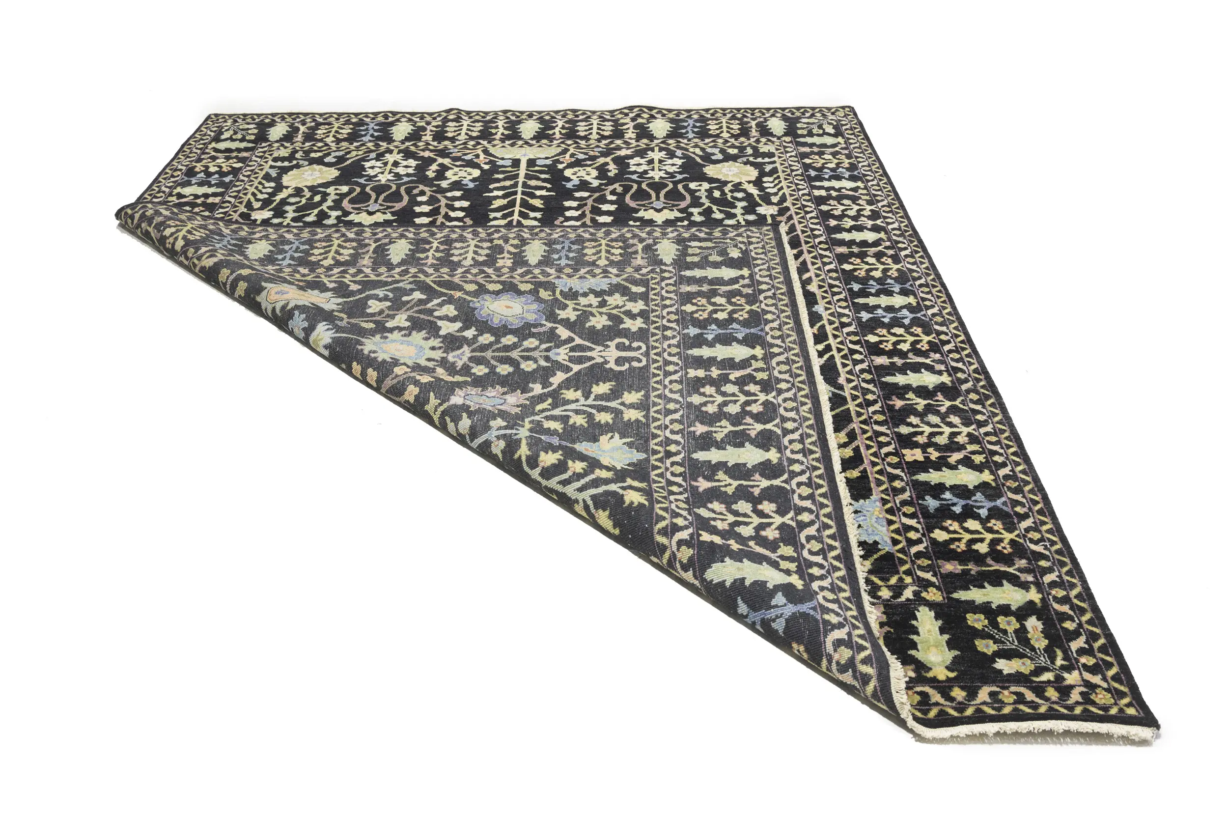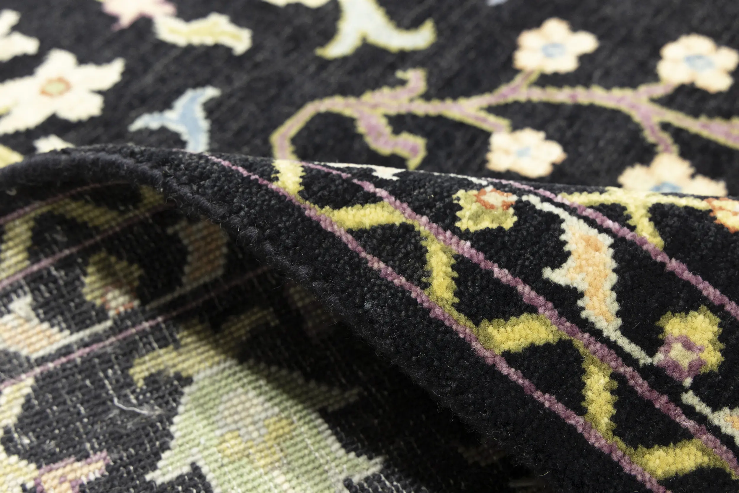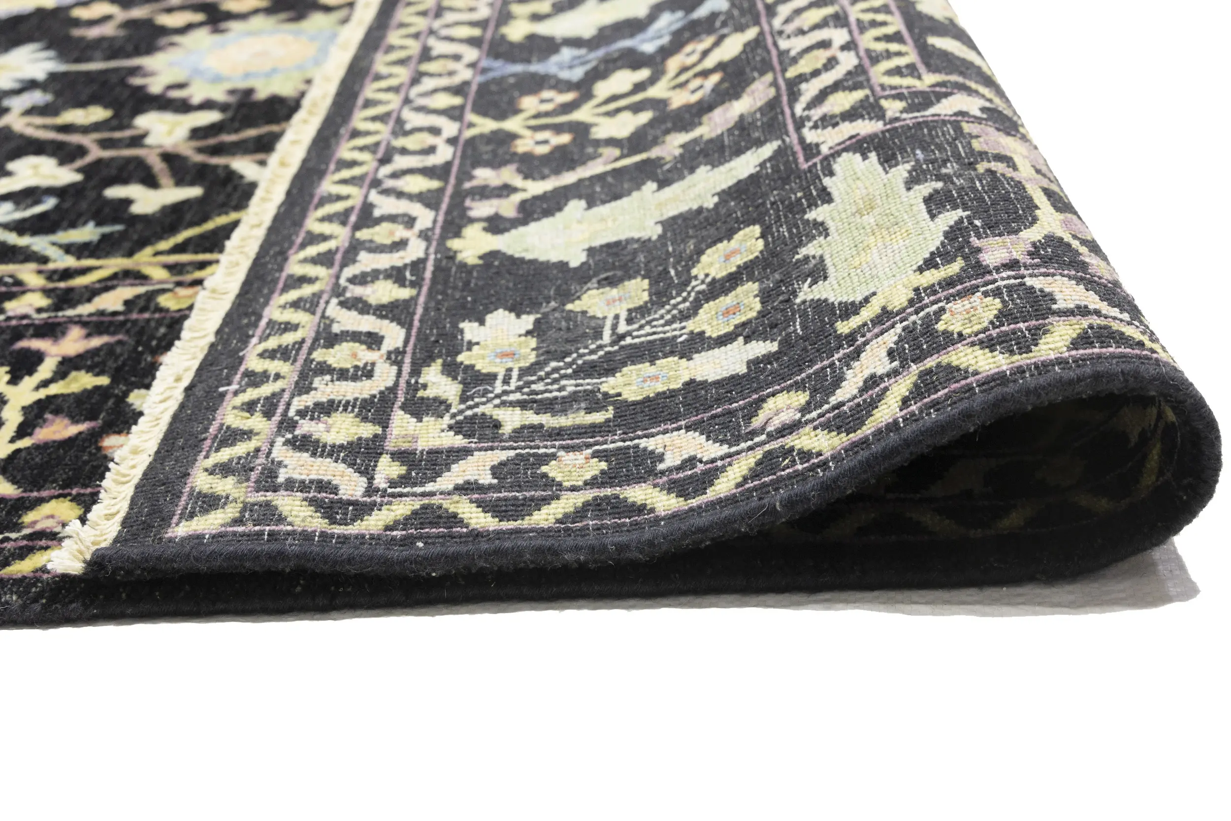 This genuine 8X10 black new Oriental rug was made by the hands of gifted weavers inspired by a variety of spectacular artistic designs, to recreate the aged look of the original piece with a richness of color and ornately patterned background field. What set this vintage style Oriental area rug from the others are the material and dye used (wool pile and cotton foundation), knot count, ancient designs, fantastic grades, and its regional historical connection: it has deep roots, from the story of the people who produced it to the meaning of the symbols and colors displayed across its canvas that have been praised for centuries. This Indian home décor carpet will be completely cozy and inviting that never will go out of style! Also, this Oriental rug would be among your most valuable treasures, it is a great investment that accrues value over time, and it will last for generations because was woven with high-quality, all-natural wool. Environmentally friendly, opulent yet affordable; this rug will give you a thorough amount of character to help define your living space with elegance and warmth that will capture the eyes and attention of your audience (homeowners, designers, decorators, family and friends).