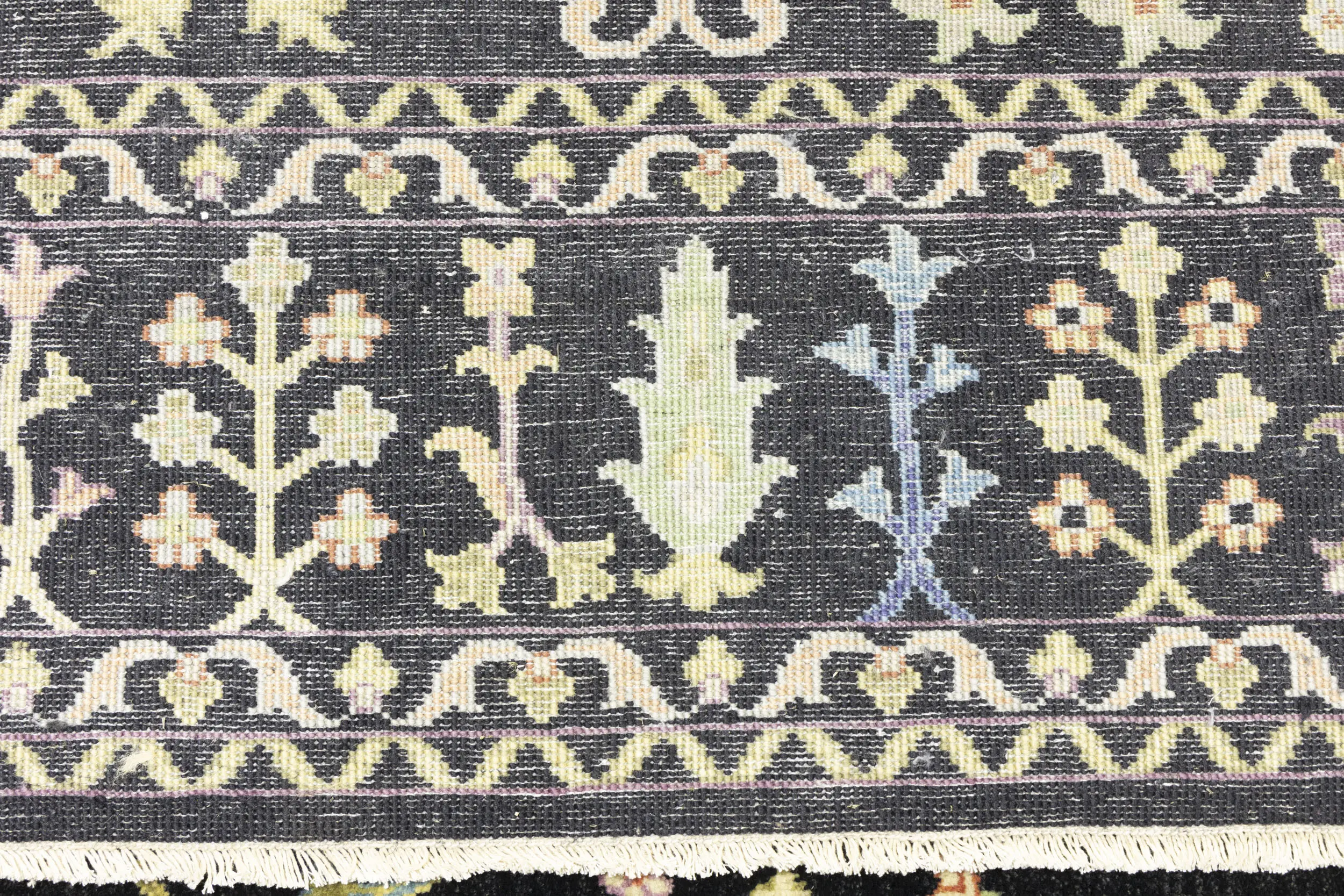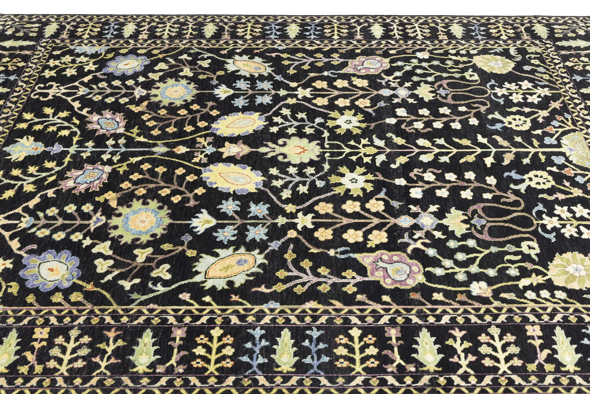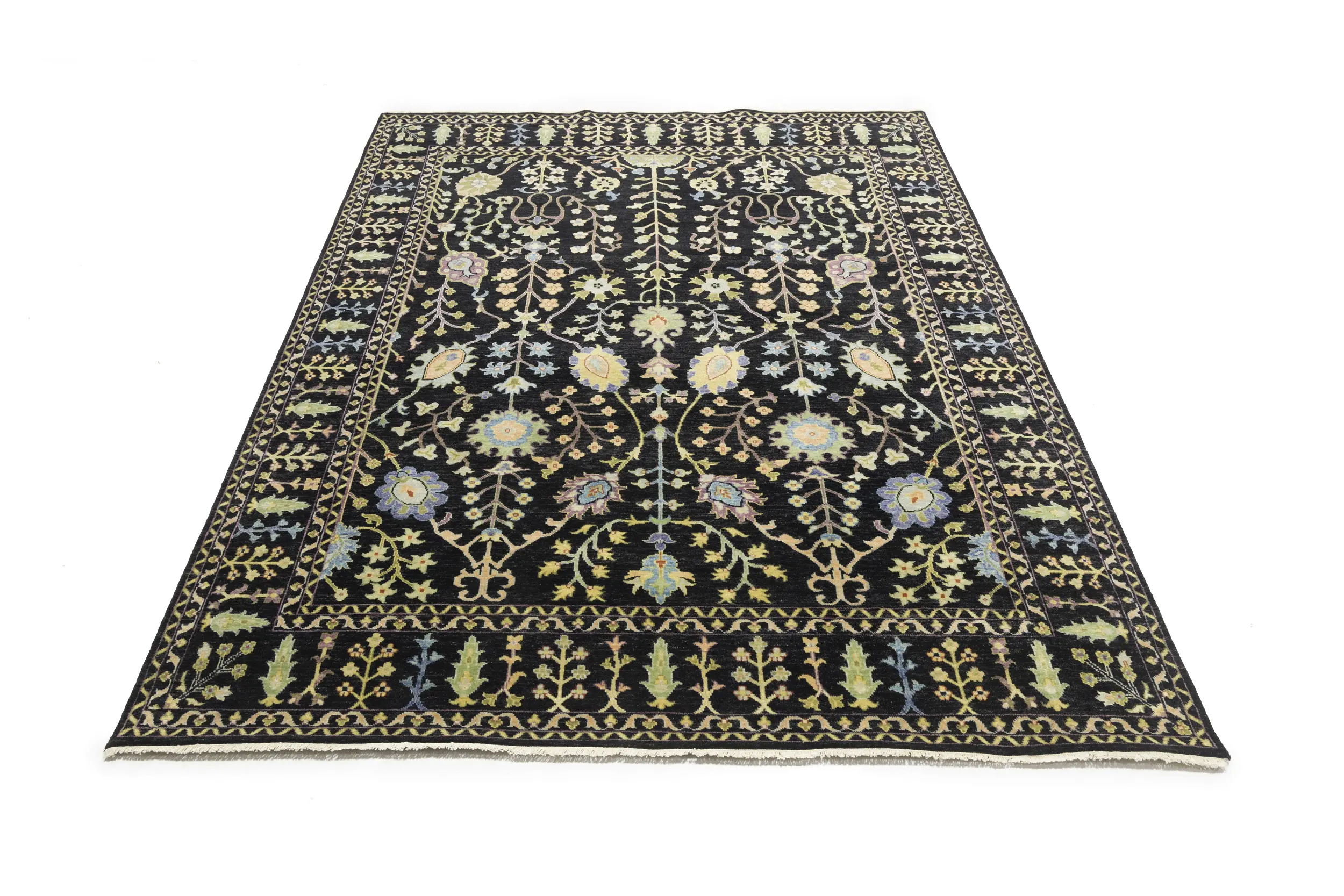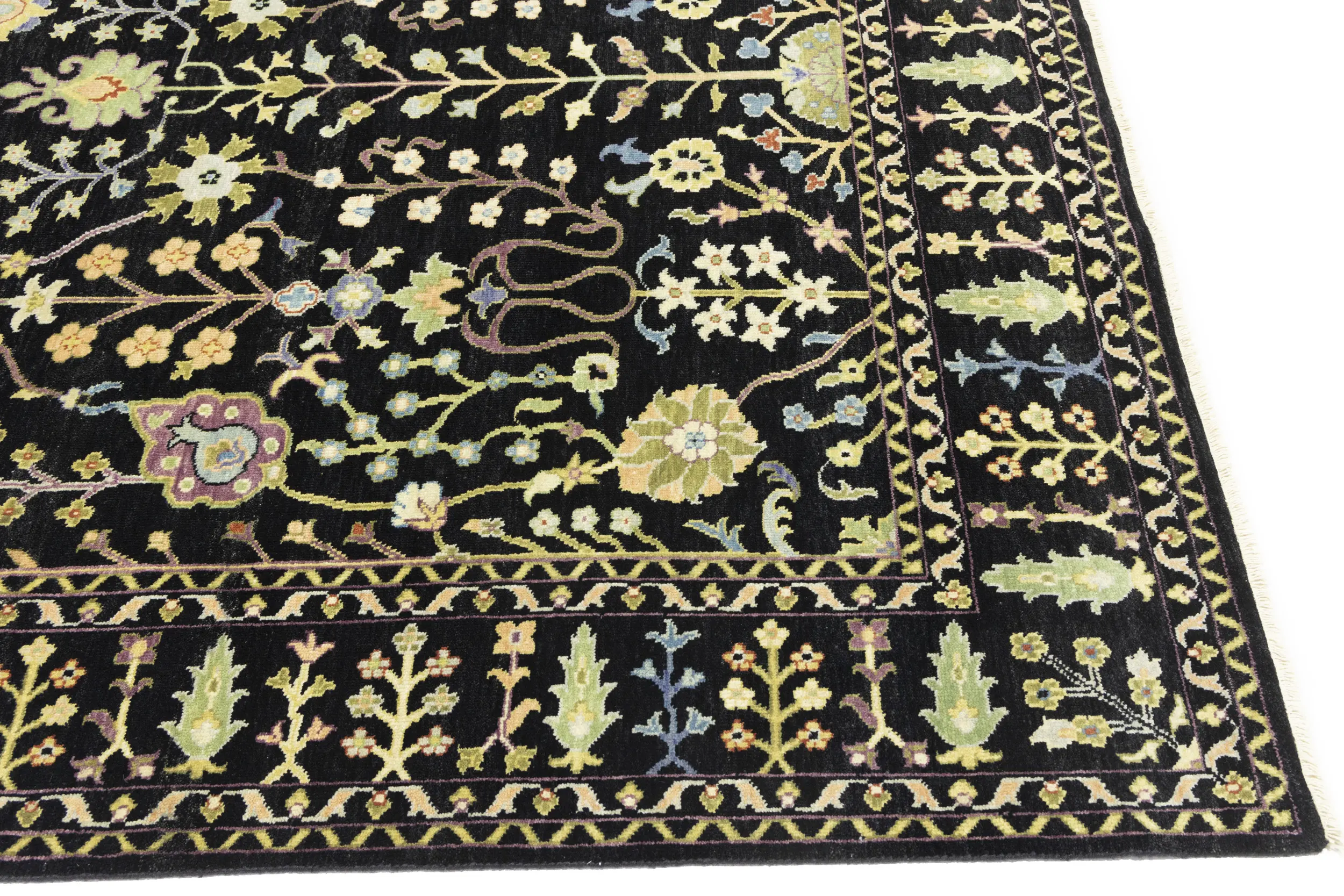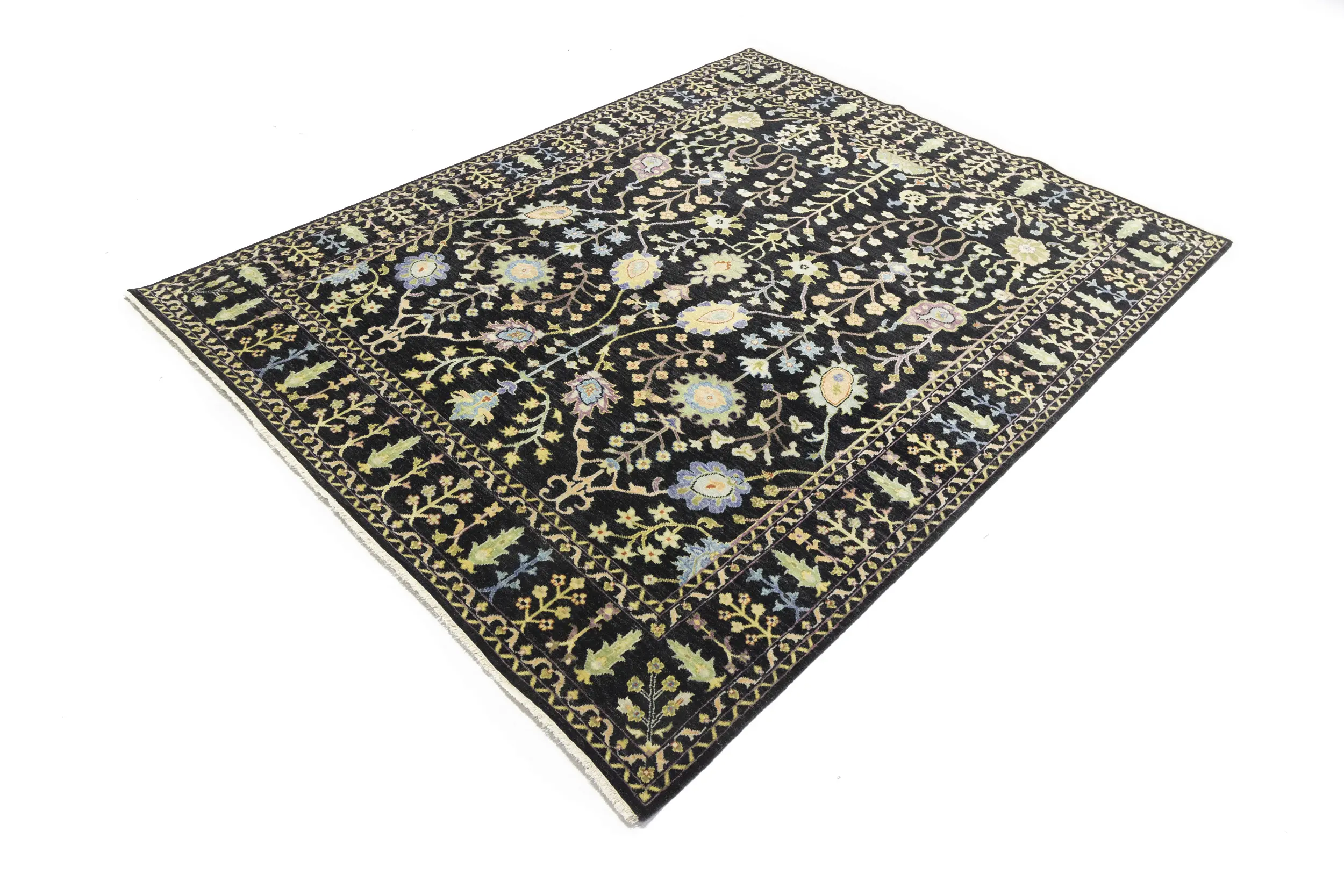 This genuine 8X10 black new Oriental rug was made by the hands of gifted weavers inspired by a variety of spectacular artistic designs, to recreate the aged look of the original piece with a richness of color and ornately patterned background field. What set this vintage style Oriental area rug from the others are the material and dye used (wool pile and cotton foundation), knot count, ancient designs, fantastic grades, and its regional historical connection: it has deep roots, from the story of the people who produced it to the meaning of the symbols and colors displayed across its canvas that have been praised for centuries. This Indian home décor carpet will be completely cozy and inviting that never will go out of style! Also, this Oriental rug would be among your most valuable treasures, it is a great investment that accrues value over time, and it will last for generations because was woven with high-quality, all-natural wool. Environmentally friendly, opulent yet affordable; this rug will give you a thorough amount of character to help define your living space with elegance and warmth that will capture the eyes and attention of your audience (homeowners, designers, decorators, family and friends).