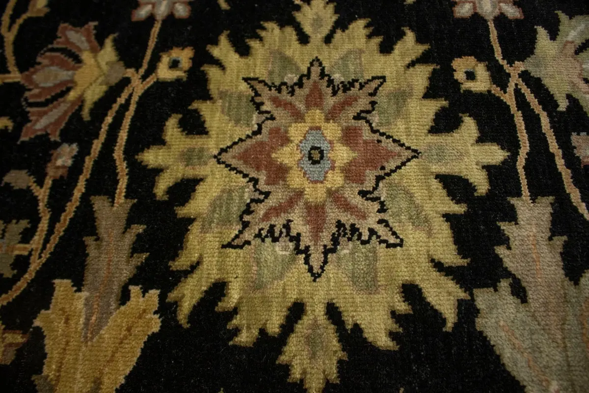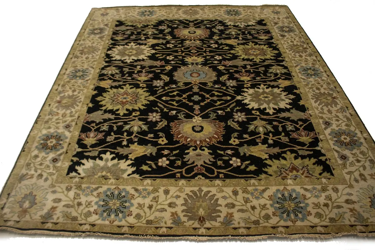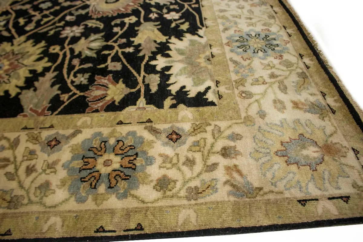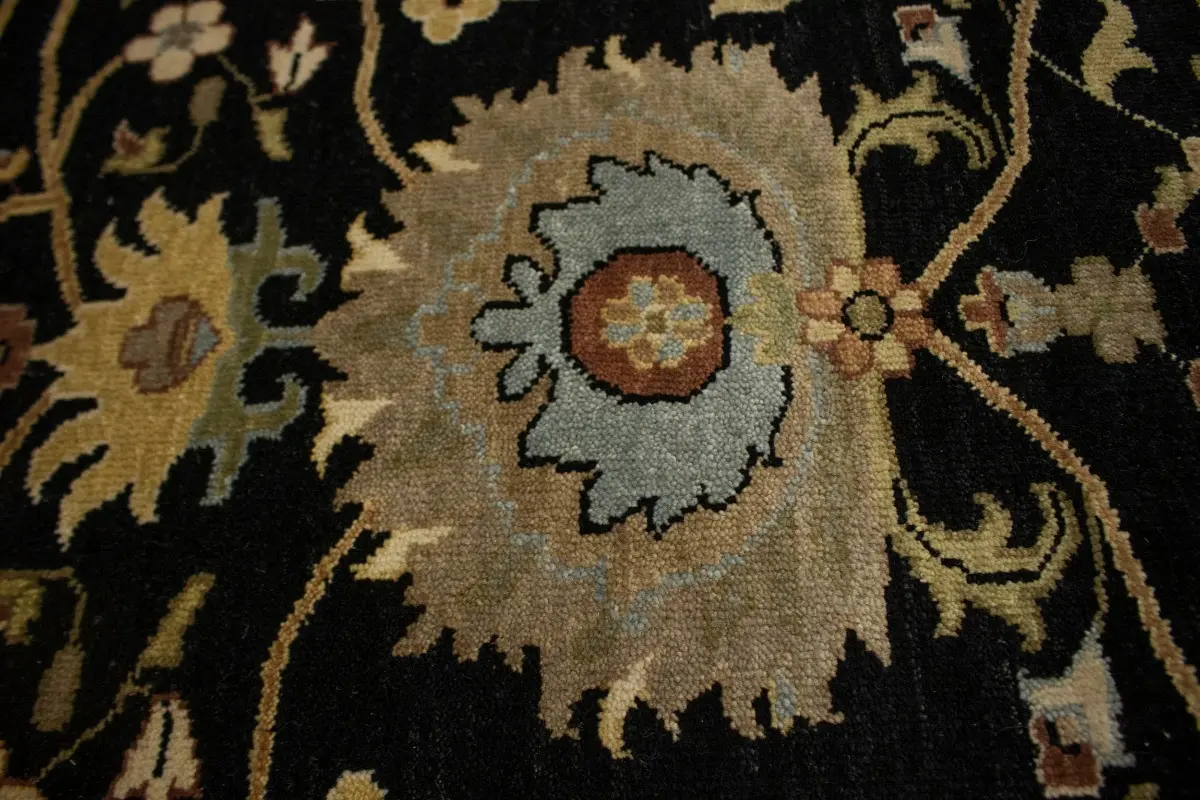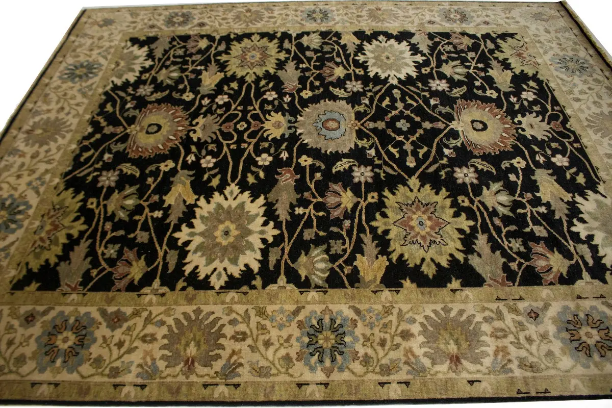 This genuine 8X10 black new Oriental rug was well-constructed by the hands of master weavers motivated by a variety of stunning artistic designs, to recreate the aged look of the exceptional piece with a richness of color and developed decorative background field. What set this vintage style Oriental area rug from the others are the material and dye used (wool pile and cotton foundation), knot count, ancient designs, fantastic grades, and its regional historical connection: it has deep roots, from the story of the people who produced it to the meaning of the symbols and colors displayed across its canvas that have been praised for centuries. This Indian home décor carpet will be completely cozy and inviting that never will go out of style! Also, this Oriental rug would be among your most valuable treasures, it is a great investment that increase in value over time, and it will last a lifetime because was woven with high-quality, all-natural wool. Eco-friendly, opulent yet affordable; this rug give you an extra pop of character to help define your home environment with elegance and warmth that will capture the eyes and attention of your audience (homeowners, designers, decorators, family and friends).