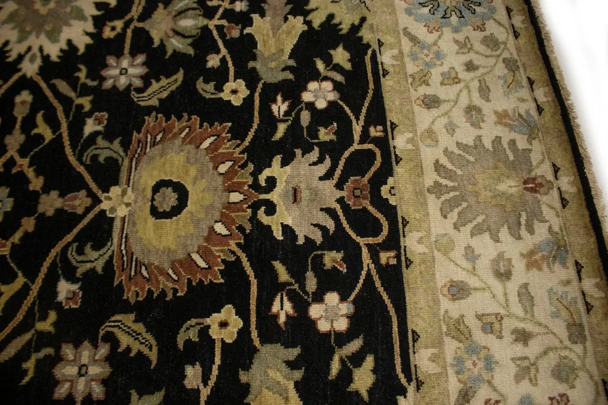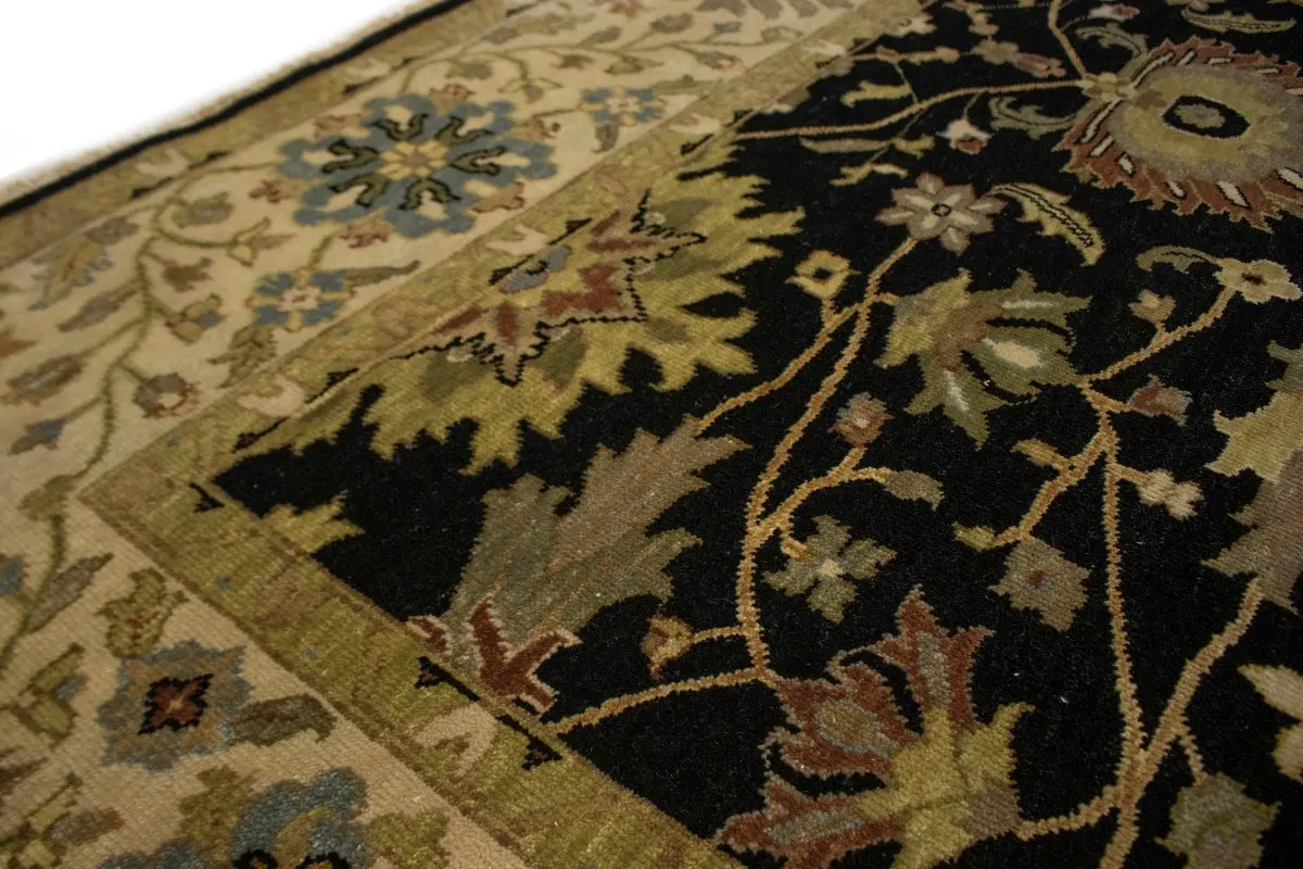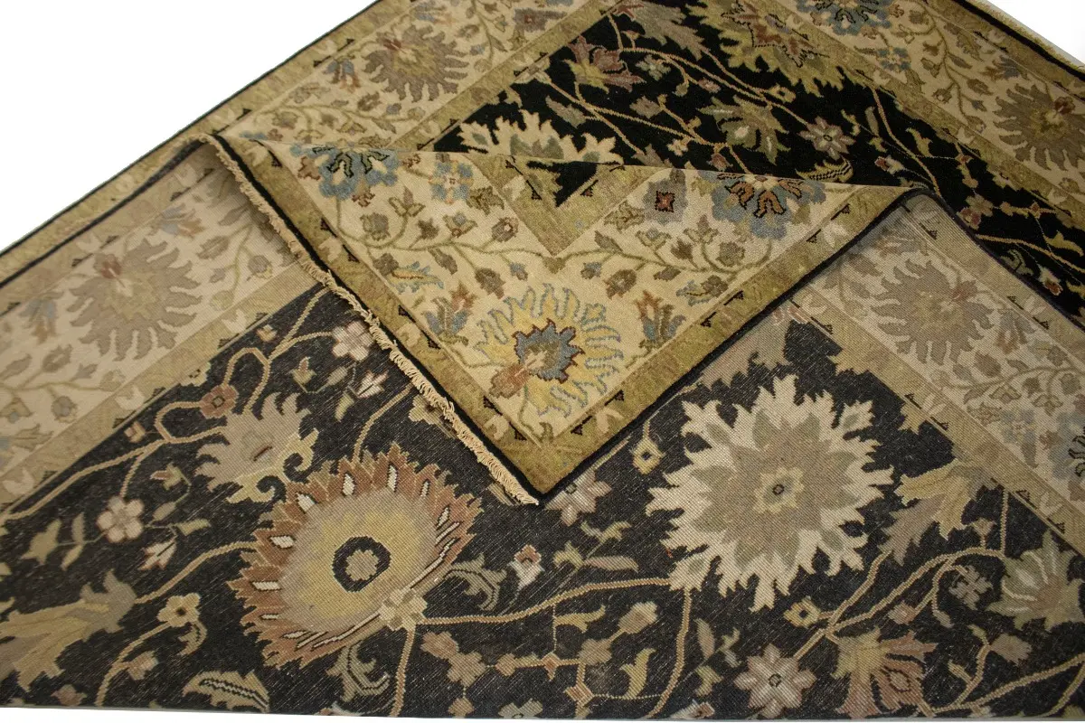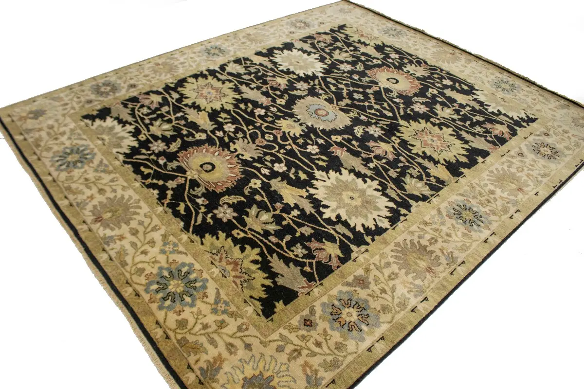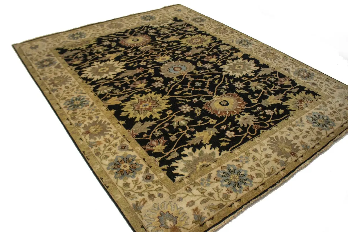 This genuine 8X10 black new Oriental rug was well-constructed by the hands of master weavers motivated by a variety of stunning artistic designs, to recreate the aged look of the exceptional piece with a richness of color and developed decorative background field. What set this vintage style Oriental area rug from the others are the material and dye used (wool pile and cotton foundation), knot count, ancient designs, fantastic grades, and its regional historical connection: it has deep roots, from the story of the people who produced it to the meaning of the symbols and colors displayed across its canvas that have been praised for centuries. This Indian home décor carpet will be completely cozy and inviting that never will go out of style! Also, this Oriental rug would be among your most valuable treasures, it is a great investment that increase in value over time, and it will last a lifetime because was woven with high-quality, all-natural wool. Eco-friendly, opulent yet affordable; this rug give you an extra pop of character to help define your home environment with elegance and warmth that will capture the eyes and attention of your audience (homeowners, designers, decorators, family and friends).