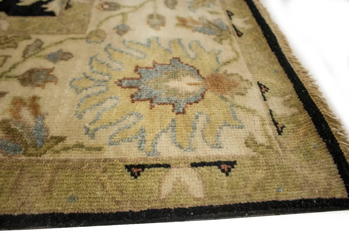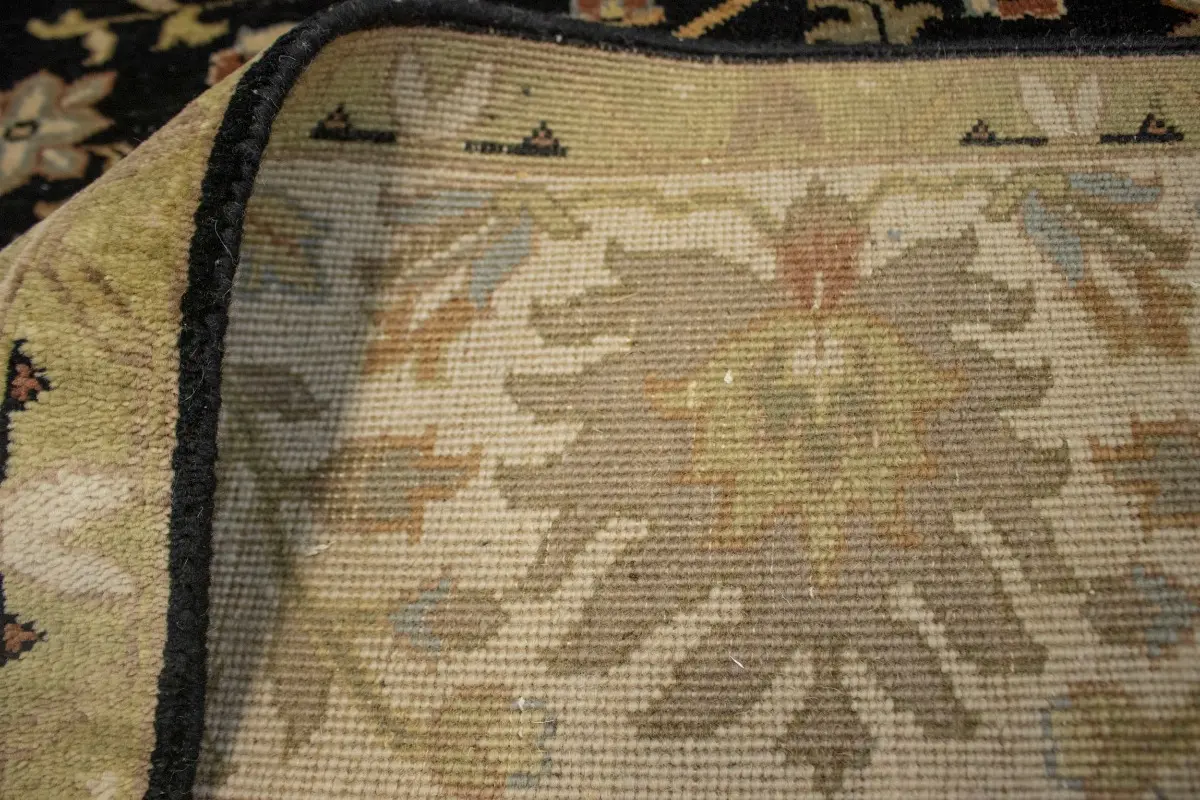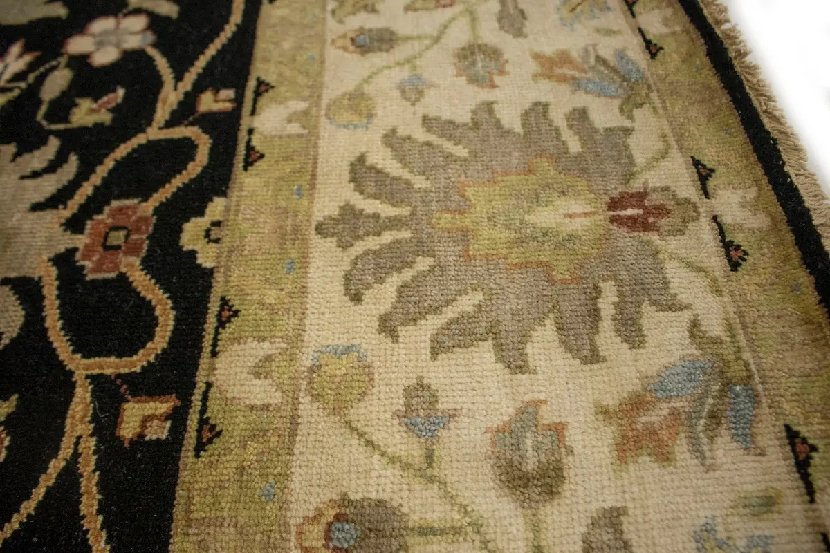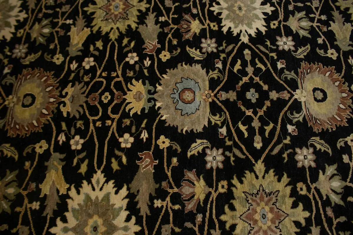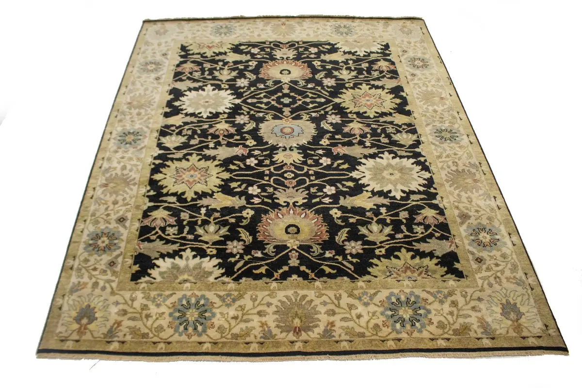 This genuine 8X10 black new Oriental rug was well-constructed by the hands of master weavers motivated by a variety of stunning artistic designs, to recreate the aged look of the exceptional piece with a richness of color and developed decorative background field. What set this vintage style Oriental area rug from the others are the material and dye used (wool pile and cotton foundation), knot count, ancient designs, fantastic grades, and its regional historical connection: it has deep roots, from the story of the people who produced it to the meaning of the symbols and colors displayed across its canvas that have been praised for centuries. This Indian home décor carpet will be completely cozy and inviting that never will go out of style! Also, this Oriental rug would be among your most valuable treasures, it is a great investment that increase in value over time, and it will last a lifetime because was woven with high-quality, all-natural wool. Eco-friendly, opulent yet affordable; this rug give you an extra pop of character to help define your home environment with elegance and warmth that will capture the eyes and attention of your audience (homeowners, designers, decorators, family and friends).