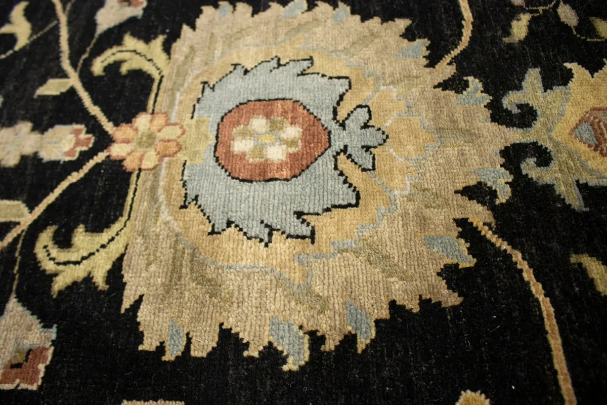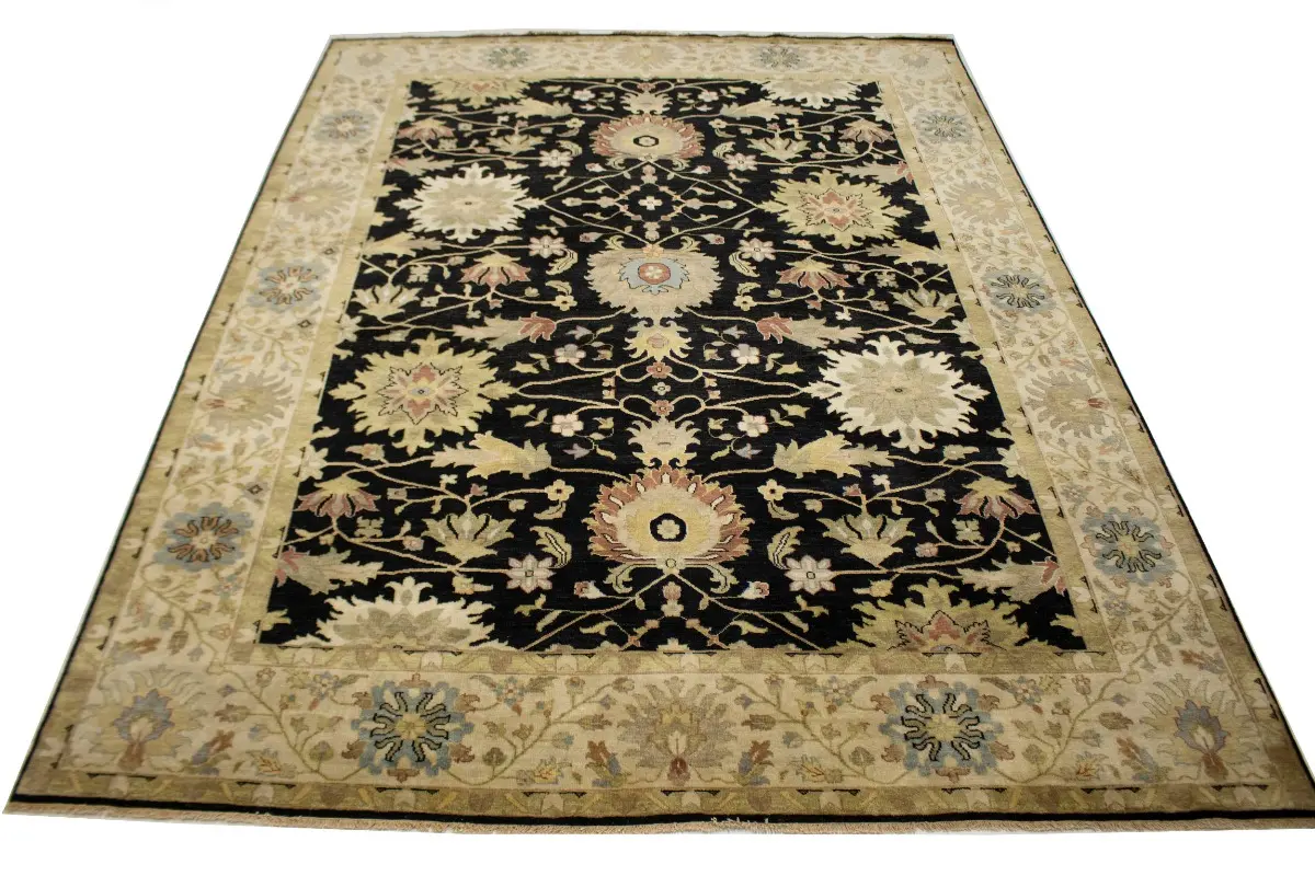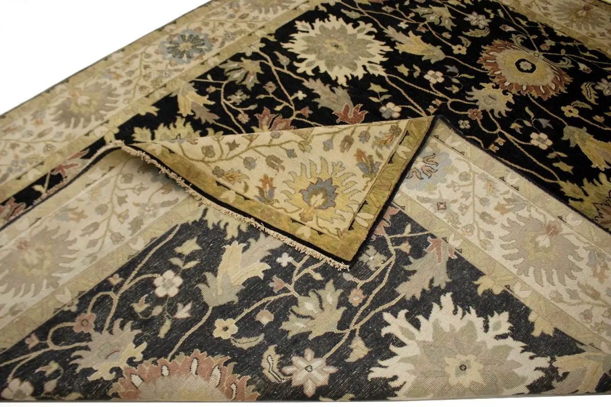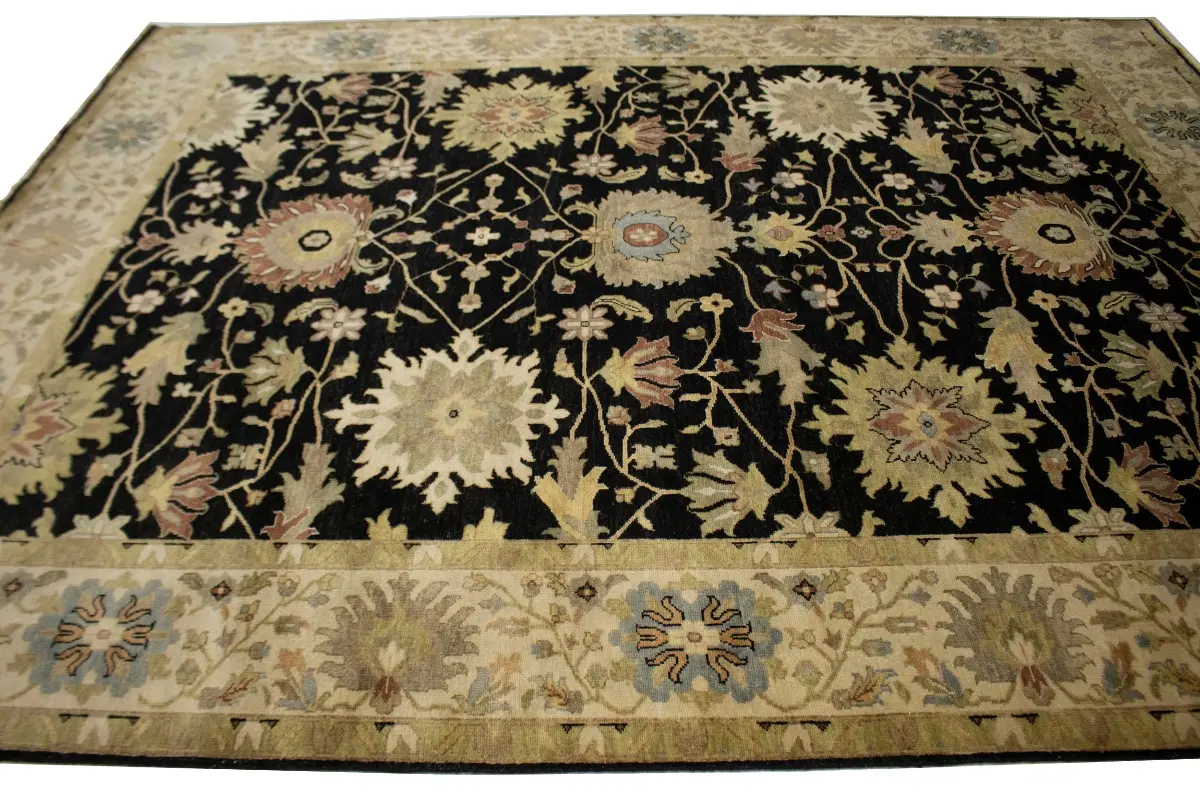 Handmade 9X12 black oriental rug made with natural dyes (fine wool pile and cotton foundation), superior knot count, and appealing ancient designs. This Oriental rug never will go out of style and would be among your most valuable treasures.