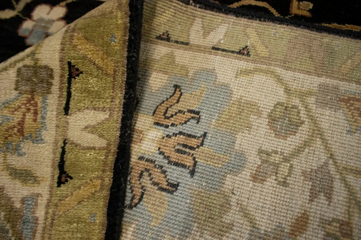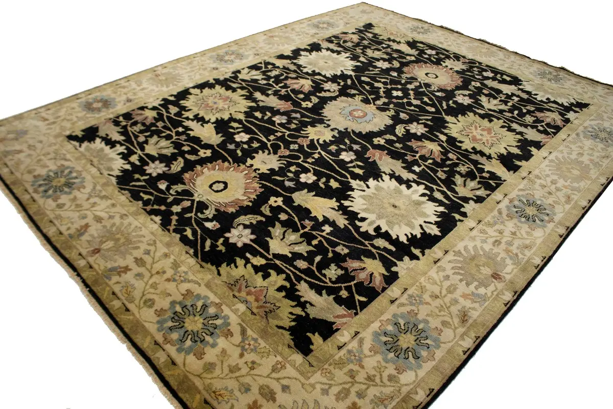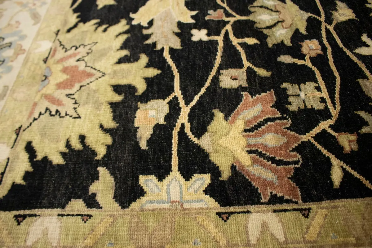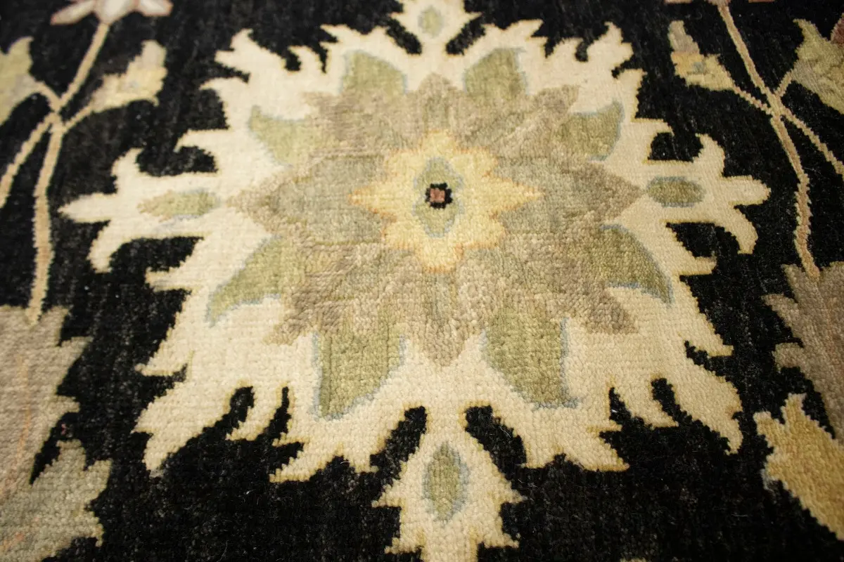 Handmade 9X12 black oriental rug made with natural dyes (fine wool pile and cotton foundation), superior knot count, and appealing ancient designs. This Oriental rug never will go out of style and would be among your most valuable treasures.