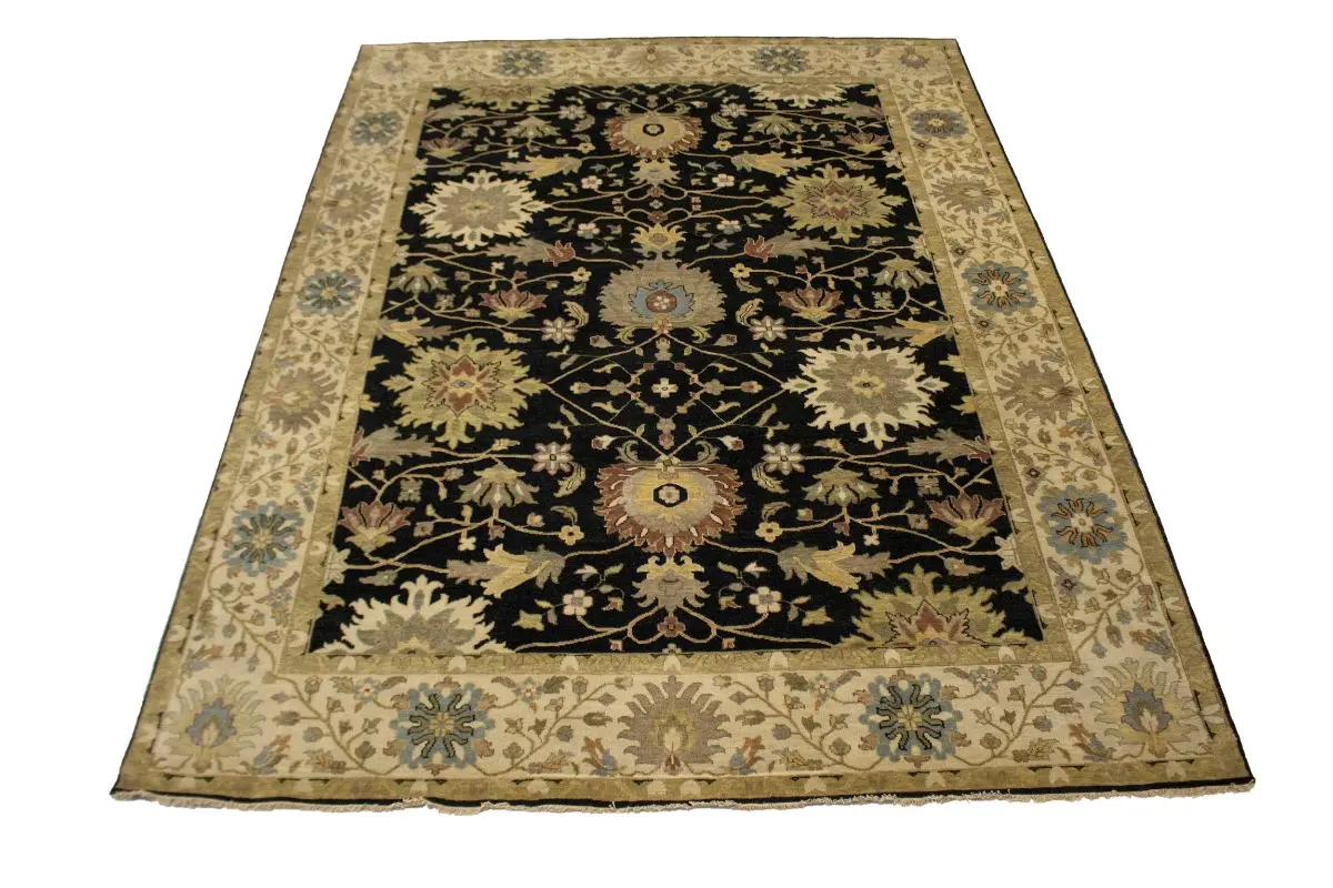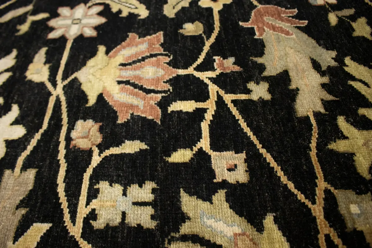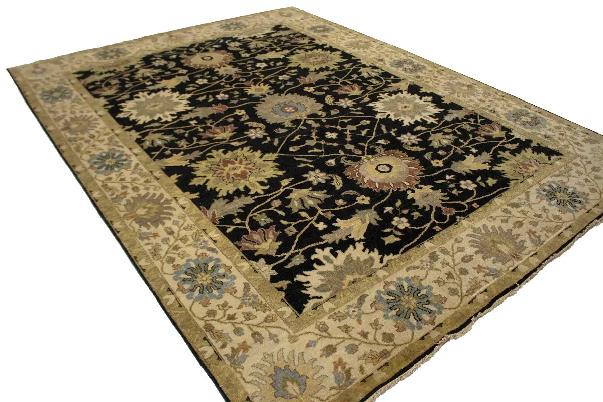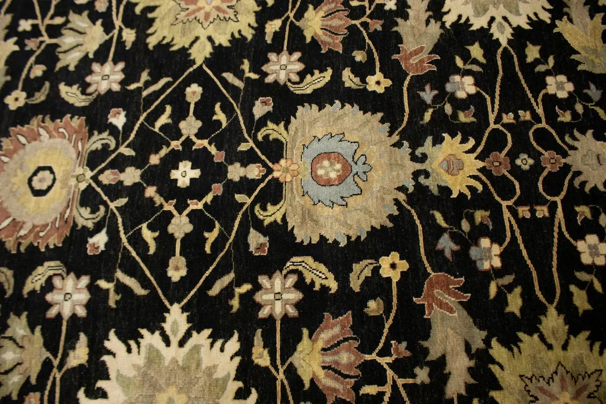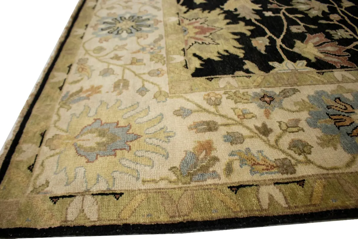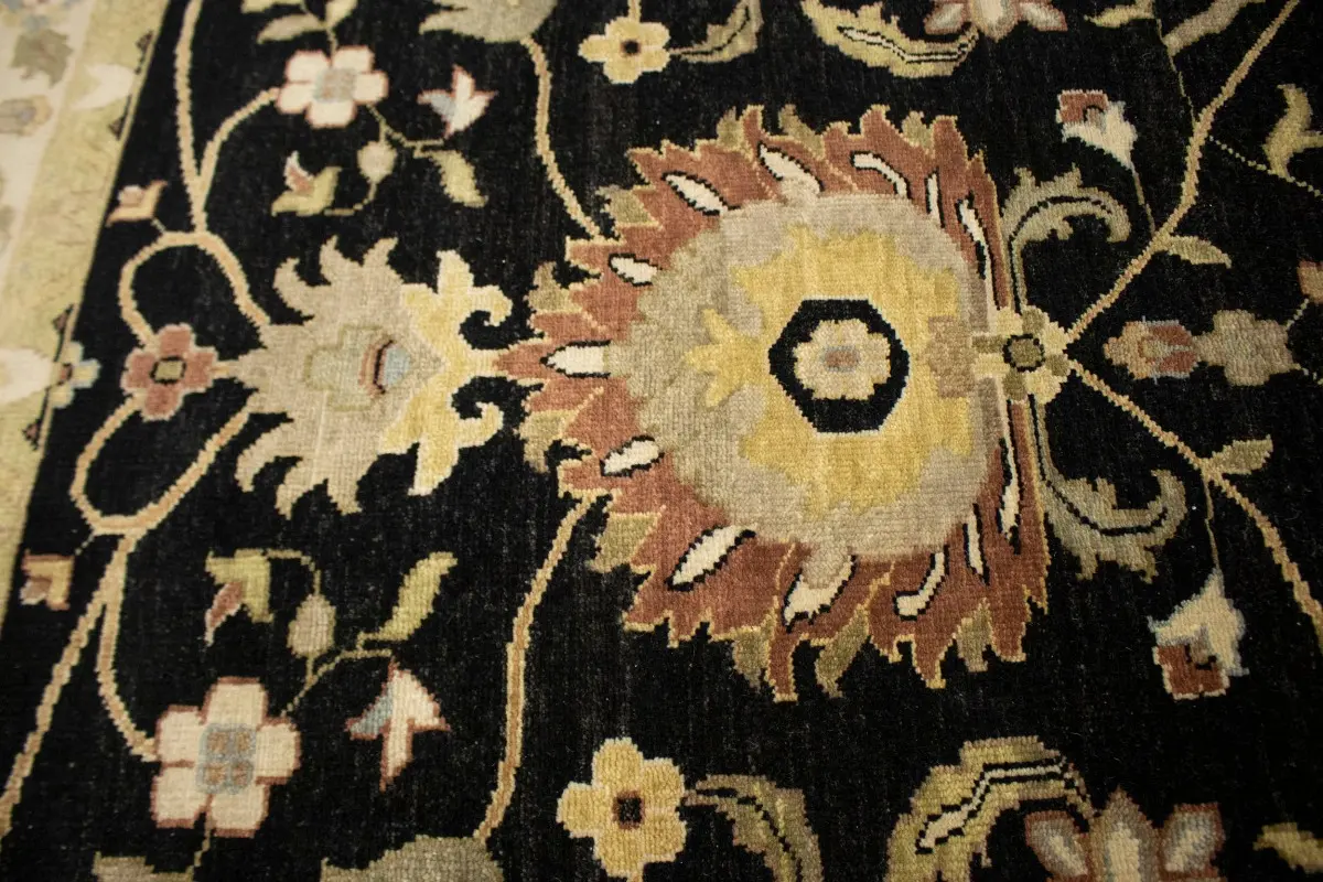 This genuine 9X12 black new Oriental rug was well-constructed by the hands of master weavers motivated by a variety of stunning artistic designs, to recreate the aged look of the exceptional piece with a richness of color and developed decorative background field. What set this vintage style Oriental area rug from the others are the material and dye used (wool pile and cotton foundation), knot count, ancient designs, fantastic grades, and its regional historical connection: it has deep roots, from the story of the people who produced it to the meaning of the symbols and colors displayed across its canvas that have been praised for centuries. This Indian home décor carpet will be completely cozy and inviting that never will go out of style! Also, this Oriental rug would be among your most valuable treasures, it is a great investment that increase in value over time, and it will last a lifetime because was woven with high-quality, all-natural wool. Eco-friendly, opulent yet affordable; this rug give you an extra pop of character to help define your home environment with elegance and warmth that will capture the eyes and attention of your audience (homeowners, designers, decorators, family and friends). OT-5133