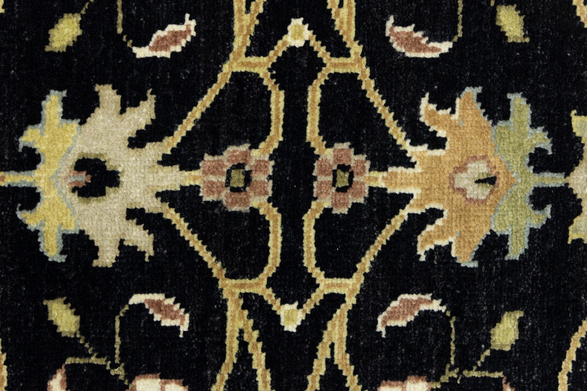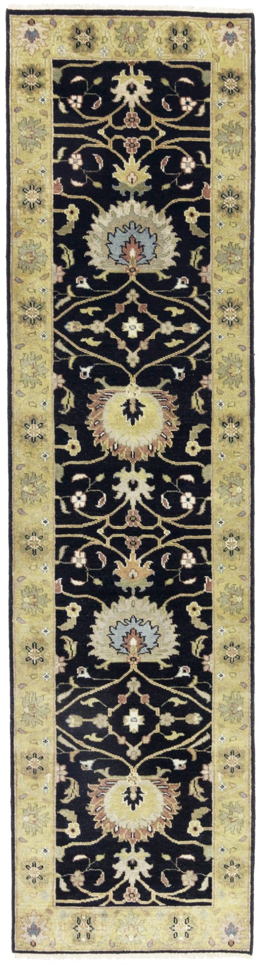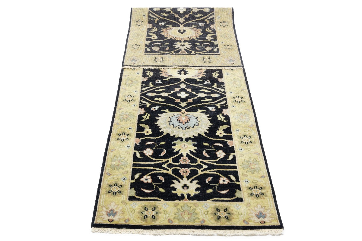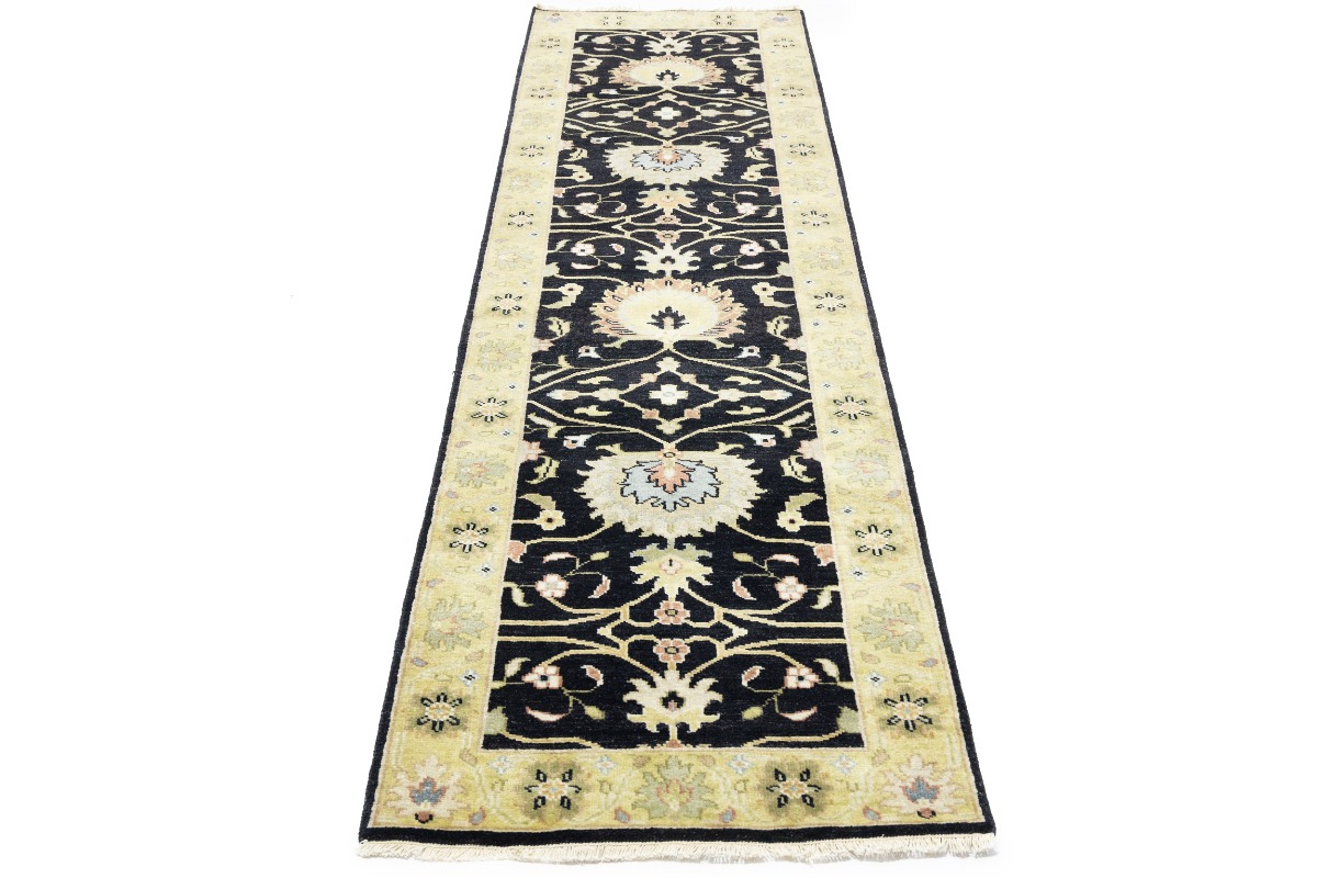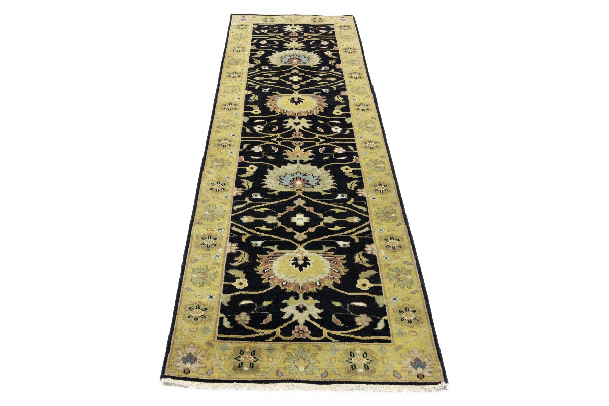 This authentic 3X10 black new Oriental runner was crafted by the hands of skilled weavers enthused by a variety of lovely artistic designs, to recreate the aged look of the unique piece with a richness of color and beautifully elaborated background field. What set this vintage style Oriental area runner from the others are the material and dye used (wool pile and cotton foundation), knot count, ancient designs, fantastic grades, and its regional historical connection: it has deep roots, from the story of the people who produced it to the meaning of the symbols and colors displayed across its canvas that have been praised for centuries. This Indian home décor carpet will be completely cozy and inviting that never will go out of style! Also, this Oriental rug would be among your most valuable treasures, it is a great investment that increase in value over time, and it will last for generations because was woven with high-quality, all-natural wool. Environmentally friendly, opulent yet affordable; this runner will give you a thorough amount of character to help define your living space with sophistication and warmth that will capture the eyes and attention of your audience (homeowners, designers, decorators, family and friends). OT-9061