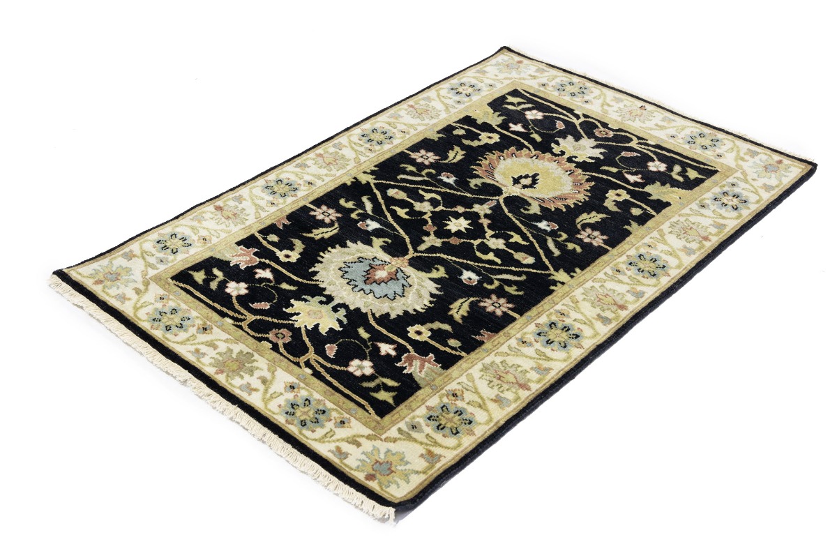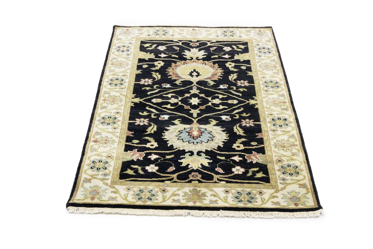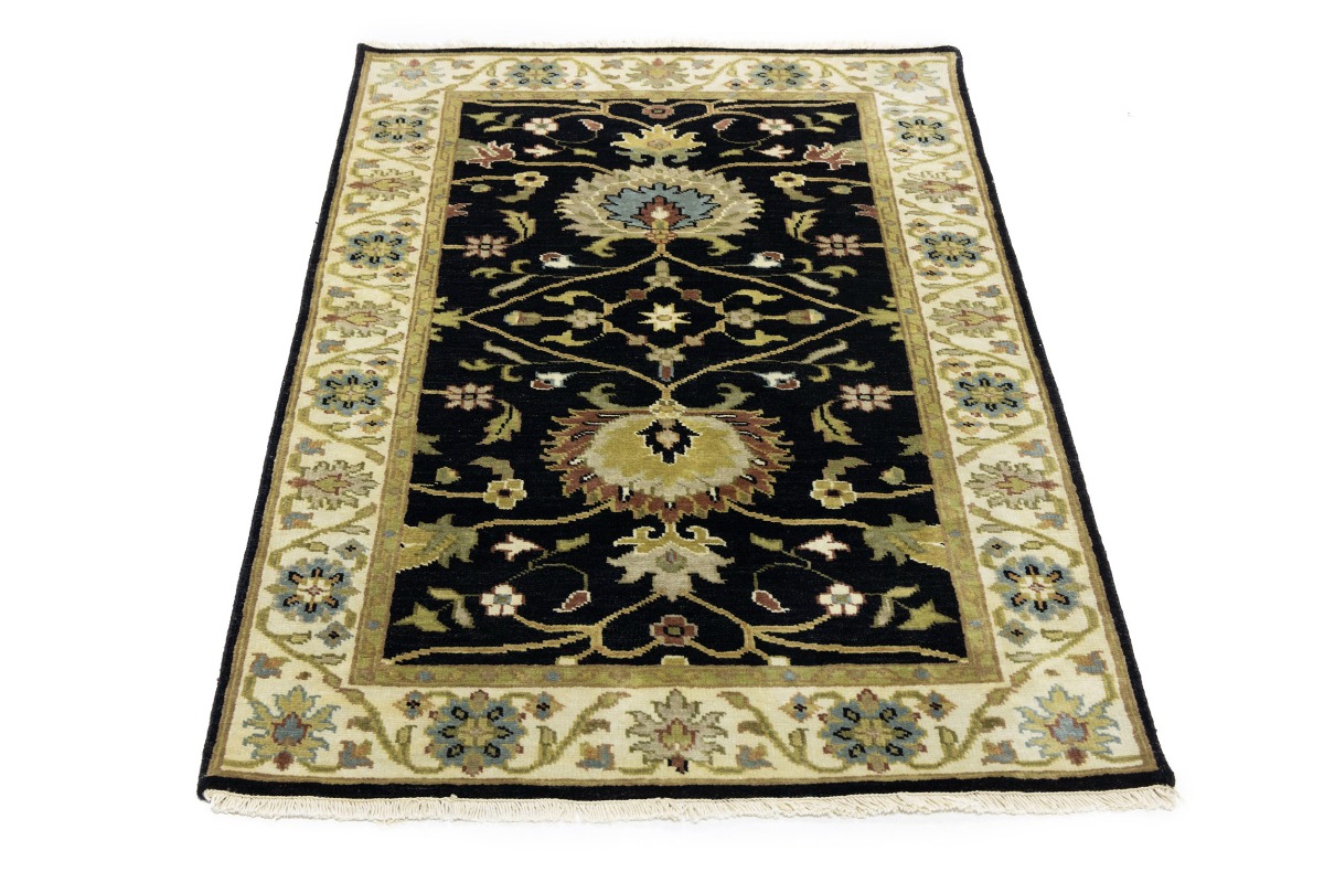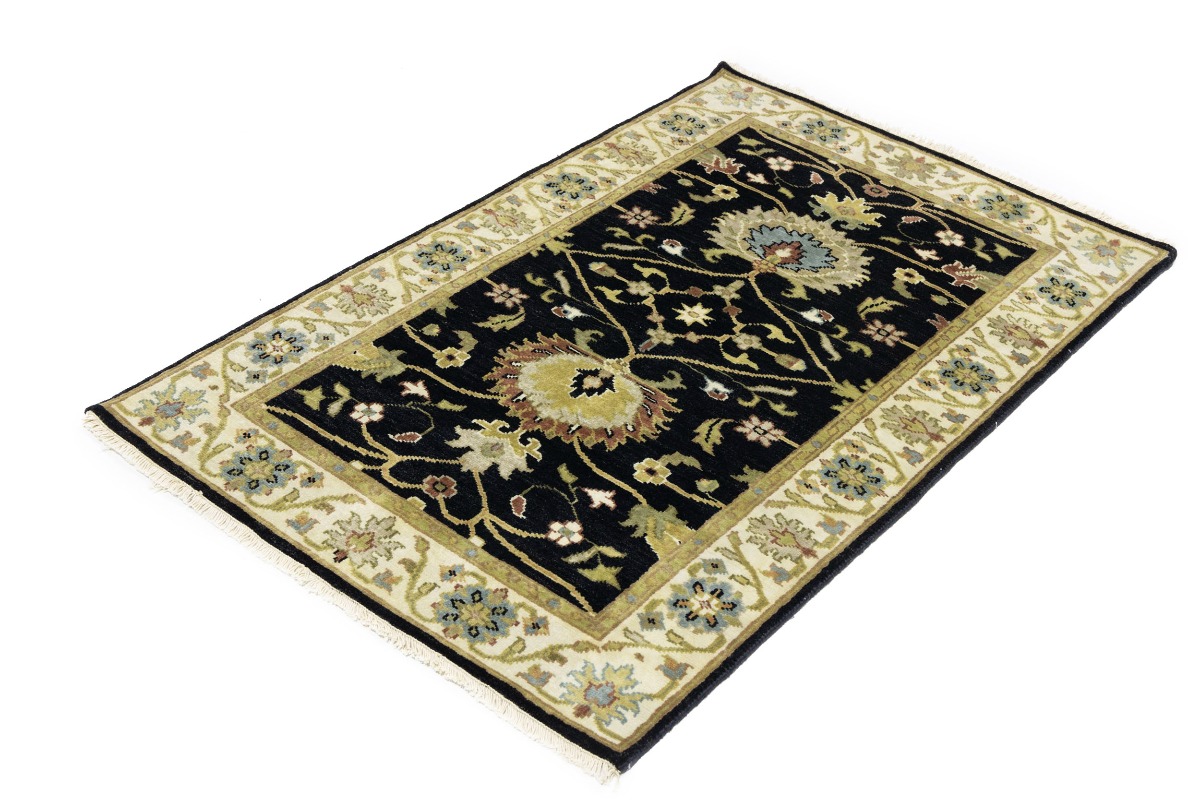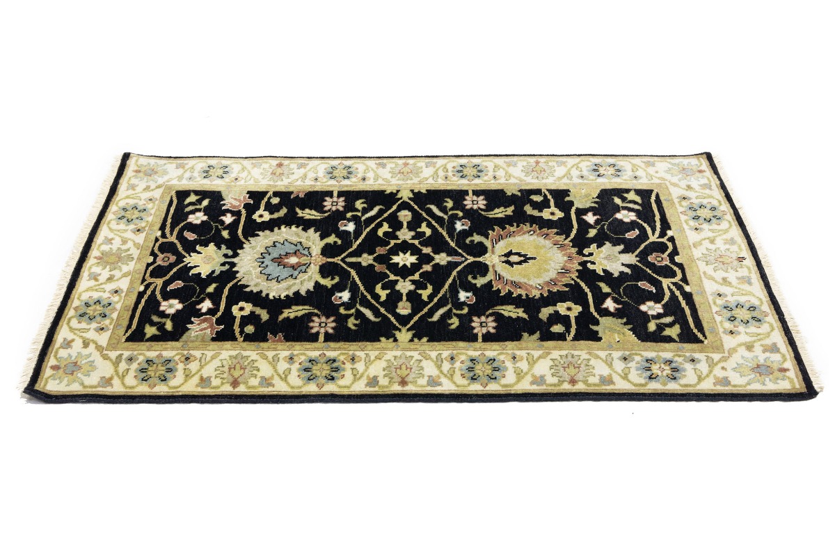 This genuine 3X5 black new Oriental rug was made by the hands of gifted weavers inspired by a variety of spectacular artistic designs, to recreate the aged look of the original piece with a richness of color and ornately patterned background field. What set this vintage style Oriental area rug from the others are the material and dye used (wool pile and cotton foundation), knot count, ancient designs, fantastic grades, and its regional historical connection: it has deep roots, from the story of the people who produced it to the meaning of the symbols and colors displayed across its canvas that have been praised for centuries. This Indian home décor carpet will be completely cozy and inviting that never will go out of style! Also, this Oriental rug would be among your most valuable treasures, it is a great investment that accrues value over time, and it will last for generations because was woven with high-quality, all-natural wool. Environmentally friendly, opulent yet affordable; this rug will give you a thorough amount of character to help define your living space with elegance and warmth that will capture the eyes and attention of your audience (homeowners, designers, decorators, family and friends). OT-9054