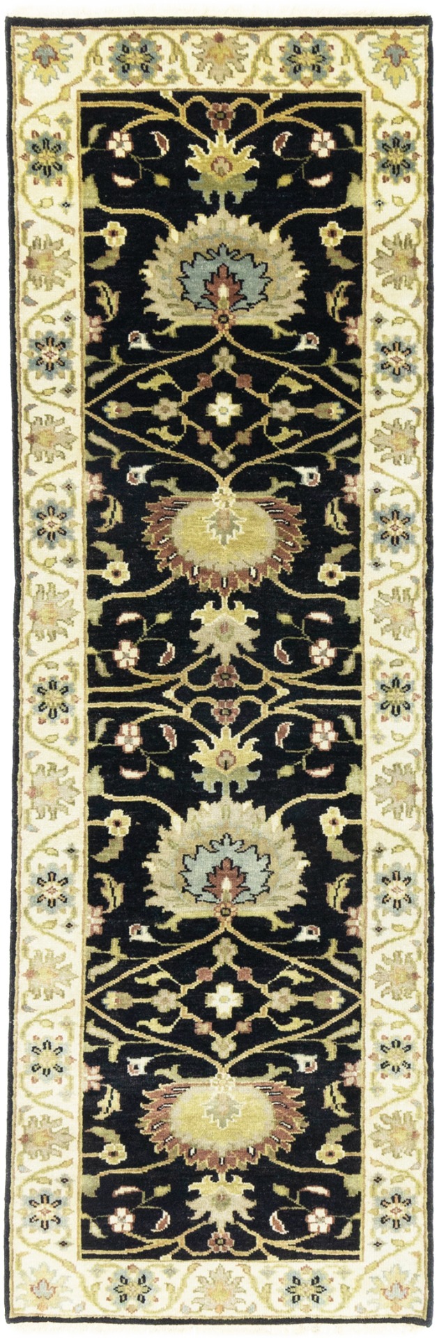 Hand Knotted 3X8 black oriental runner made with vegetable dyes (fine wool pile and cotton foundation), superior knot count, and appealing ancient designs. This Oriental runner never will go out of style and would be among your most valuable treasures.
