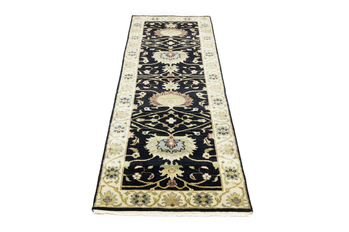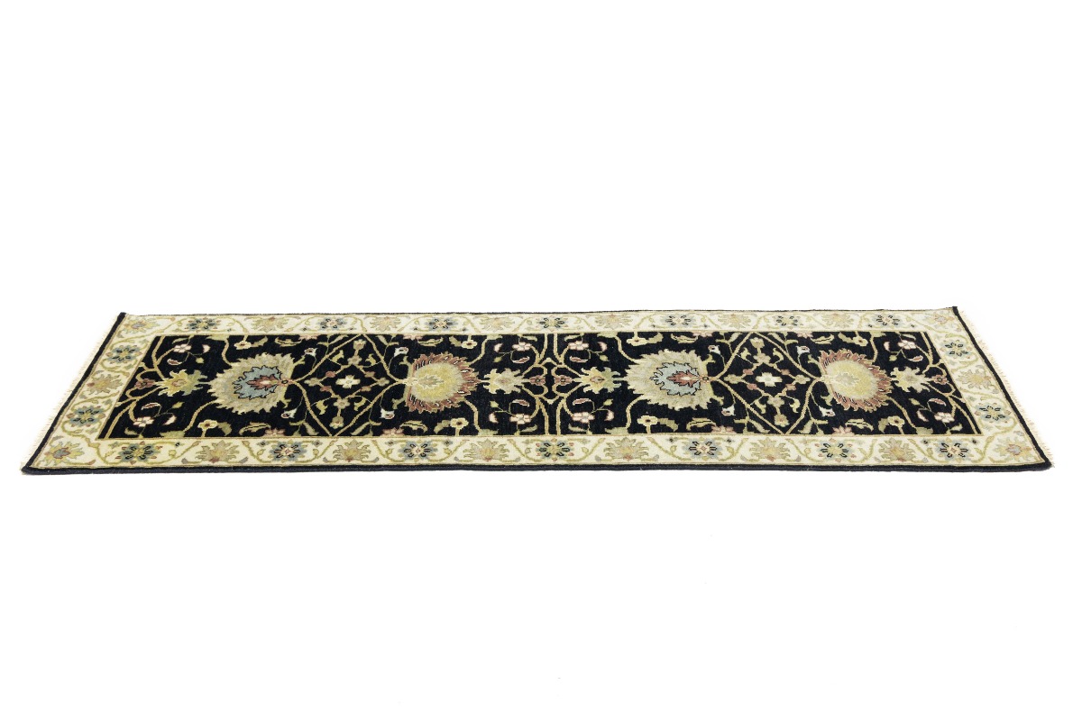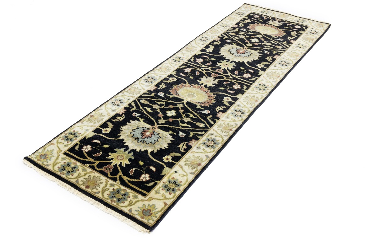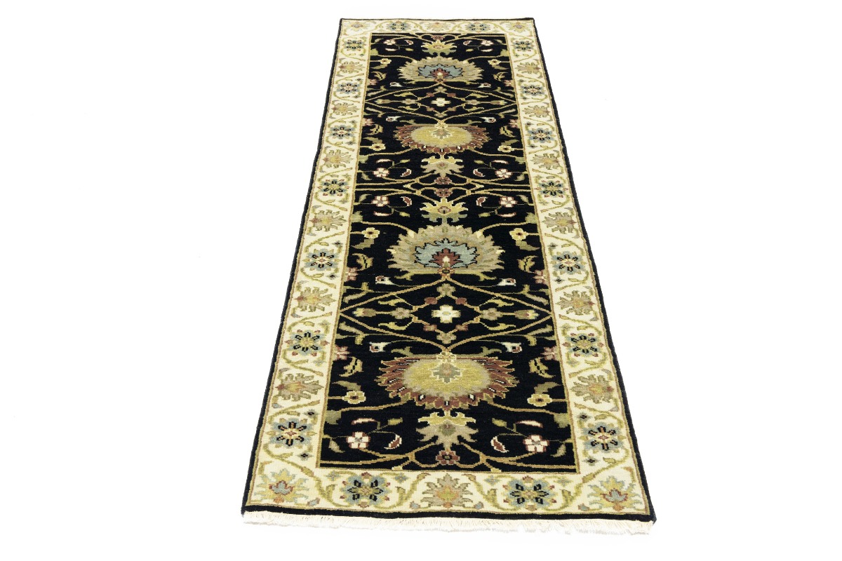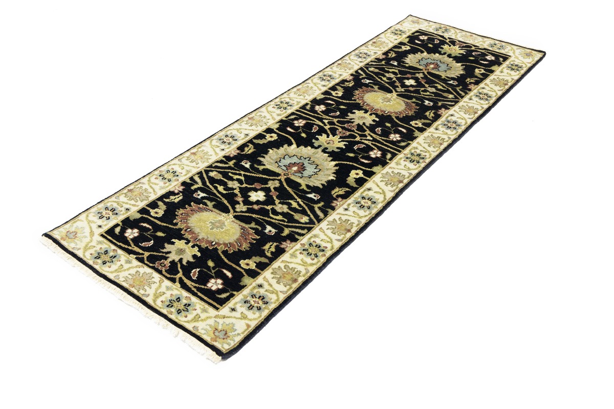 This authentic 3X8 black new Oriental runner was masterly knotted by the hands of weavers inspired by a variety of wonderful artistic designs, to recreate the aged look of the original piece with a richness of color and intricate patterned background field. What set this vintage style Oriental area runner from the others are the material and dye used (wool pile and cotton foundation), knot count, antique designs, fantastic grades, and its regional historical connection: it has deep roots, from the story of the people who produced it to the meaning of the symbols and colors displayed across its canvas that have been praised for centuries. This Indian home décor carpet will be completely cozy and inviting that never will go out of style! Also, this Oriental rug would be among your most valuable treasures, it is a great investment that accrues value over time, and it will last for generations because was woven with high-quality, all-natural wool. Environmentally friendly, opulent yet affordable; this runner will give you a thorough amount of character to help define your living space with luxury and warmth that will capture the eyes and attention of your audience (homeowners, designers, decorators, family and friends). OT-9057