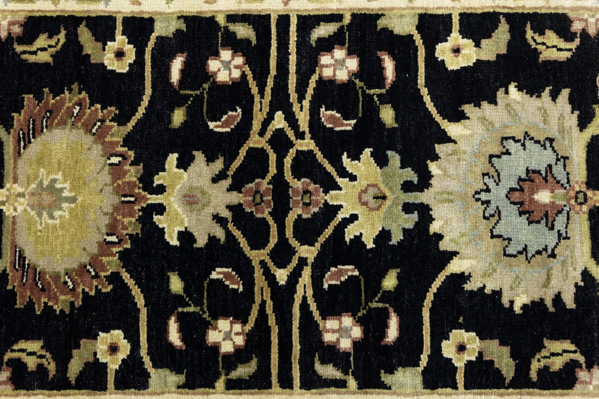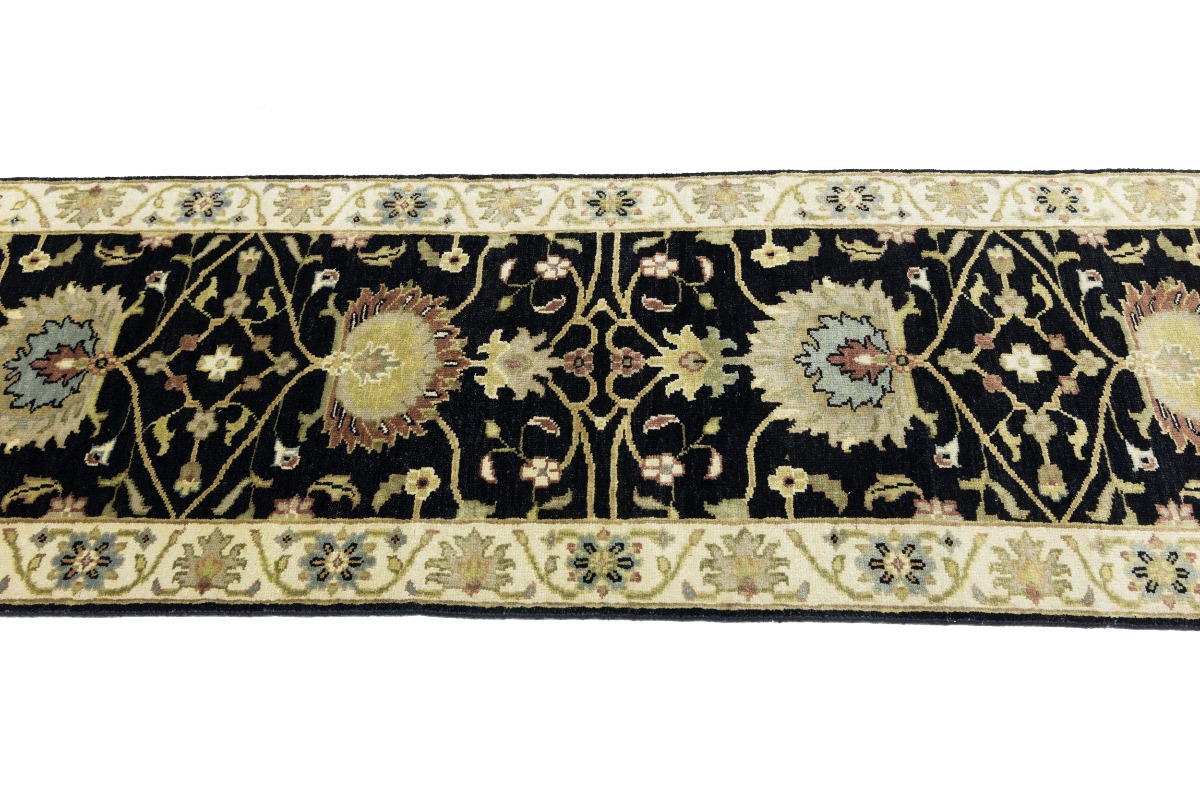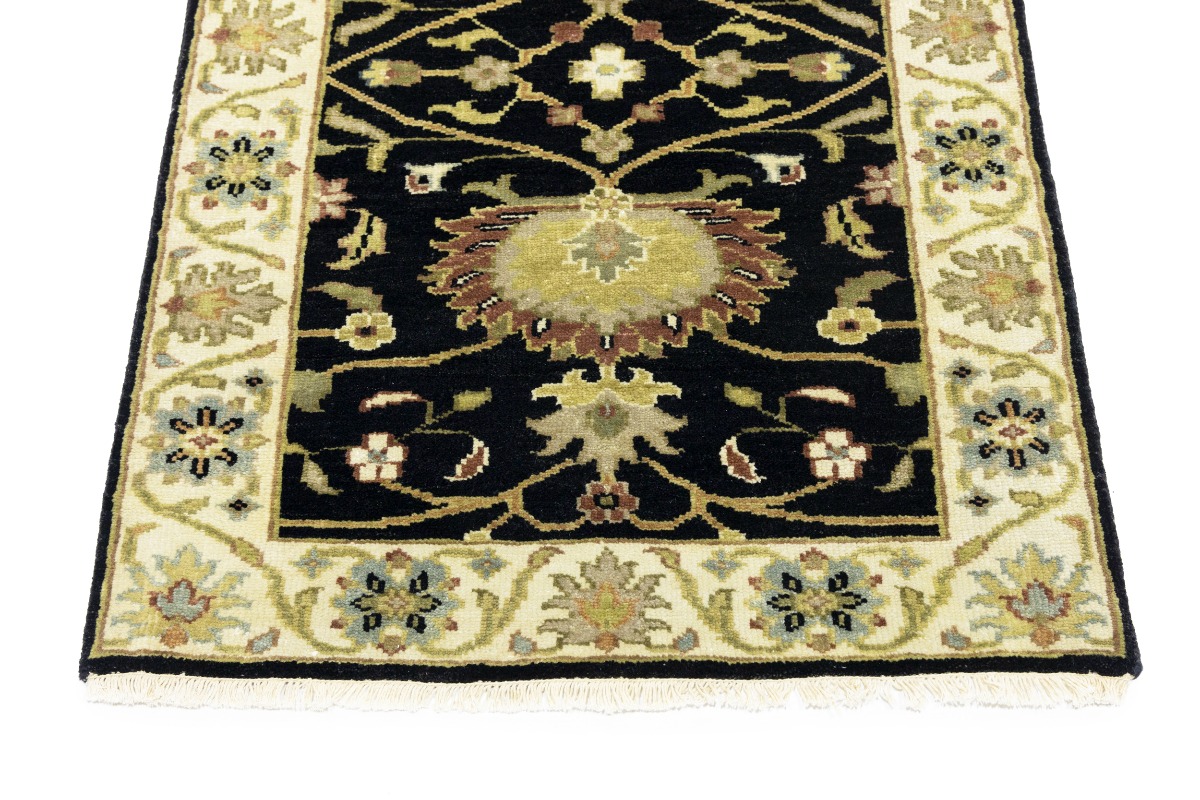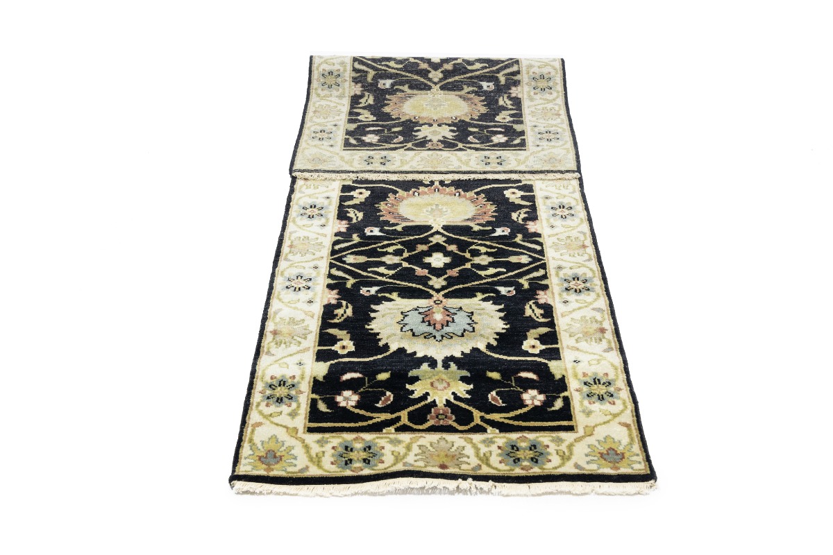 This authentic 3X8 black new Oriental runner was masterly knotted by the hands of weavers inspired by a variety of wonderful artistic designs, to recreate the aged look of the original piece with a richness of color and intricate patterned background field. What set this vintage style Oriental area runner from the others are the material and dye used (wool pile and cotton foundation), knot count, antique designs, fantastic grades, and its regional historical connection: it has deep roots, from the story of the people who produced it to the meaning of the symbols and colors displayed across its canvas that have been praised for centuries. This Indian home décor carpet will be completely cozy and inviting that never will go out of style! Also, this Oriental rug would be among your most valuable treasures, it is a great investment that accrues value over time, and it will last for generations because was woven with high-quality, all-natural wool. Environmentally friendly, opulent yet affordable; this runner will give you a thorough amount of character to help define your living space with luxury and warmth that will capture the eyes and attention of your audience (homeowners, designers, decorators, family and friends). OT-9057