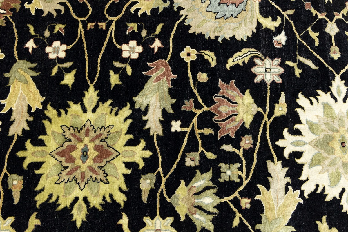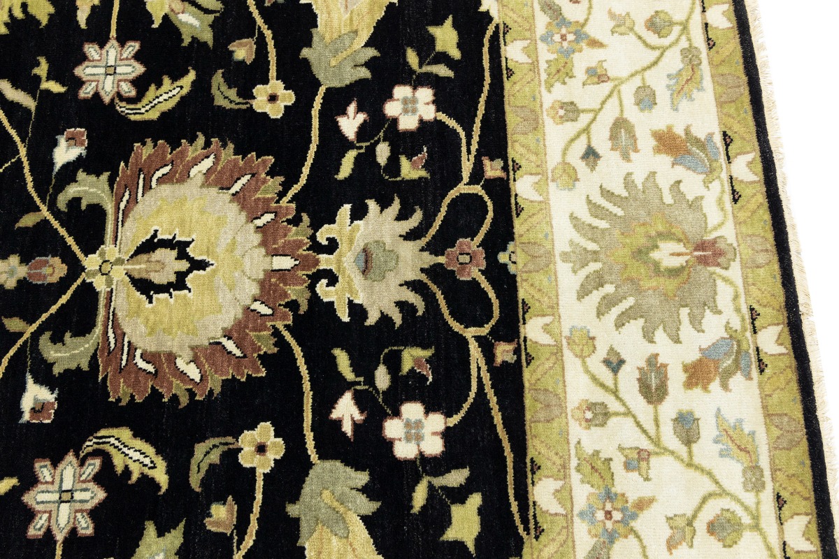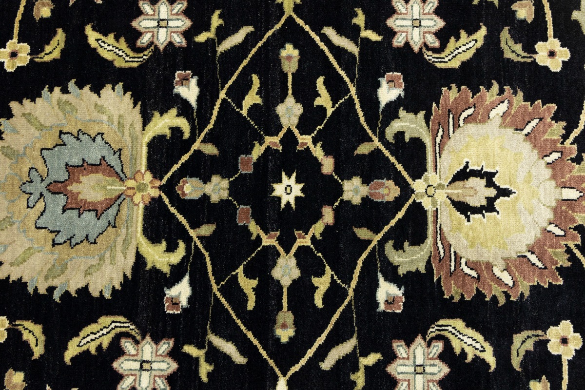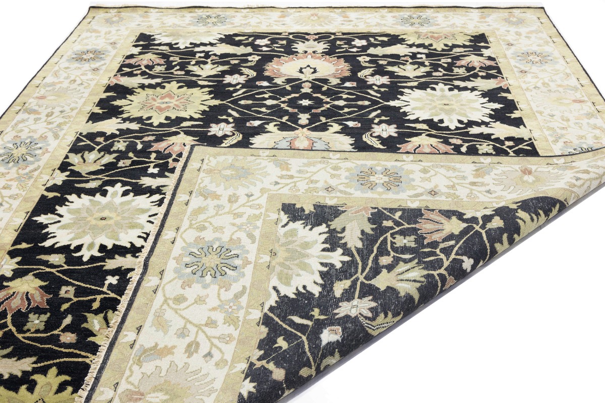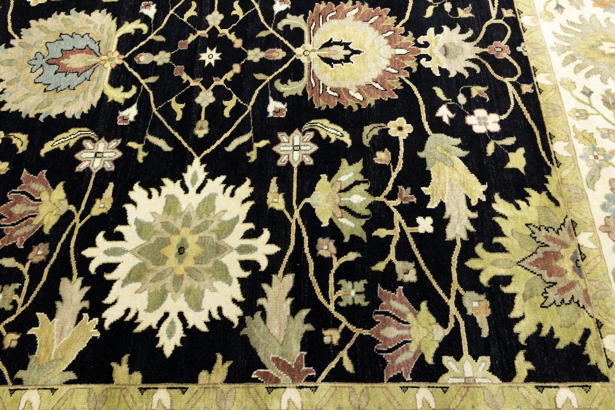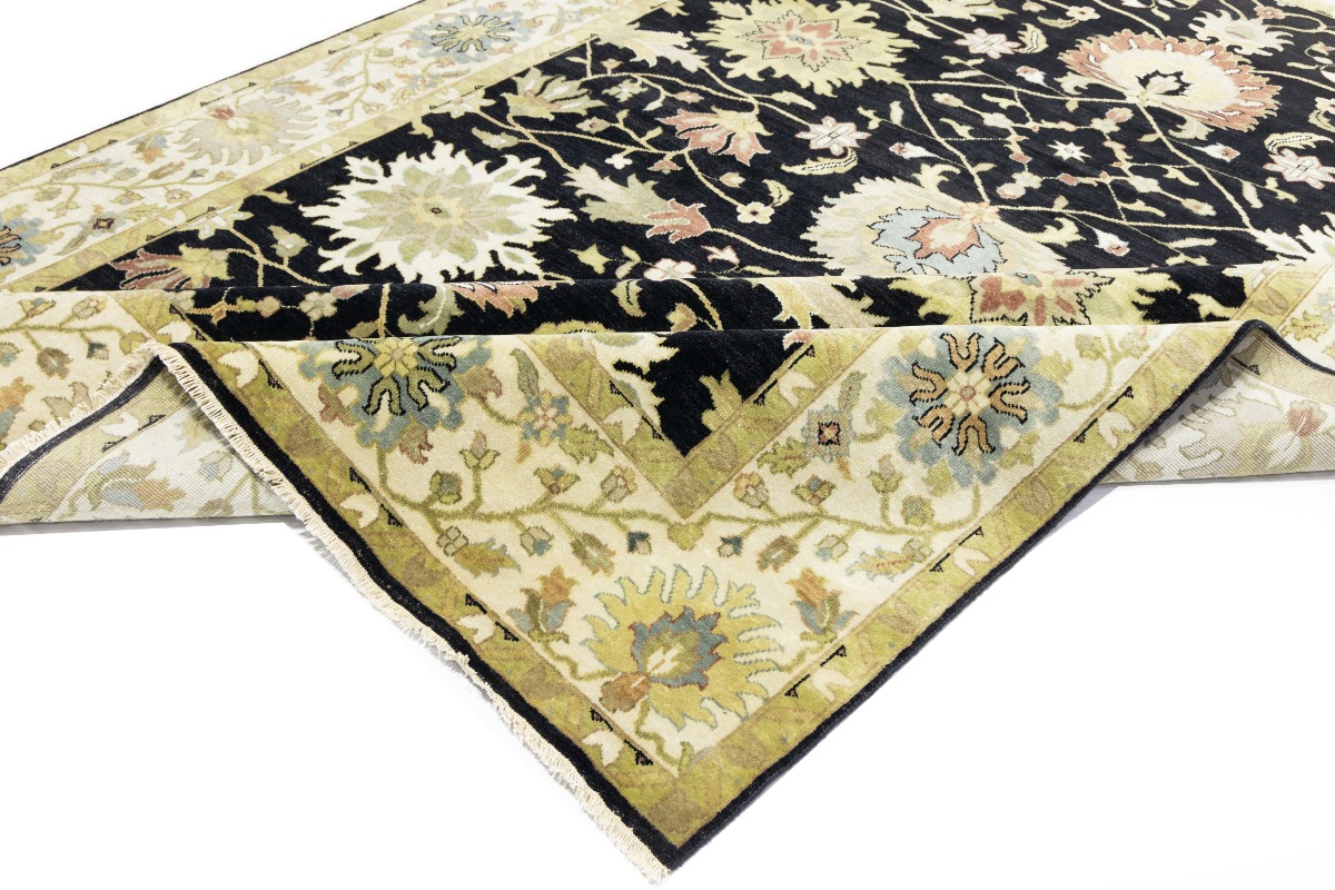 This genuine 9X12 black new Oriental rug was made by the hands of gifted weavers inspired by a variety of spectacular artistic designs, to recreate the aged look of the original piece with a richness of color and ornately patterned background field. What set this vintage style Oriental area rug from the others are the material and dye used (wool pile and cotton foundation), knot count, ancient designs, fantastic grades, and its regional historical connection: it has deep roots, from the story of the people who produced it to the meaning of the symbols and colors displayed across its canvas that have been praised for centuries. This Indian home décor carpet will be completely cozy and inviting that never will go out of style! Also, this Oriental rug would be among your most valuable treasures, it is a great investment that accrues value over time, and it will last for generations because was woven with high-quality, all-natural wool. Environmentally friendly, opulent yet affordable; this rug will give you a thorough amount of character to help define your living space with elegance and warmth that will capture the eyes and attention of your audience (homeowners, designers, decorators, family and friends). OT-9056