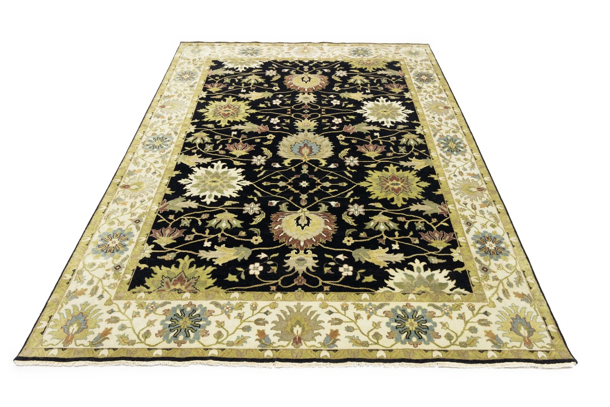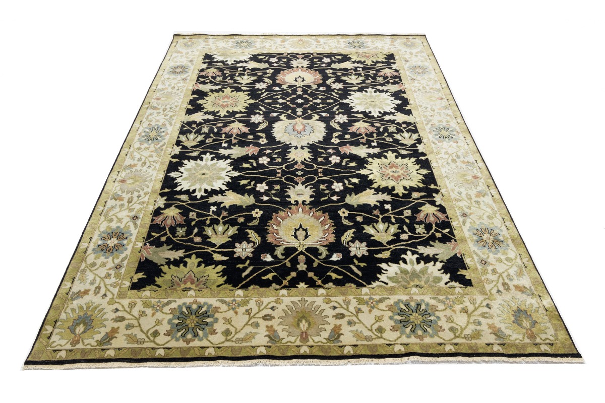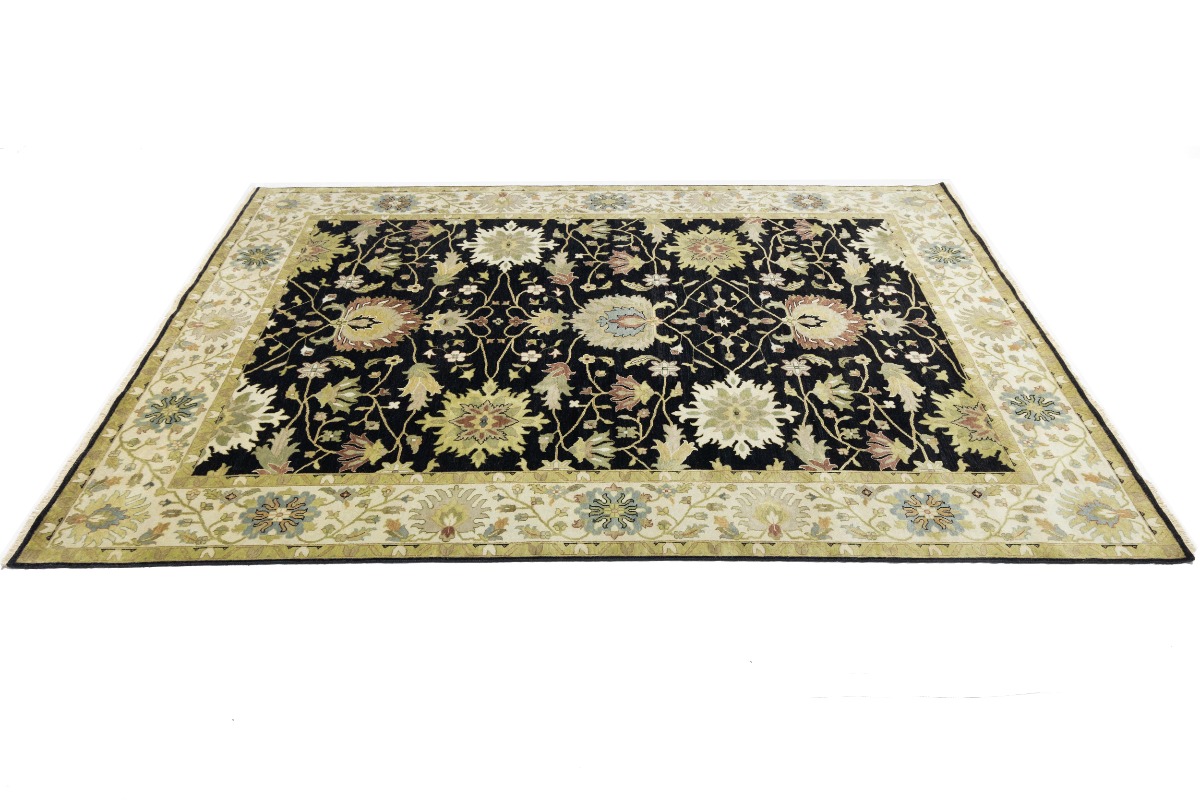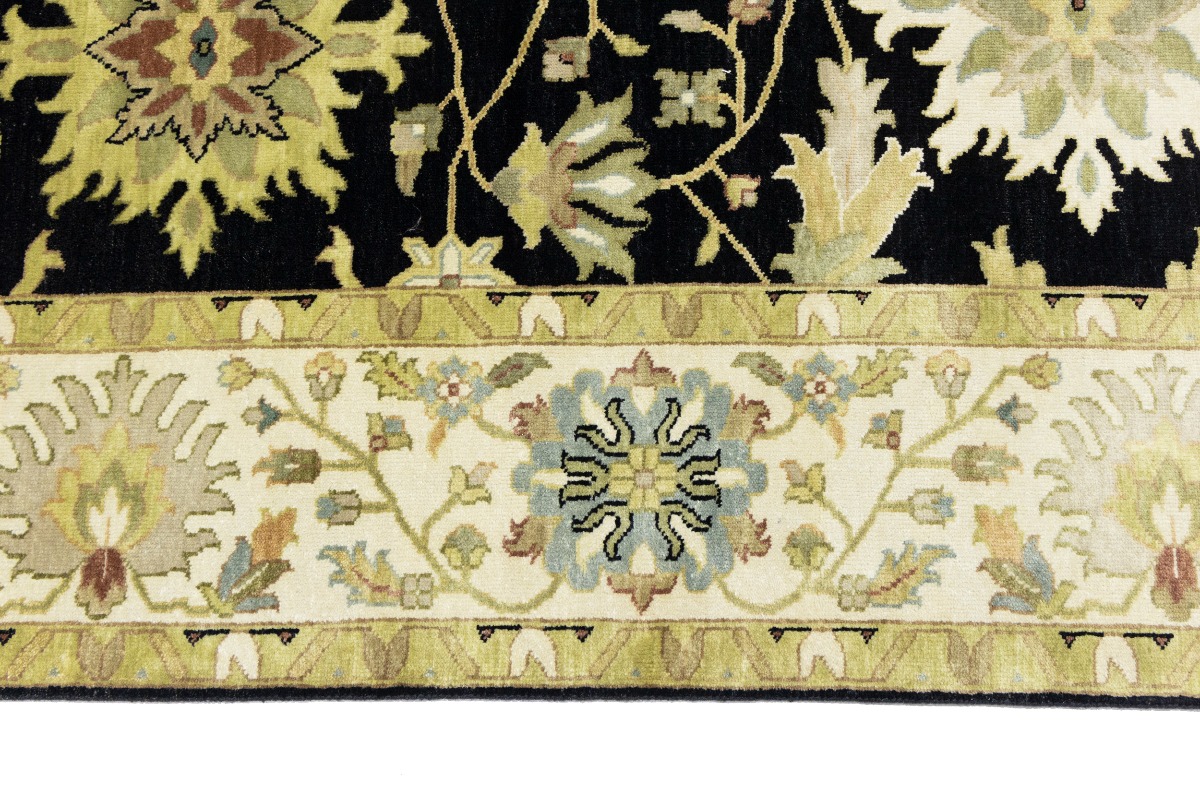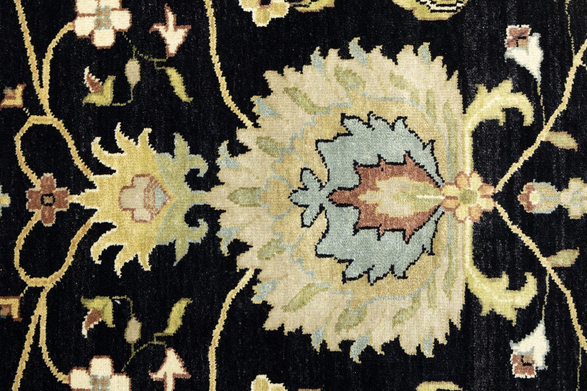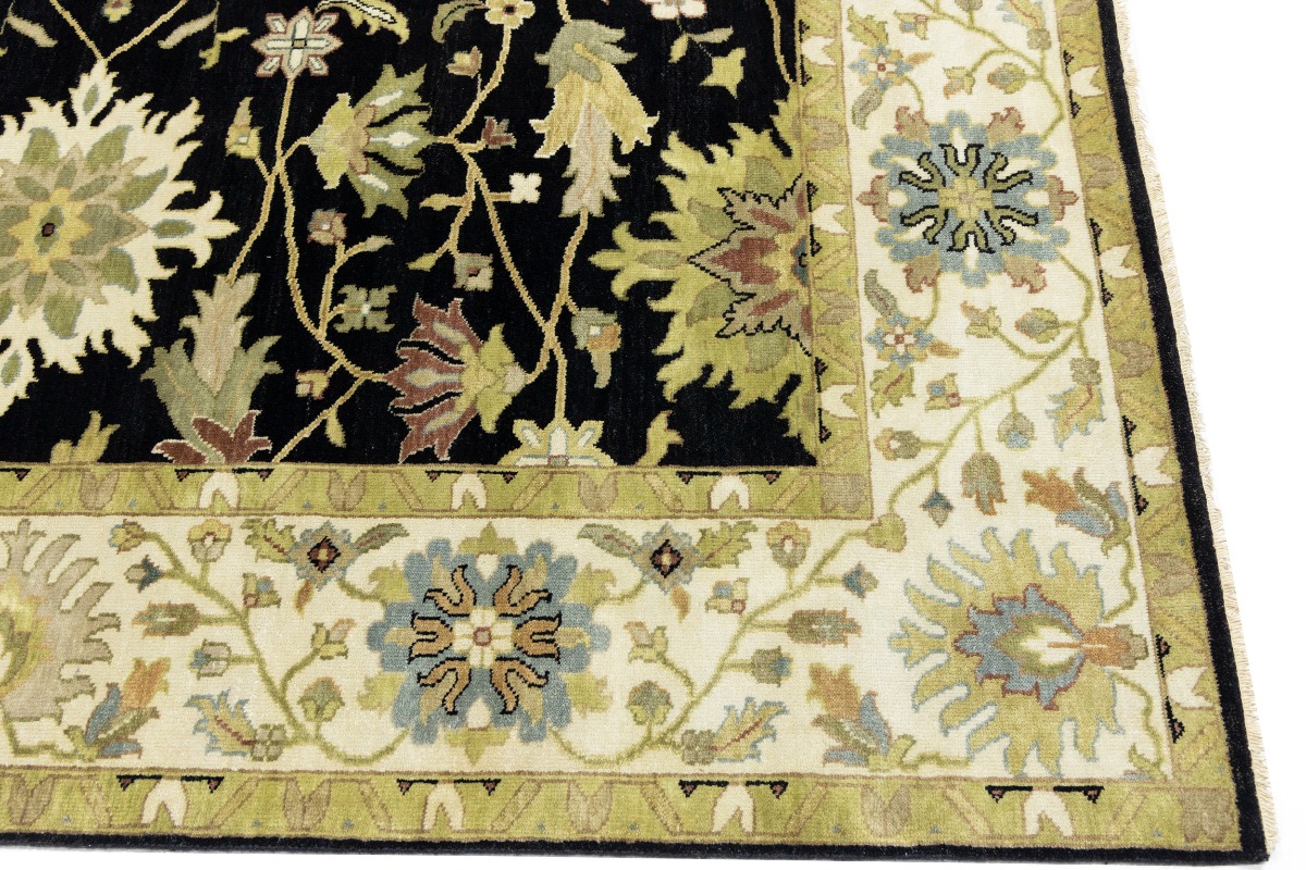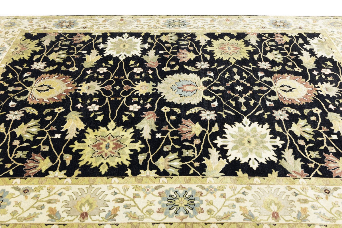 This genuine 9X12 black new Oriental rug was made by the hands of gifted weavers inspired by a variety of spectacular artistic designs, to recreate the aged look of the original piece with a richness of color and ornately patterned background field. What set this vintage style Oriental area rug from the others are the material and dye used (wool pile and cotton foundation), knot count, ancient designs, fantastic grades, and its regional historical connection: it has deep roots, from the story of the people who produced it to the meaning of the symbols and colors displayed across its canvas that have been praised for centuries. This Indian home décor carpet will be completely cozy and inviting that never will go out of style! Also, this Oriental rug would be among your most valuable treasures, it is a great investment that accrues value over time, and it will last for generations because was woven with high-quality, all-natural wool. Environmentally friendly, opulent yet affordable; this rug will give you a thorough amount of character to help define your living space with elegance and warmth that will capture the eyes and attention of your audience (homeowners, designers, decorators, family and friends). OT-9056