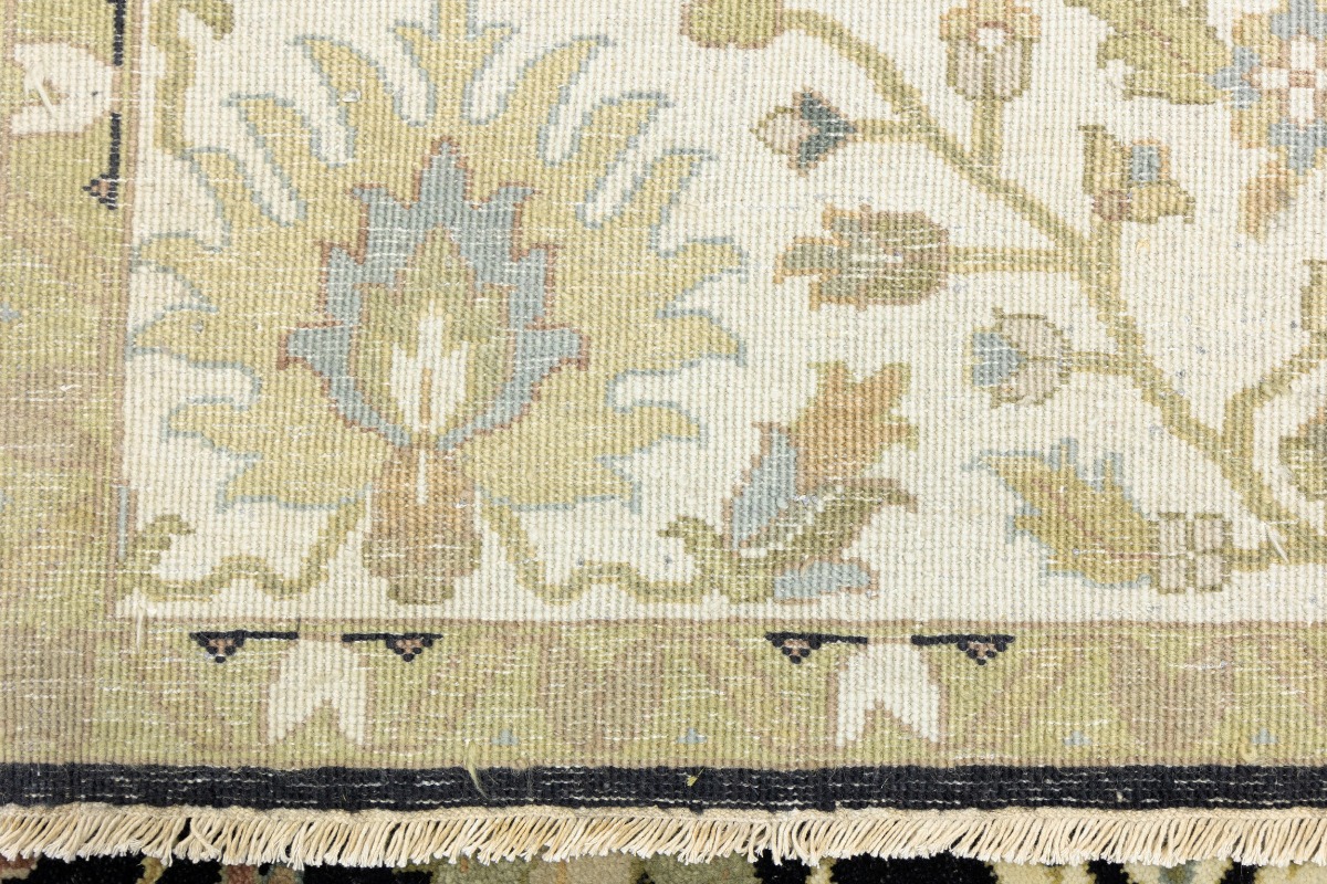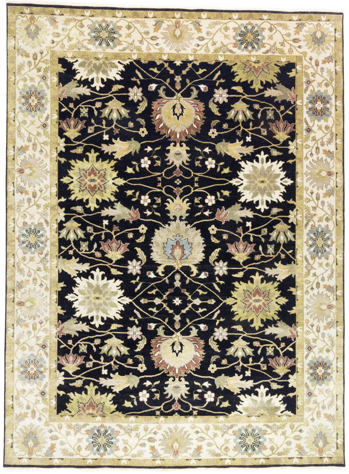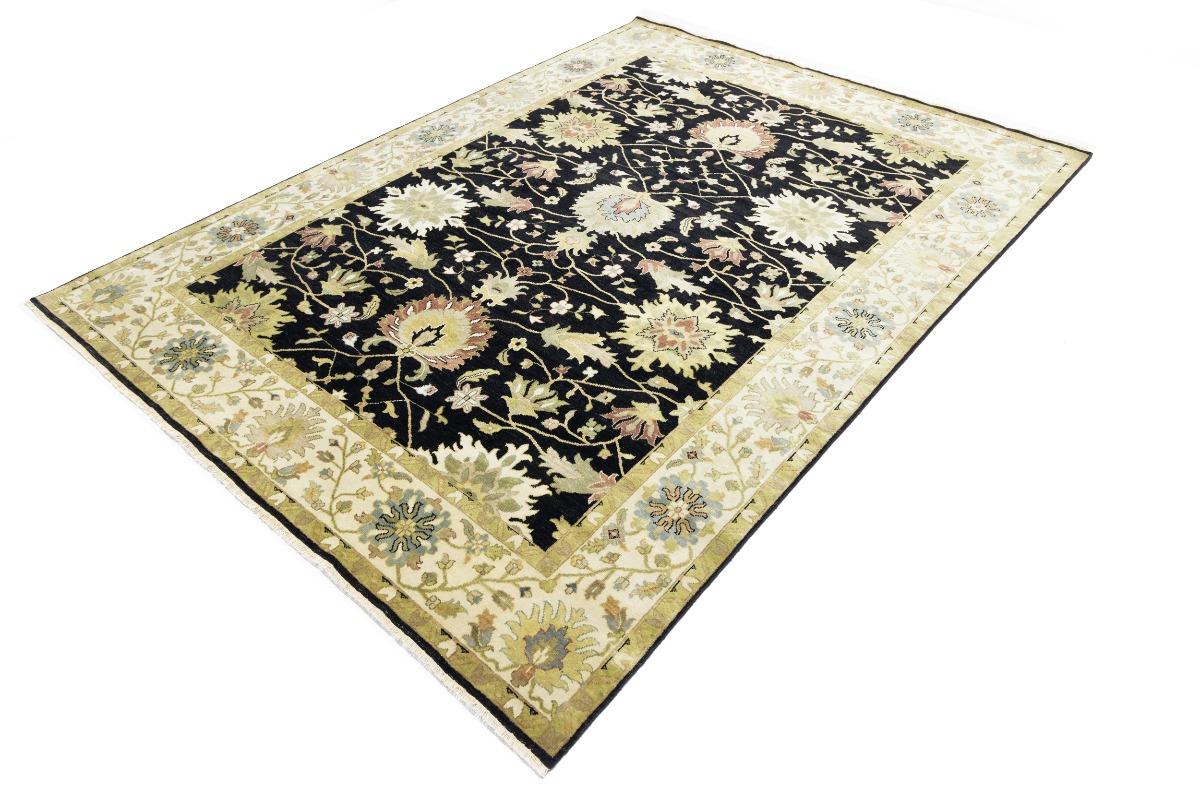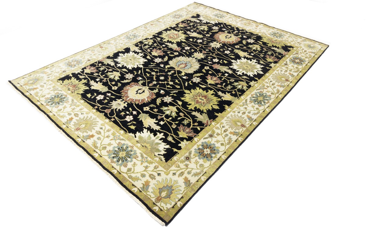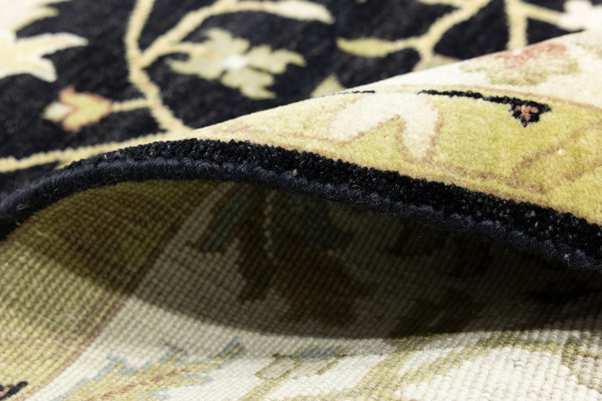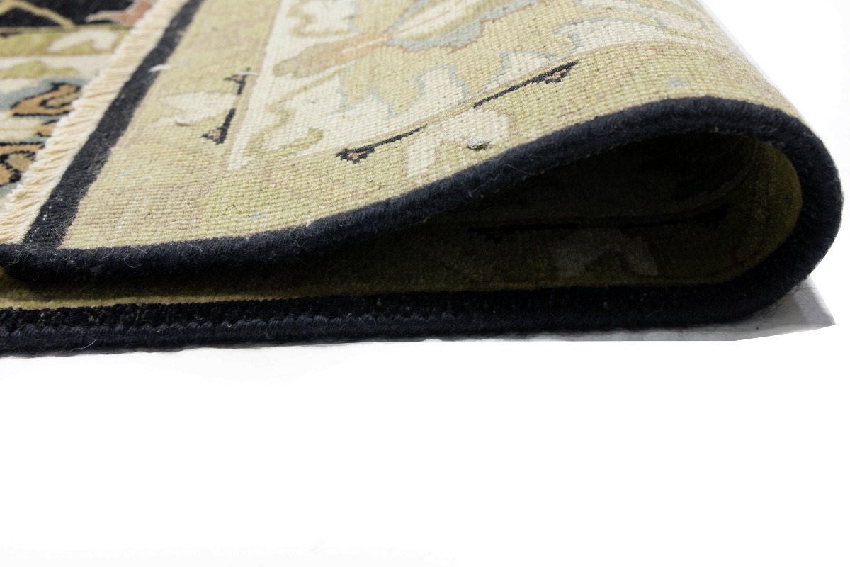 This genuine 9X12 black new Oriental rug was made by the hands of gifted weavers inspired by a variety of spectacular artistic designs, to recreate the aged look of the original piece with a richness of color and ornately patterned background field. What set this vintage style Oriental area rug from the others are the material and dye used (wool pile and cotton foundation), knot count, ancient designs, fantastic grades, and its regional historical connection: it has deep roots, from the story of the people who produced it to the meaning of the symbols and colors displayed across its canvas that have been praised for centuries. This Indian home décor carpet will be completely cozy and inviting that never will go out of style! Also, this Oriental rug would be among your most valuable treasures, it is a great investment that accrues value over time, and it will last for generations because was woven with high-quality, all-natural wool. Environmentally friendly, opulent yet affordable; this rug will give you a thorough amount of character to help define your living space with elegance and warmth that will capture the eyes and attention of your audience (homeowners, designers, decorators, family and friends). OT-9056