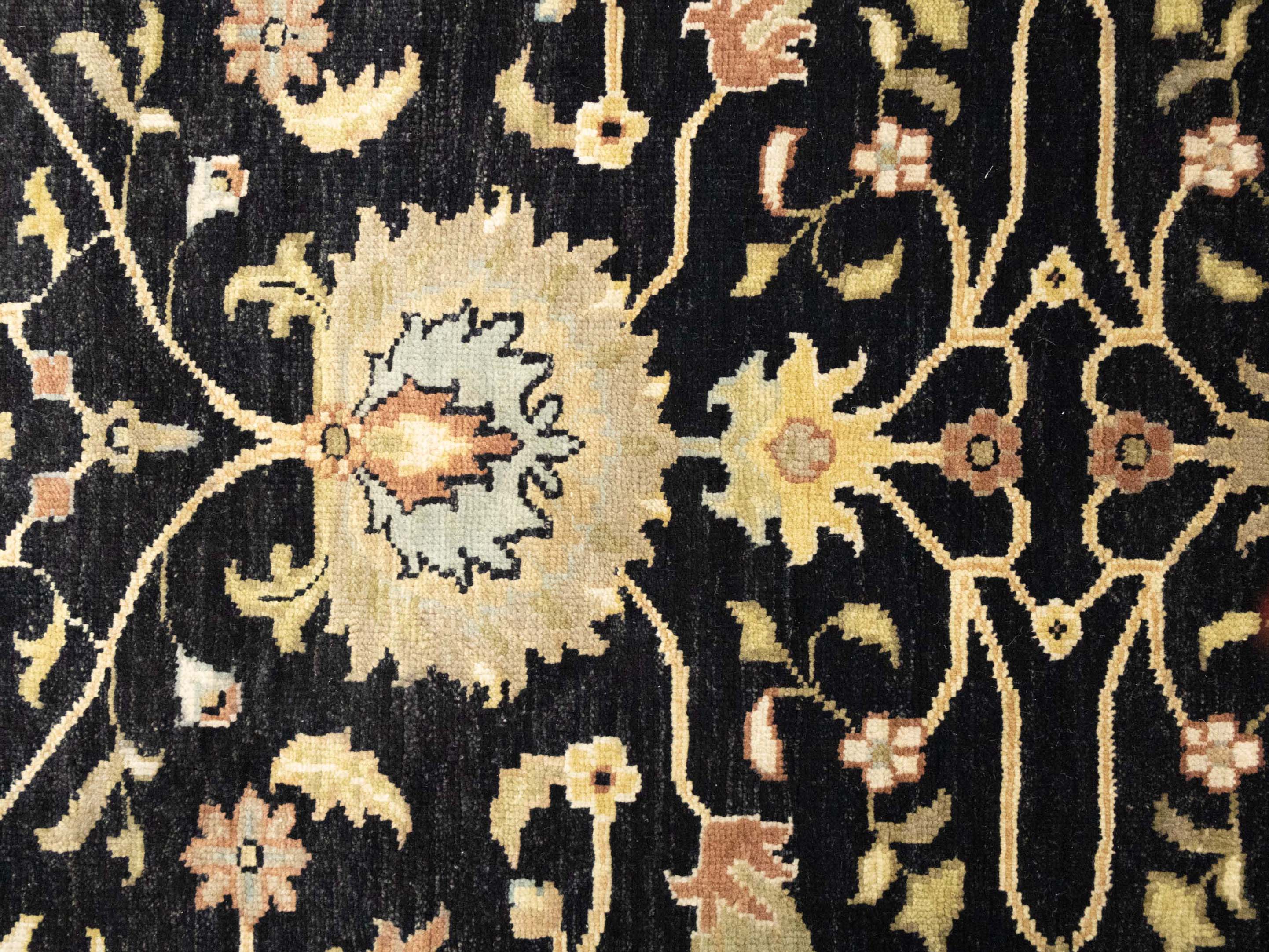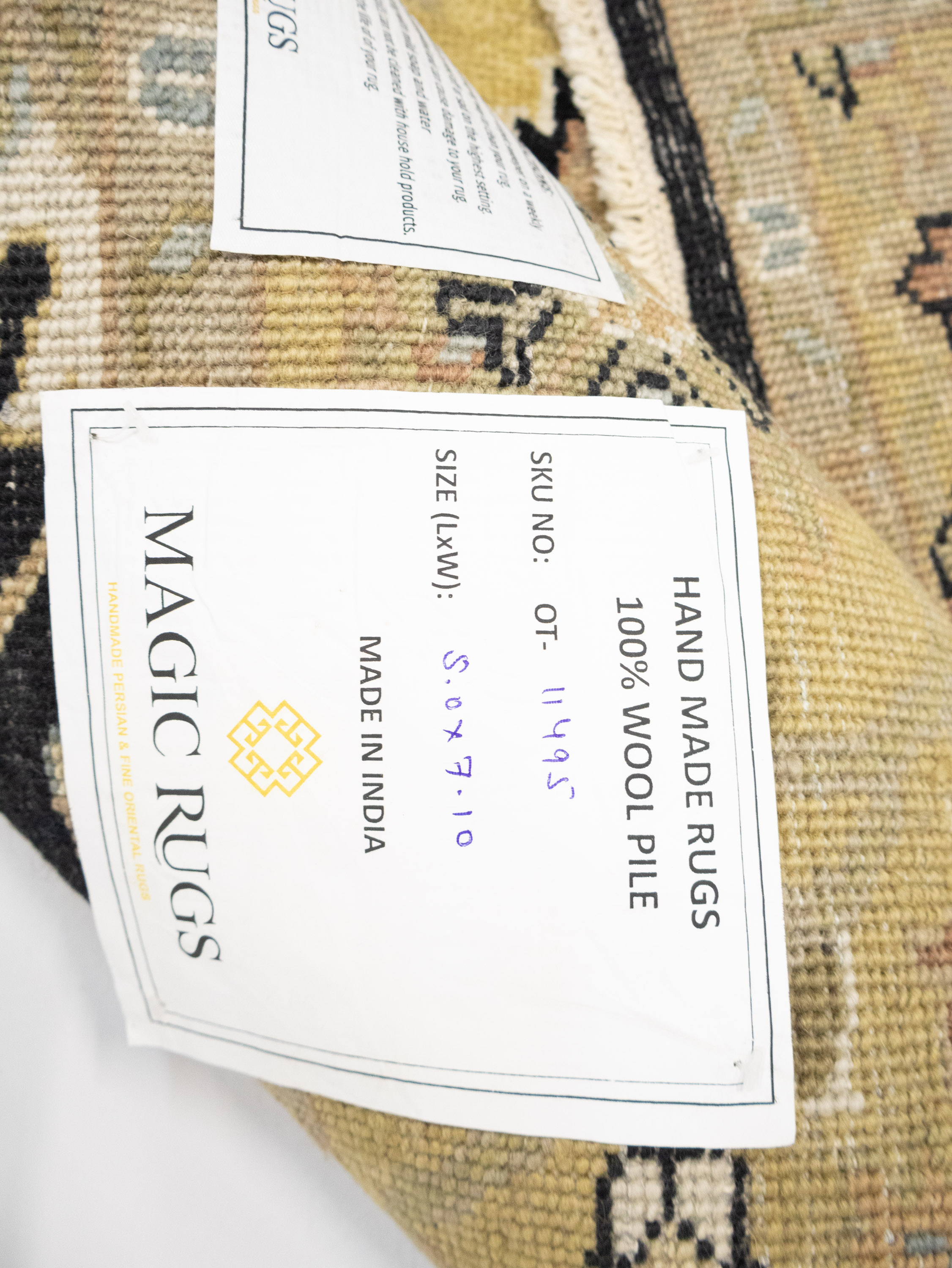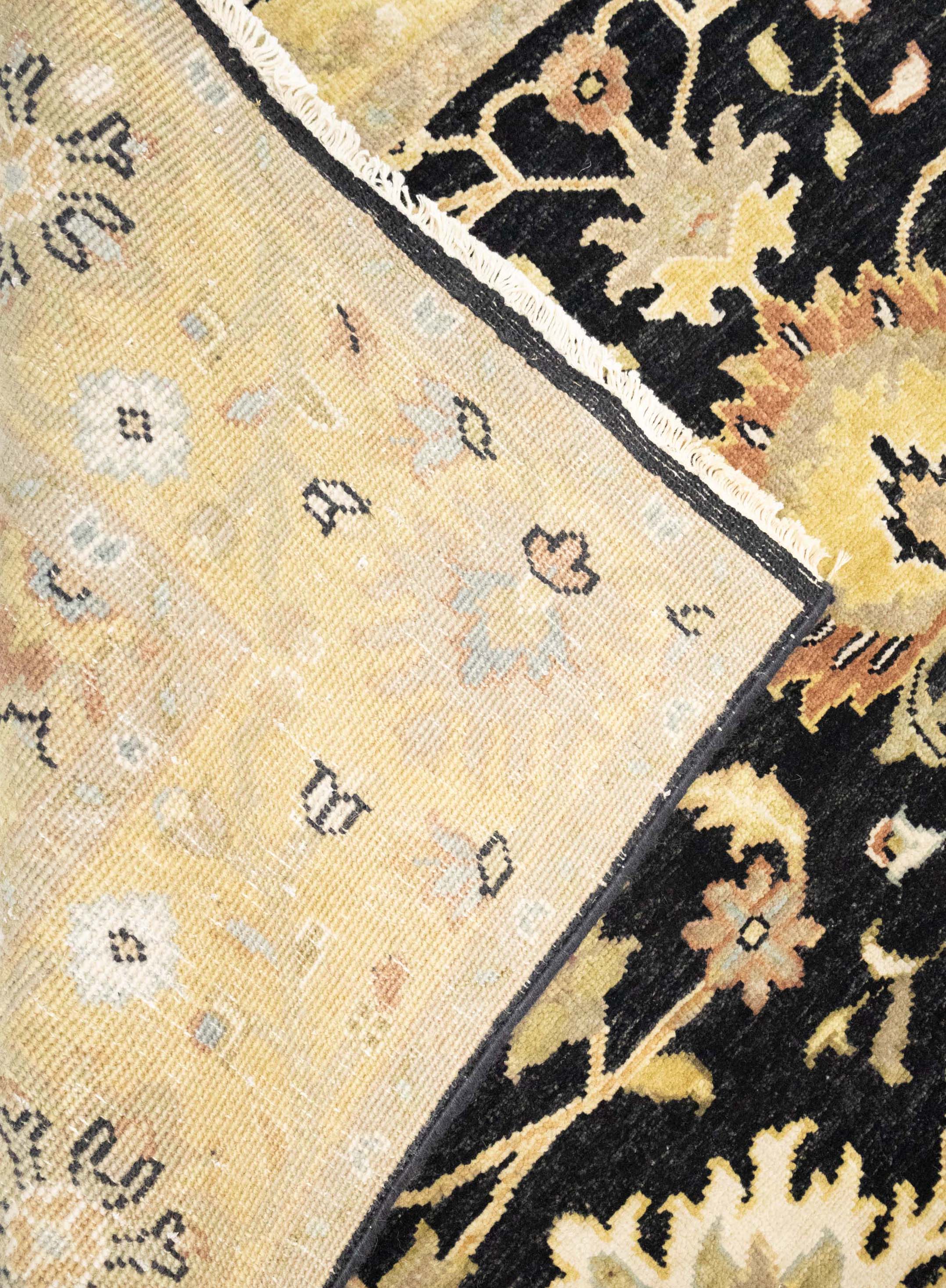 This genuine 5x8 Black new Oriental rug was made by the hands of gifted weavers inspired by a variety of spectacular artistic designs, to recreate the aged look of the original piece with a richness of color and ornately patterned background field. What set this vintage style Oriental area rug from the others are the material and dye used (wool pile and cotton foundation), knot count, ancient designs, fantastic grades, and its regional historical connection: it has deep roots, from the story of the people who produced it to the meaning of the symbols and colors displayed across its canvas that have been praised for centuries. This Indian home décor carpet will be completely cozy and inviting that never will go out of style! Also, this Oriental rug would be among your most valuable treasures, it is a great investment that accrues value over time, and it will last for generations because was woven with high-quality, all-natural wool. Environmentally friendly, opulent yet affordable; this rug will give you a thorough amount of character to help define your living space with elegance and warmth that will capture the eyes and attention of your audience (homeowners, designers, decorators, family and friends). OT-11495