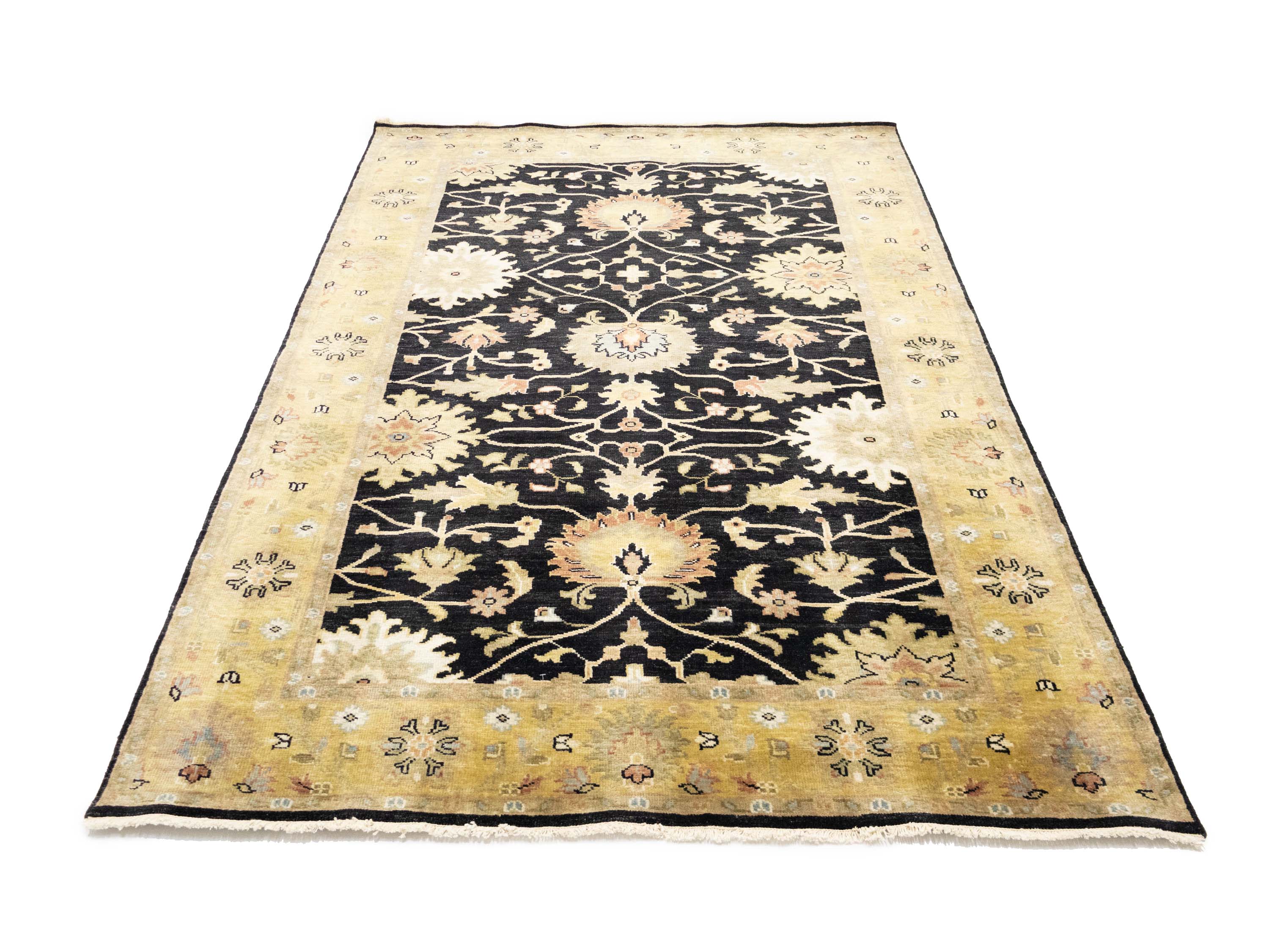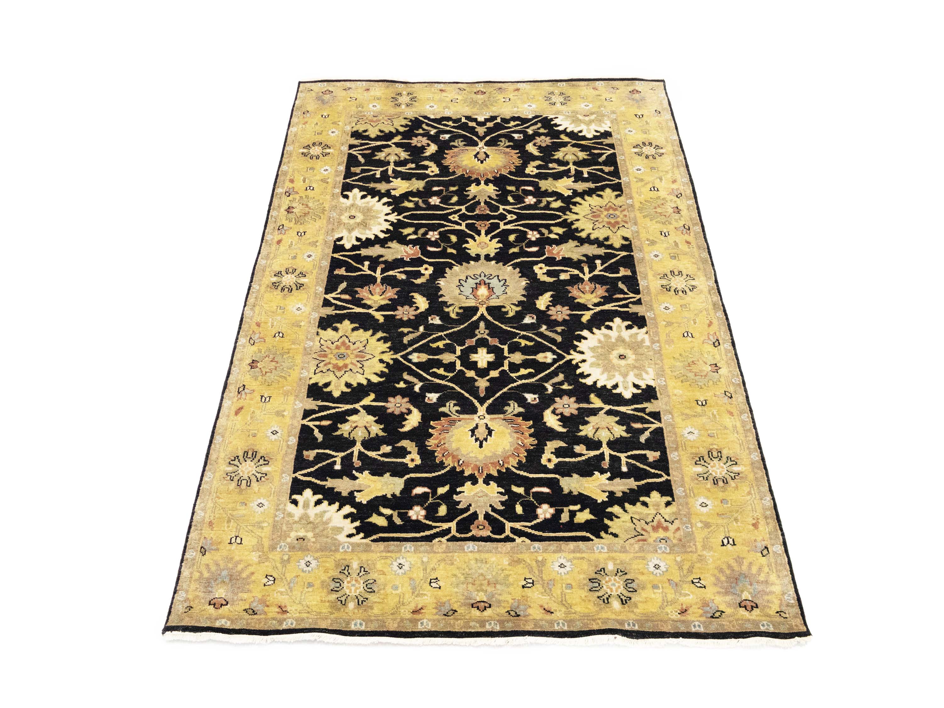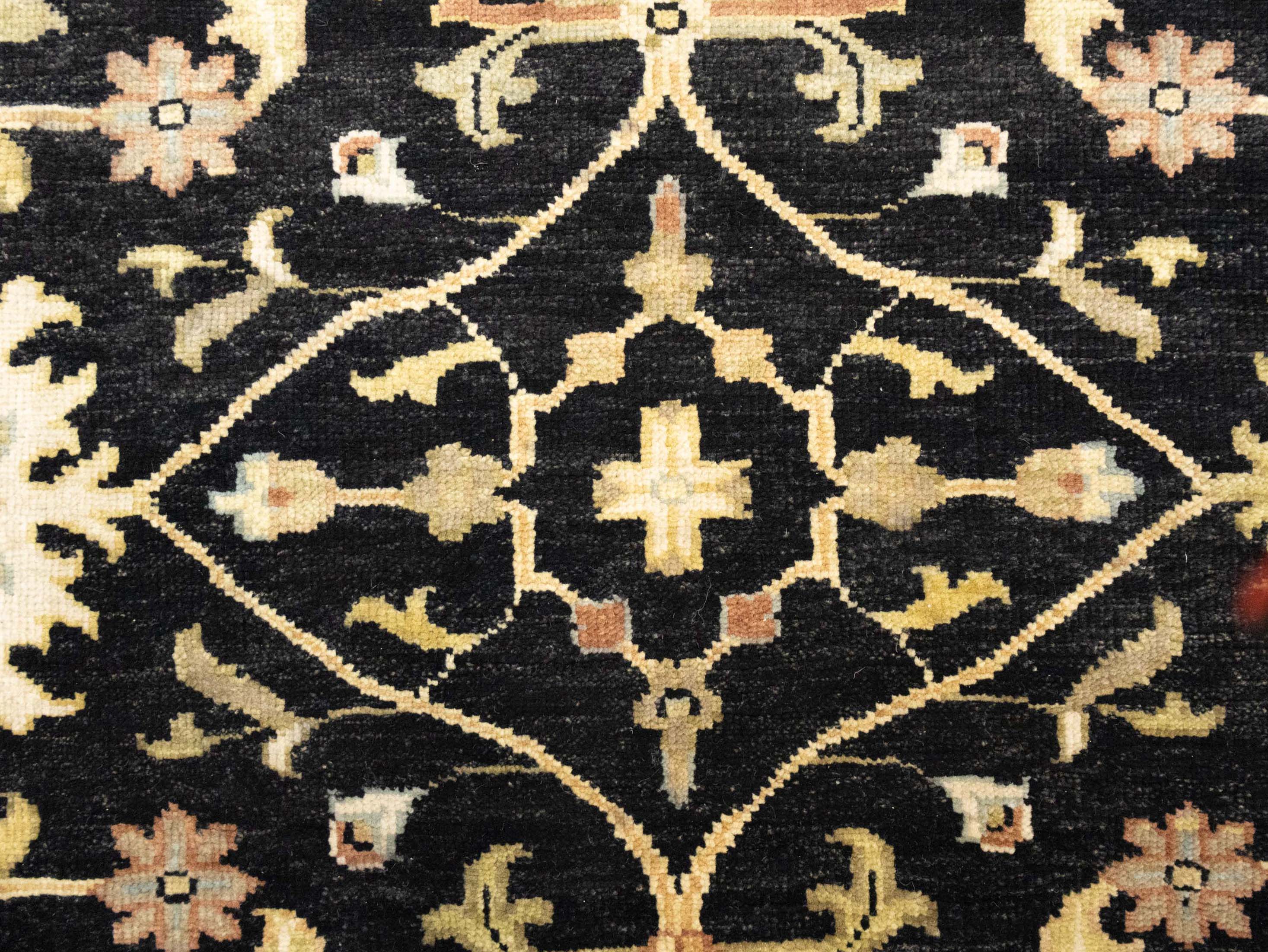 This genuine 5x8 Black new Oriental rug was made by the hands of gifted weavers inspired by a variety of spectacular artistic designs, to recreate the aged look of the original piece with a richness of color and ornately patterned background field. What set this vintage style Oriental area rug from the others are the material and dye used (wool pile and cotton foundation), knot count, ancient designs, fantastic grades, and its regional historical connection: it has deep roots, from the story of the people who produced it to the meaning of the symbols and colors displayed across its canvas that have been praised for centuries. This Indian home décor carpet will be completely cozy and inviting that never will go out of style! Also, this Oriental rug would be among your most valuable treasures, it is a great investment that accrues value over time, and it will last for generations because was woven with high-quality, all-natural wool. Environmentally friendly, opulent yet affordable; this rug will give you a thorough amount of character to help define your living space with elegance and warmth that will capture the eyes and attention of your audience (homeowners, designers, decorators, family and friends). OT-11495