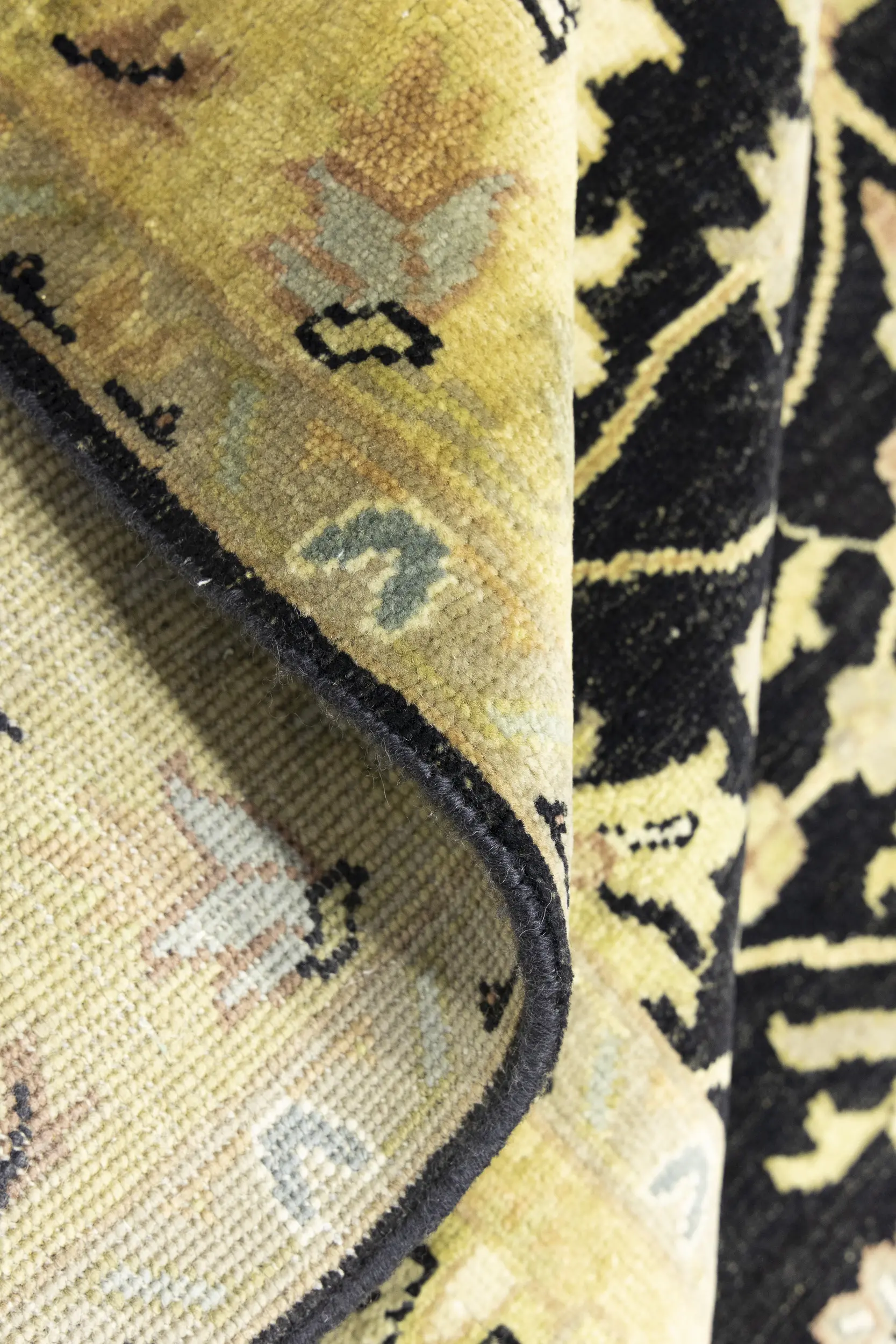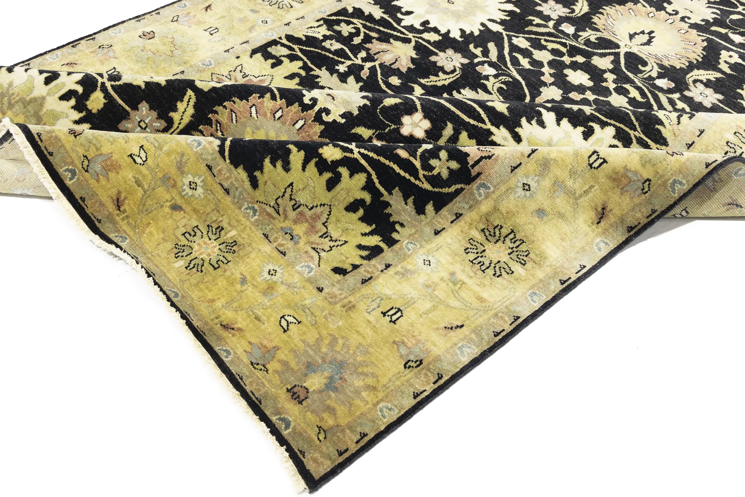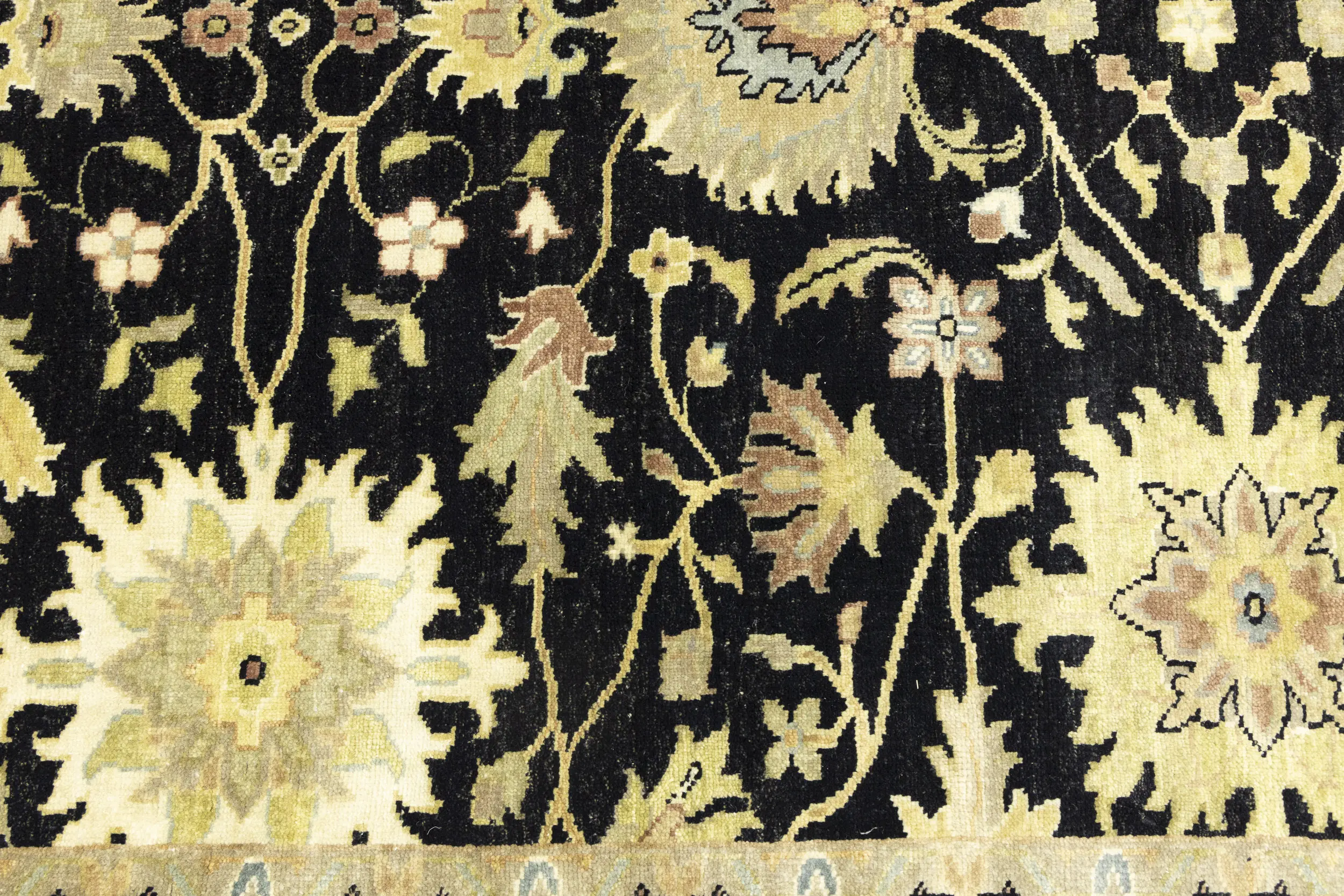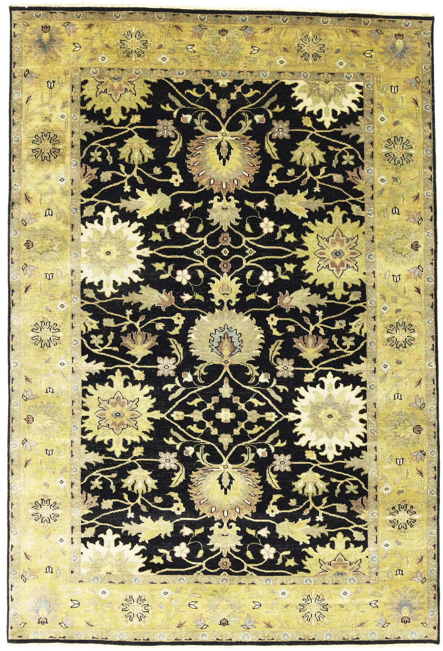 This genuine 6x9 Black new Oriental rug was made by the hands of gifted weavers inspired by a variety of spectacular artistic designs, to recreate the aged look of the original piece with a richness of color and ornately patterned background field. What set this vintage style Oriental area rug from the others are the material and dye used (wool pile and cotton foundation), knot count, ancient designs, fantastic grades, and its regional historical connection: it has deep roots, from the story of the people who produced it to the meaning of the symbols and colors displayed across its canvas that have been praised for centuries. This Indian home décor carpet will be completely cozy and inviting that never will go out of style! Also, this Oriental rug would be among your most valuable treasures, it is a great investment that accrues value over time, and it will last for generations because was woven with high-quality, all-natural wool. Environmentally friendly, opulent yet affordable; this rug will give you a thorough amount of character to help define your living space with elegance and warmth that will capture the eyes and attention of your audience (homeowners, designers, decorators, family and friends). OT-11493