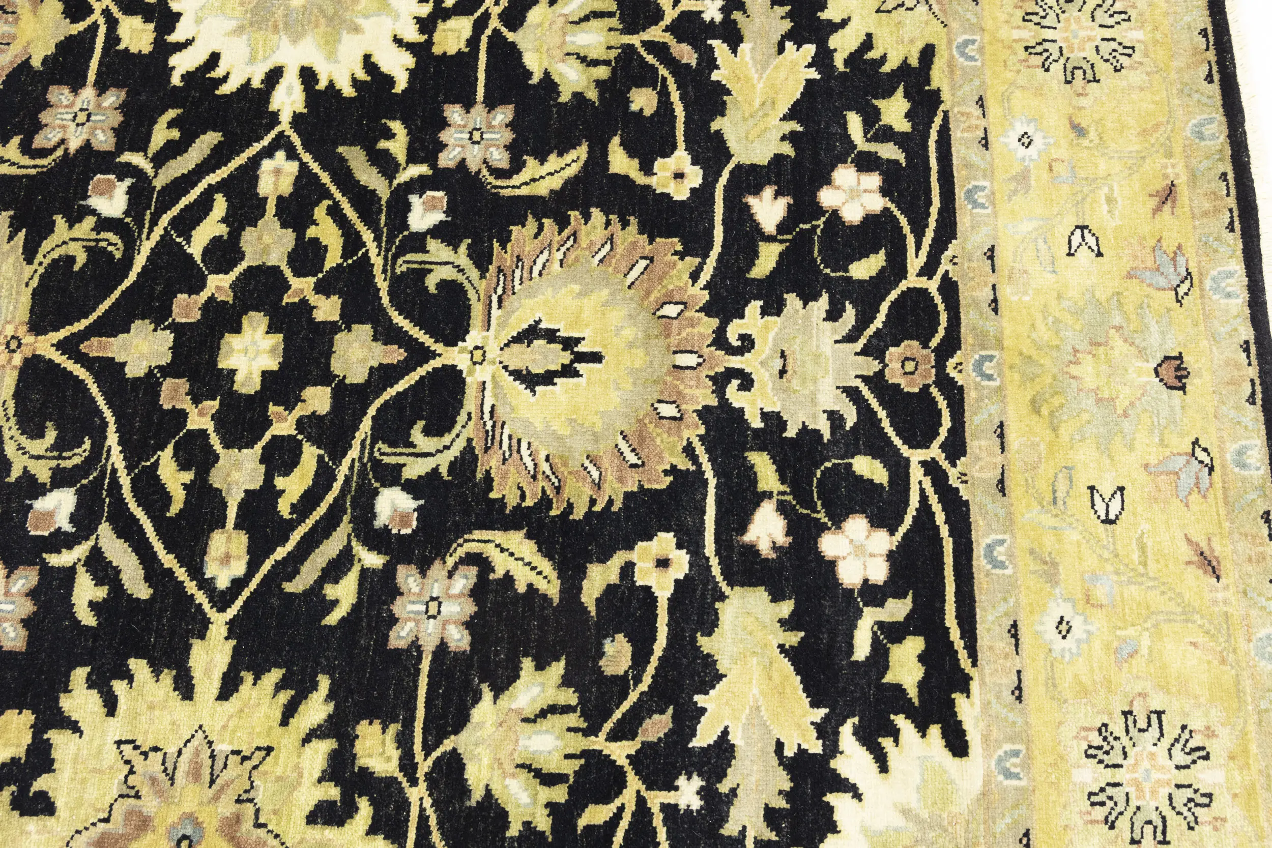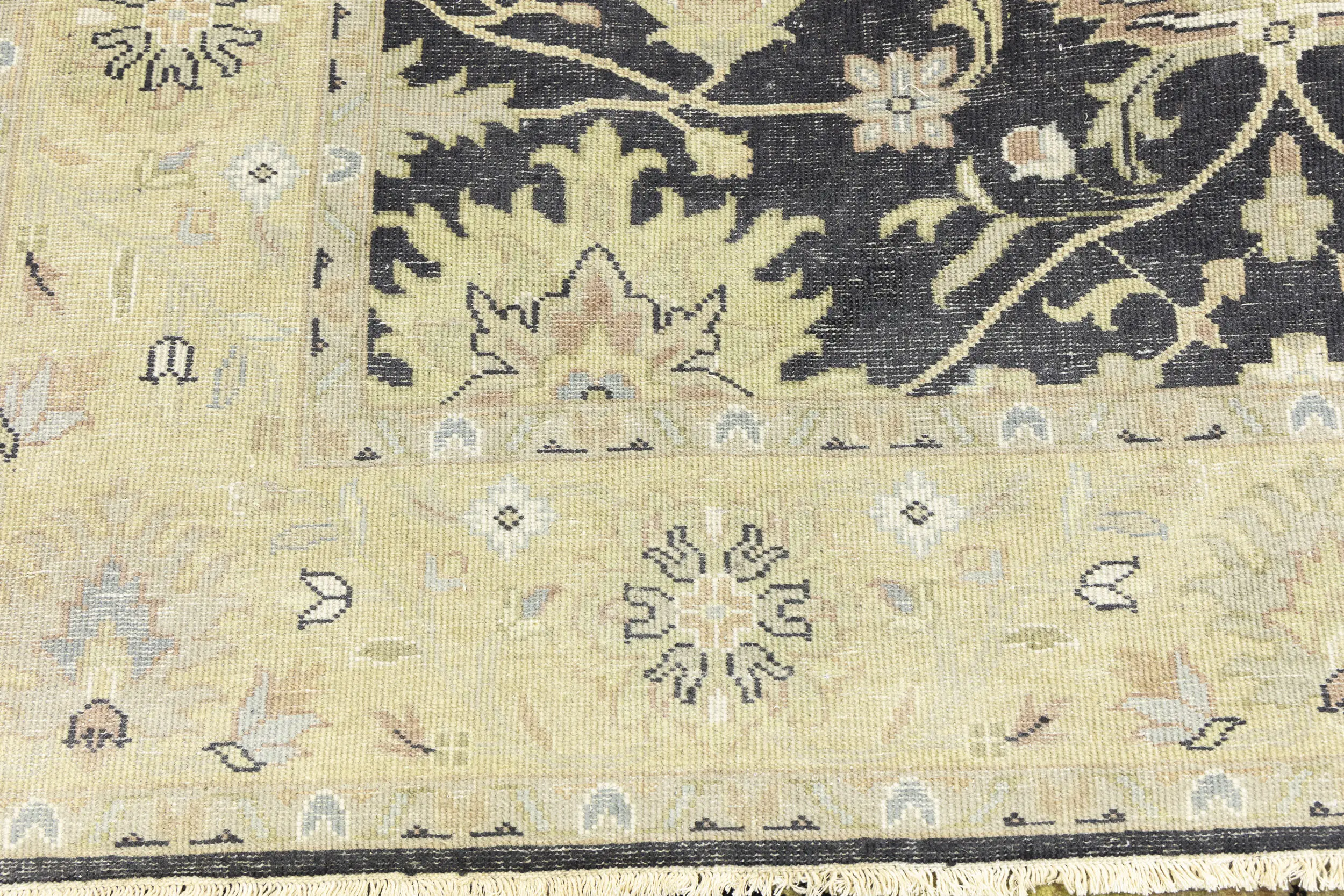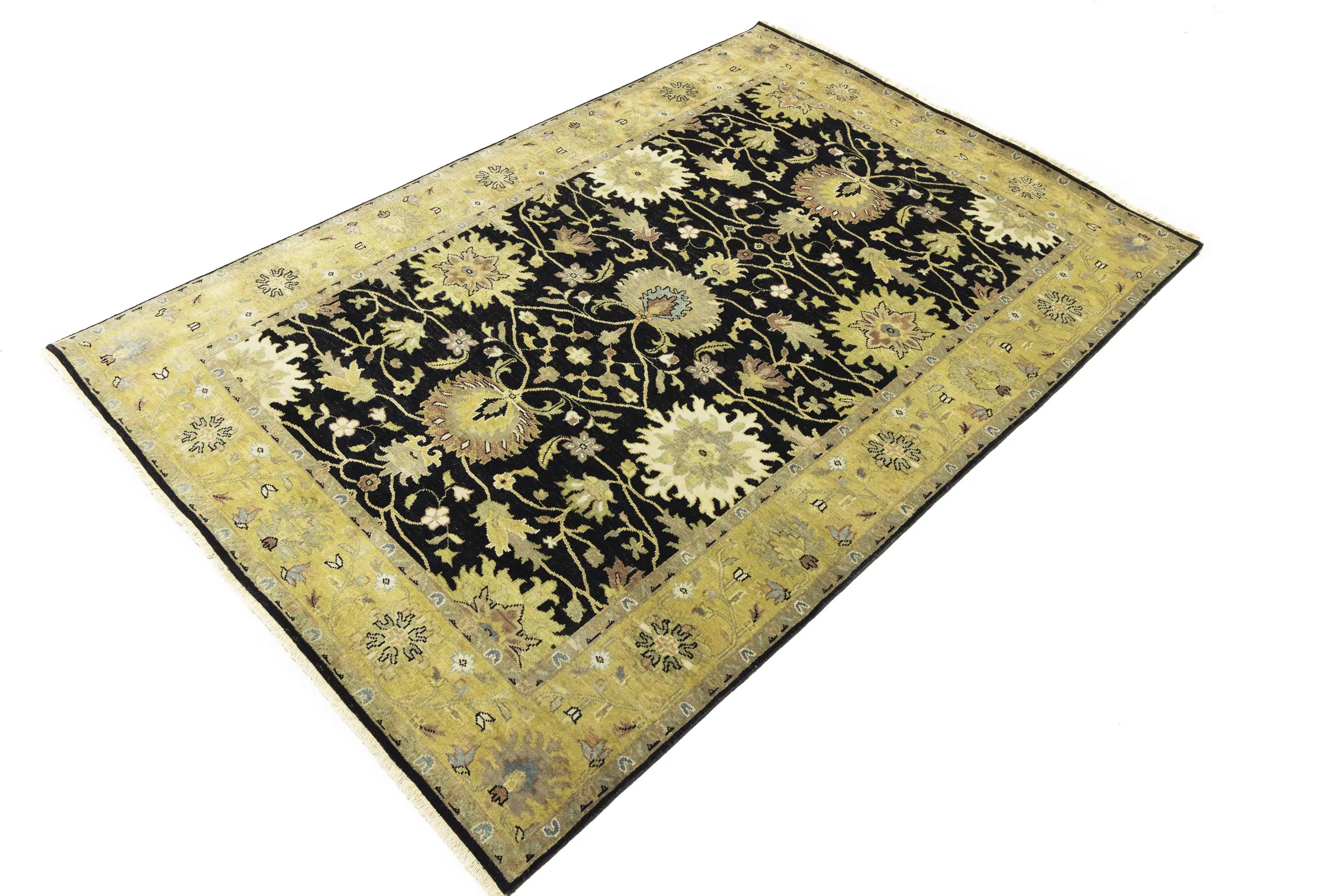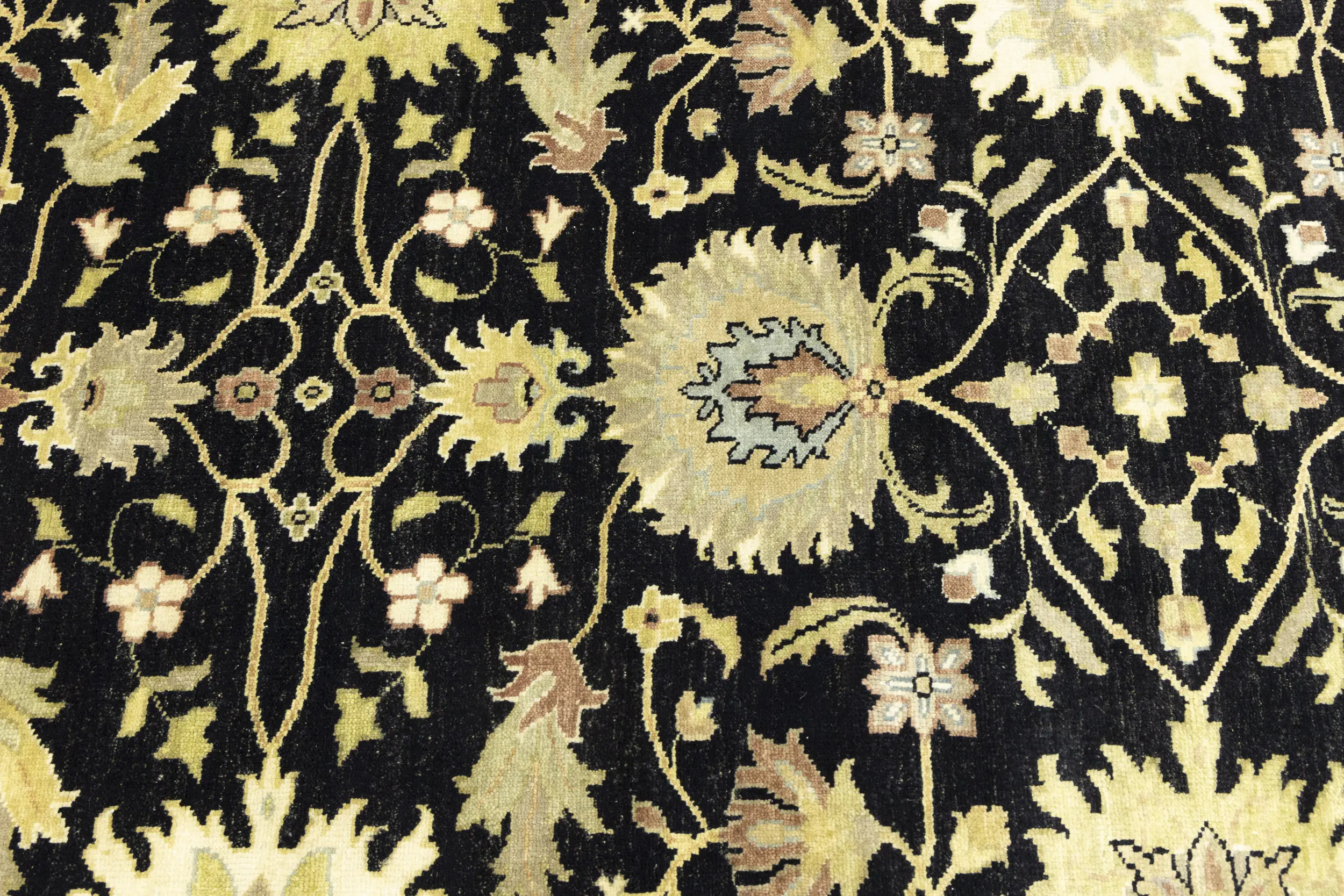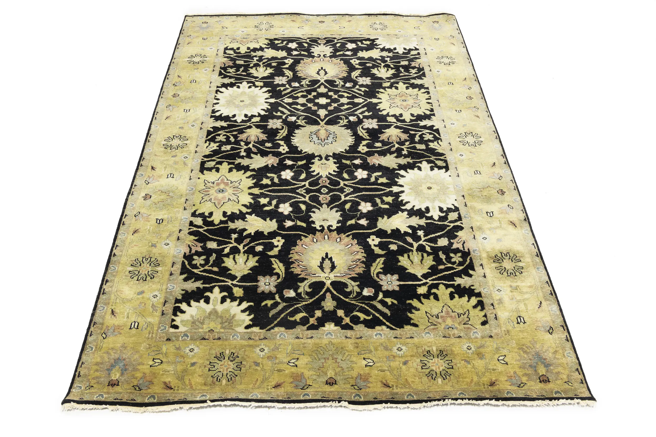 This genuine 6x9 Black new Oriental rug was made by the hands of gifted weavers inspired by a variety of spectacular artistic designs, to recreate the aged look of the original piece with a richness of color and ornately patterned background field. What set this vintage style Oriental area rug from the others are the material and dye used (wool pile and cotton foundation), knot count, ancient designs, fantastic grades, and its regional historical connection: it has deep roots, from the story of the people who produced it to the meaning of the symbols and colors displayed across its canvas that have been praised for centuries. This Indian home décor carpet will be completely cozy and inviting that never will go out of style! Also, this Oriental rug would be among your most valuable treasures, it is a great investment that accrues value over time, and it will last for generations because was woven with high-quality, all-natural wool. Environmentally friendly, opulent yet affordable; this rug will give you a thorough amount of character to help define your living space with elegance and warmth that will capture the eyes and attention of your audience (homeowners, designers, decorators, family and friends). OT-11493