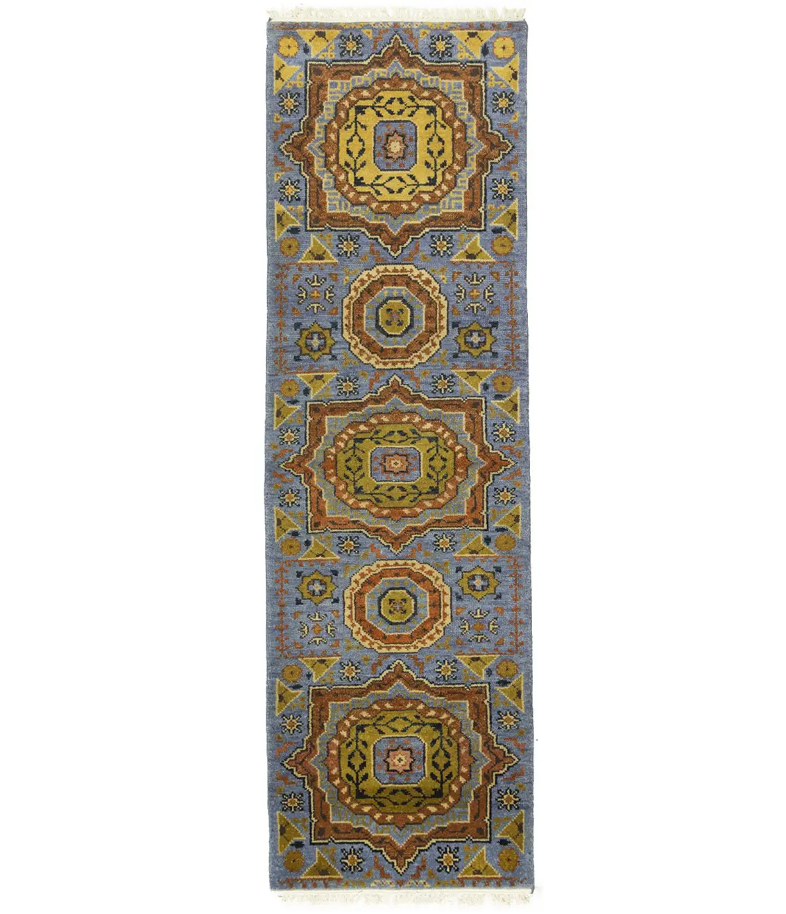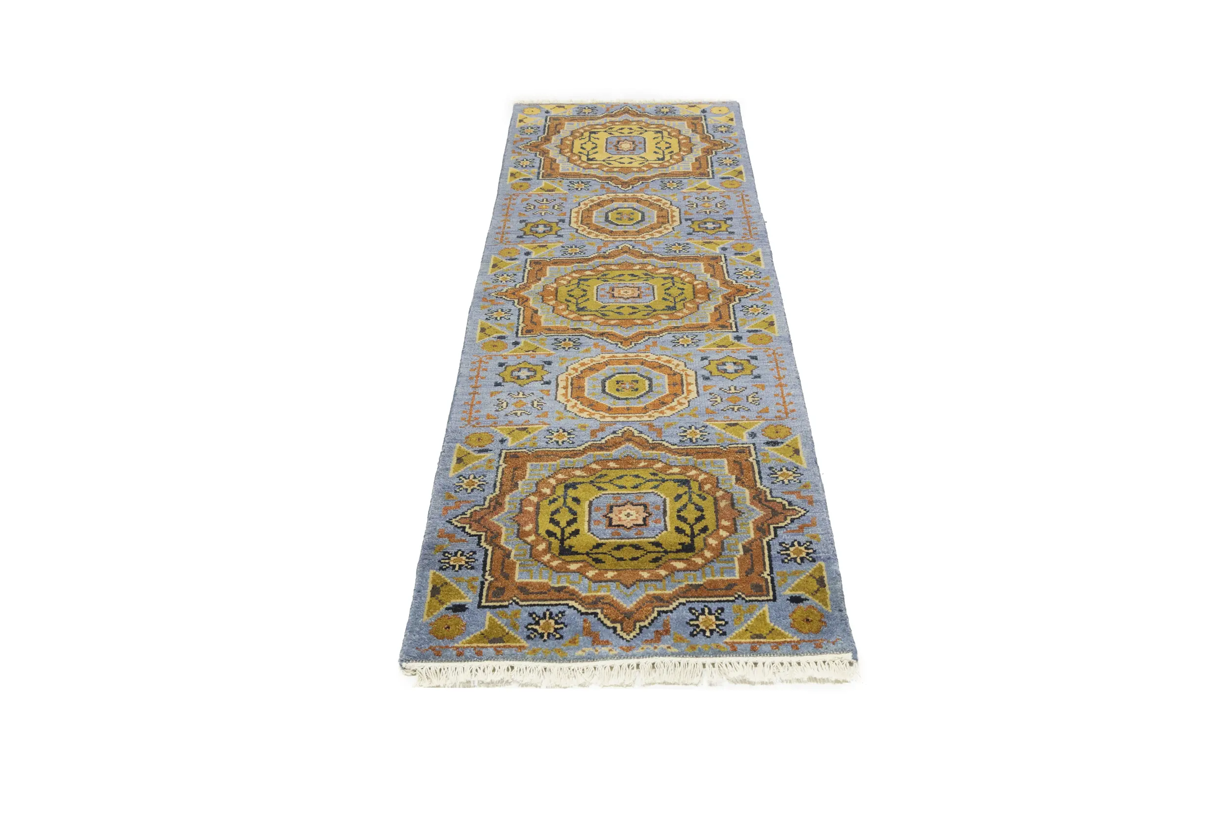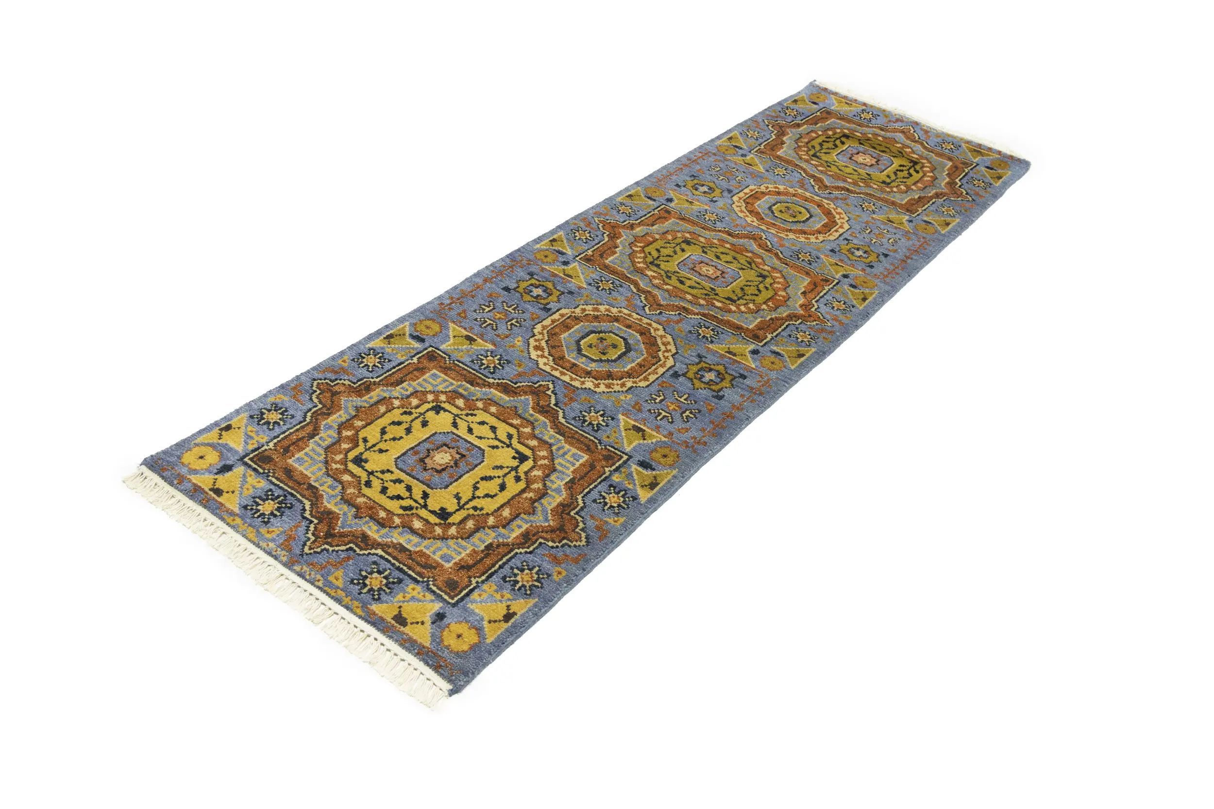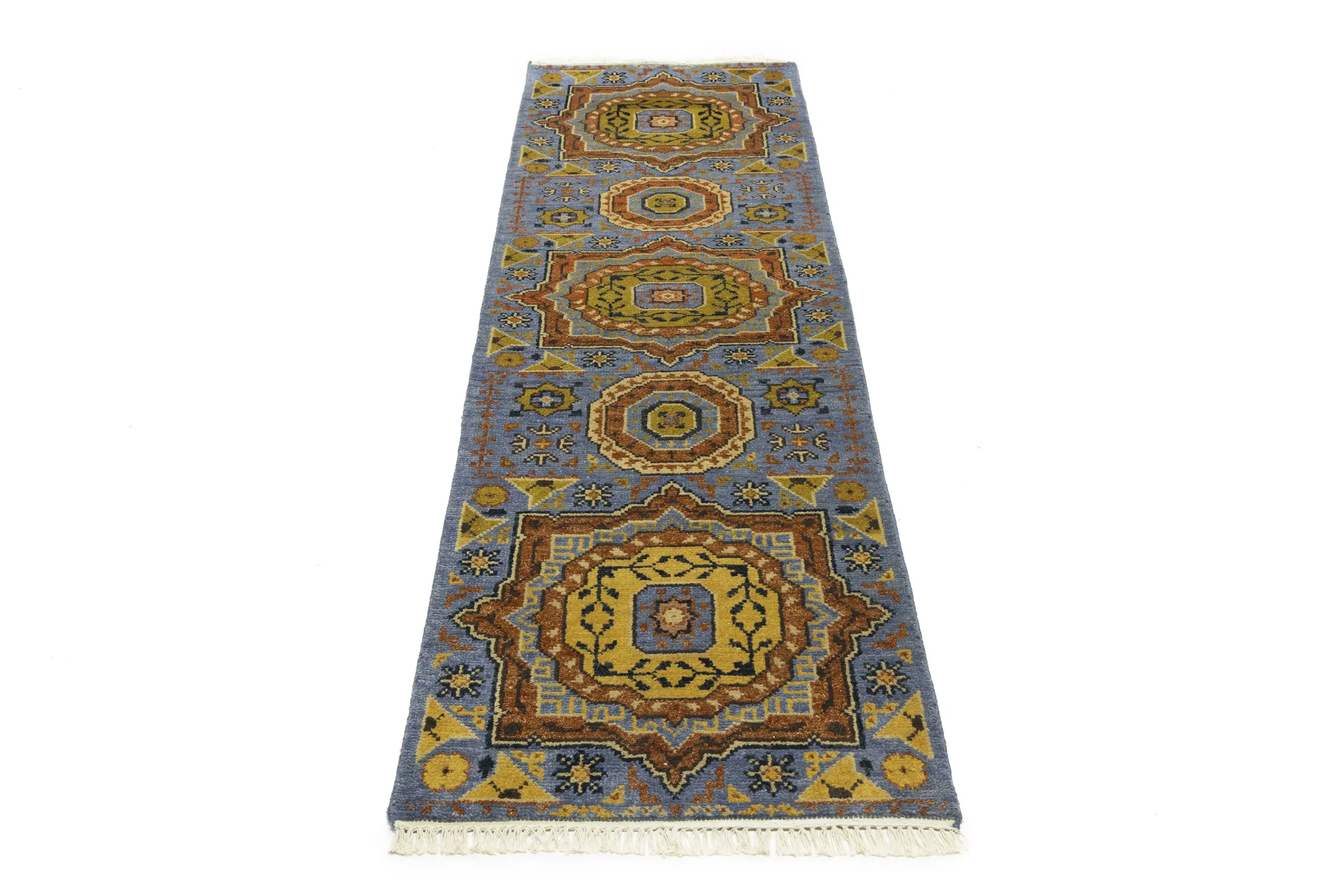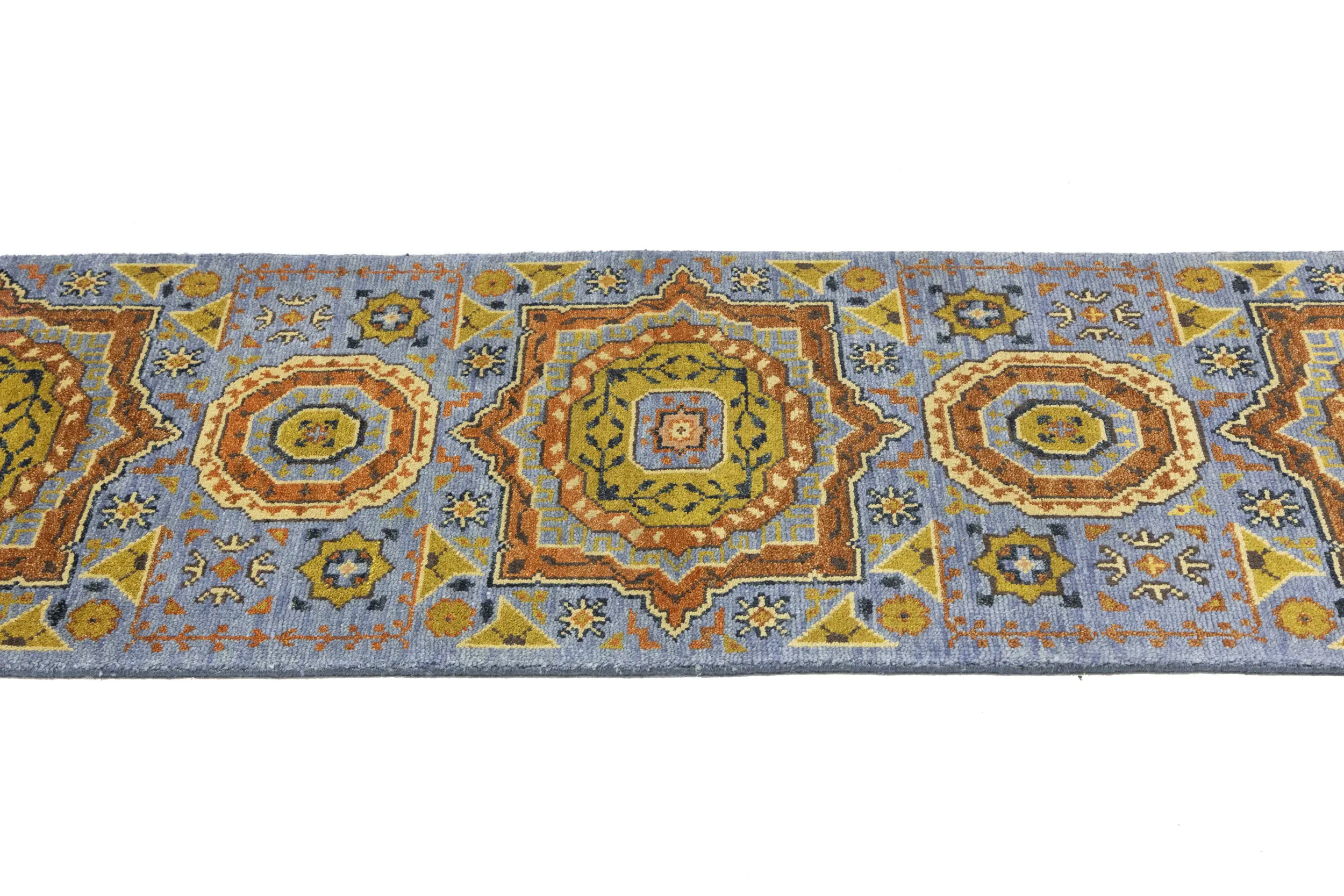 Handmade 2'7X10'3 blue Oriental runner made with vegetable dyes (fine wool pile and cotton foundation), superior knot count, and appealing ancient designs. This Oriental runner never will go out of style and would be among your most valuable treasures.
