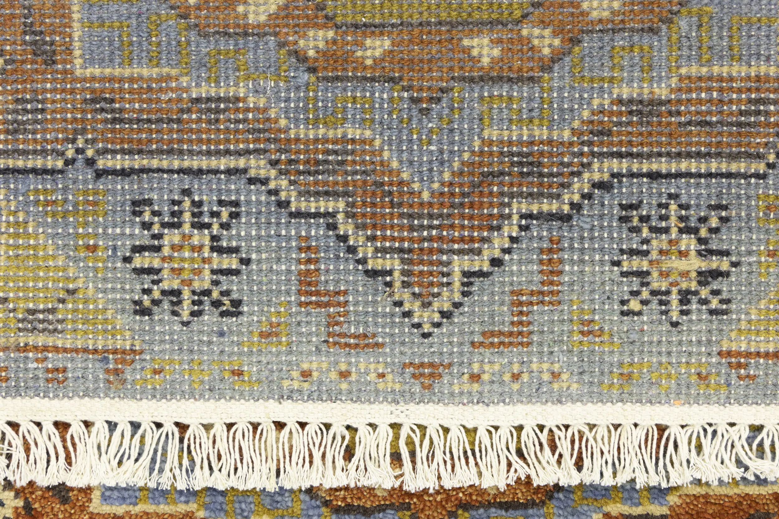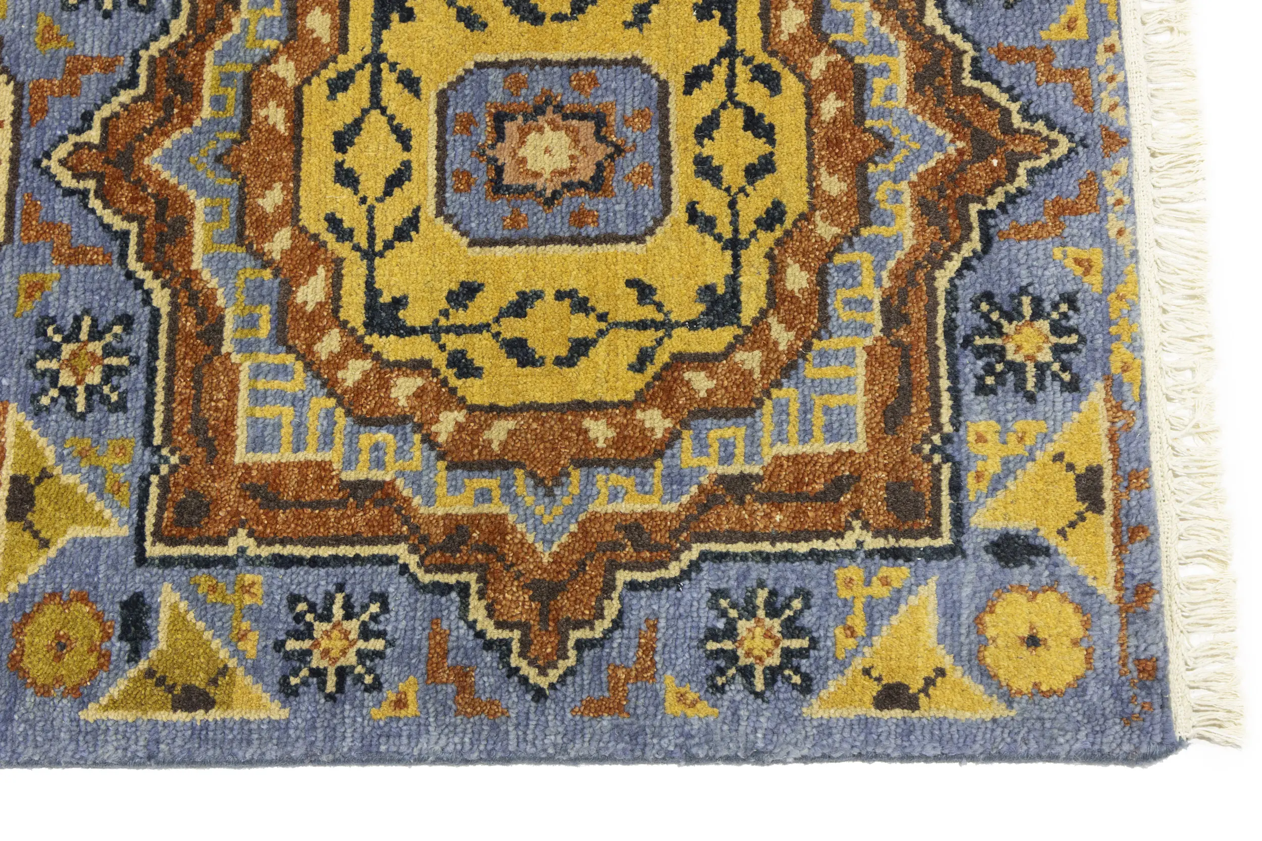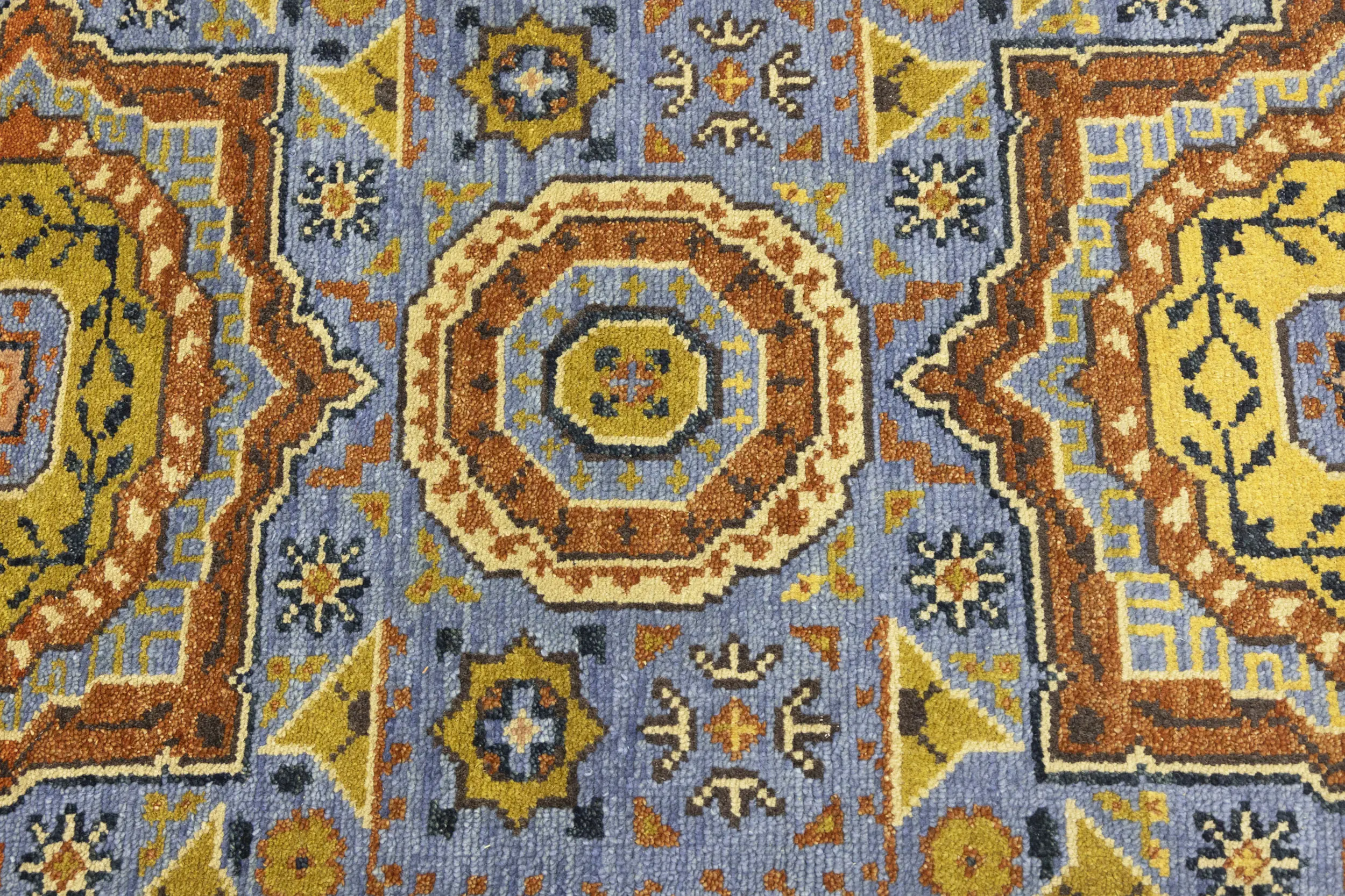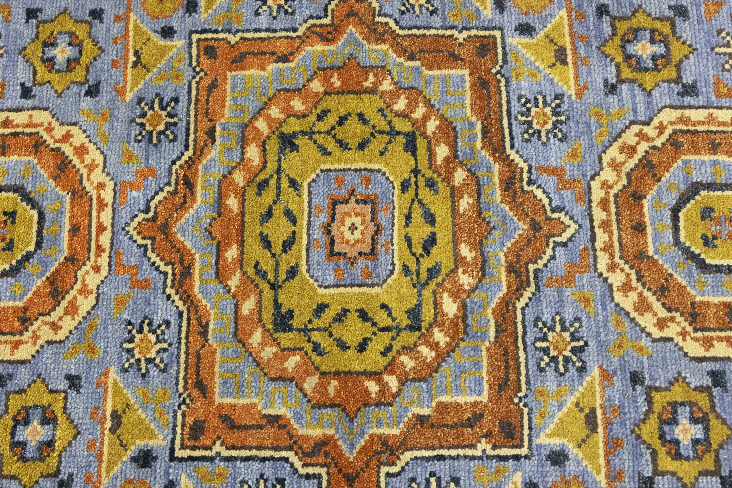 This original 2'7X10'3 blue new Oriental runner was finely knotted by the hands of weavers influenced by a variety of amazing artistic designs, to recreate the aged look of the exceptional piece with a richness of color and embellished background field. What set this vintage style Oriental area runner from the others are the material and dye used (wool pile and cotton foundation), knot count, antique designs, fantastic grades, and its regional historical connection: it has deep roots, from the story of the people who produced it to the meaning of the symbols and colors displayed across its canvas that have been praised for centuries. This Indian home décor carpet will be completely cozy and inviting that never will go out of style!