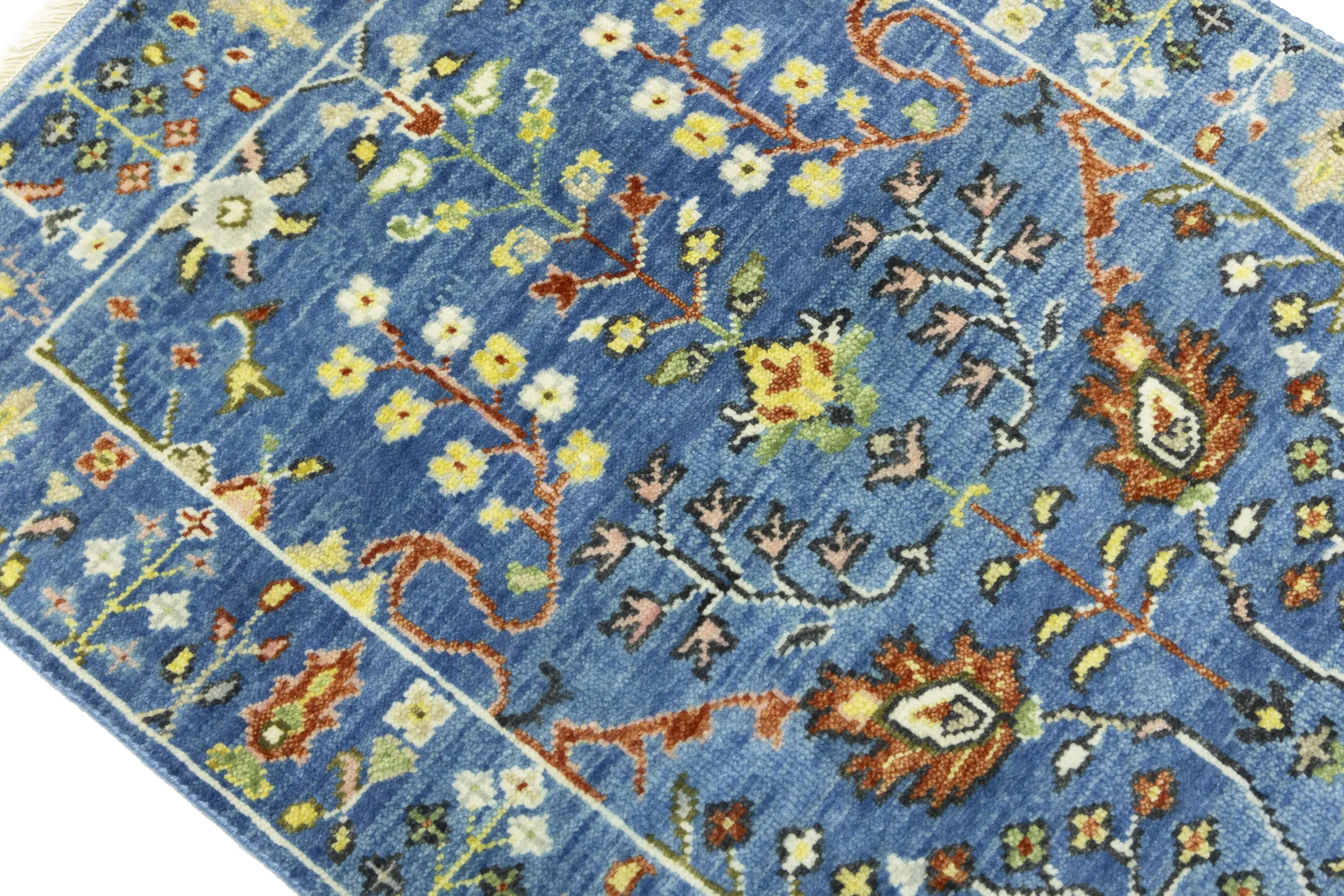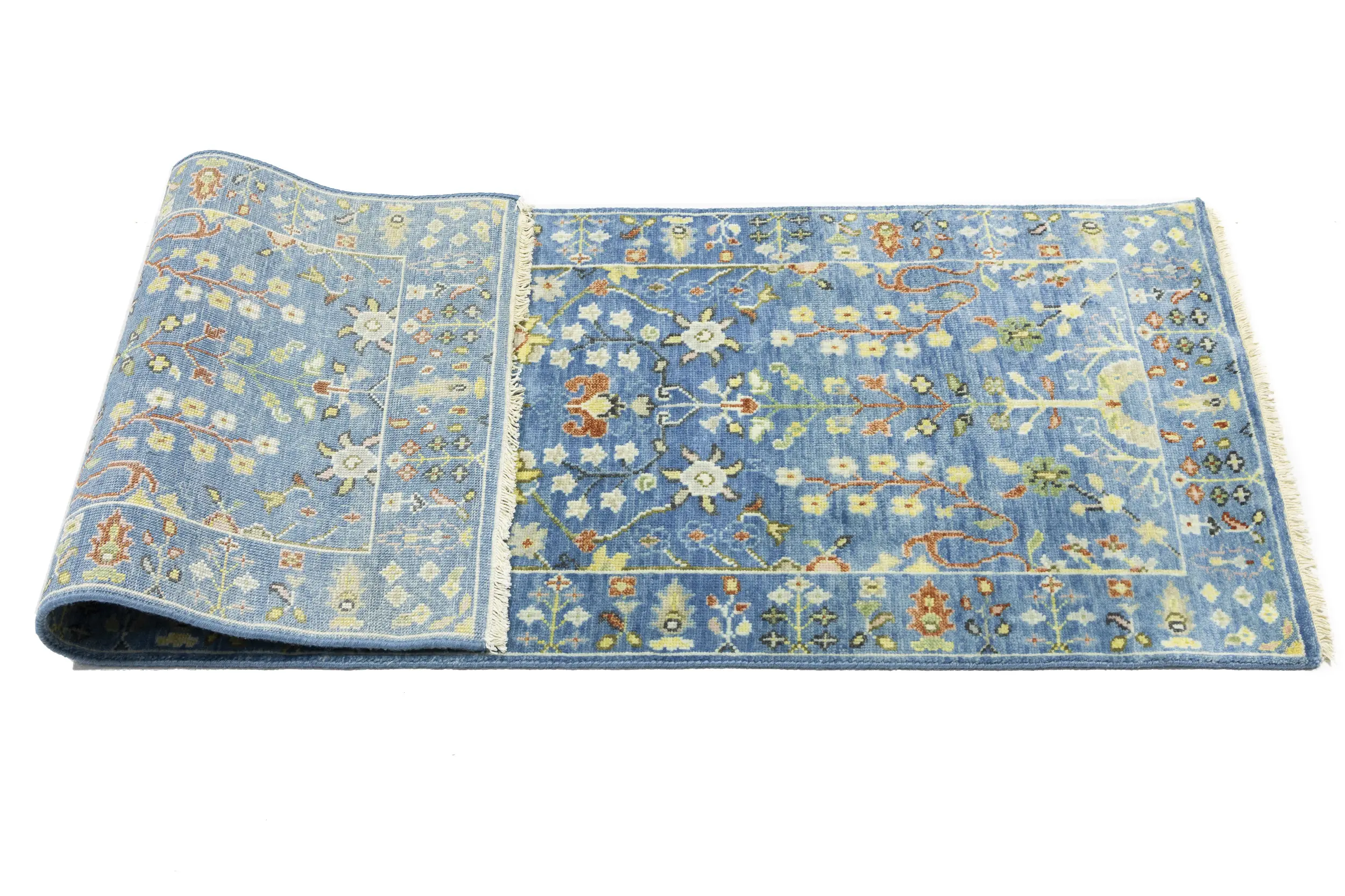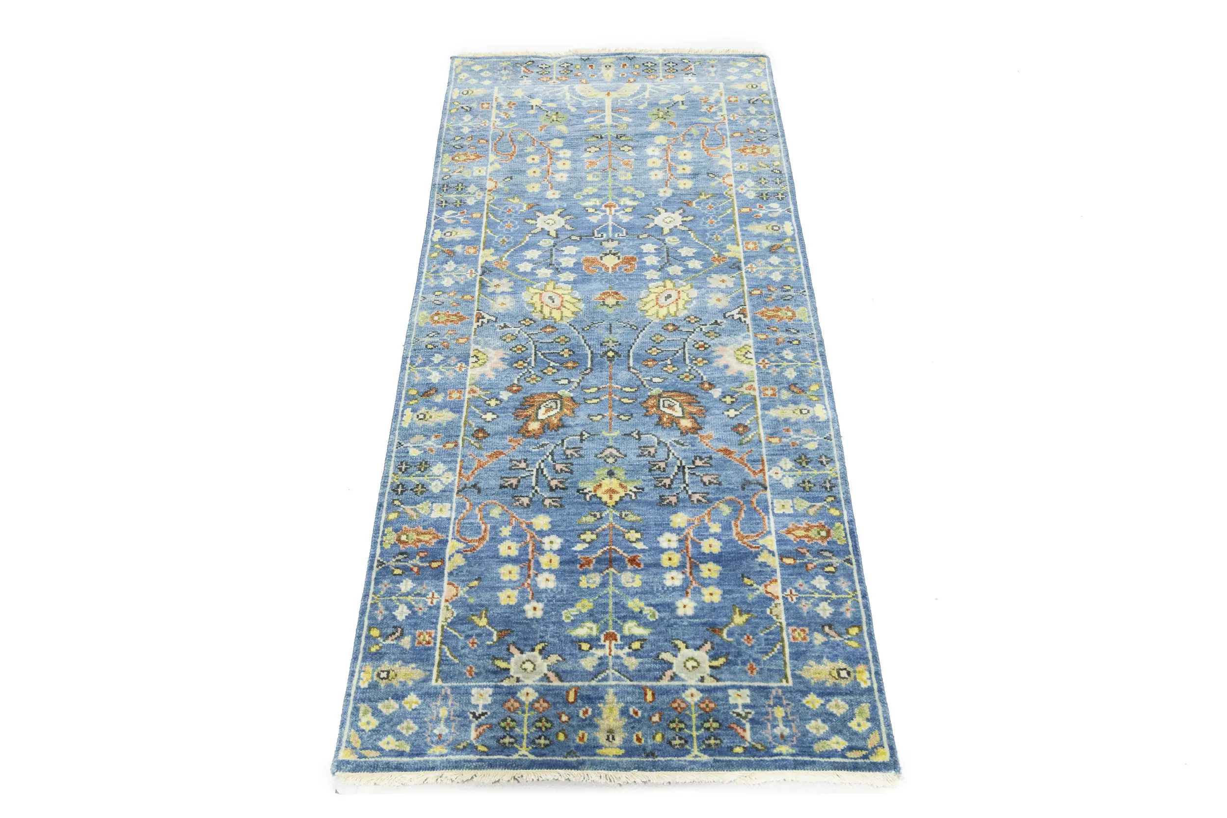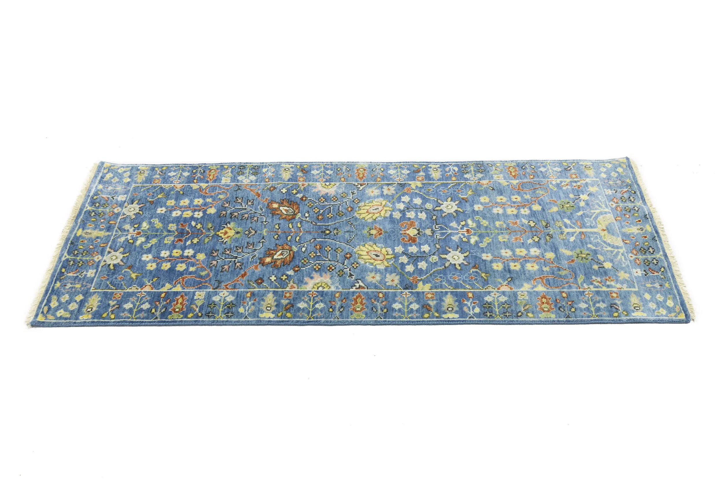 This genuine 2'5x6 blue new Oriental runner was made by the hands of gifted weavers inspired by a variety of spectacular artistic designs, to recreate the aged look of the original piece with a richness of color and ornately patterned background field. What set this vintage style Oriental area runner from the others are the material and dye used (wool pile and cotton foundation), knot count, ancient designs, fantastic grades, and its regional historical connection: it has deep roots, from the story of the people who produced it to the meaning of the symbols and colors displayed across its canvas that have been praised for centuries. This Indian home décor carpet will be completely cozy and inviting that never will go out of style! Also, this Oriental runner would be among your most valuable treasures, it is a great investment that accrues value over time, and it will last for generations because was woven with high-quality, all-natural wool. Environmentally friendly, opulent yet affordable; this rug will give you a thorough amount of character to help define your living space with elegance and warmth that will capture the eyes and attention of your audience (homeowners, designers, decorators, family and friends).