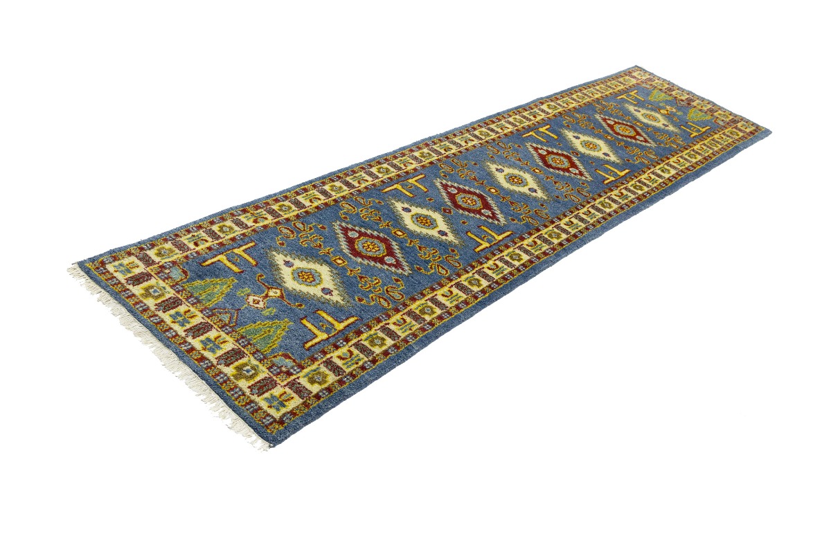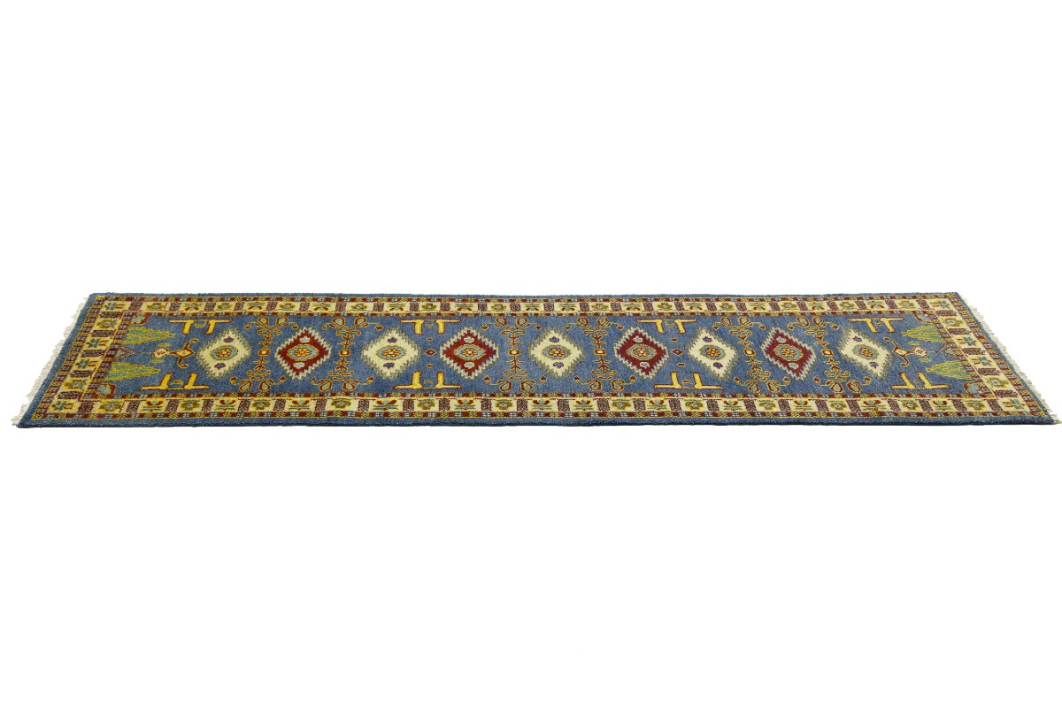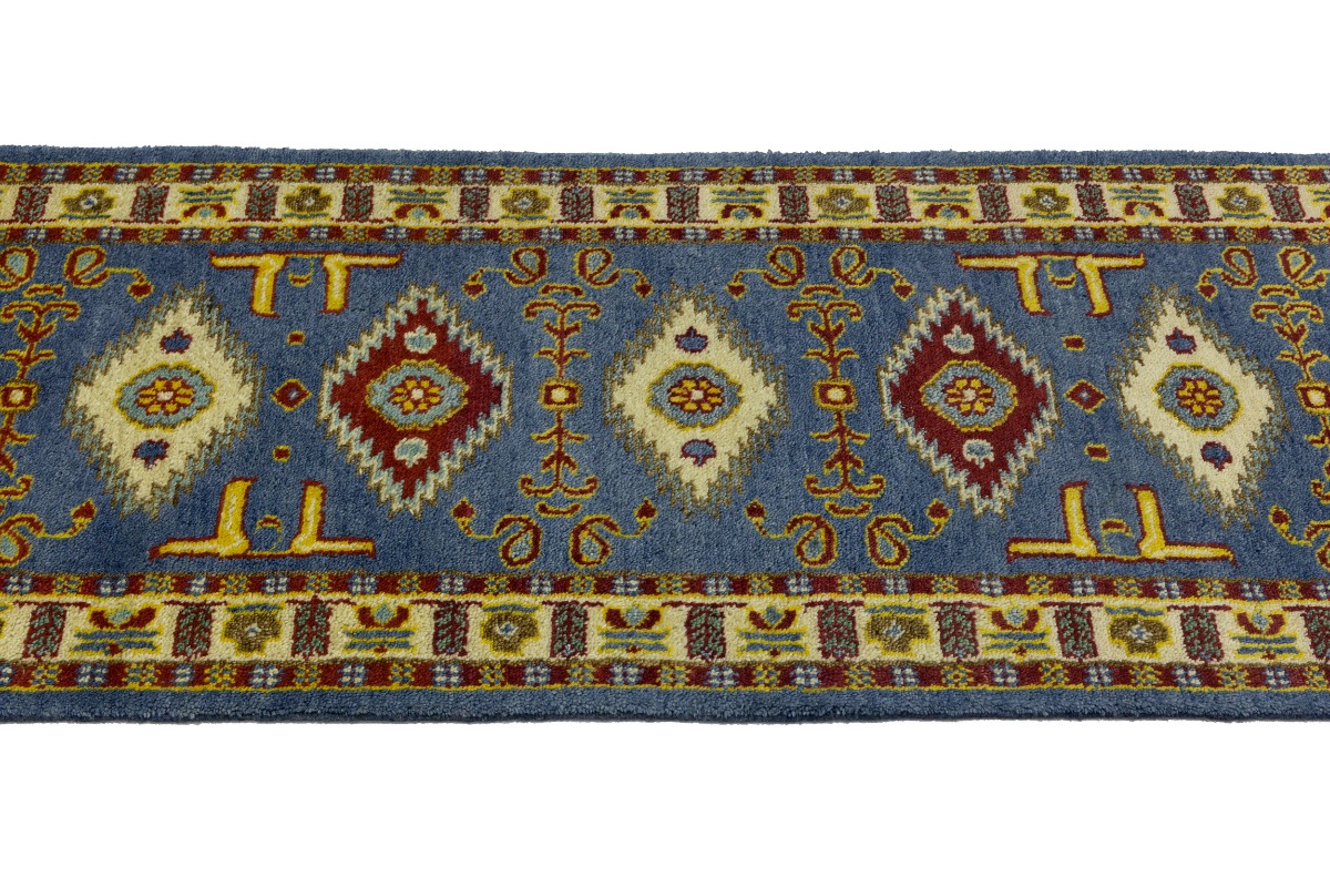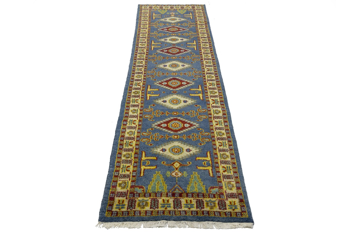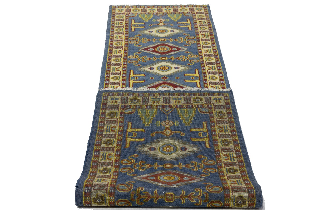 Blue Geometric 2'5X9'7 Kazak Oriental Runner Rug