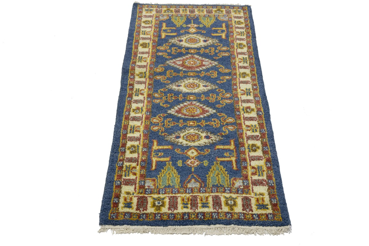 Hand Knotted 2'7X6'4 blue oriental runner made with natural dyes (fine wool pile and cotton foundation), superior knot count, and appealing ancient designs. This Oriental runner never will go out of style and would be among your most valuable treasures.