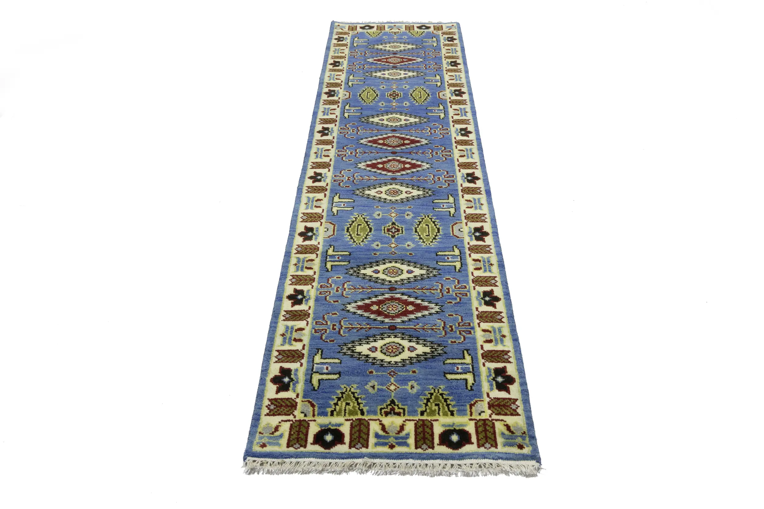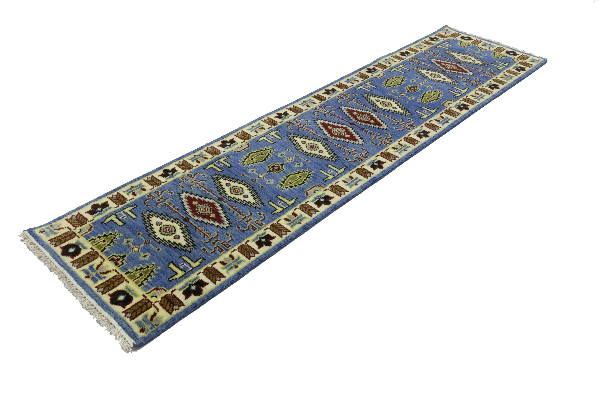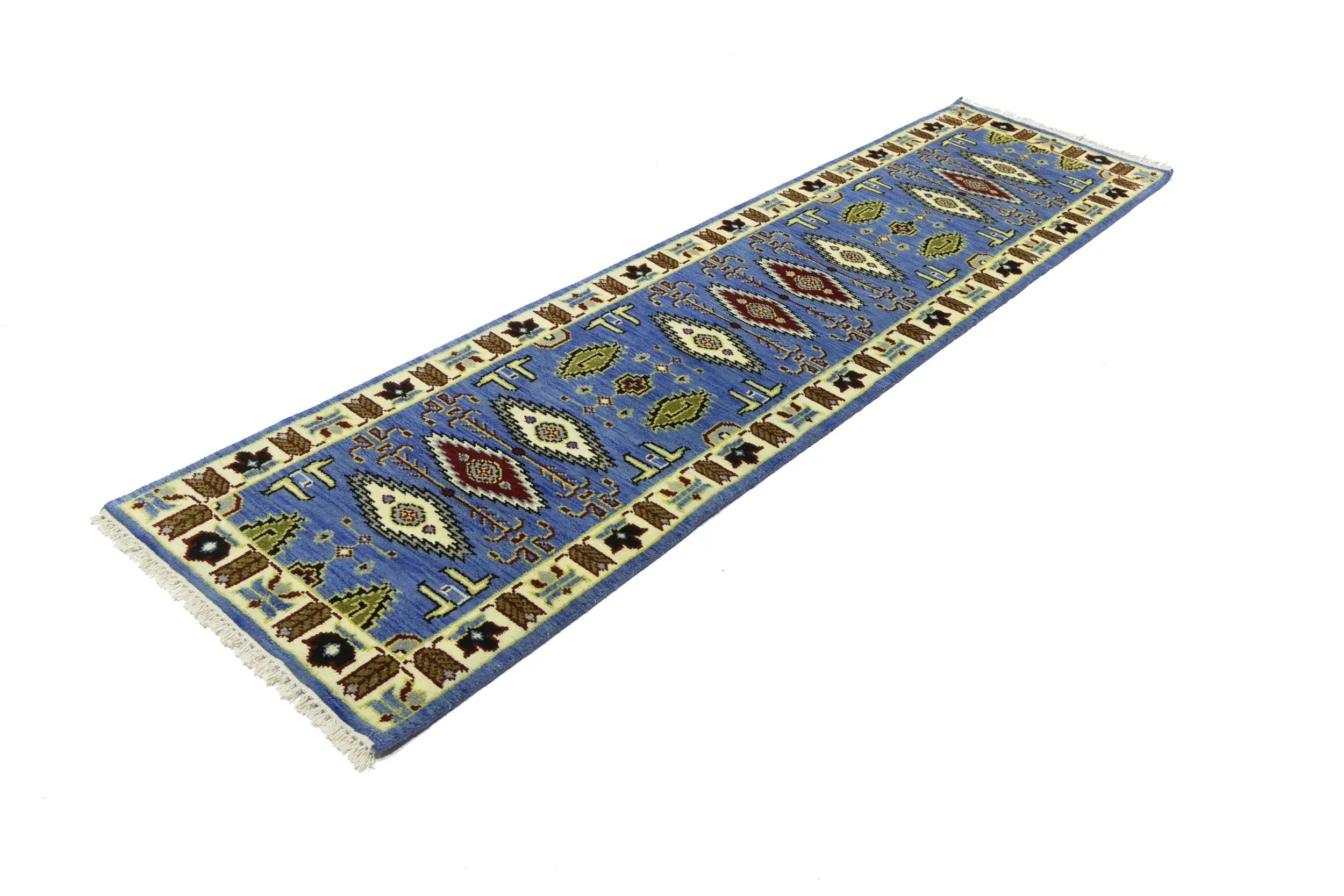 Blue Geometric 3X10 Kazak Oriental Runner Rug