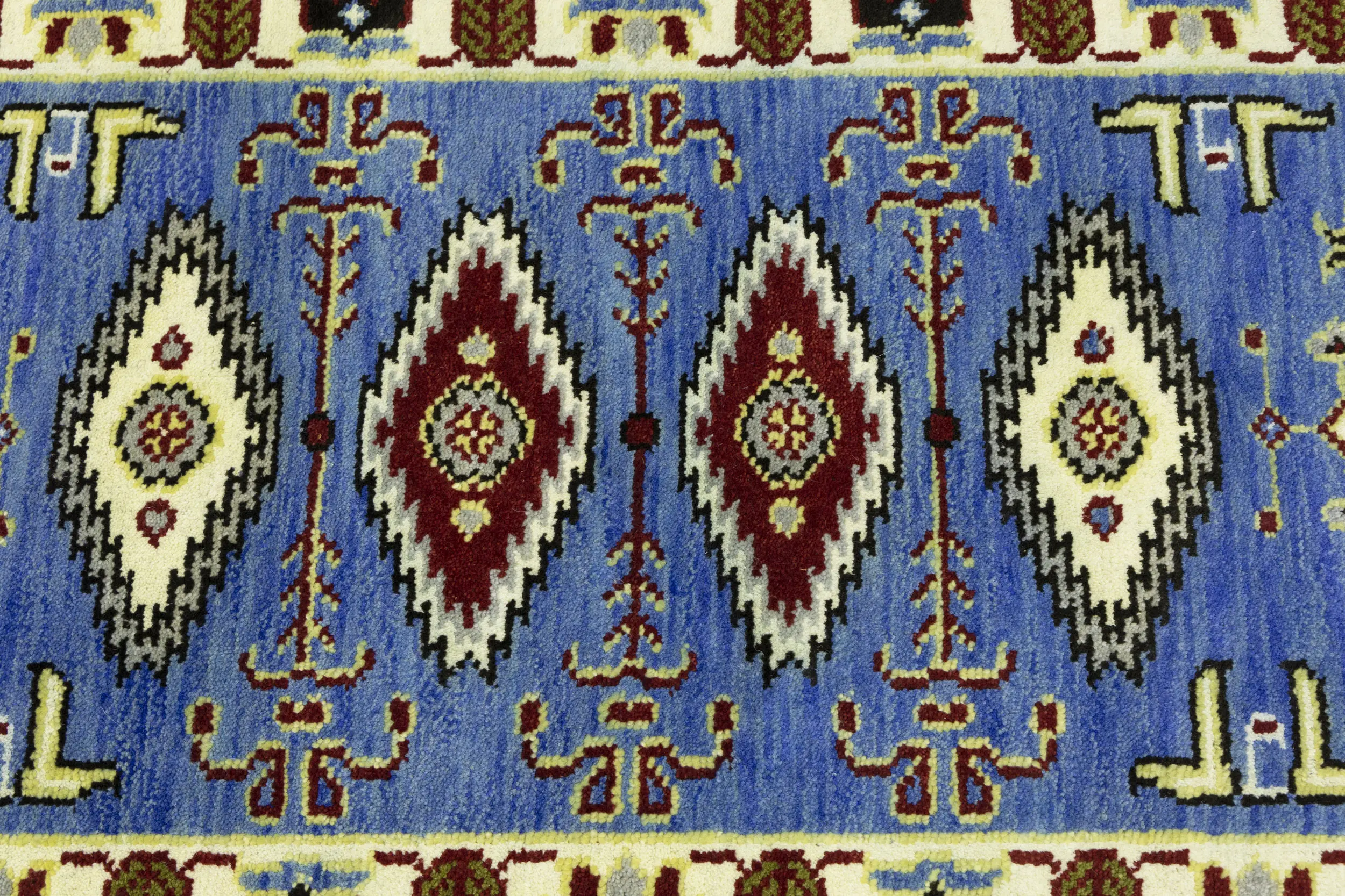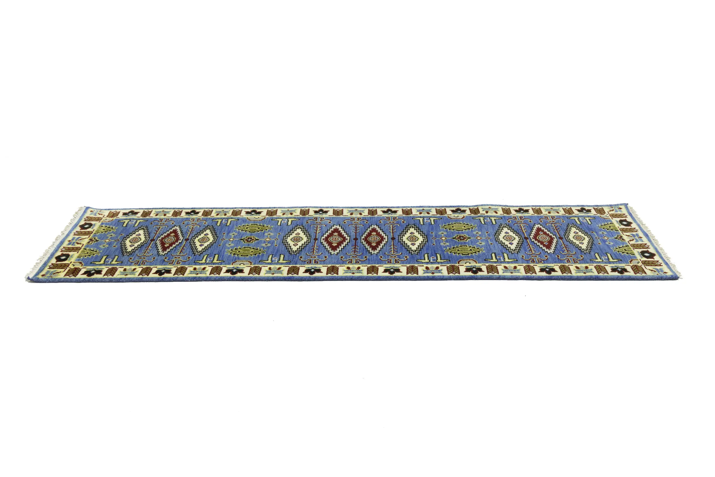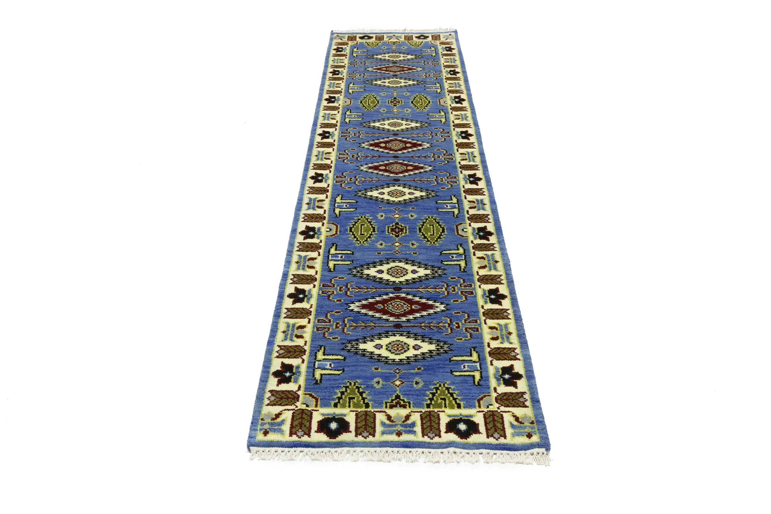 Blue Geometric 3X10 Kazak Oriental Runner Rug