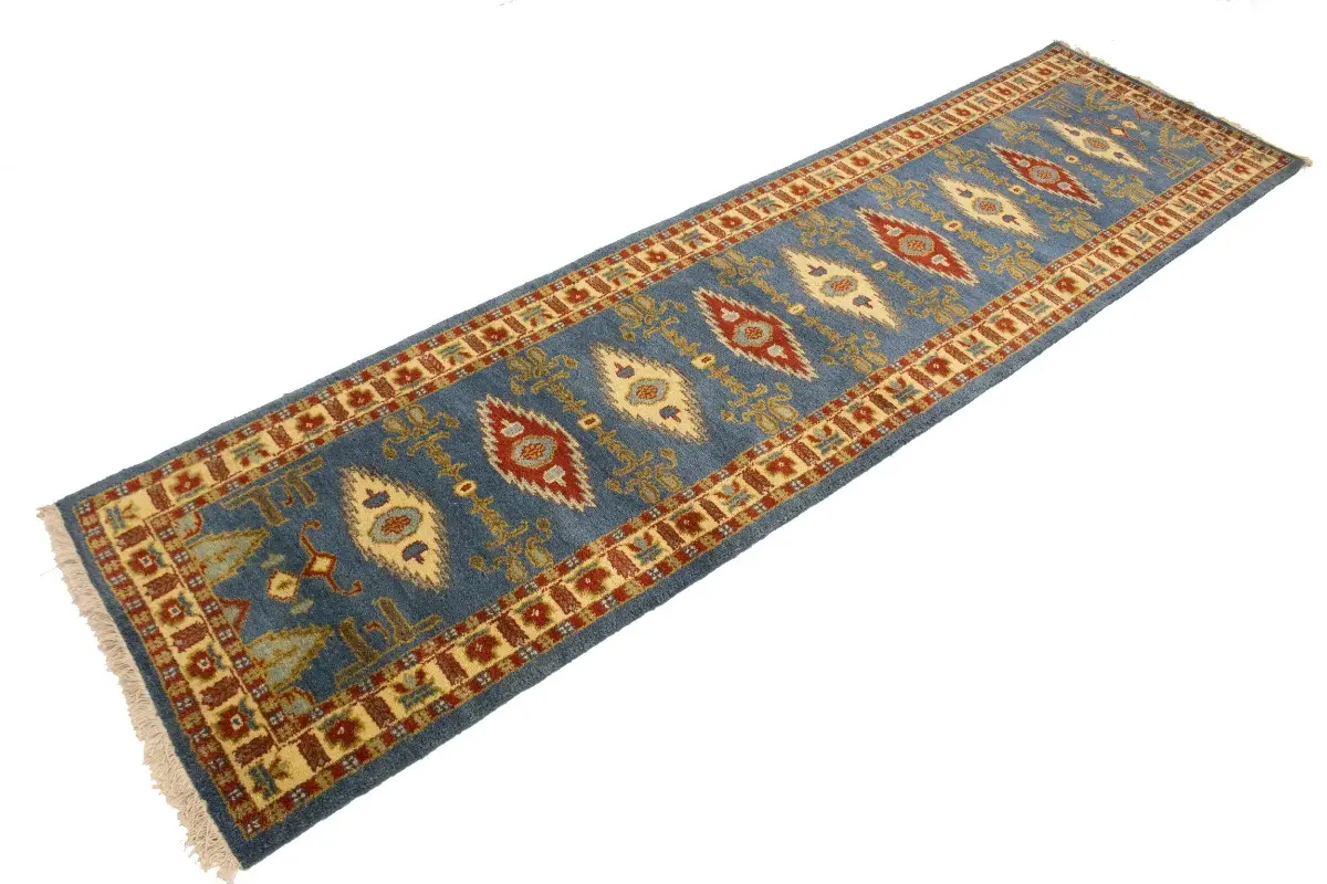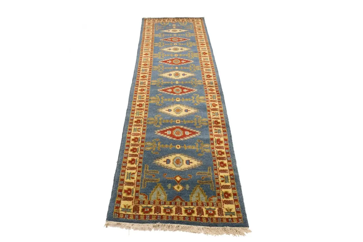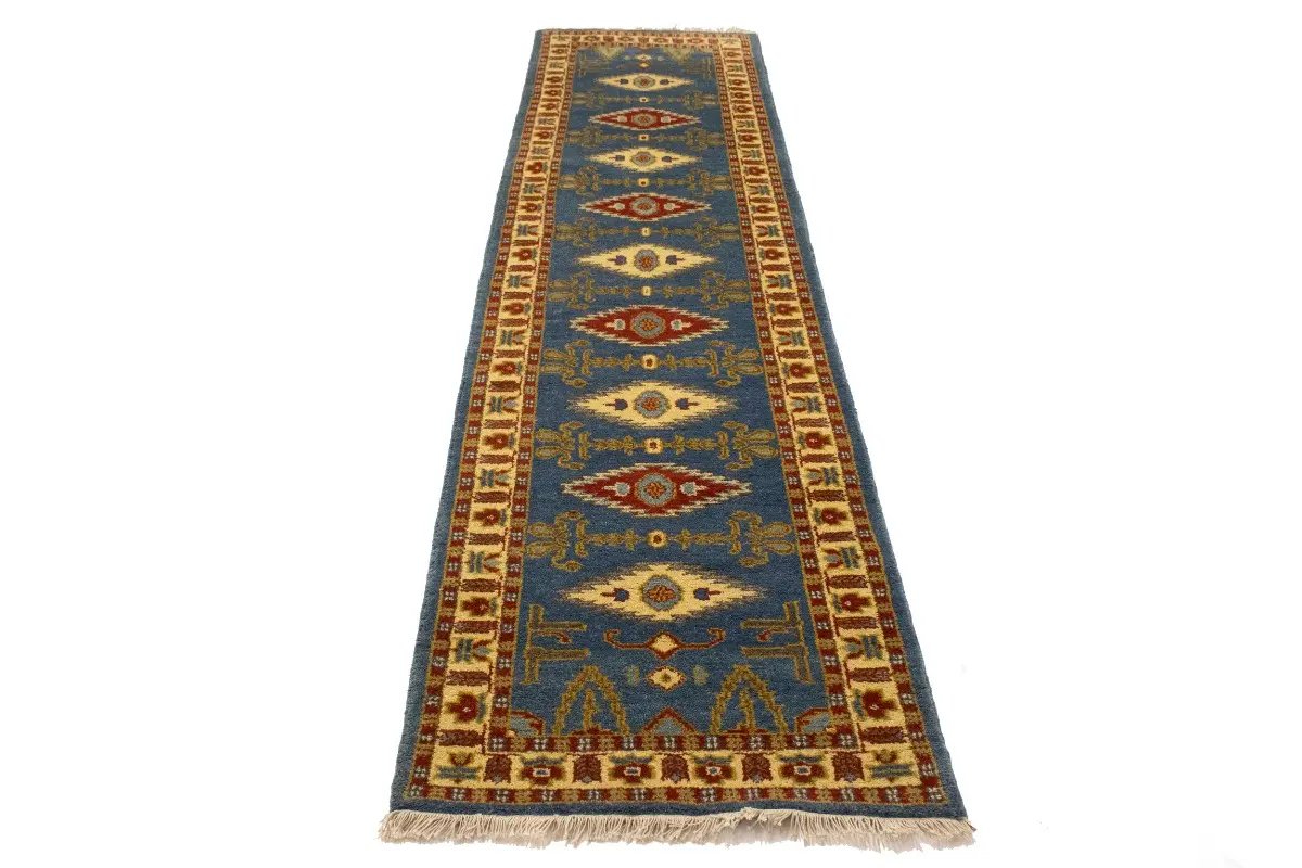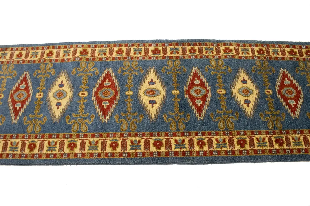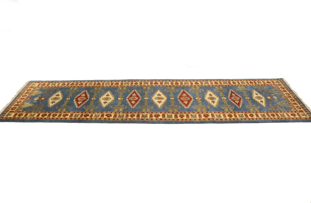 Blue Geometric 3X10 Kazak Oriental Runner Rug