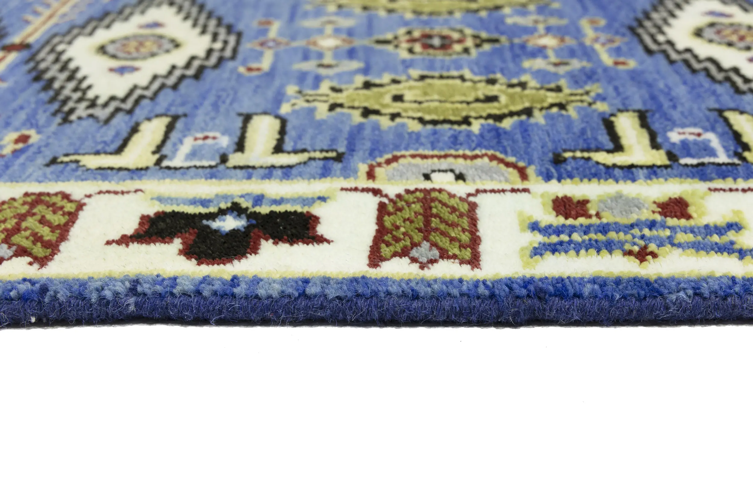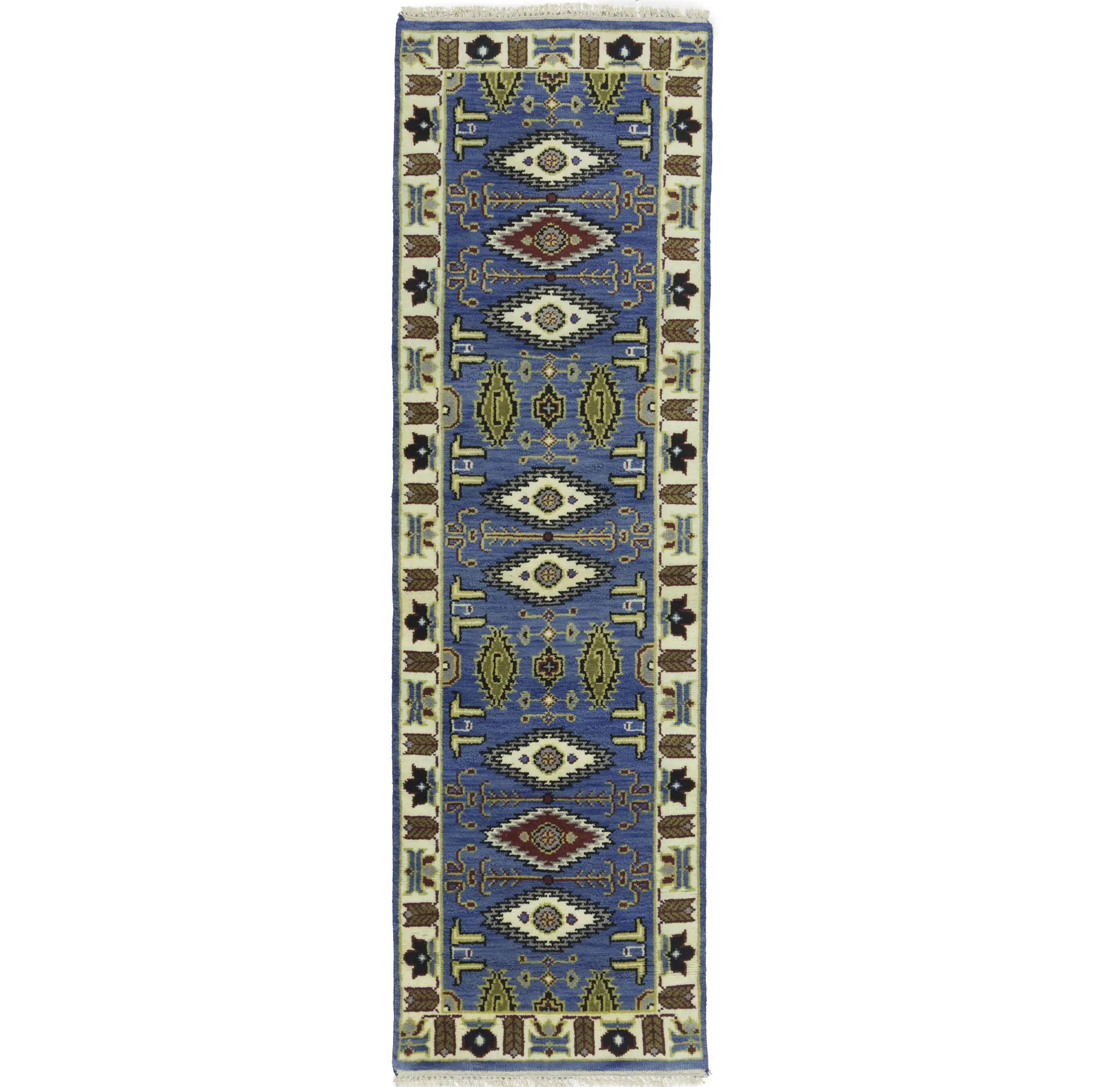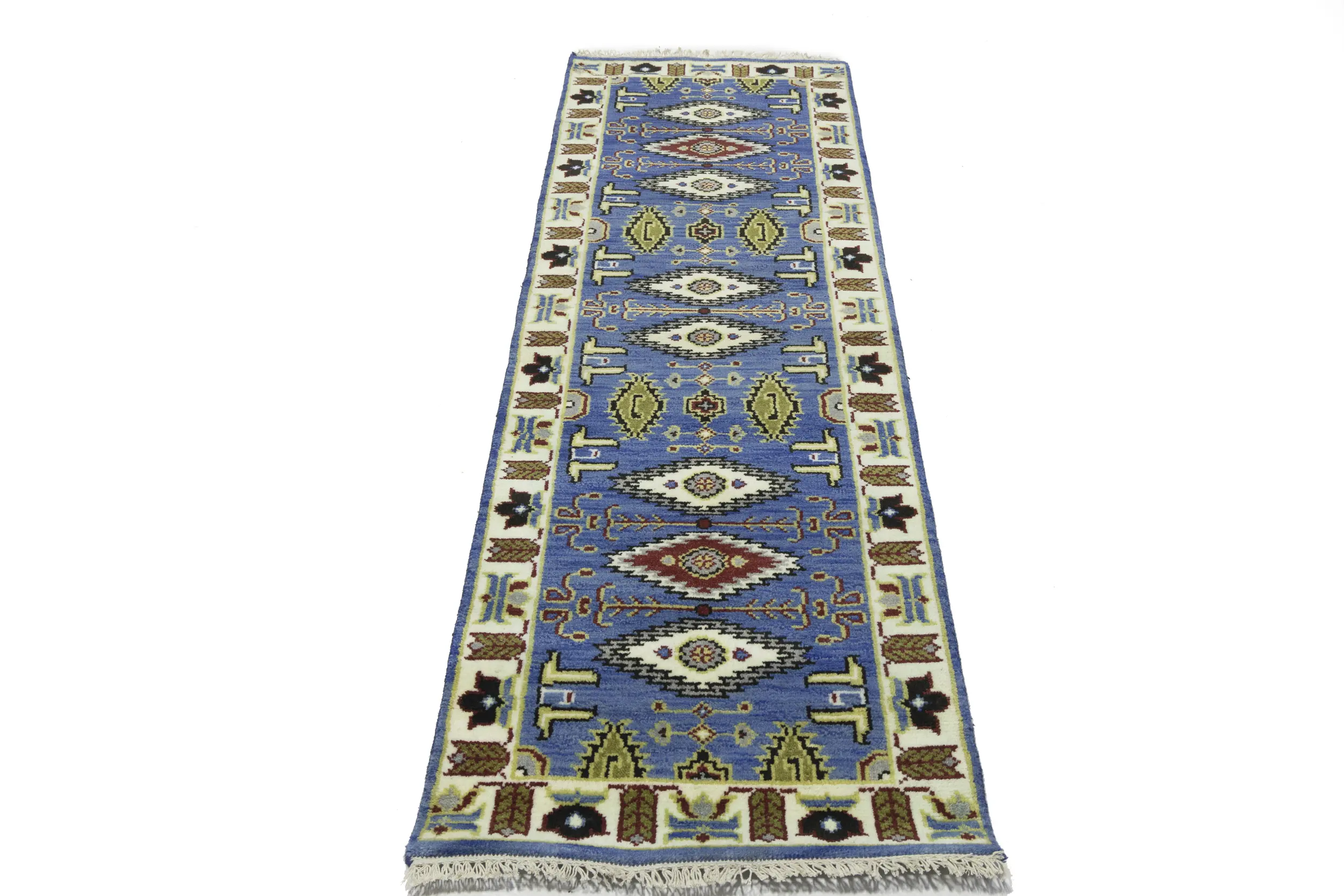 Blue Geometric 3X8 Kazak Oriental Runner Rug