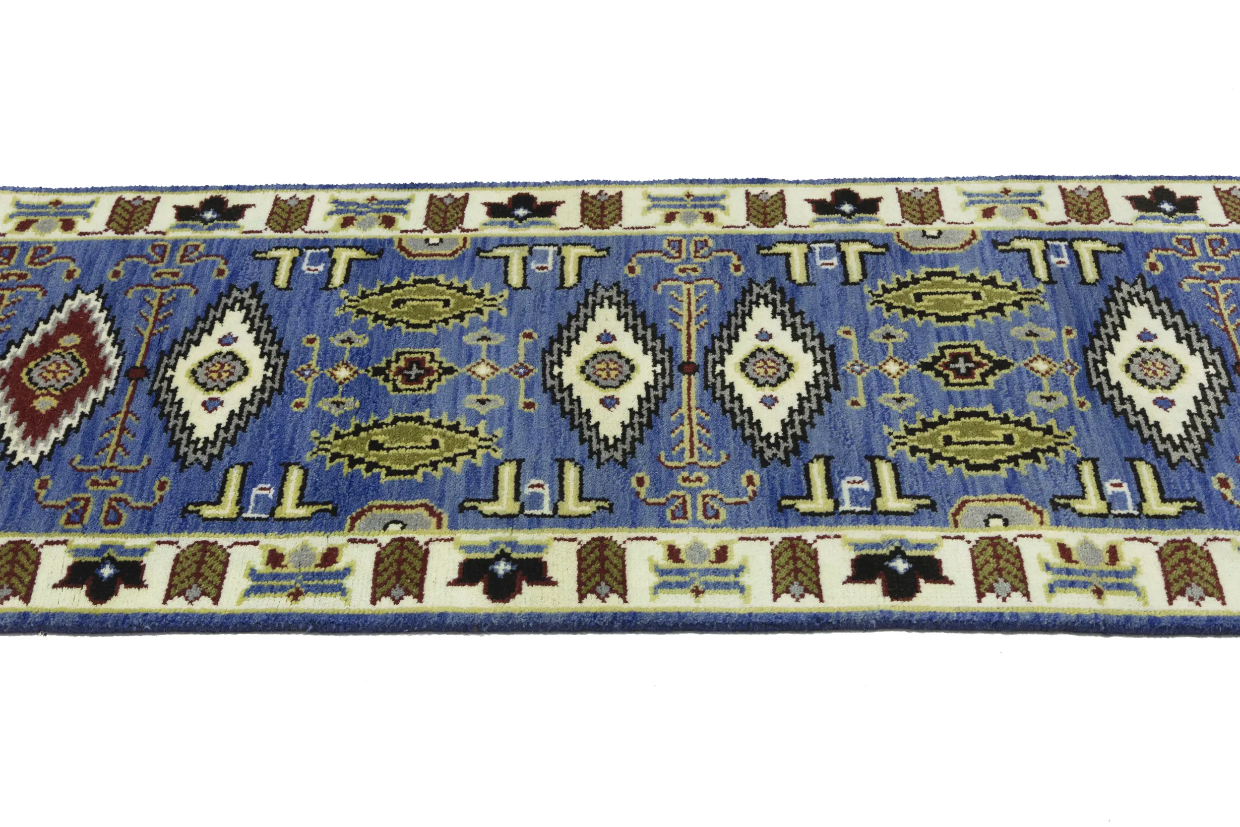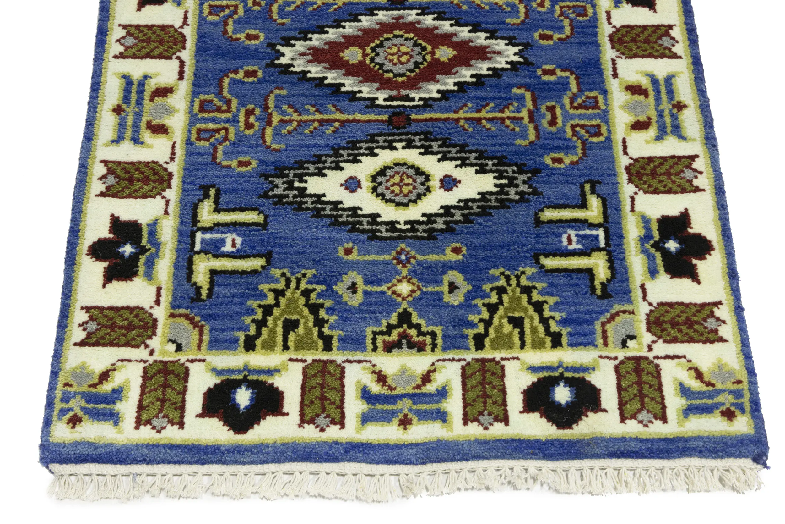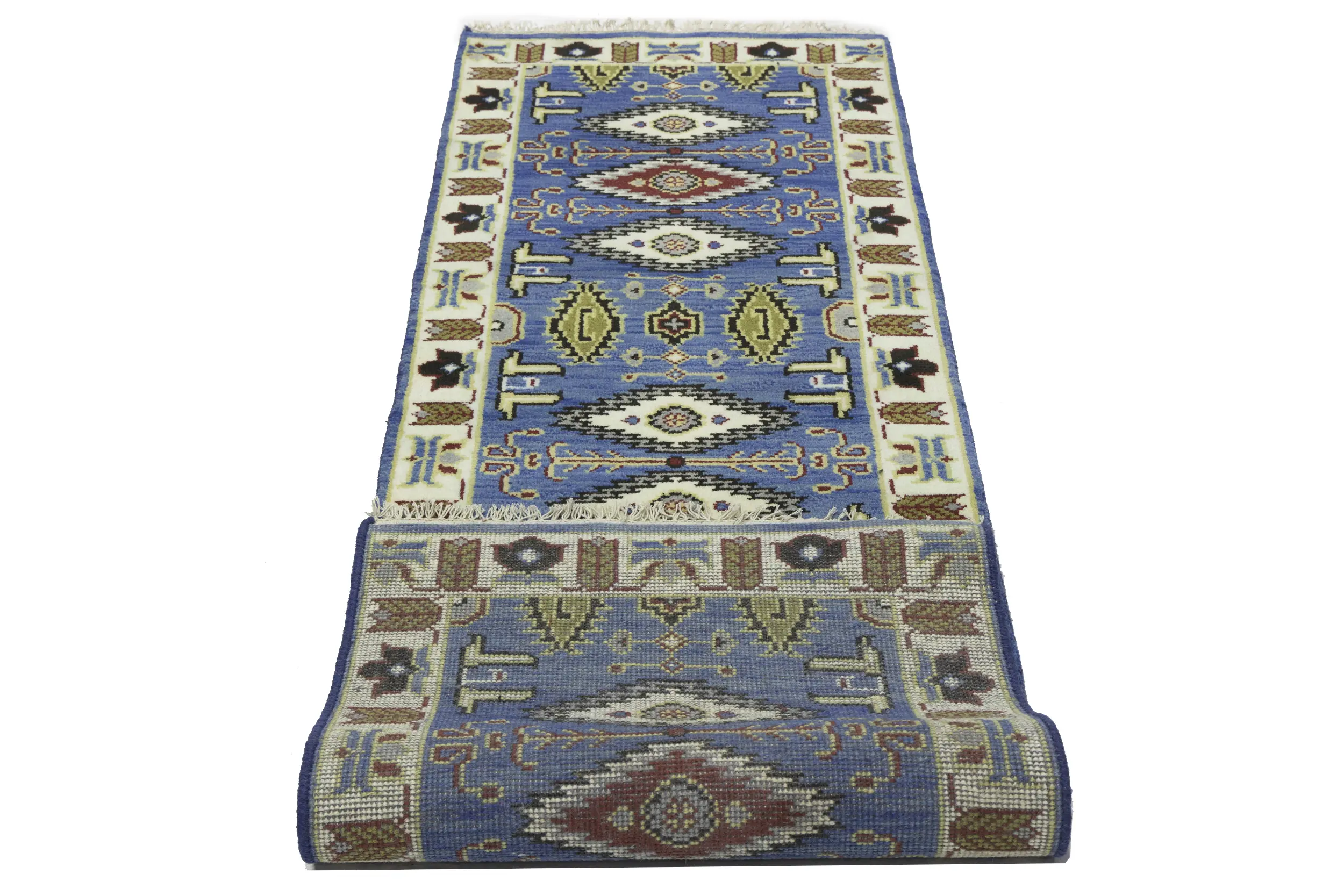 This genuine 3X8 blue new Oriental runner was made by the hands of gifted weavers inspired by a variety of spectacular artistic designs, to recreate the aged look of the original piece with a richness of color and ornately patterned background field. What set this vintage style Oriental area runner from the others are the material and dye used (wool pile and cotton foundation), knot count, ancient designs, fantastic grades, and its regional historical connection: it has deep roots, from the story of the people who produced it to the meaning of the symbols and colors displayed across its canvas that have been praised for centuries. This Indian home décor carpet will be completely cozy and inviting that never will go out of style! Also, this Oriental runner would be among your most valuable treasures, it is a great investment that accrues value over time, and it will last for generations because was woven with high-quality, all-natural wool. Environmentally friendly, opulent yet affordable; this rug will give you a thorough amount of character to help define your living space with elegance and warmth that will capture the eyes and attention of your audience (homeowners, designers, decorators, family and friends).