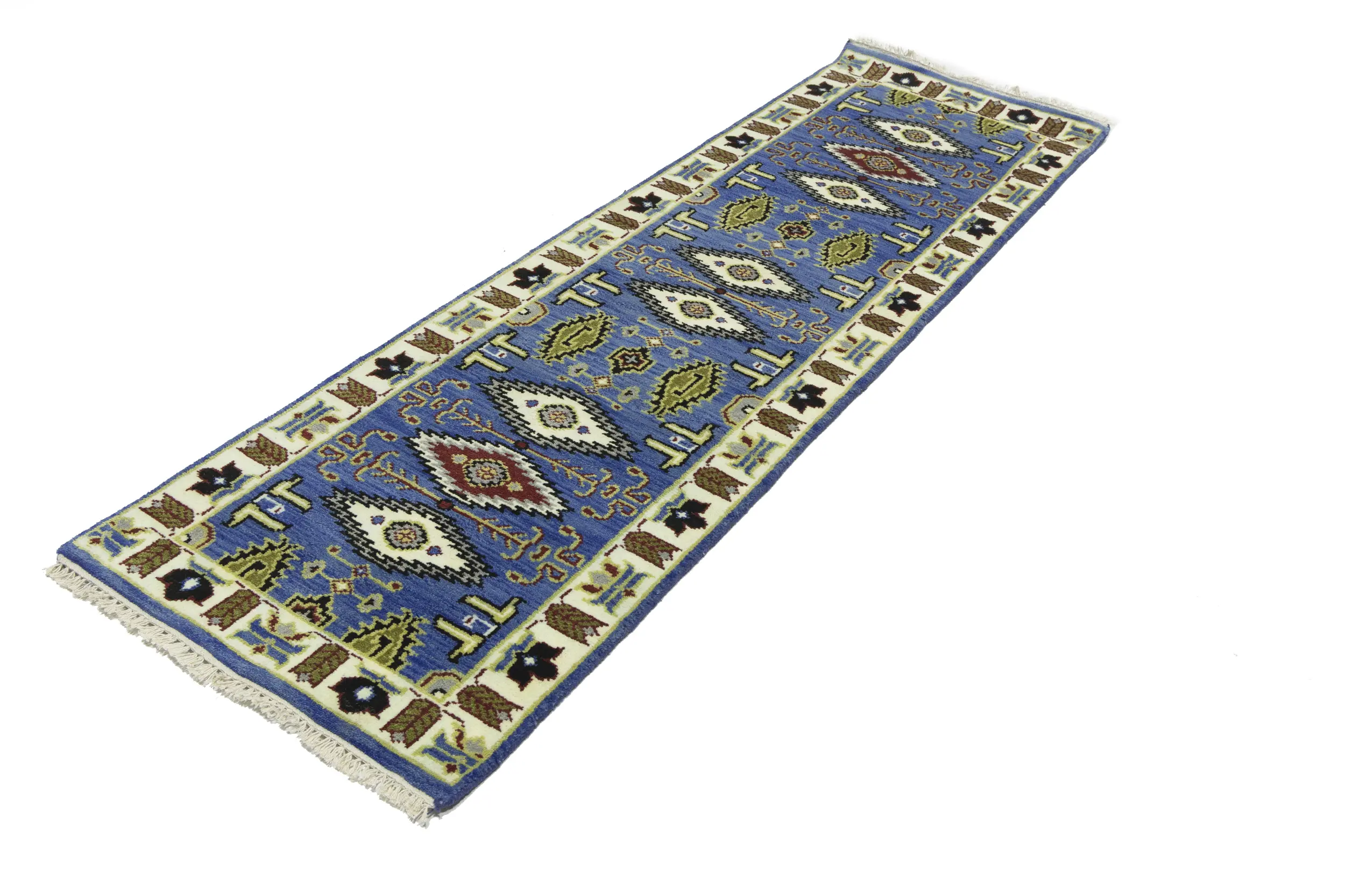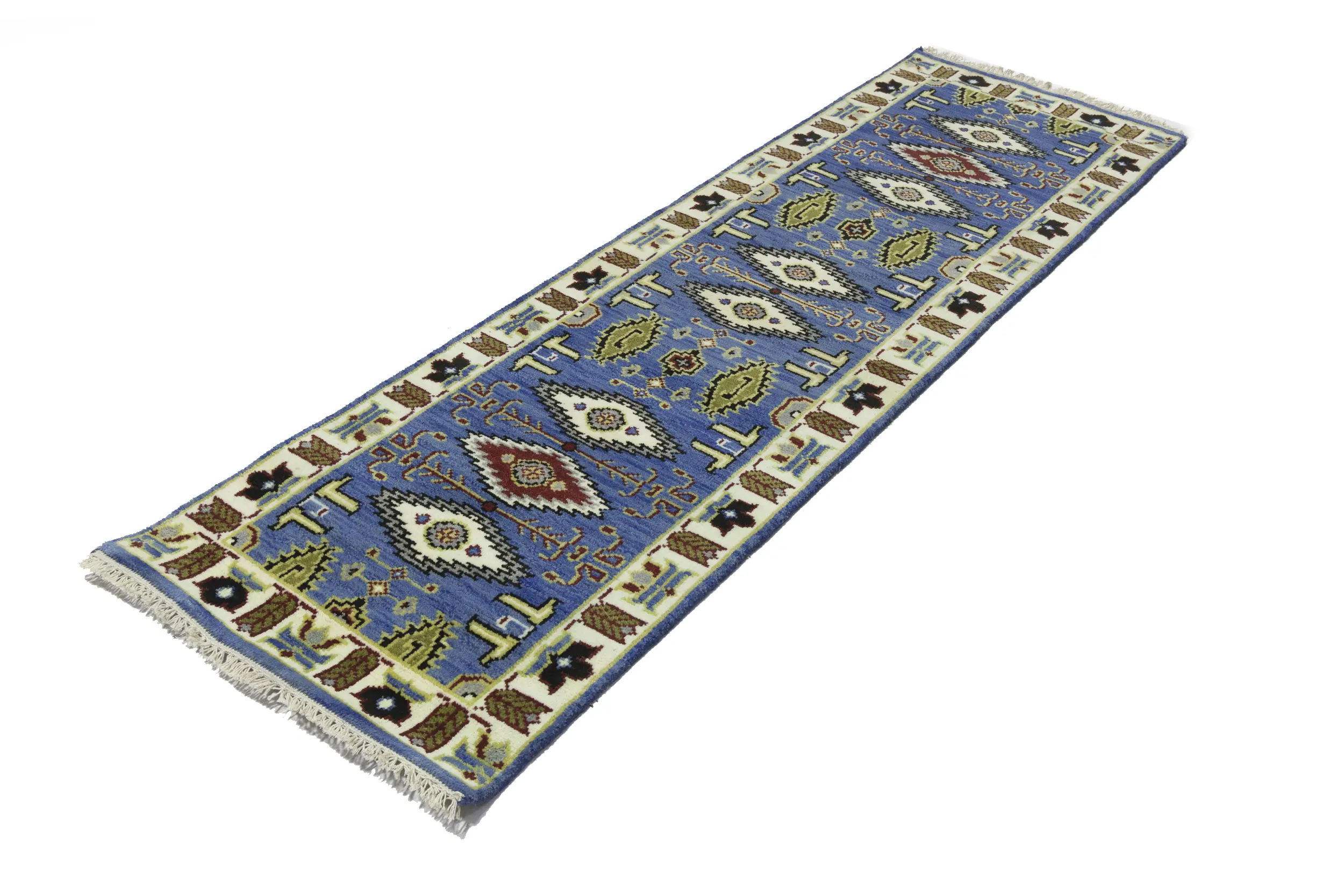 Handmade 3X8 blue oriental runner made with vegetable dyes (fine wool pile and cotton foundation), superior knot count, and appealing ancient designs. This Oriental runner never will go out of style and would be among your most valuable treasures.