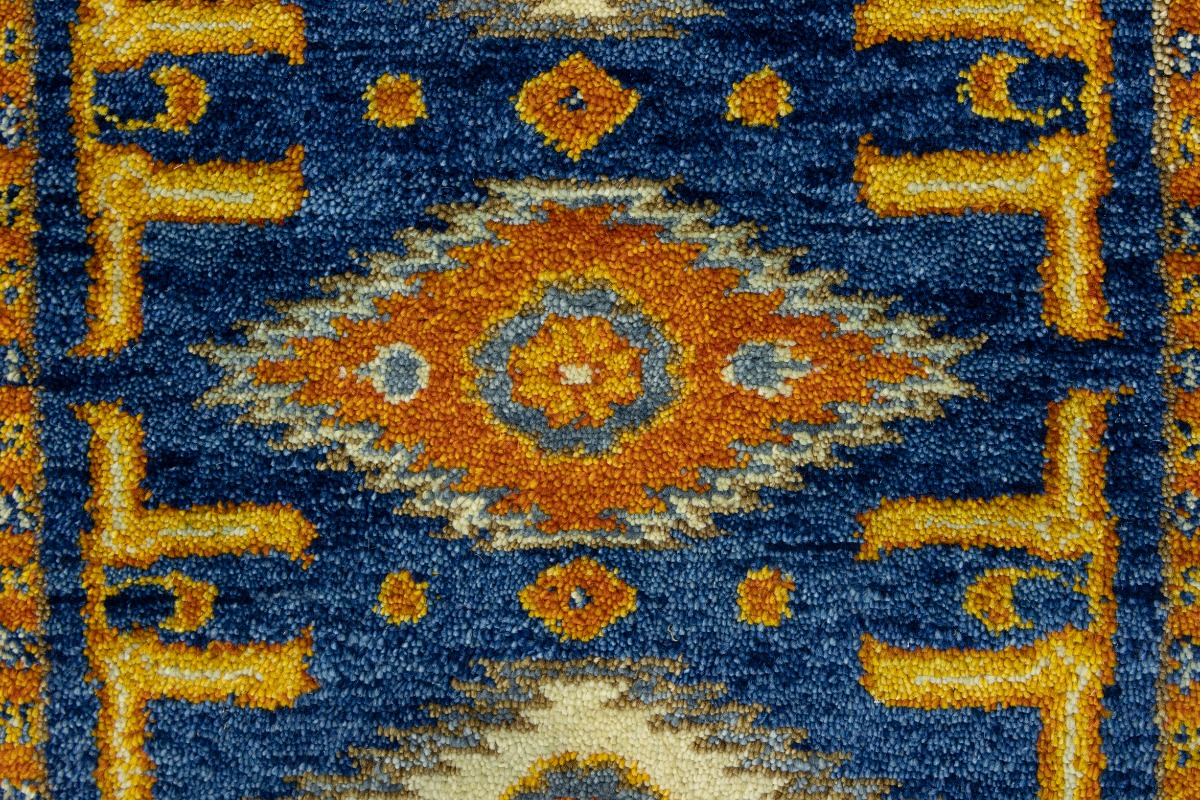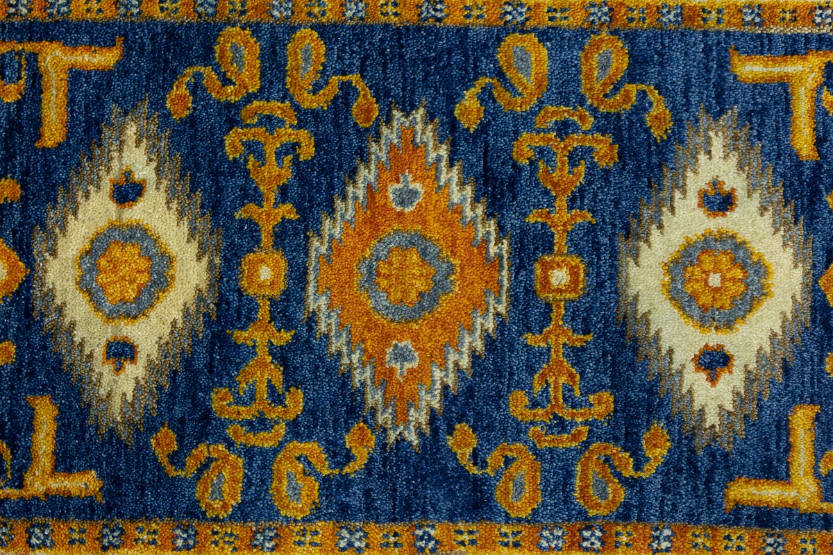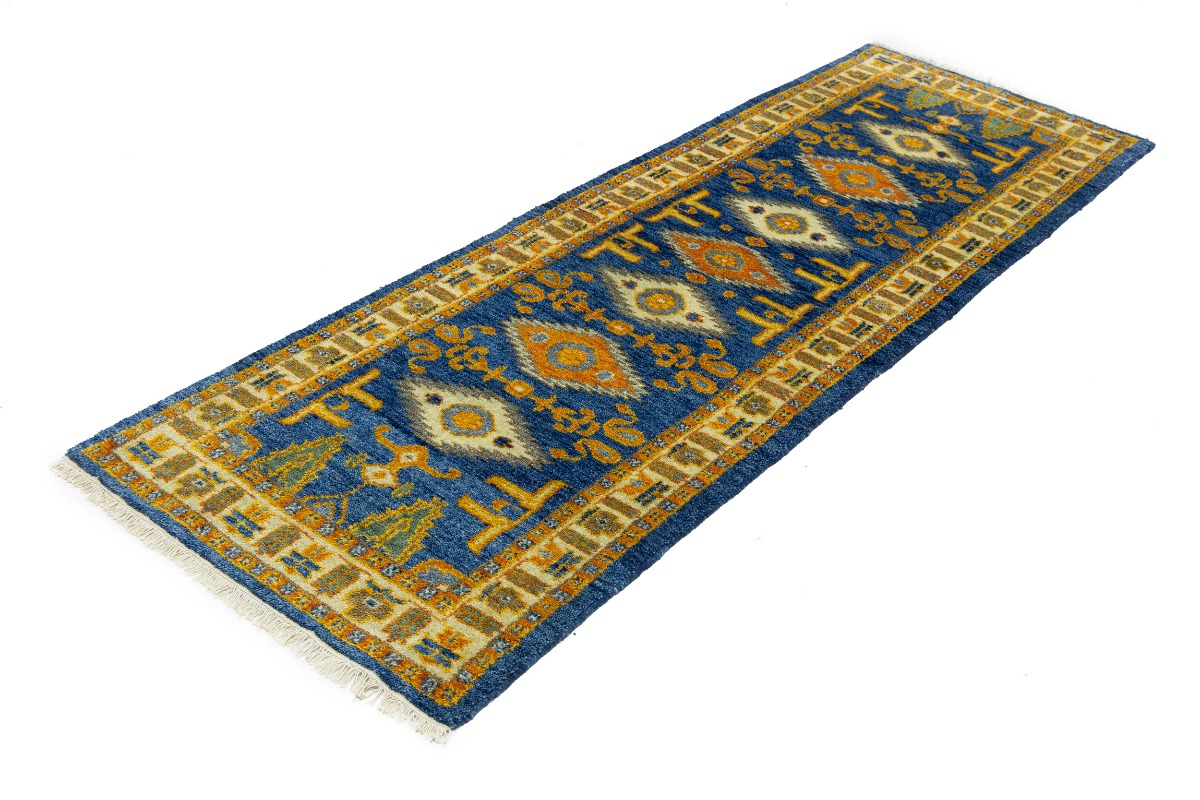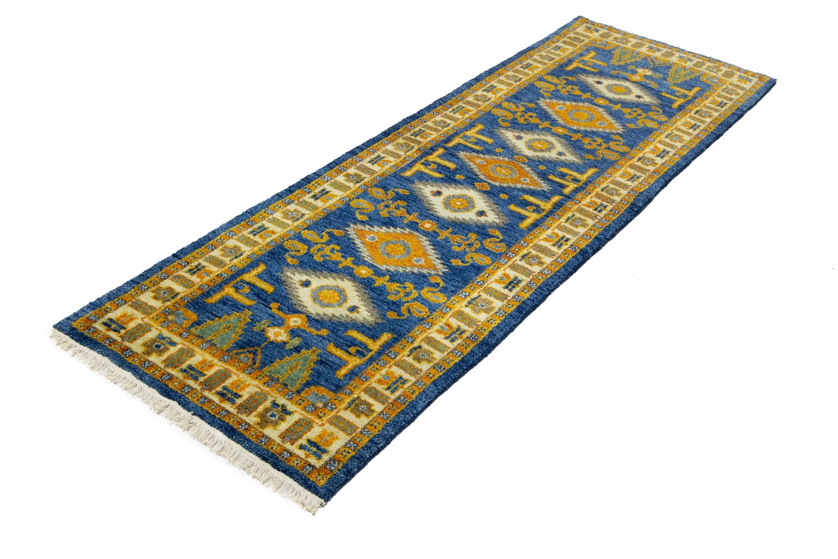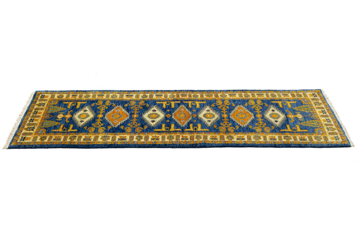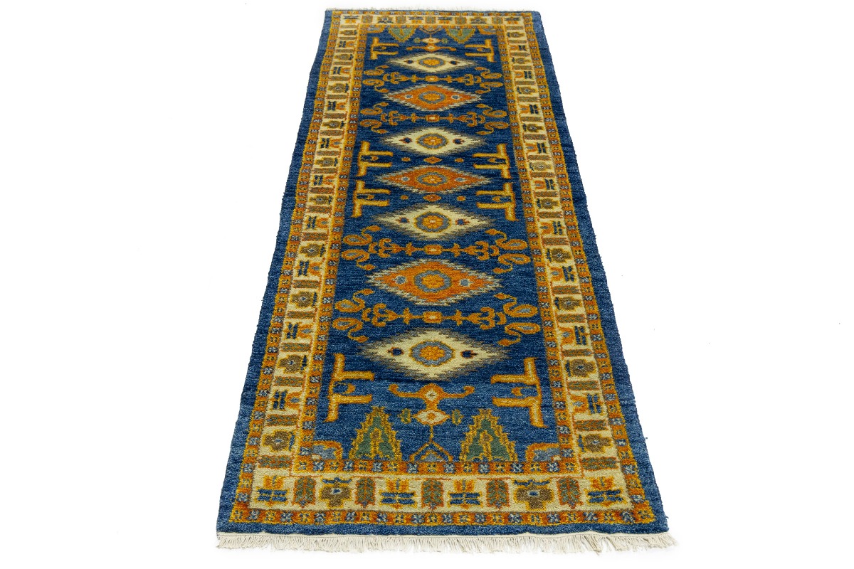 Blue Geometric 3X8 Kazak Oriental Runner Rug