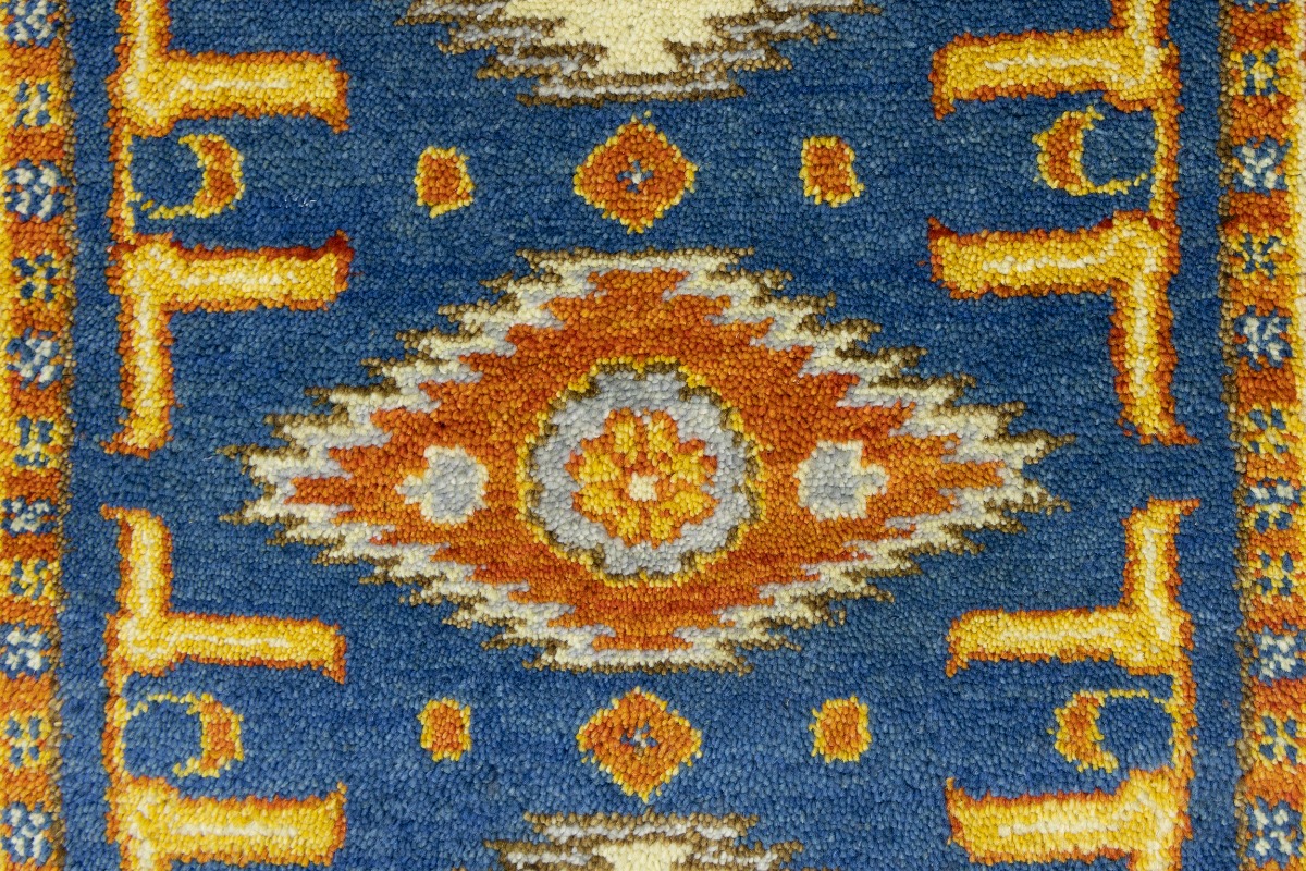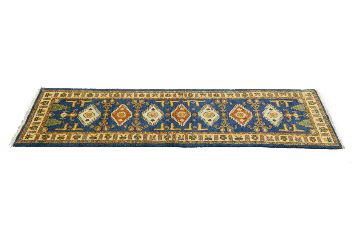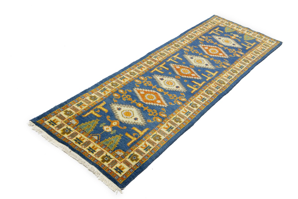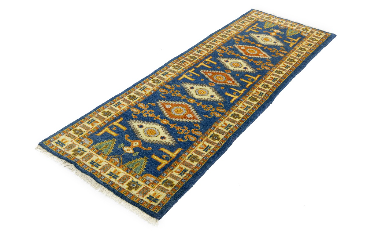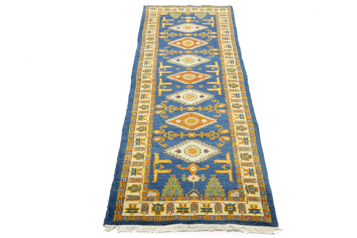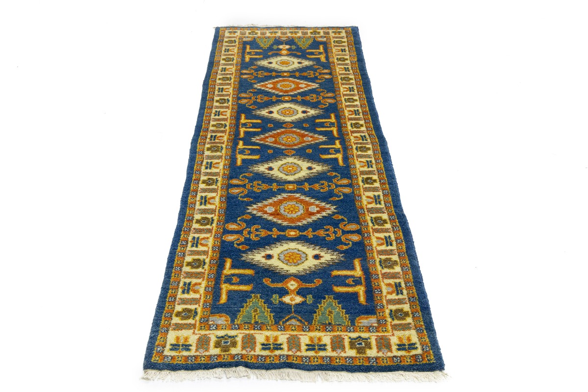 Blue Geometric 3X8 Kazak Oriental Runner Rug