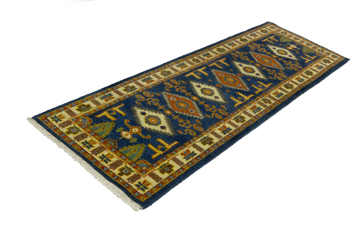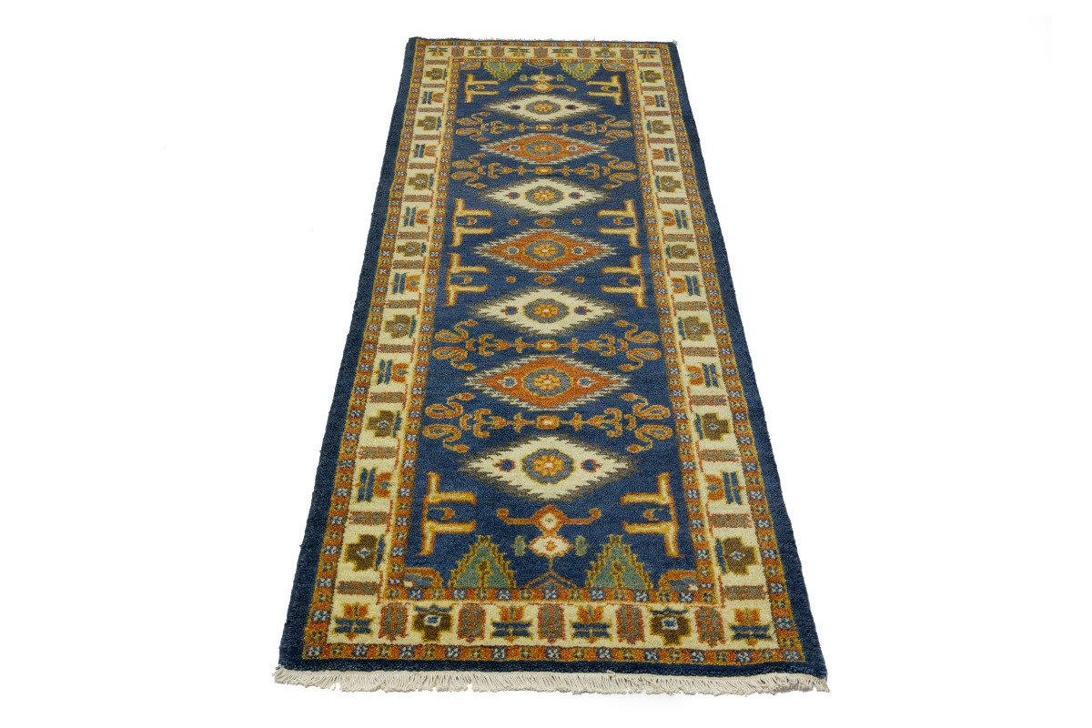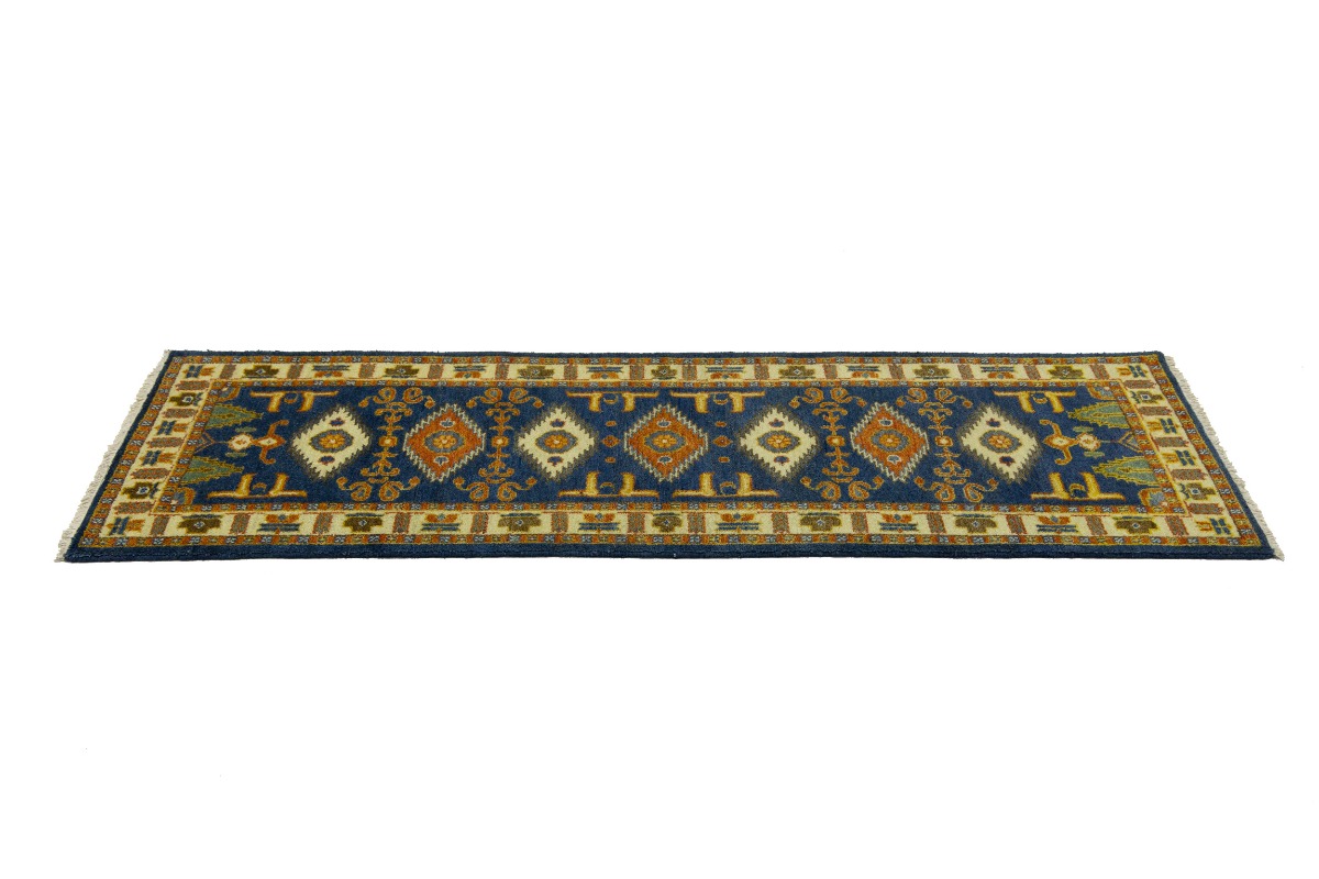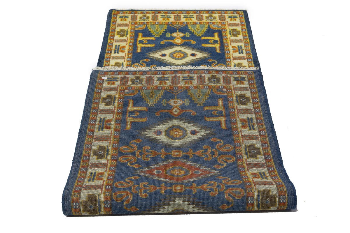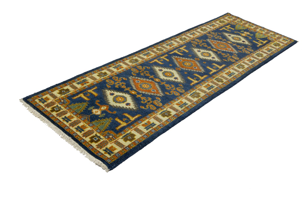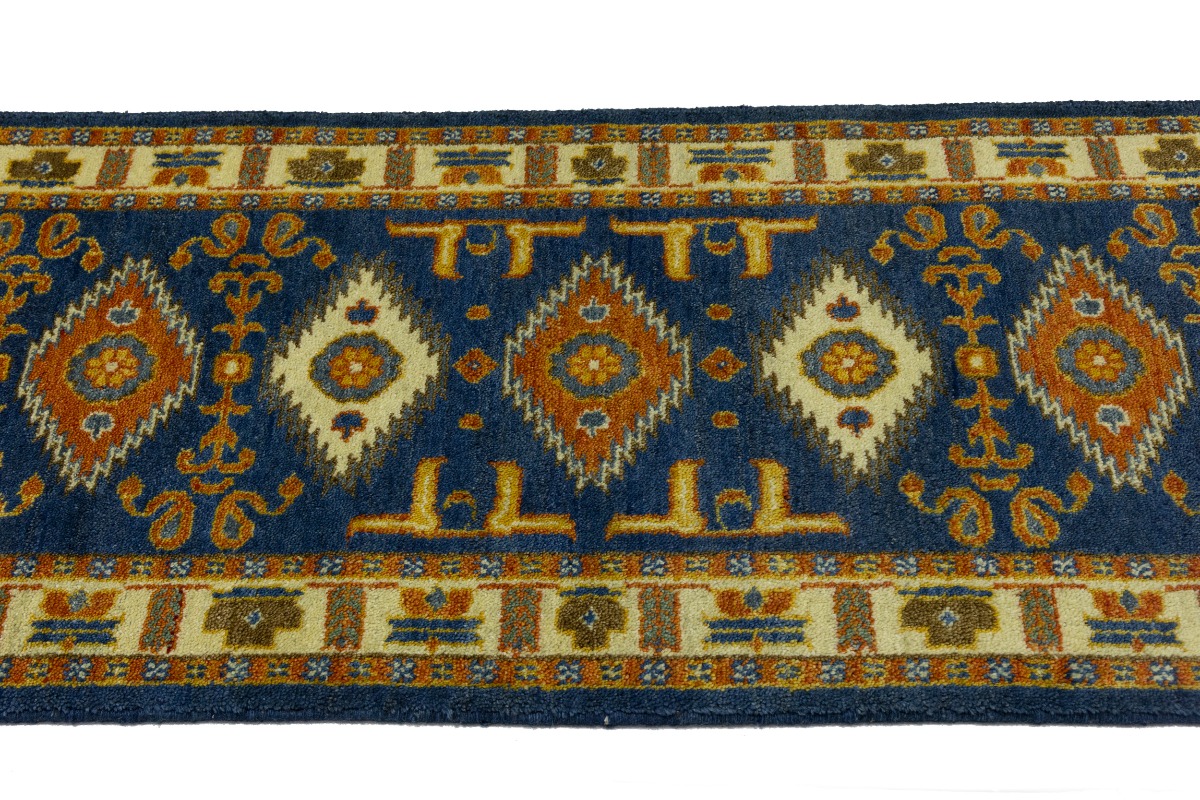 Blue Geometric 3X8 Kazak Oriental Runner Rug