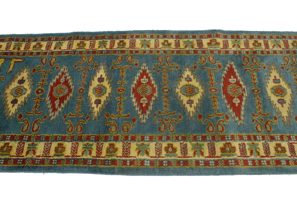 Hand Knotted 3X9 blue Oriental runner made with vegetable dyes (fine wool pile and cotton foundation), exceptional knot count, and appealing ancient designs. This Oriental runner never will go out of style and would be among your most valuable treasures.
